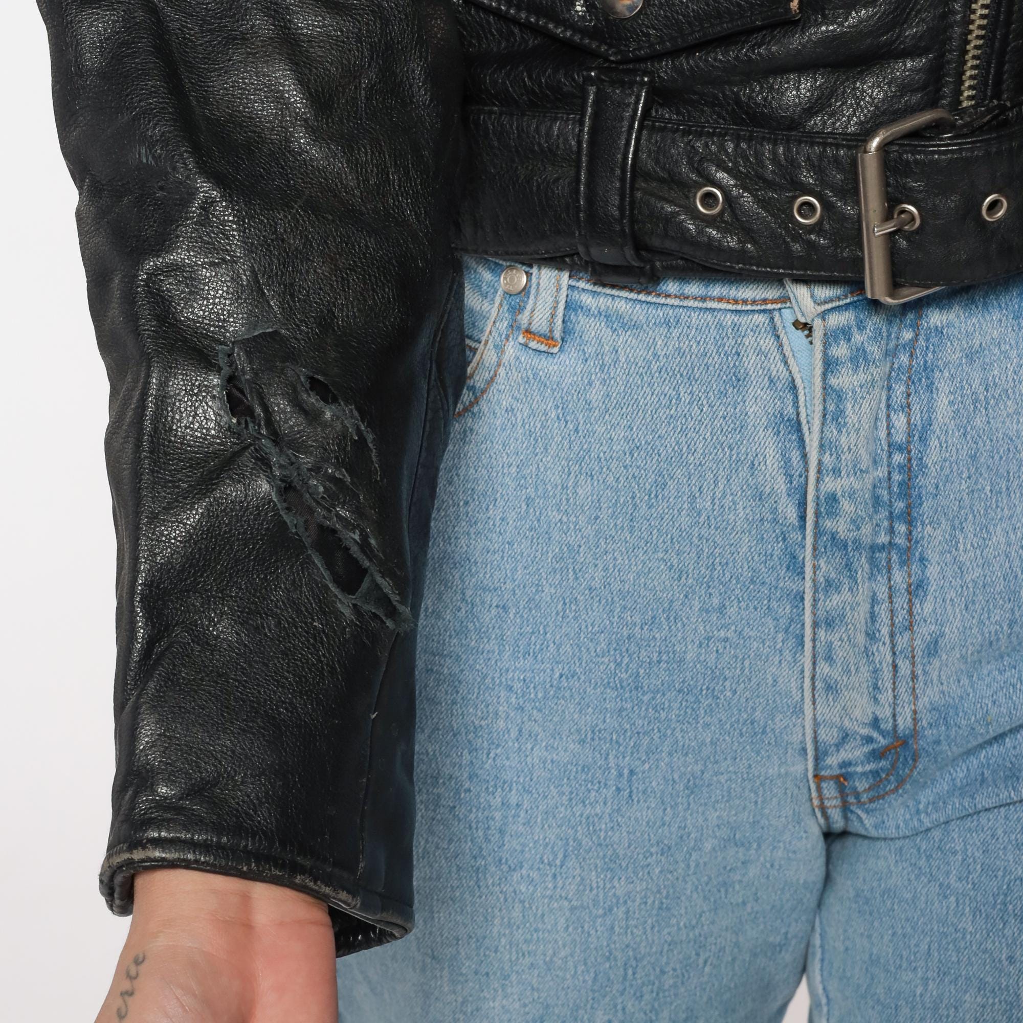 Condition: Gently distressed and worn in throughout, has a couple of tears on sleeve, has a spots and some scuffs due to material and wear See photos