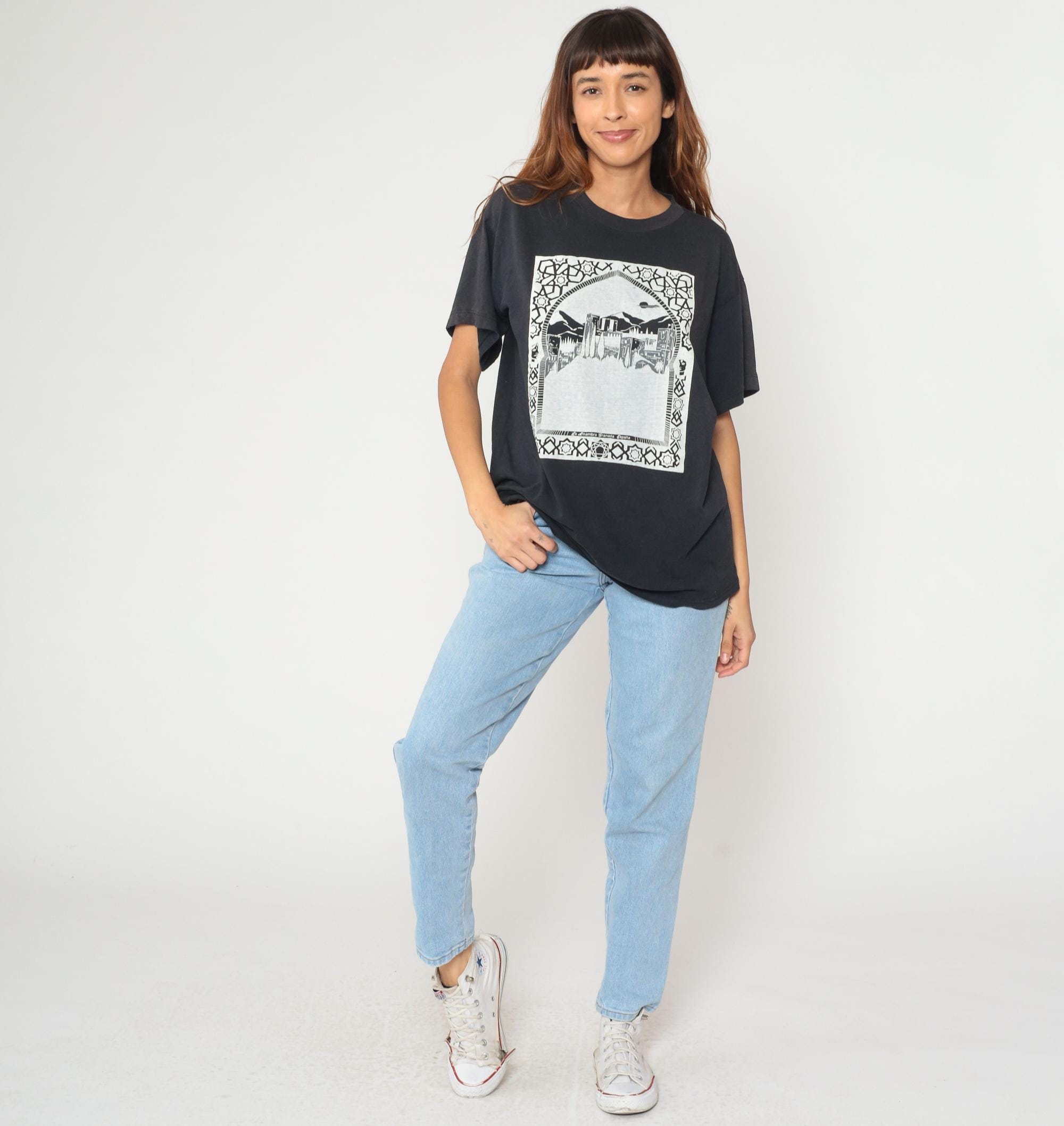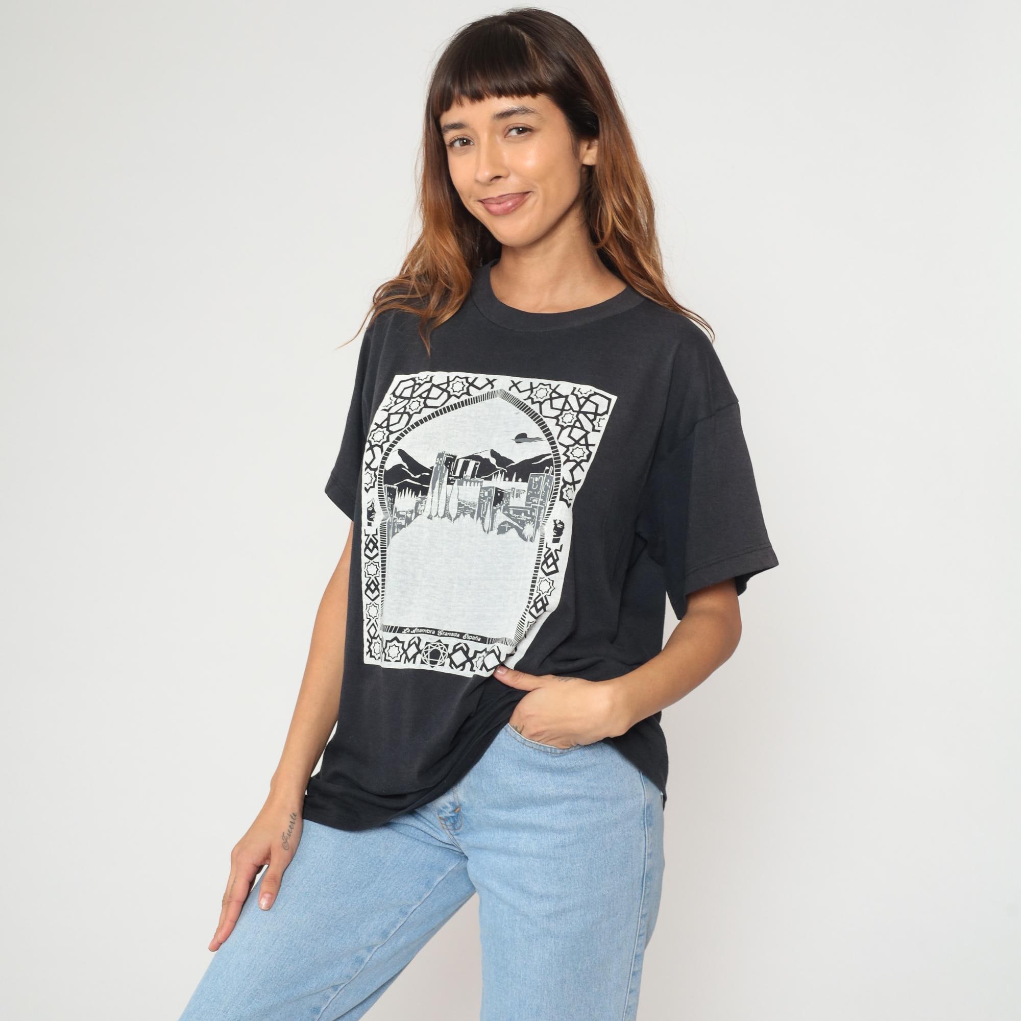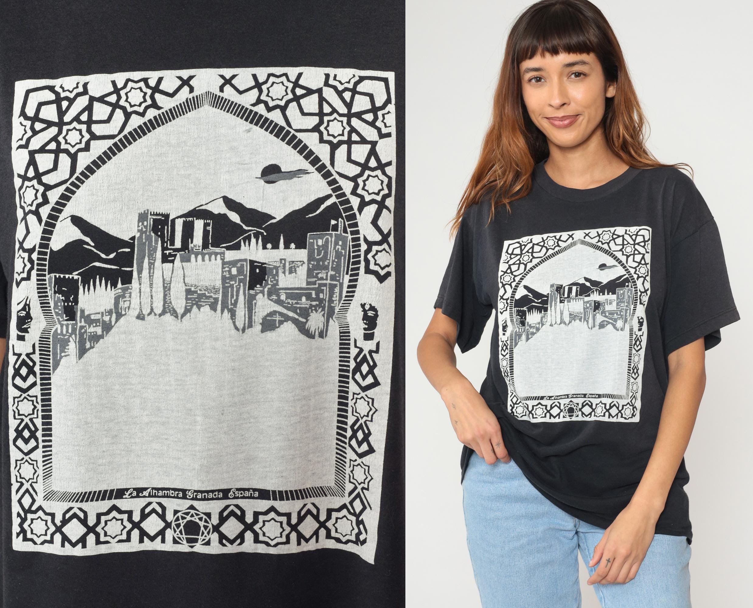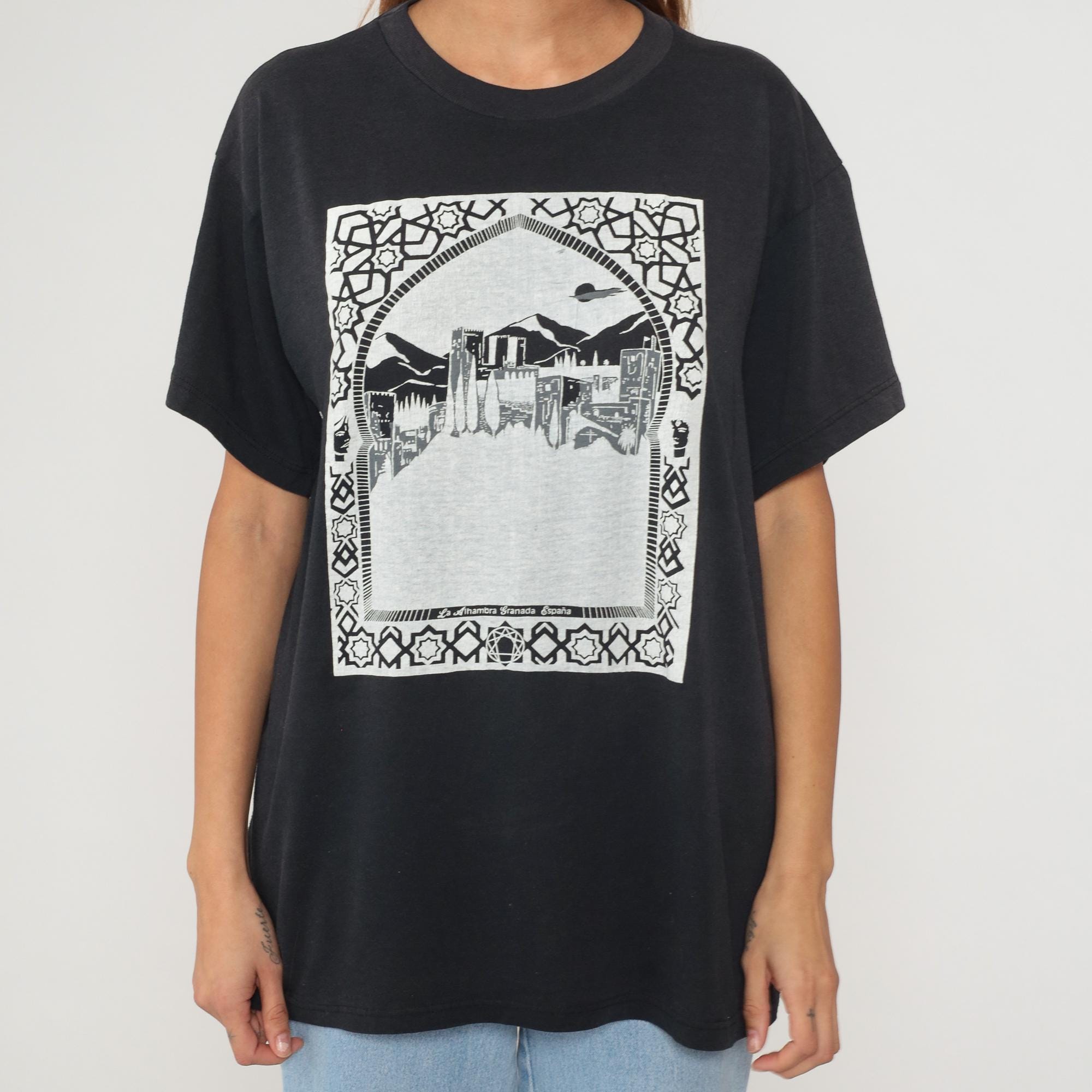 Y2K souvenir tee featuring Alhambra castle illustration with decorative border pattern. Black shirt with white graphic showing Granada Spain landmarks. Short sleeves, crew neck, and oversized relaxed fit.