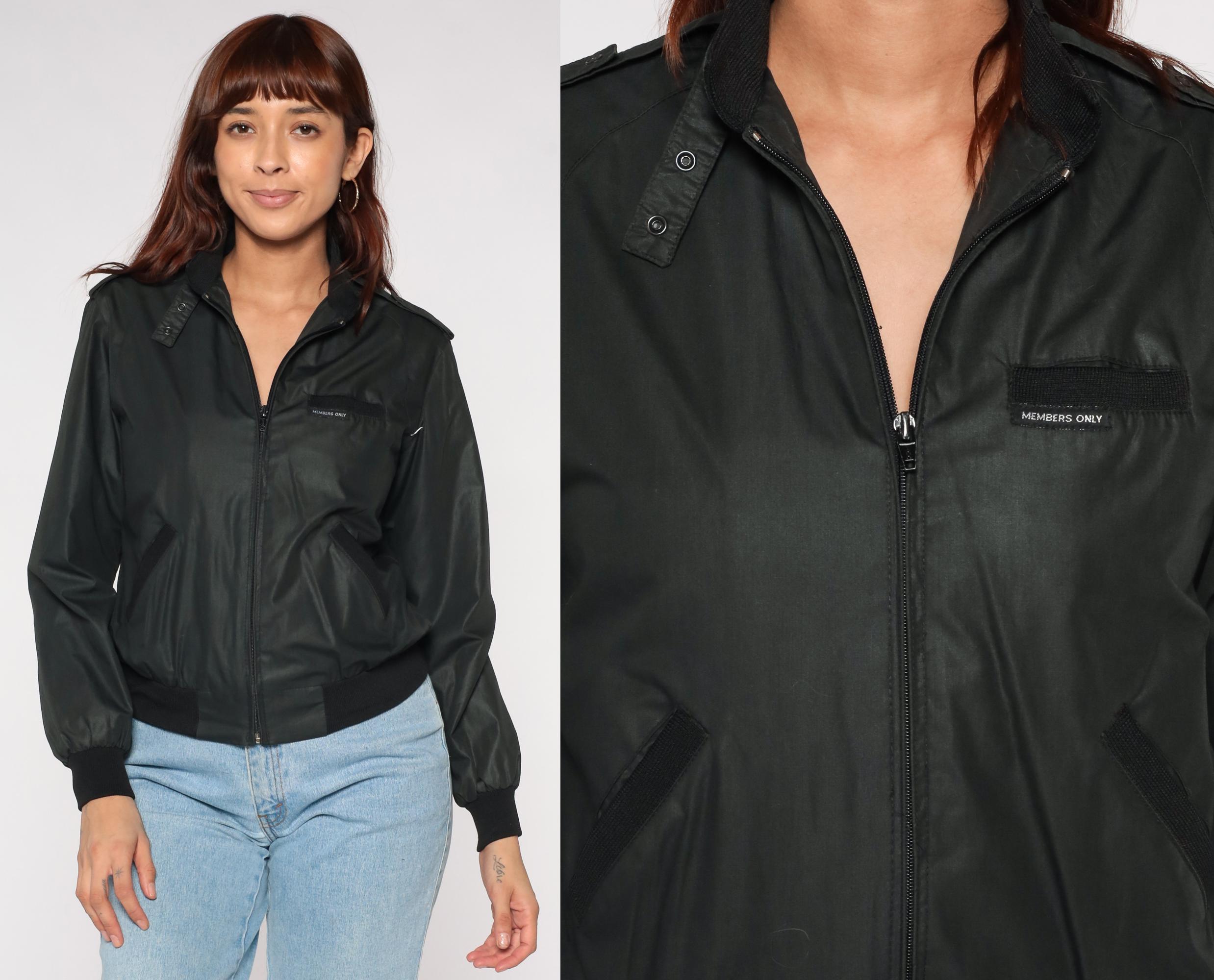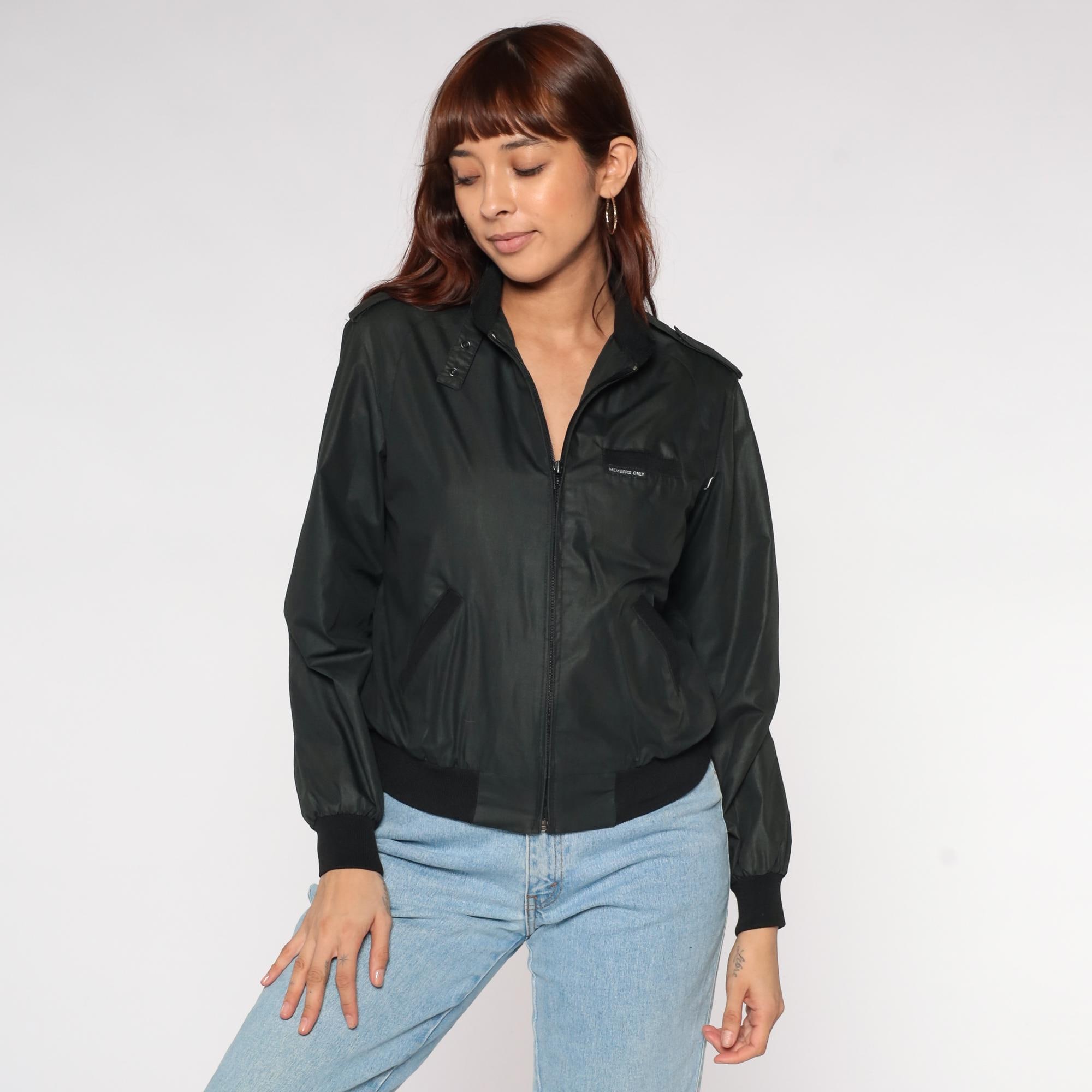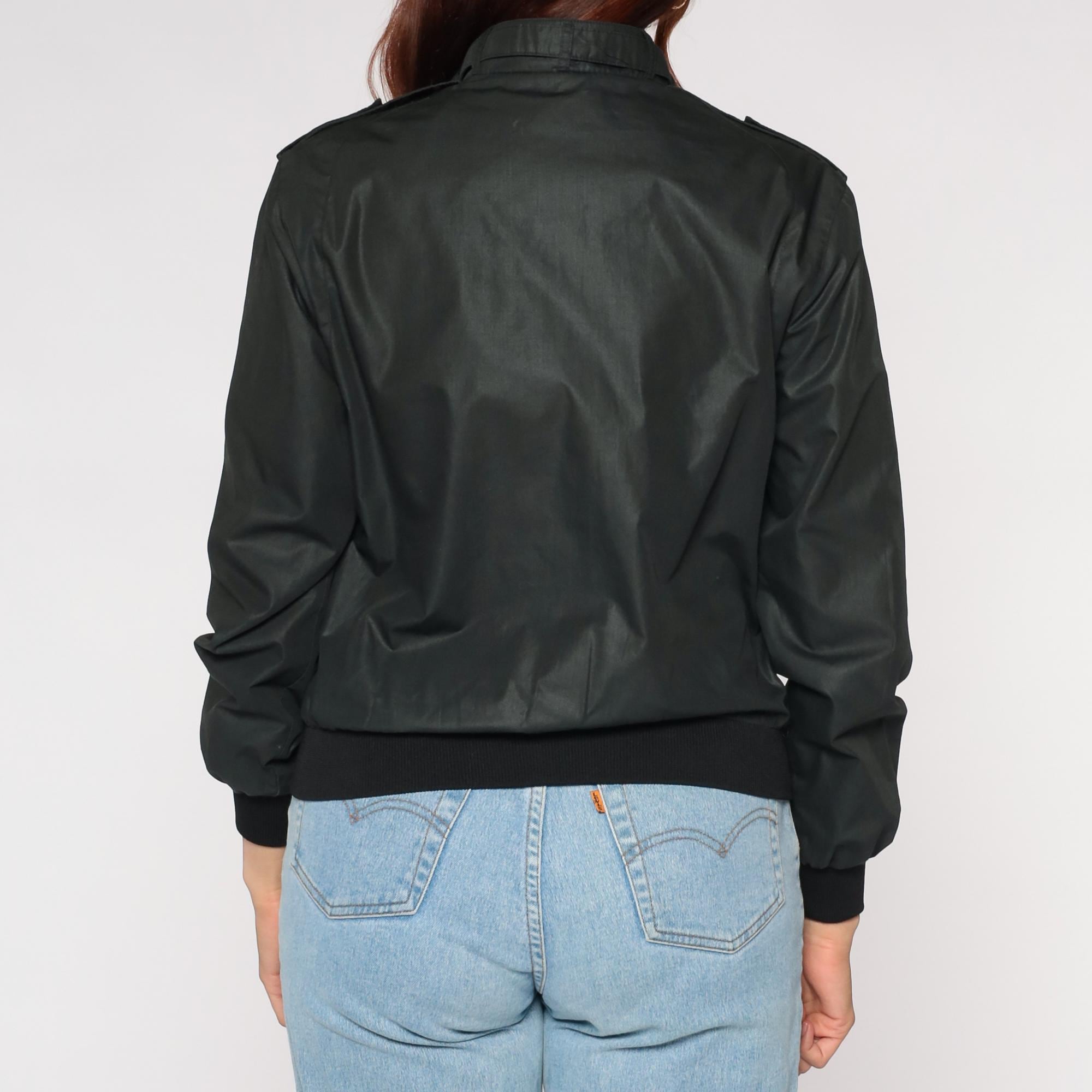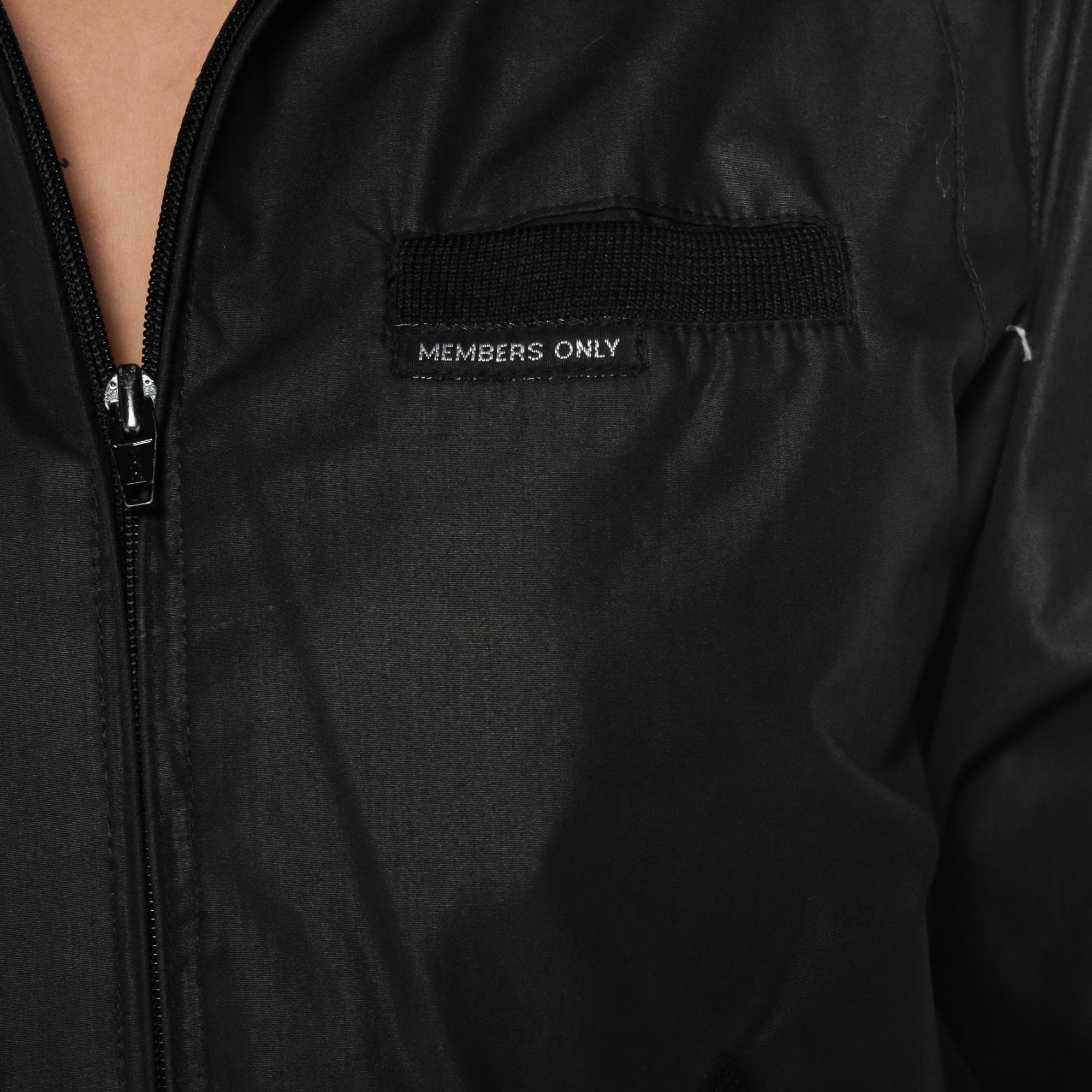 80s black bomber jacket by Members Only featuring zip-front closure with ribbed collar, cuffs, and hem.
