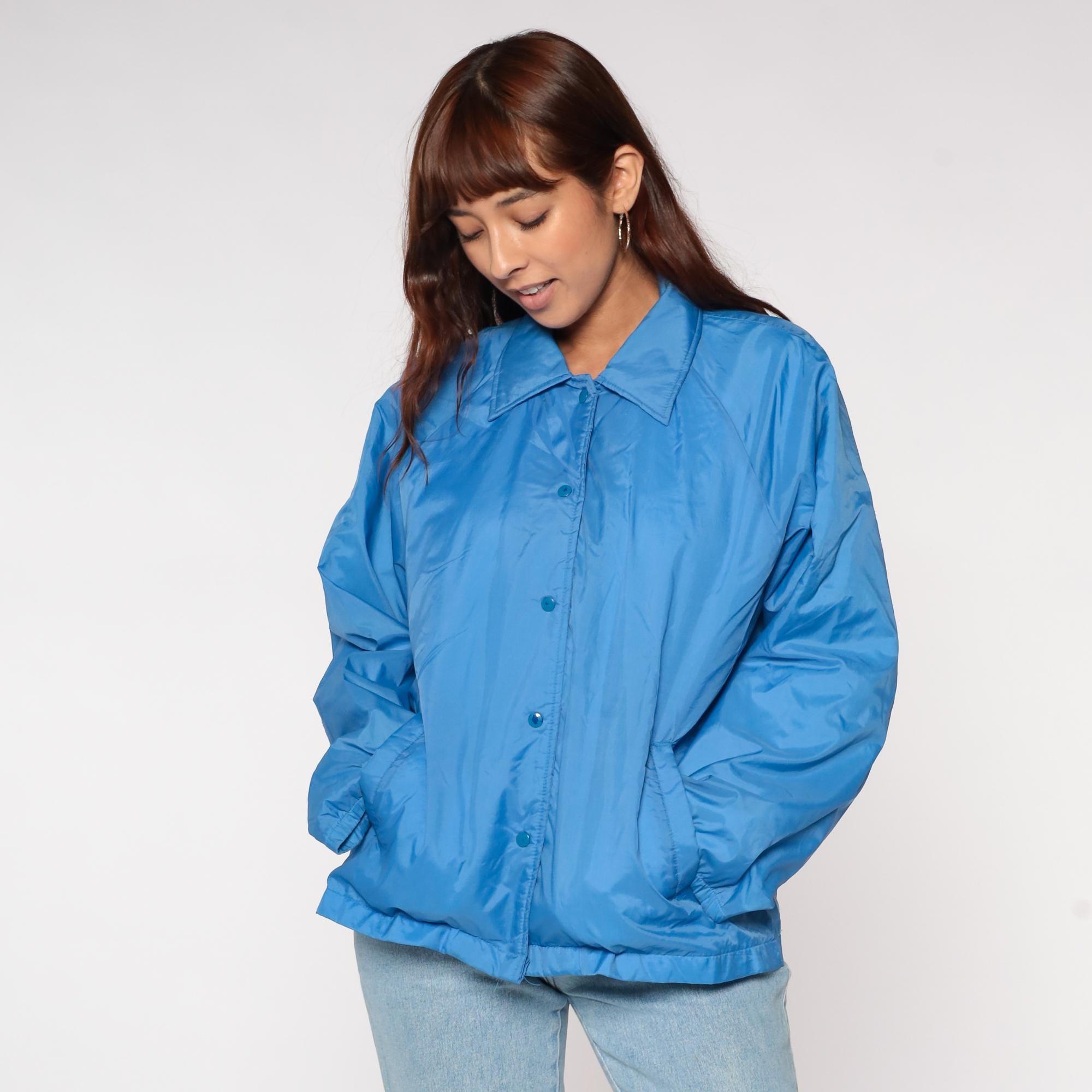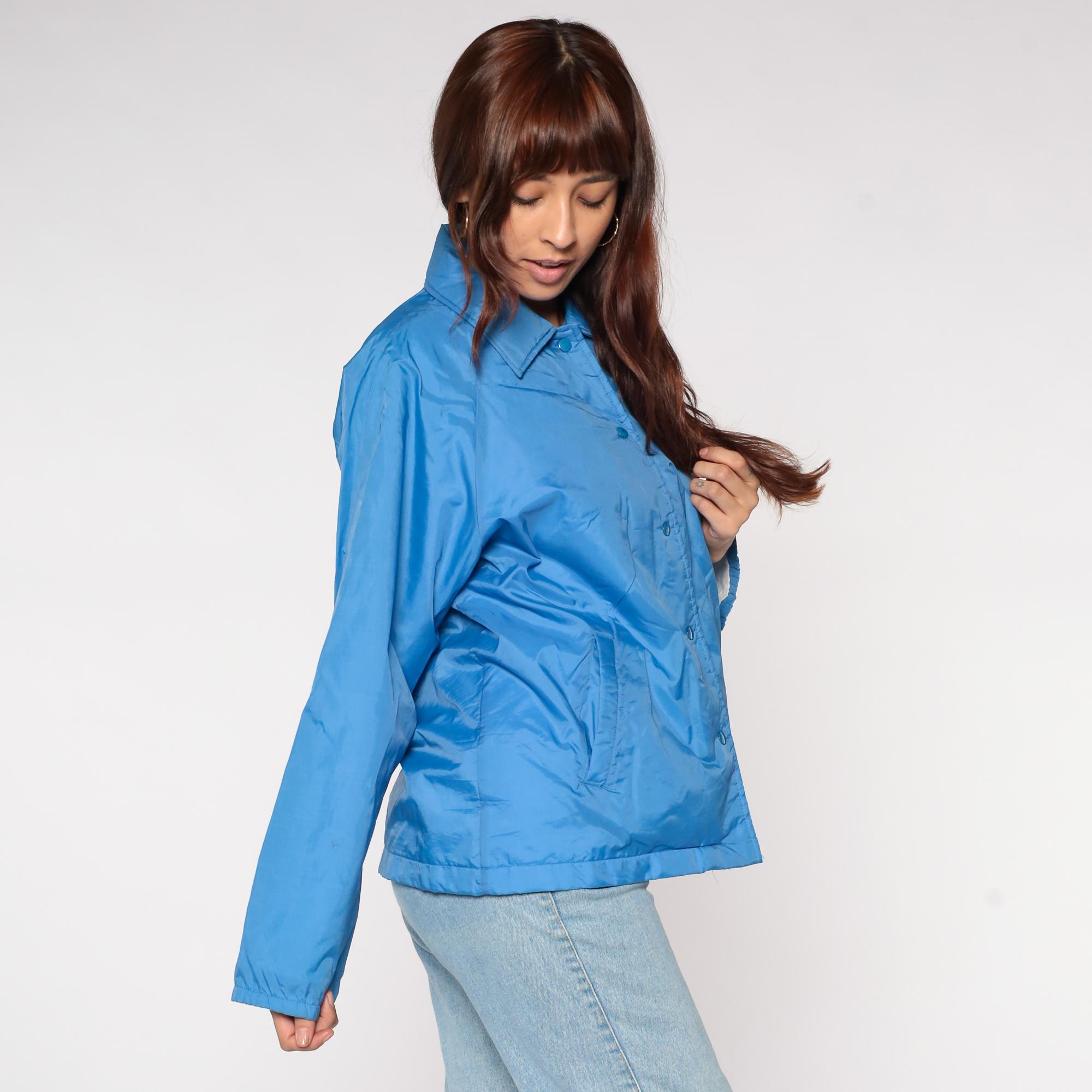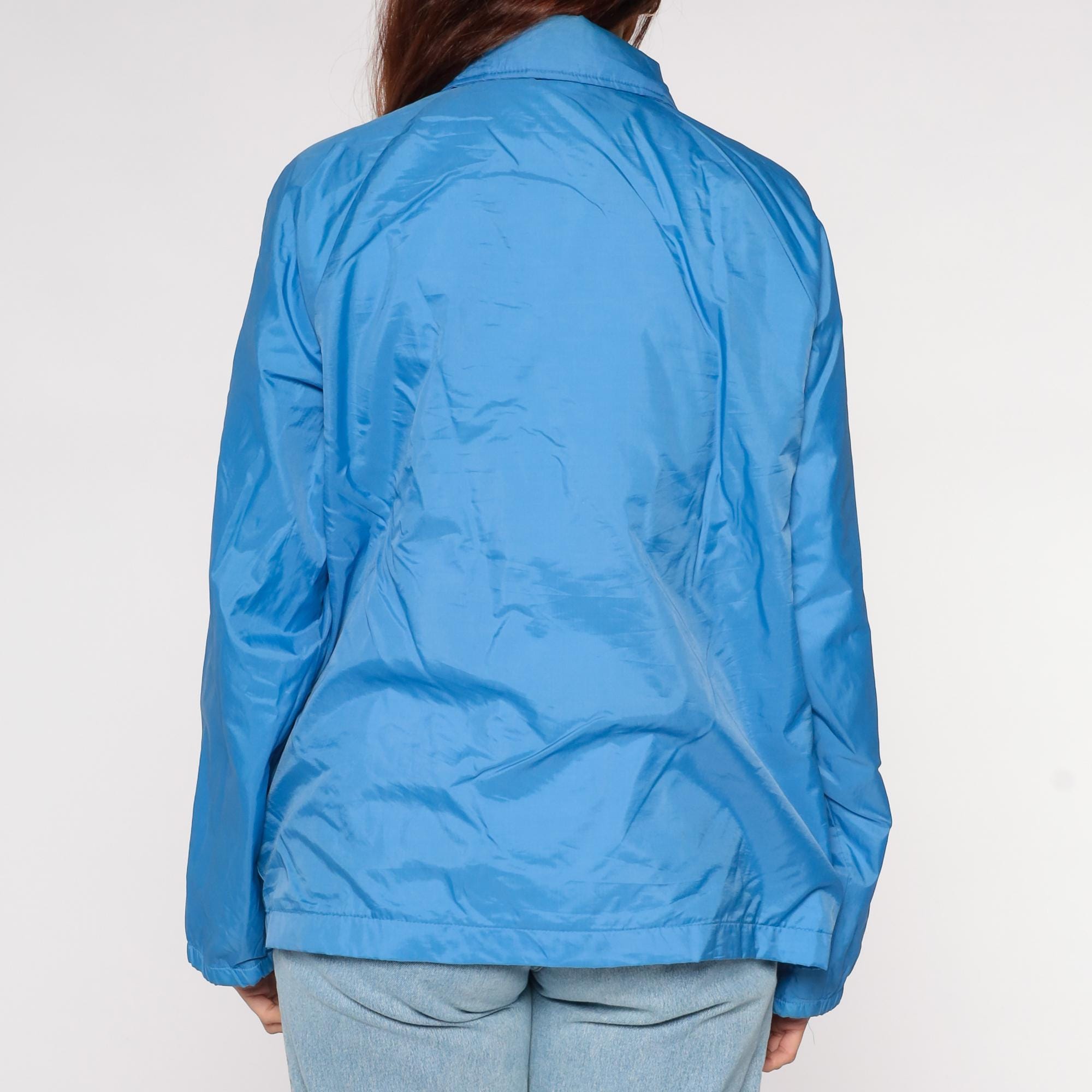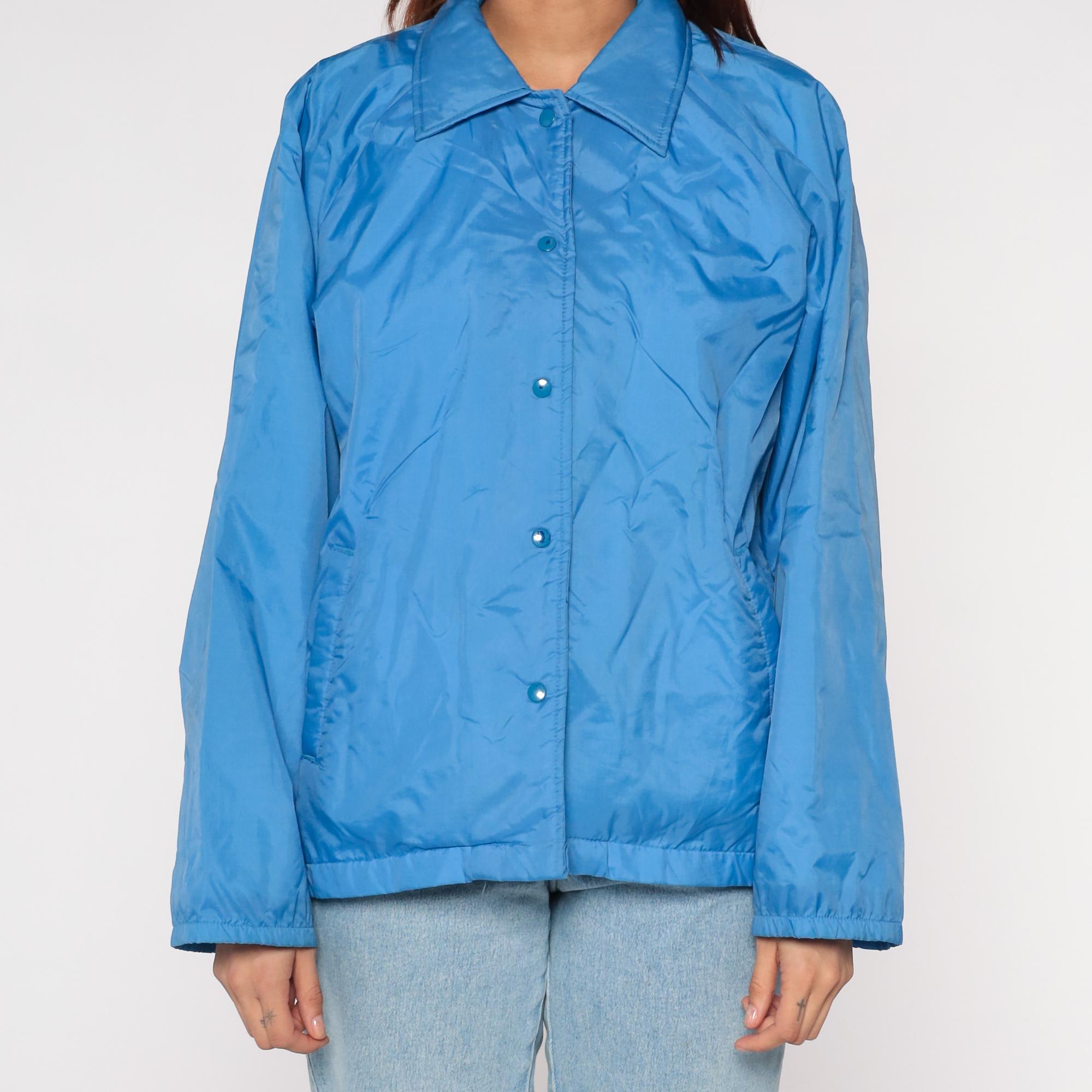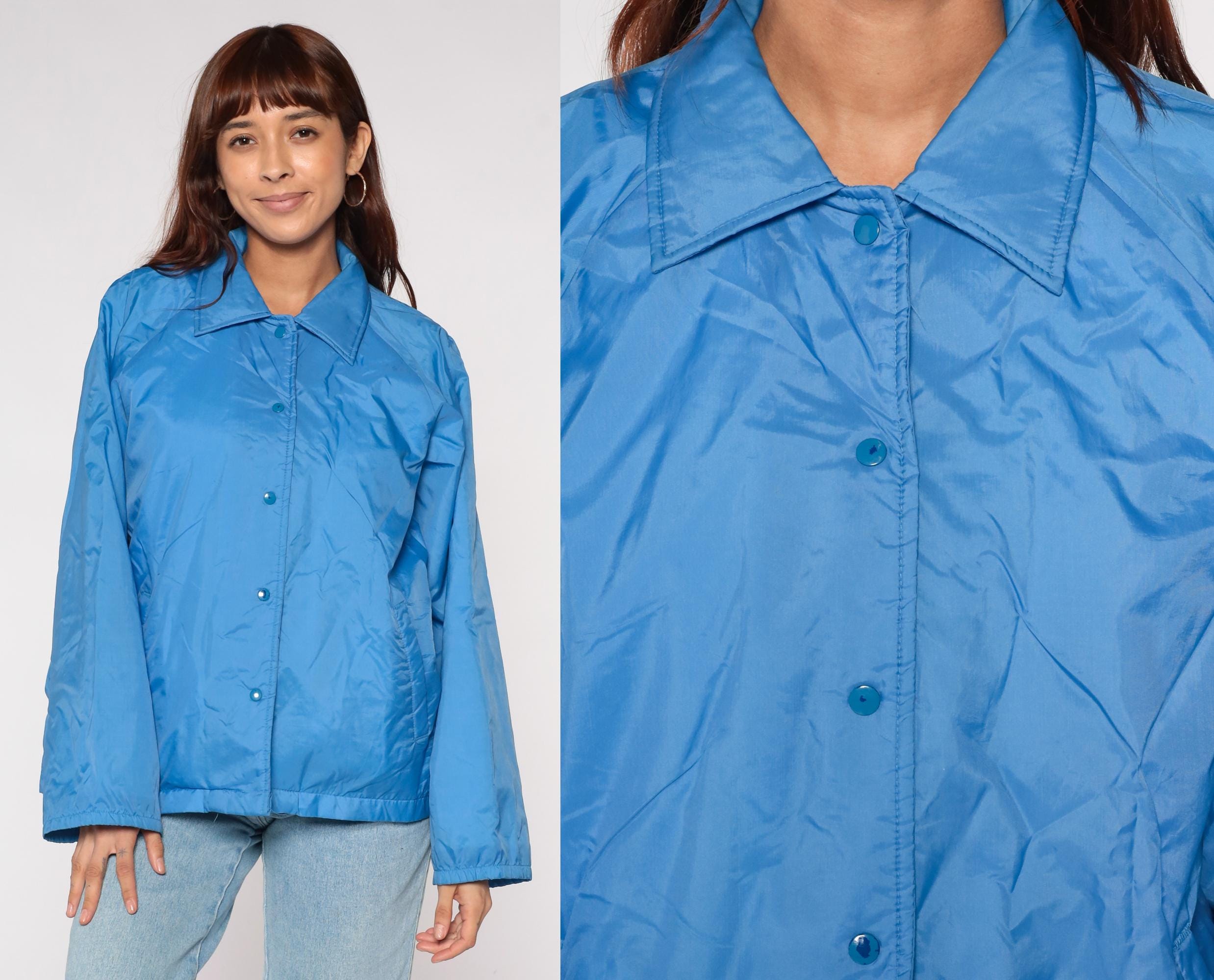 80s bright electric blue windbreaker by Sears featuring classic button-front closure with pointed collar and long sleeves.