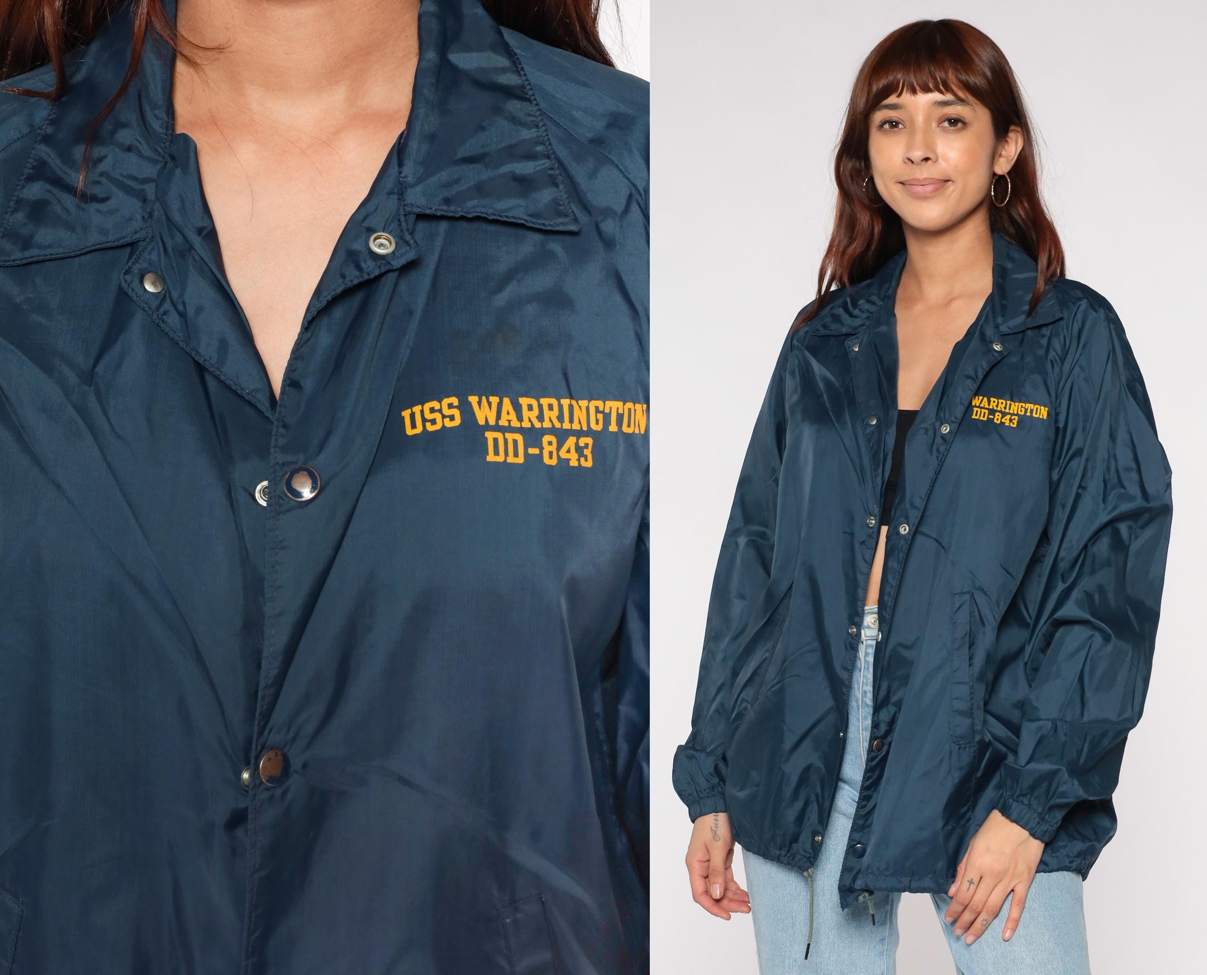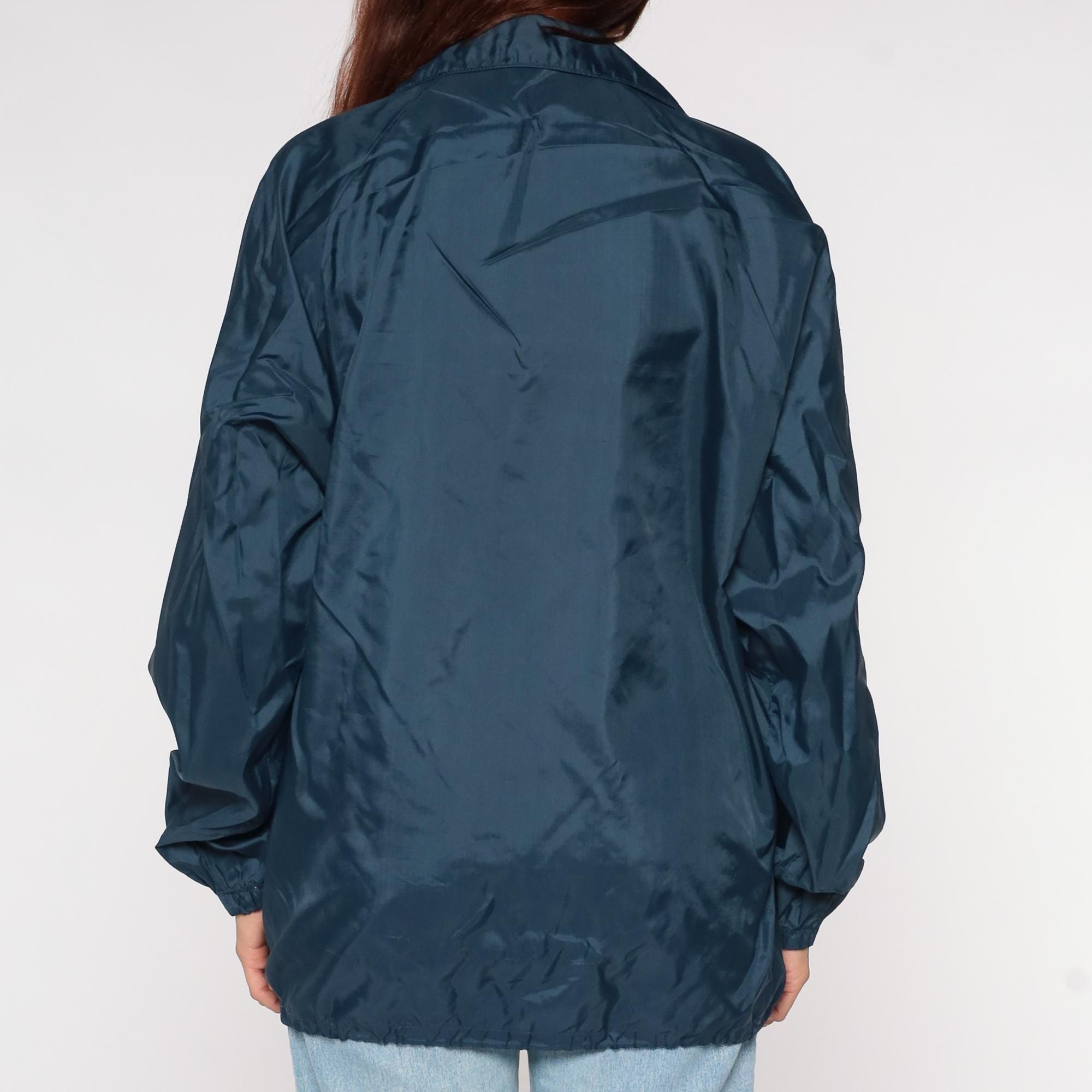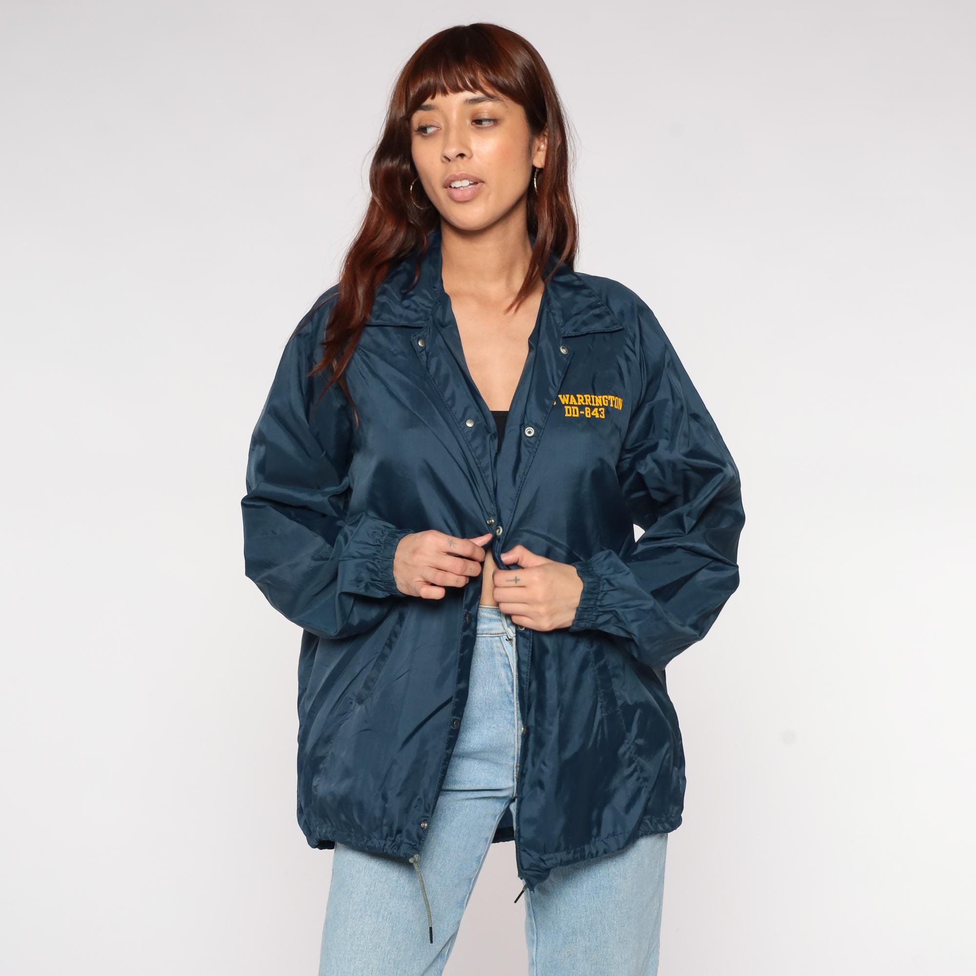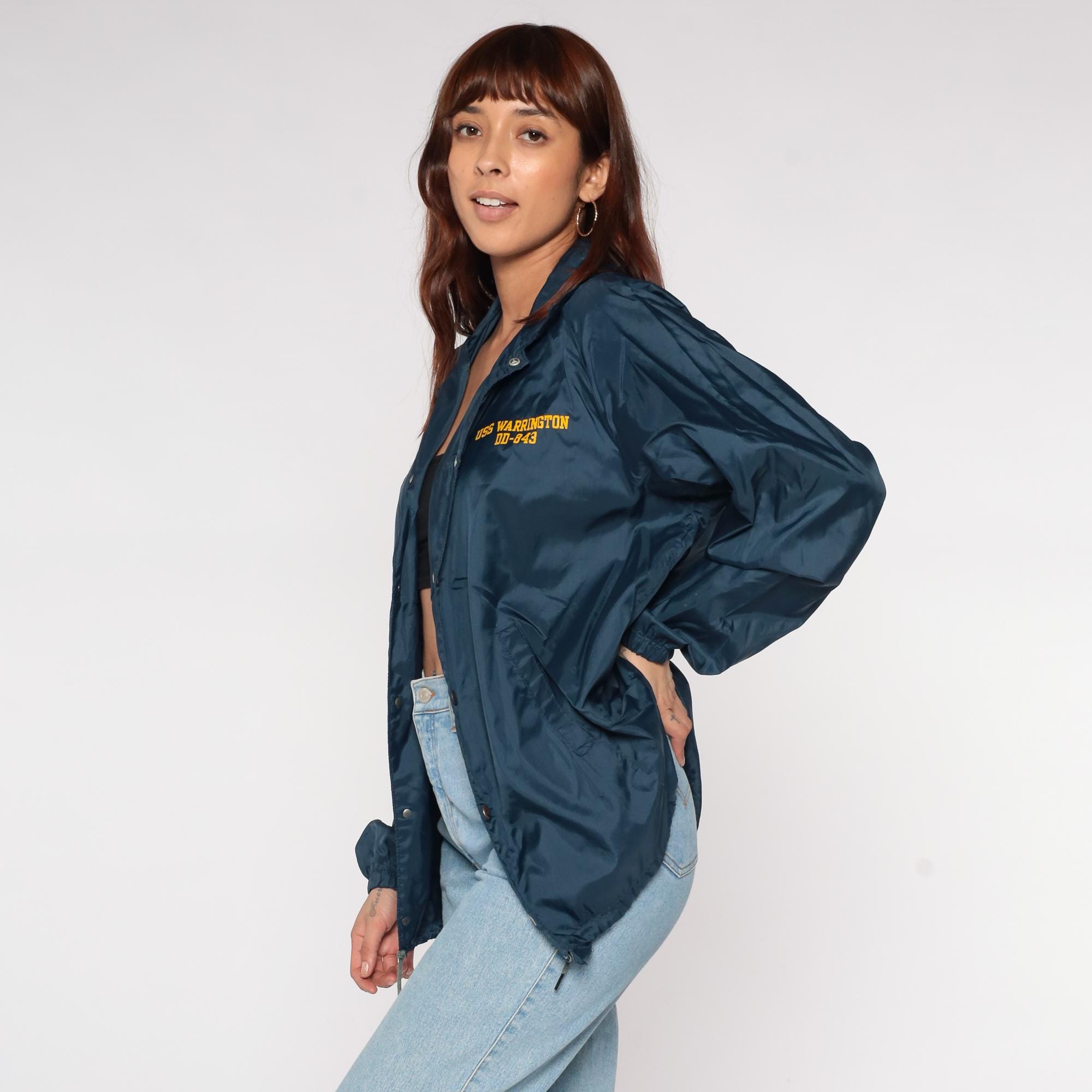 80s navy blue windbreaker by The Sportsmaster featuring text in yellow lettering. Button-front closure with drawstring hem and elastic cuffs.