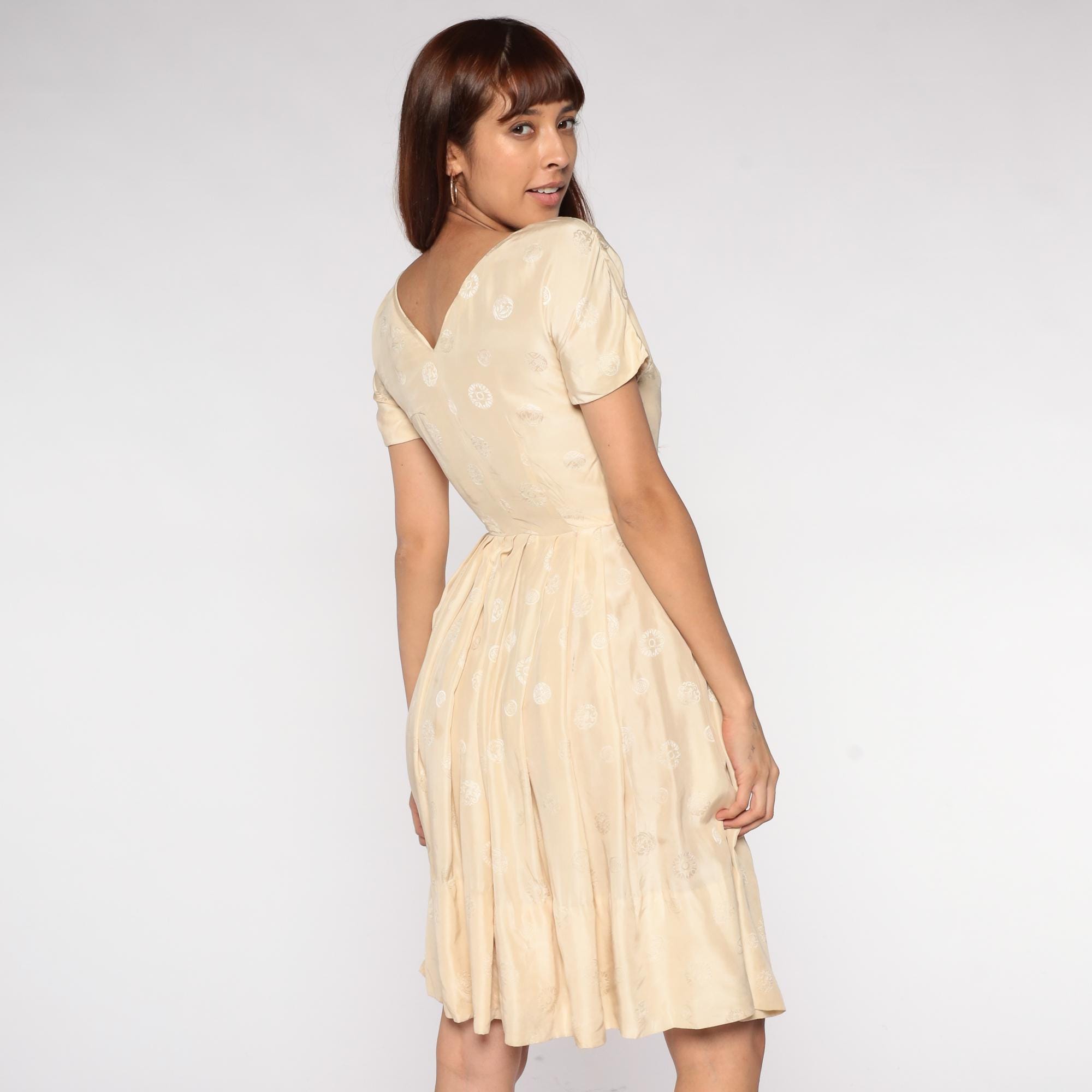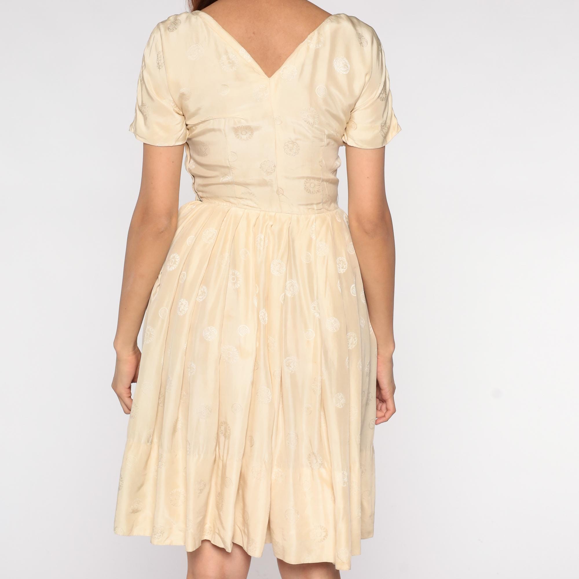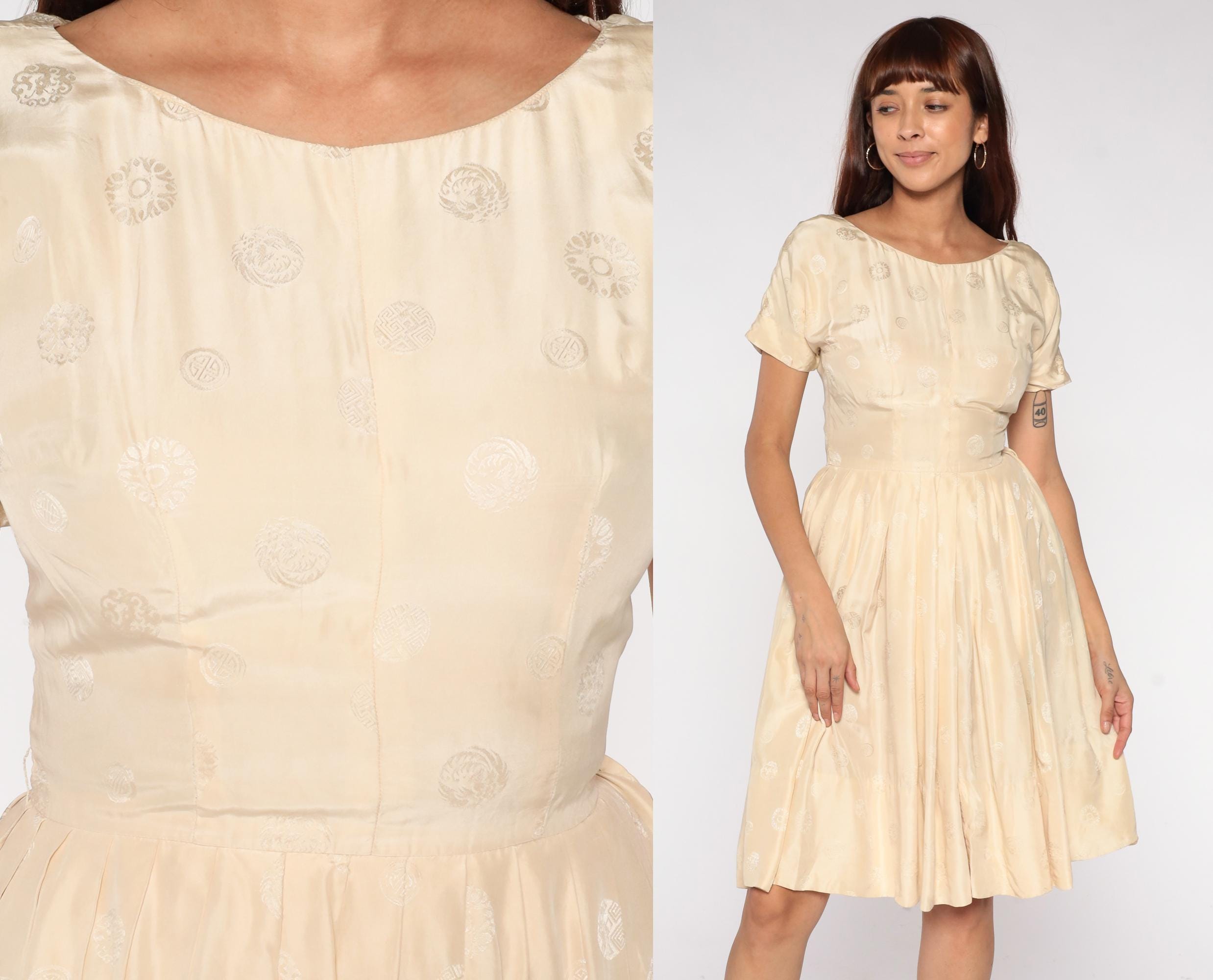 60s cream embroidered dress featuring delicate white floral embroidery throughout fabric. Short sleeves with round neckline and fitted bodice with full circle skirt. Silk-feel construction with intricate embroidered details perfect for special occasions and romantic vintage styling.