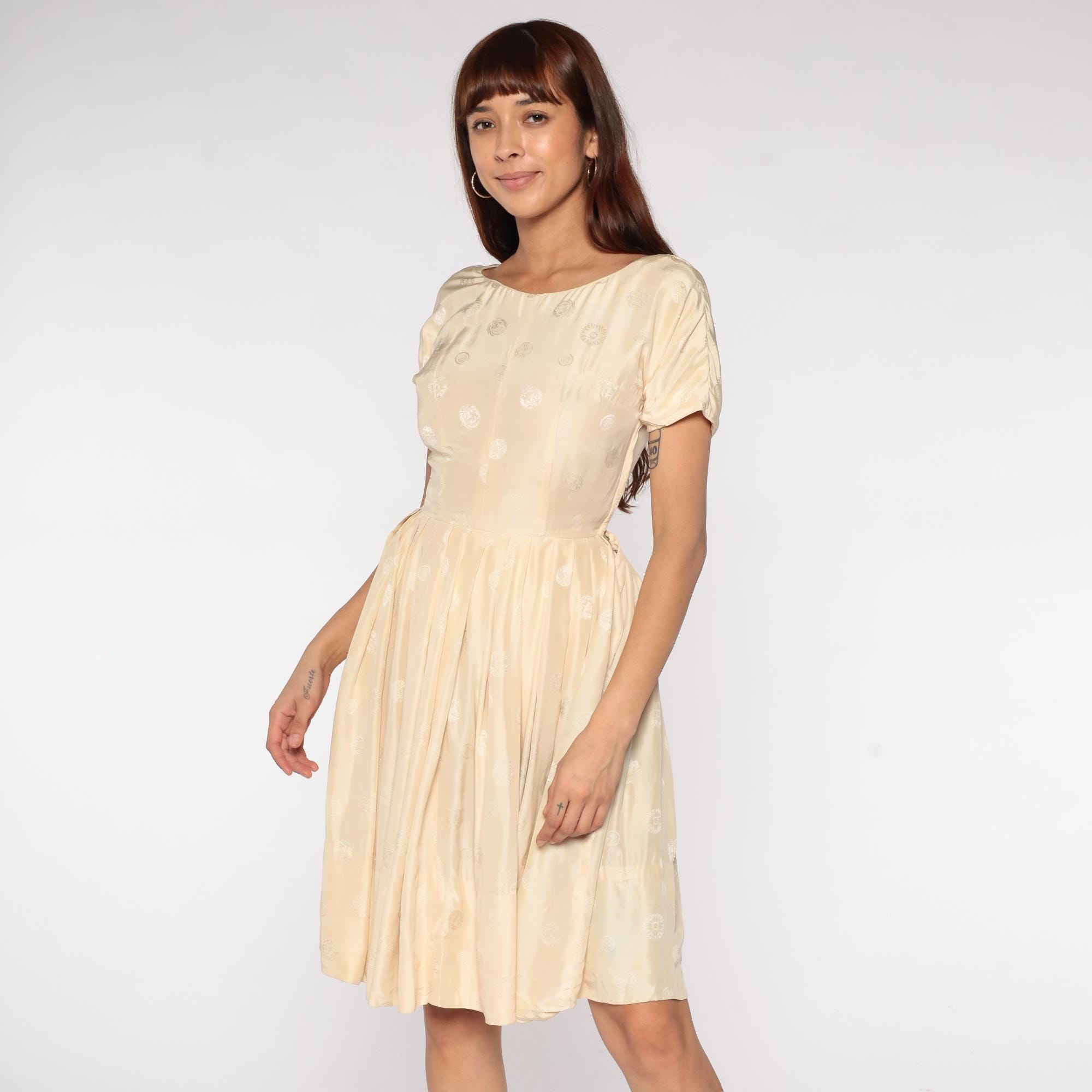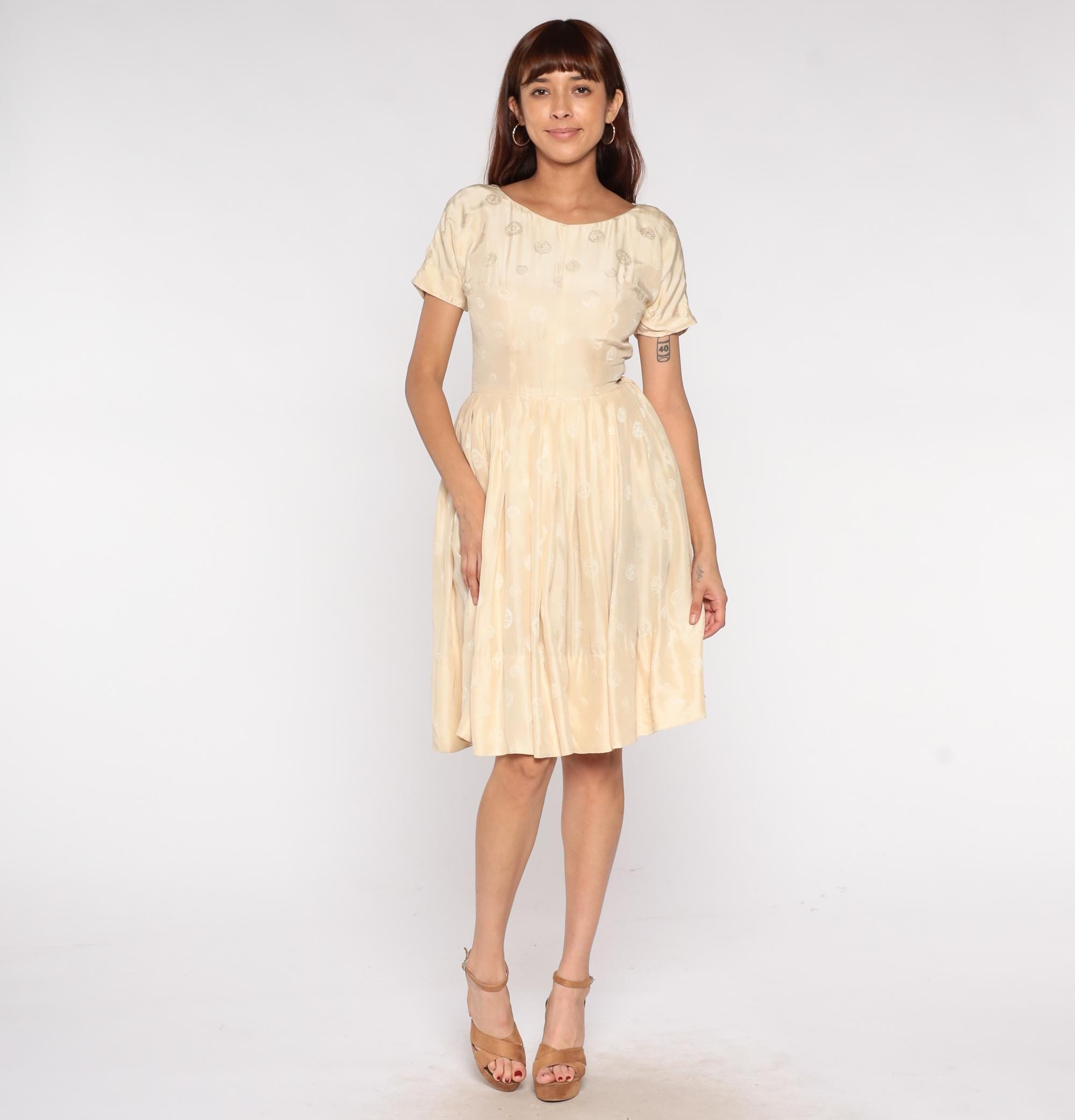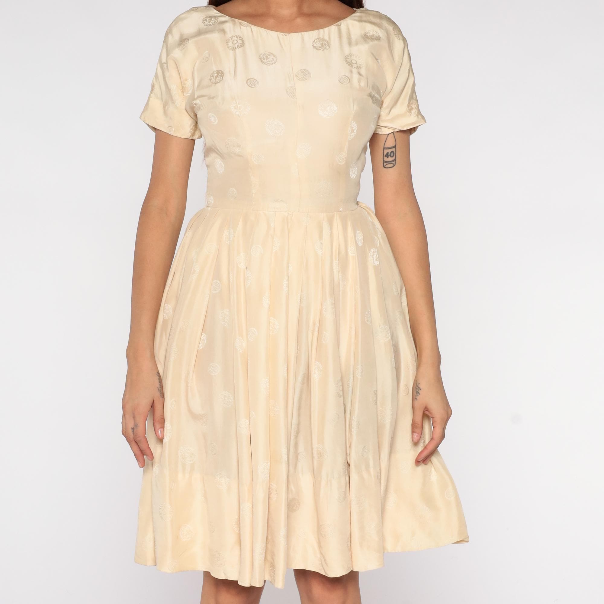 60s cream embroidered dress featuring delicate white floral embroidery throughout fabric. Short sleeves with round neckline and fitted bodice with full circle skirt. Silk-feel construction with intricate embroidered details perfect for special occasions and romantic vintage styling.