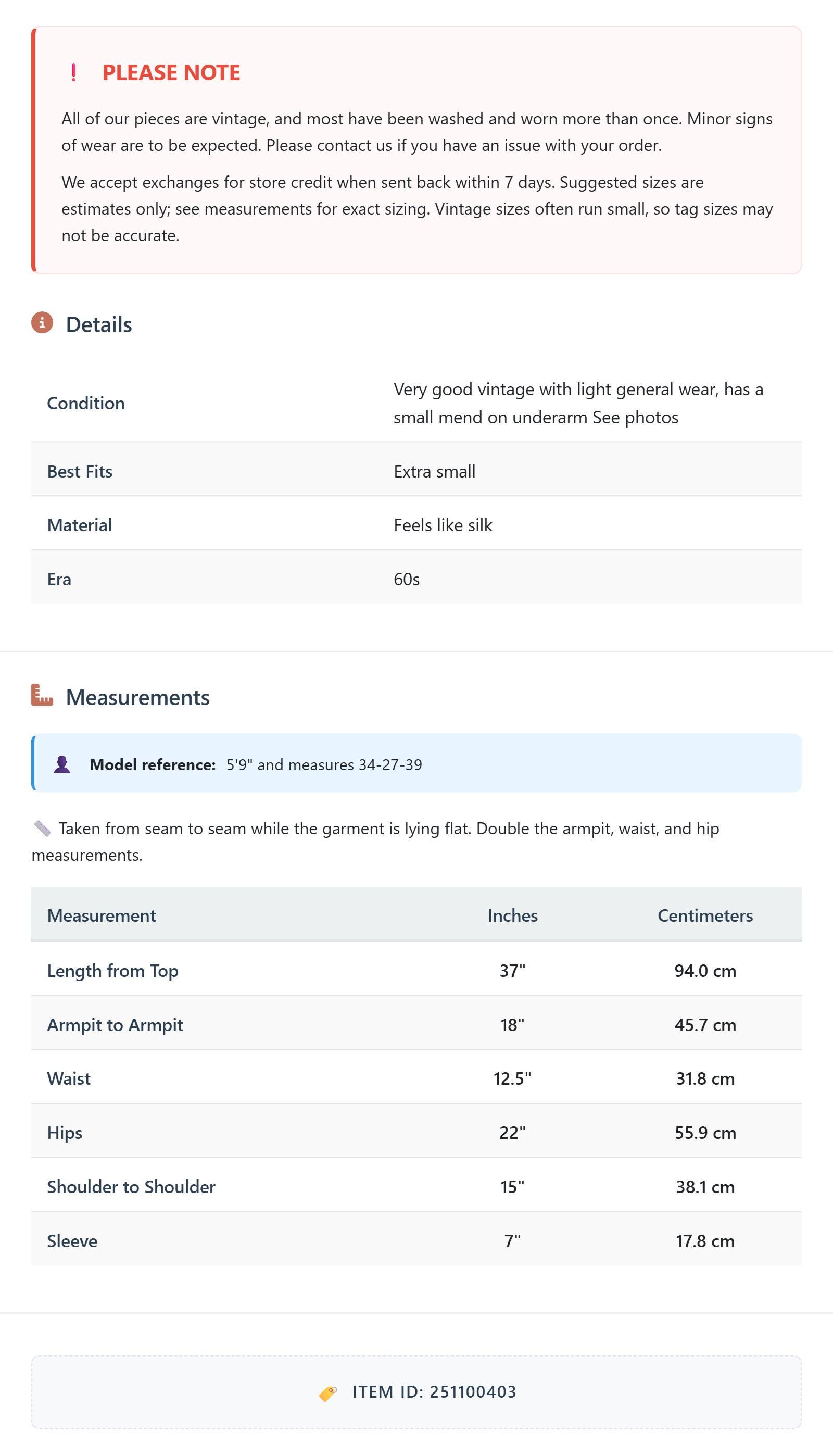 Condition: Very good vintage with light general wear, has a small mend on underarm See photos