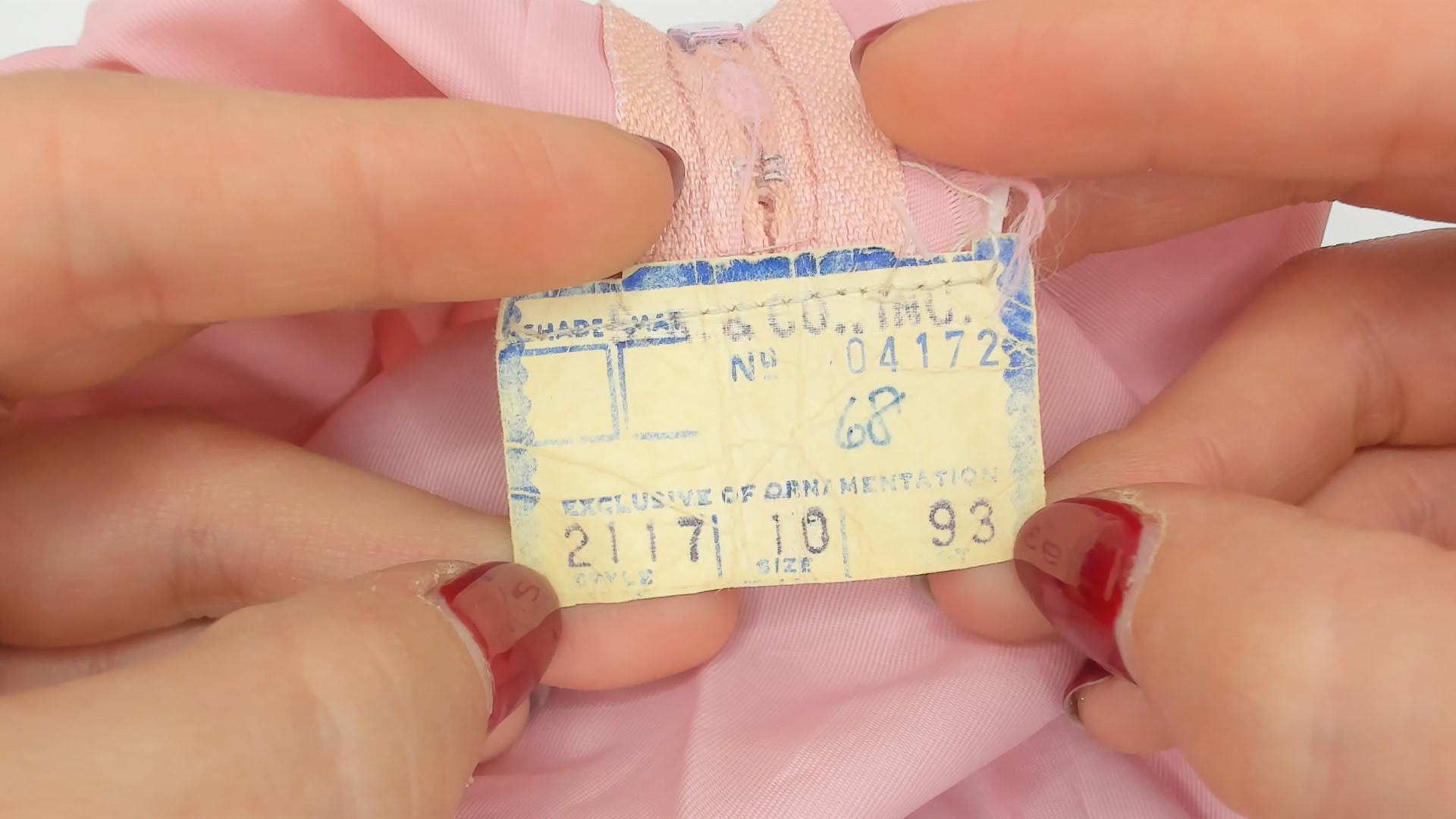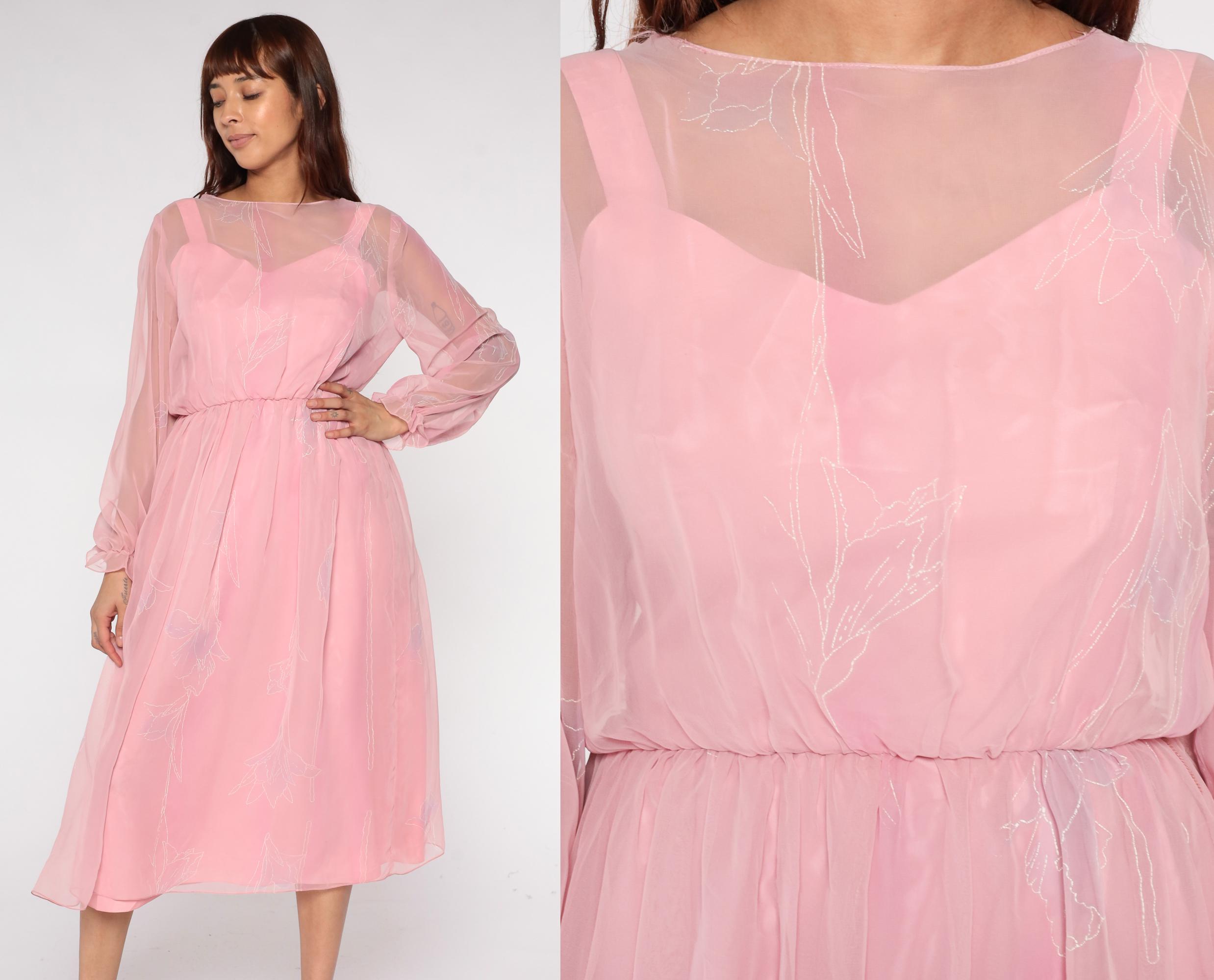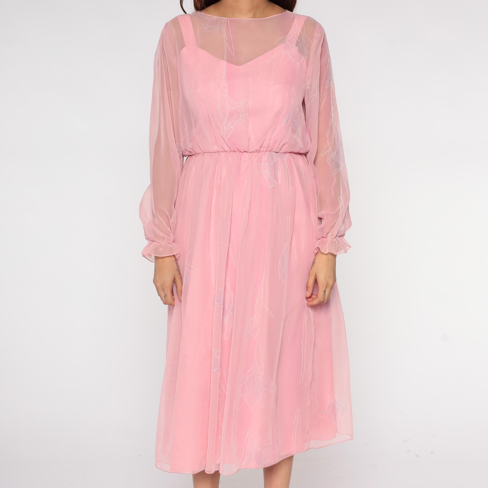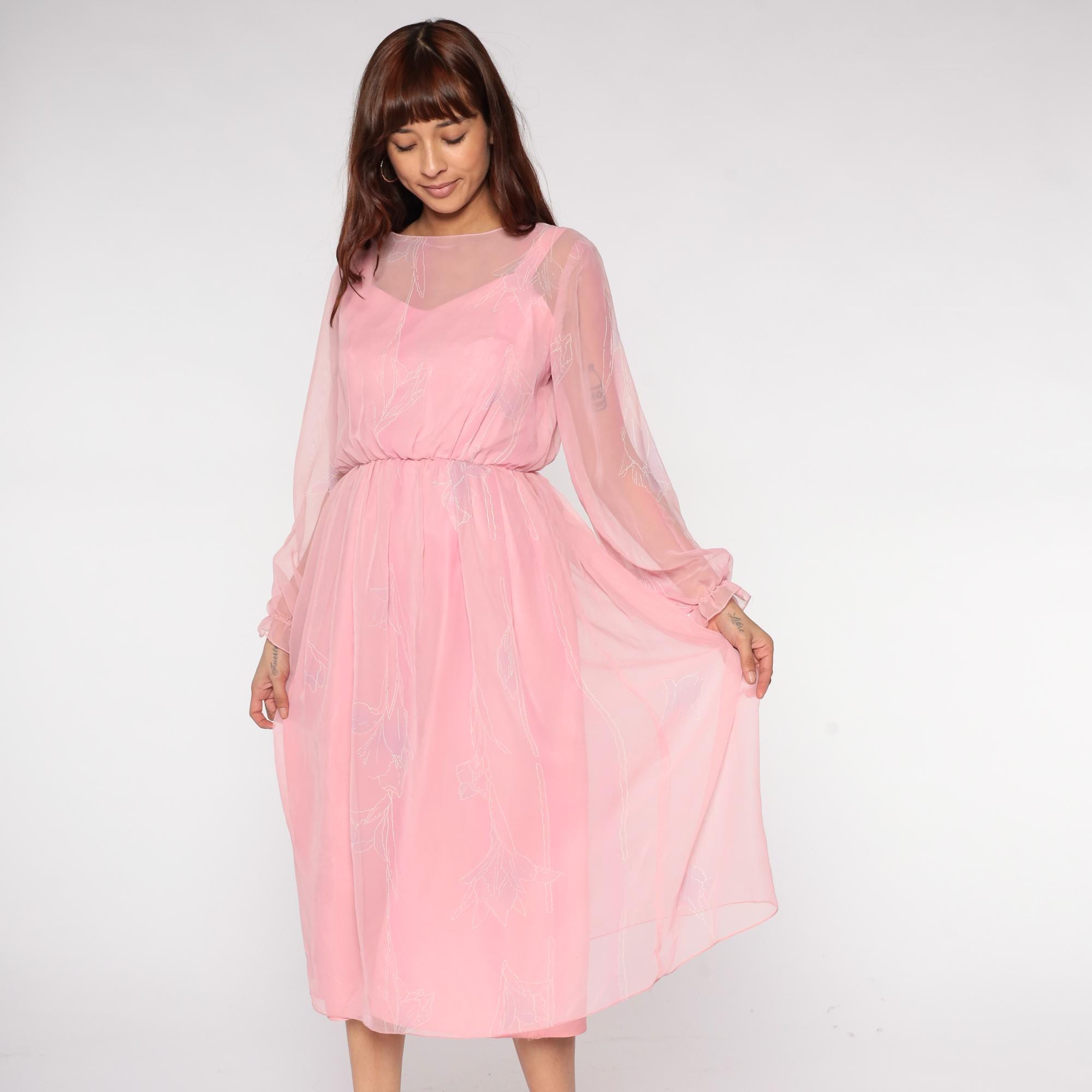 60s pink chiffon dress featuring sheer long sleeves with elastic cuffs and delicate floral print throughout. Round neckline with gathered waist and flowing midi-length skirt.