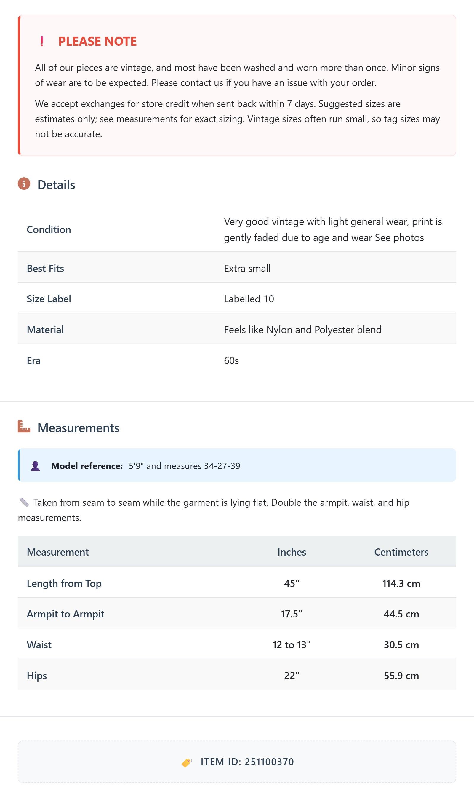 All of our pieces are vintage, and most have been washed and worn more than once. Minor signs of wear are to be expected. Please contact us if you have an issue with your order. We accept exchanges for store credit when sent back within 7 days.