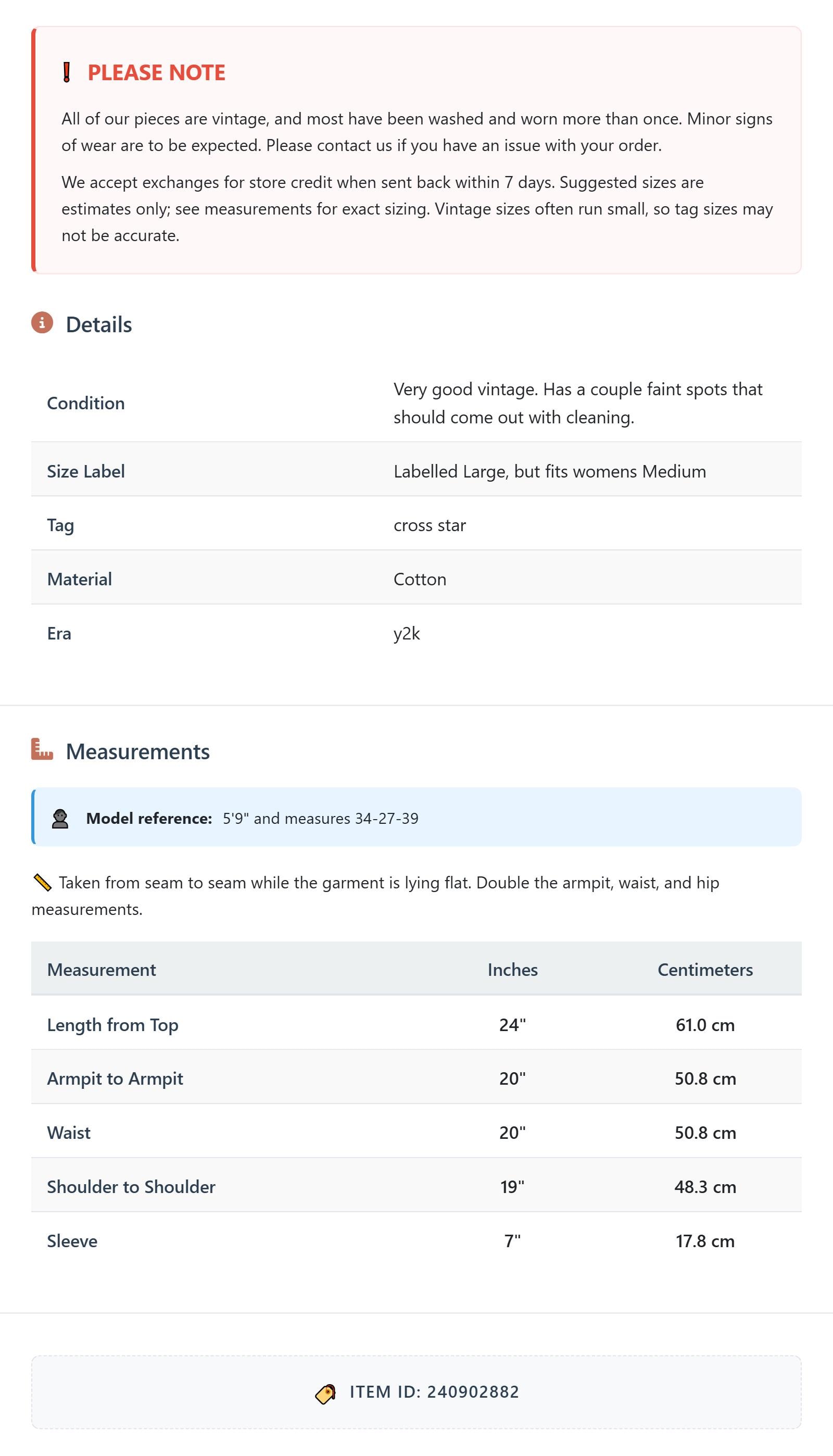 All of our pieces are vintage, and most have been washed and worn more than once. Minor signs of wear are to be expected. Please contact us if you have an issue with your order. We accept exchanges for store credit when sent back within 7 days.