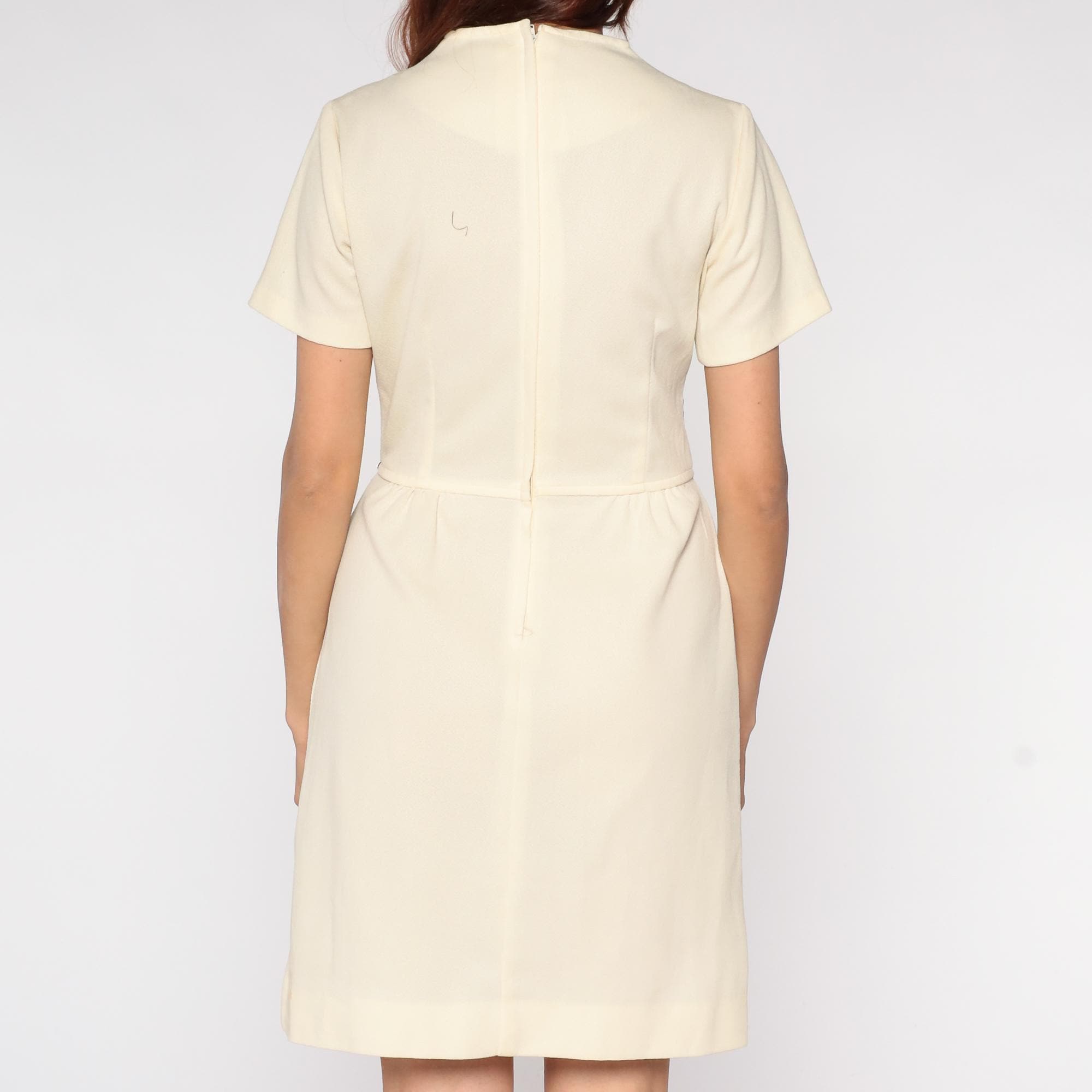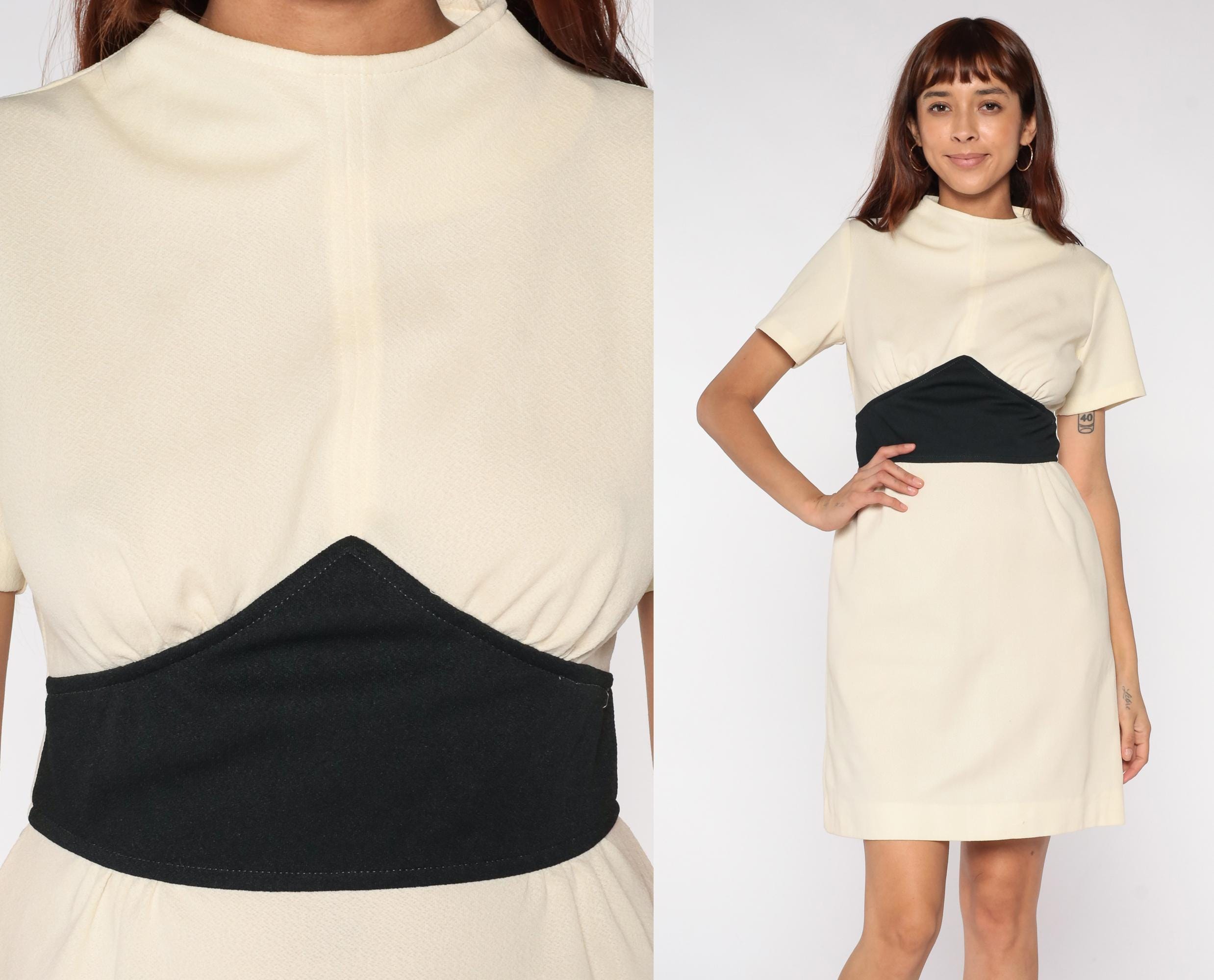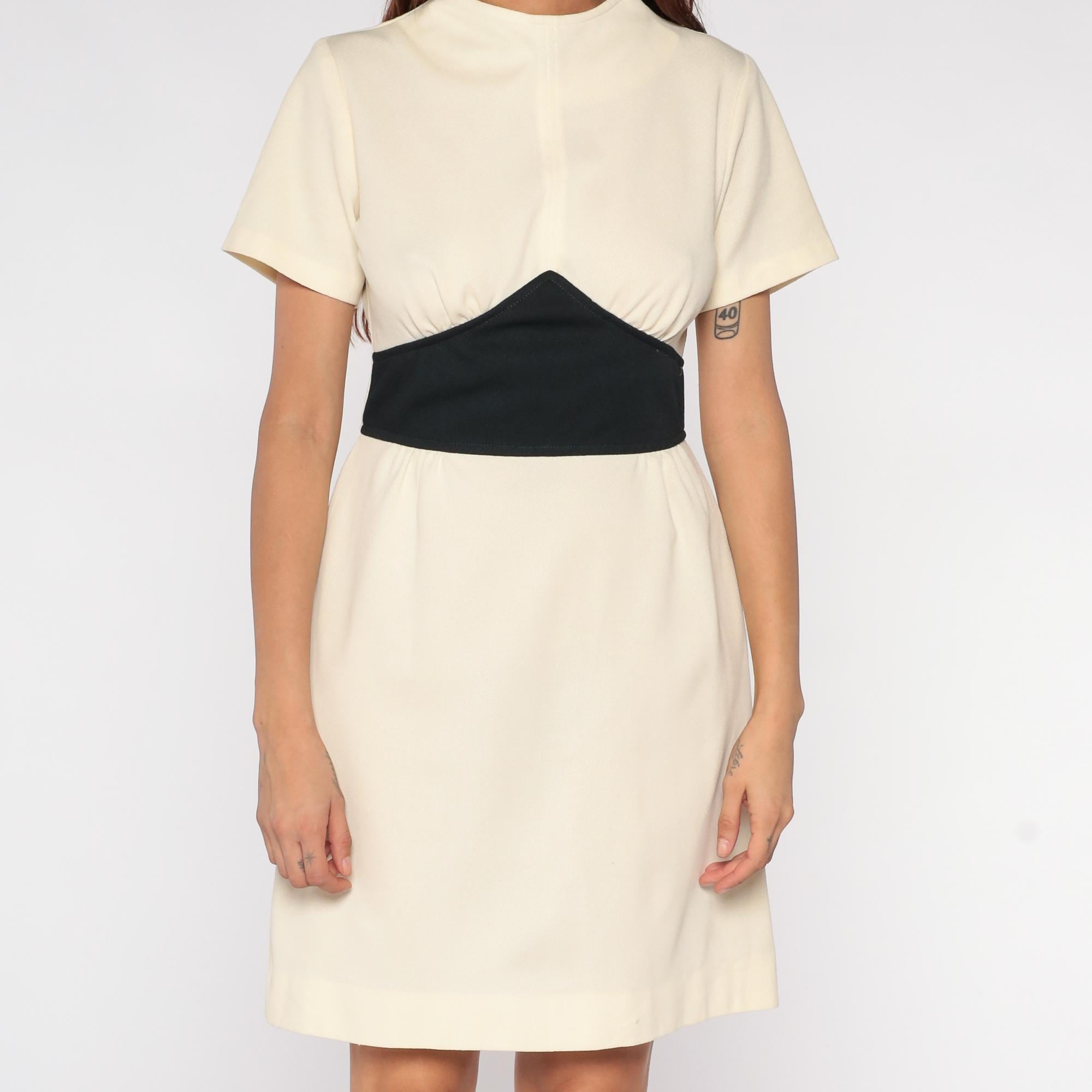 60s ivory mini dress featuring a sculptural black waistband with a pointed center panel. Constructed from midweight polyester with a clean shift silhouette and short sleeves.