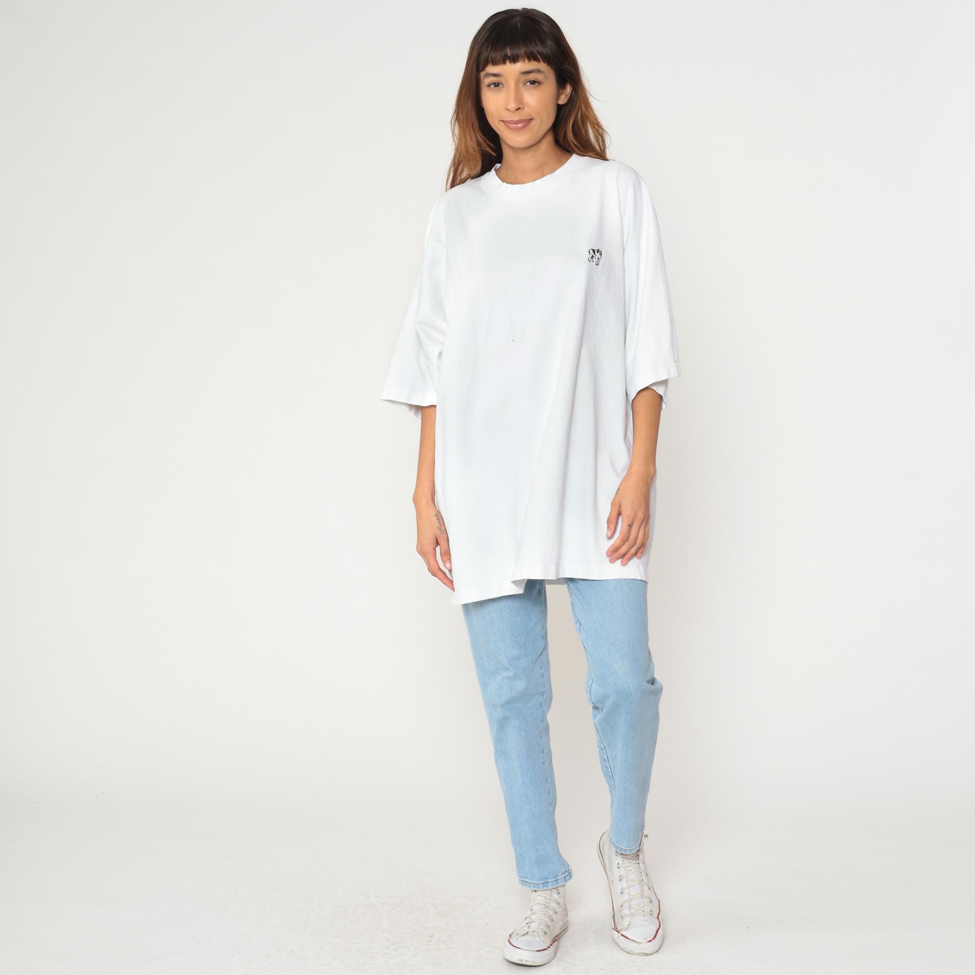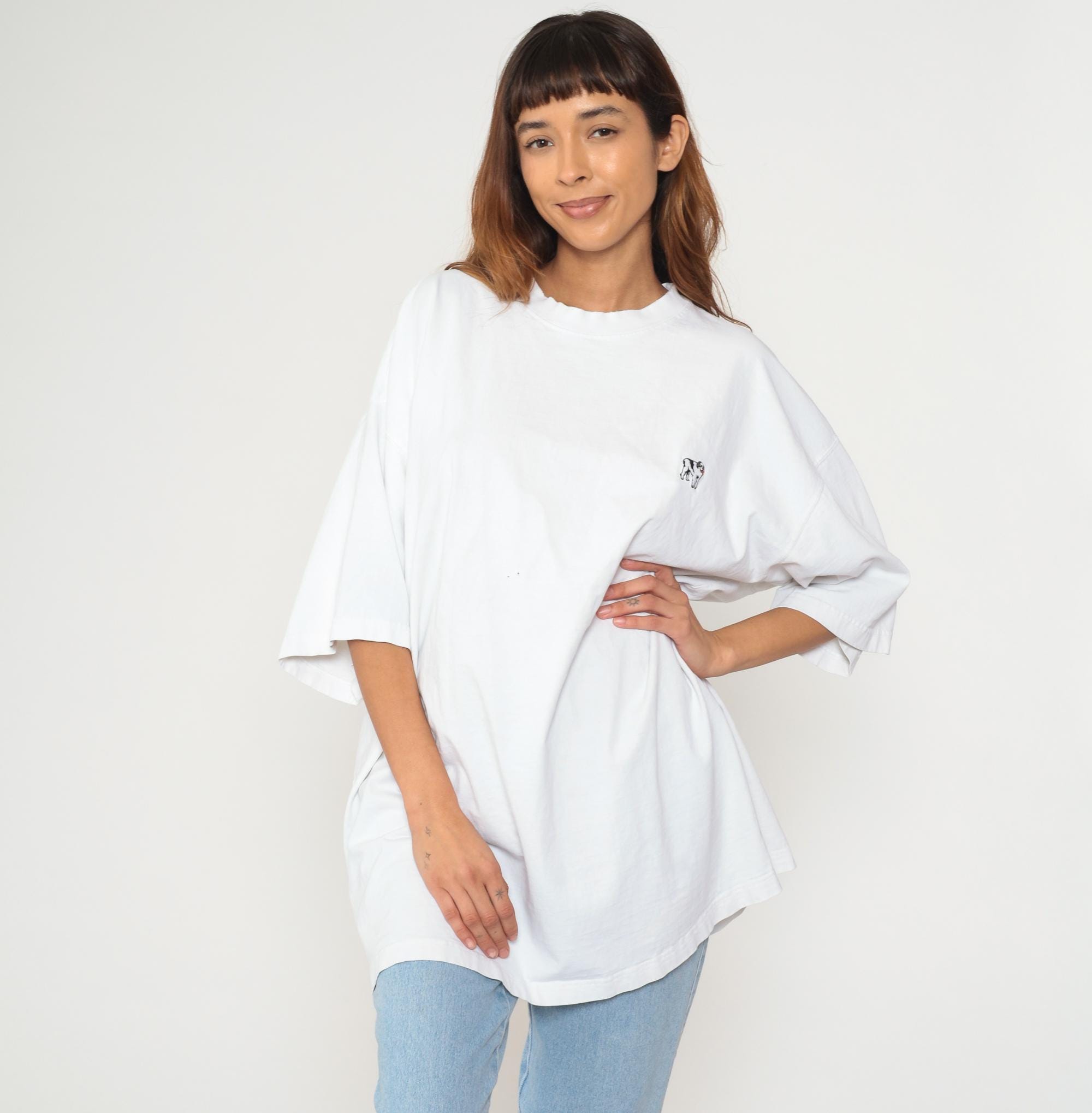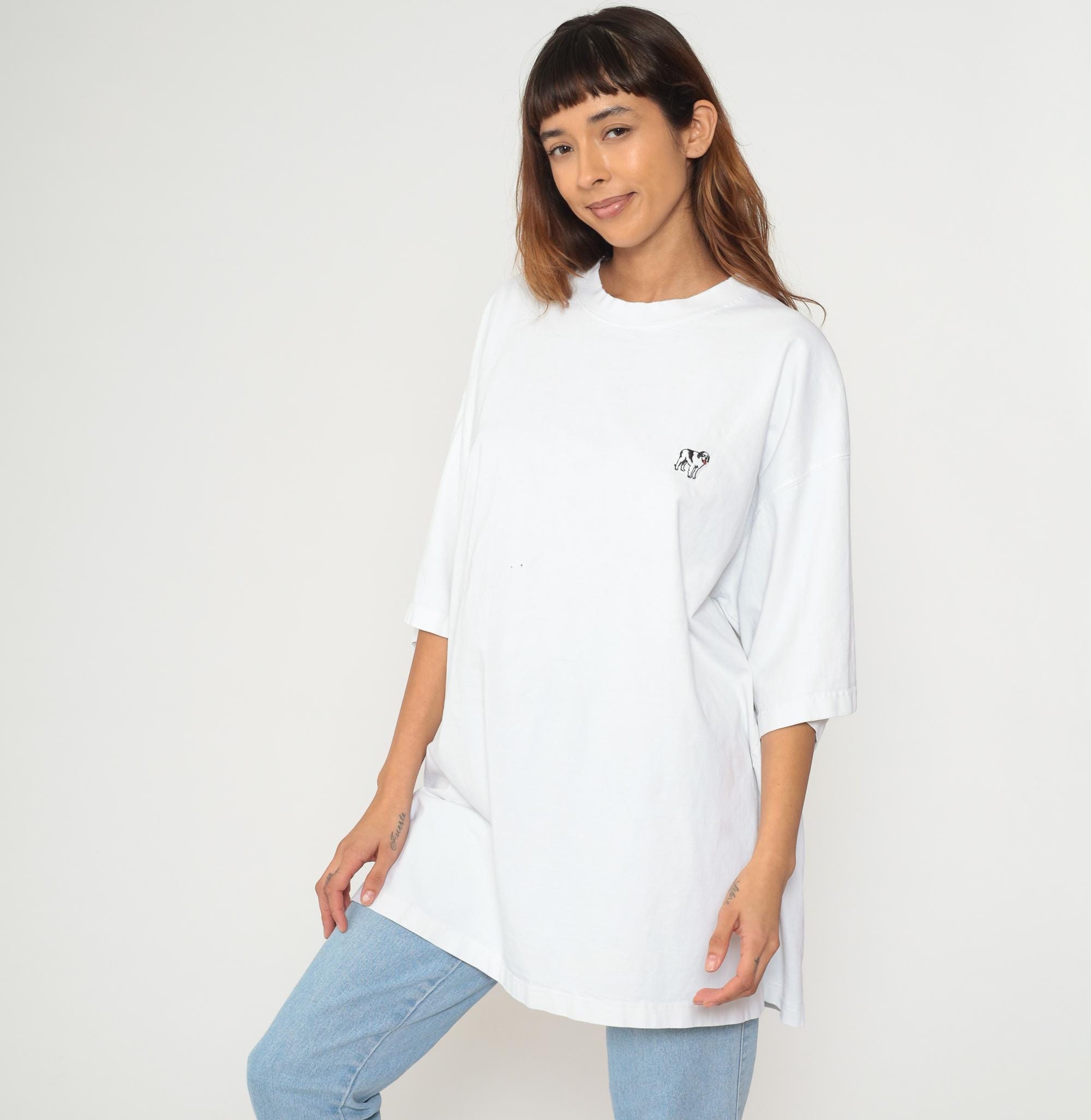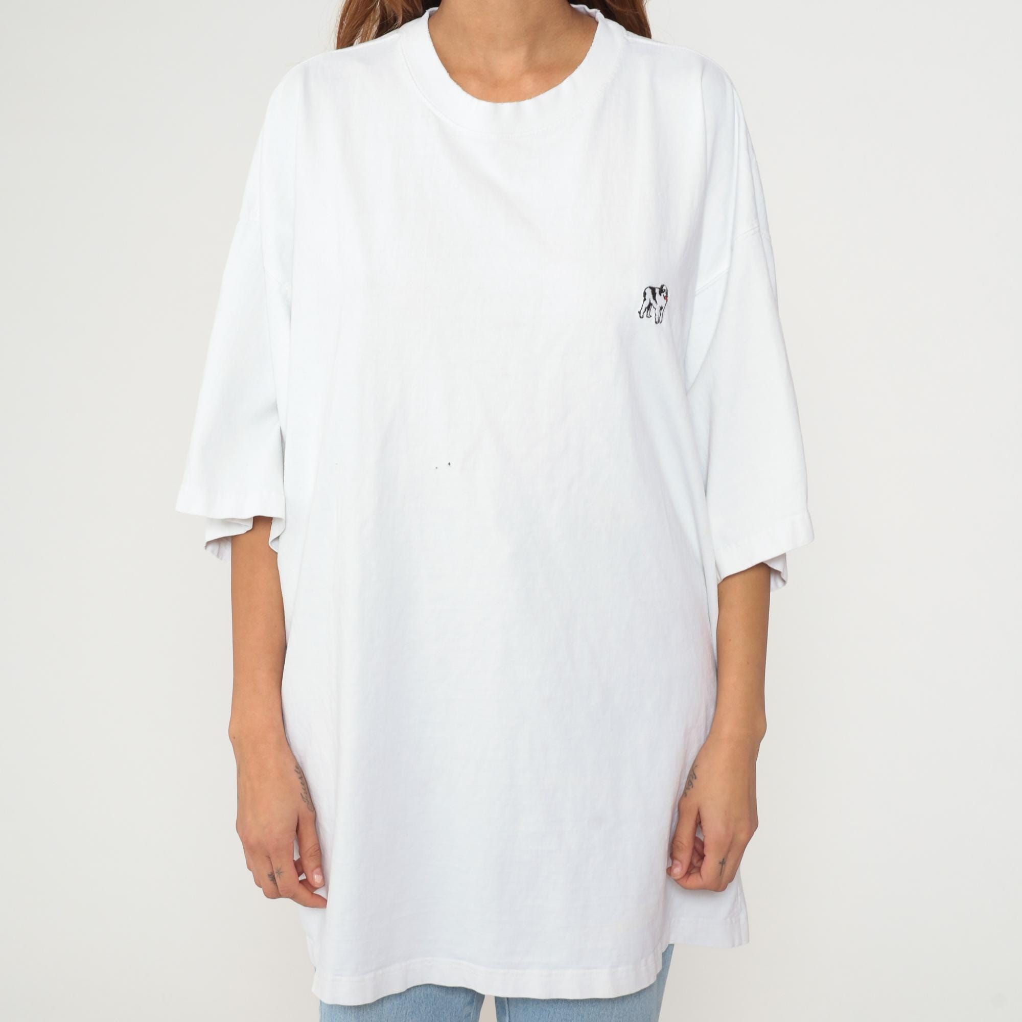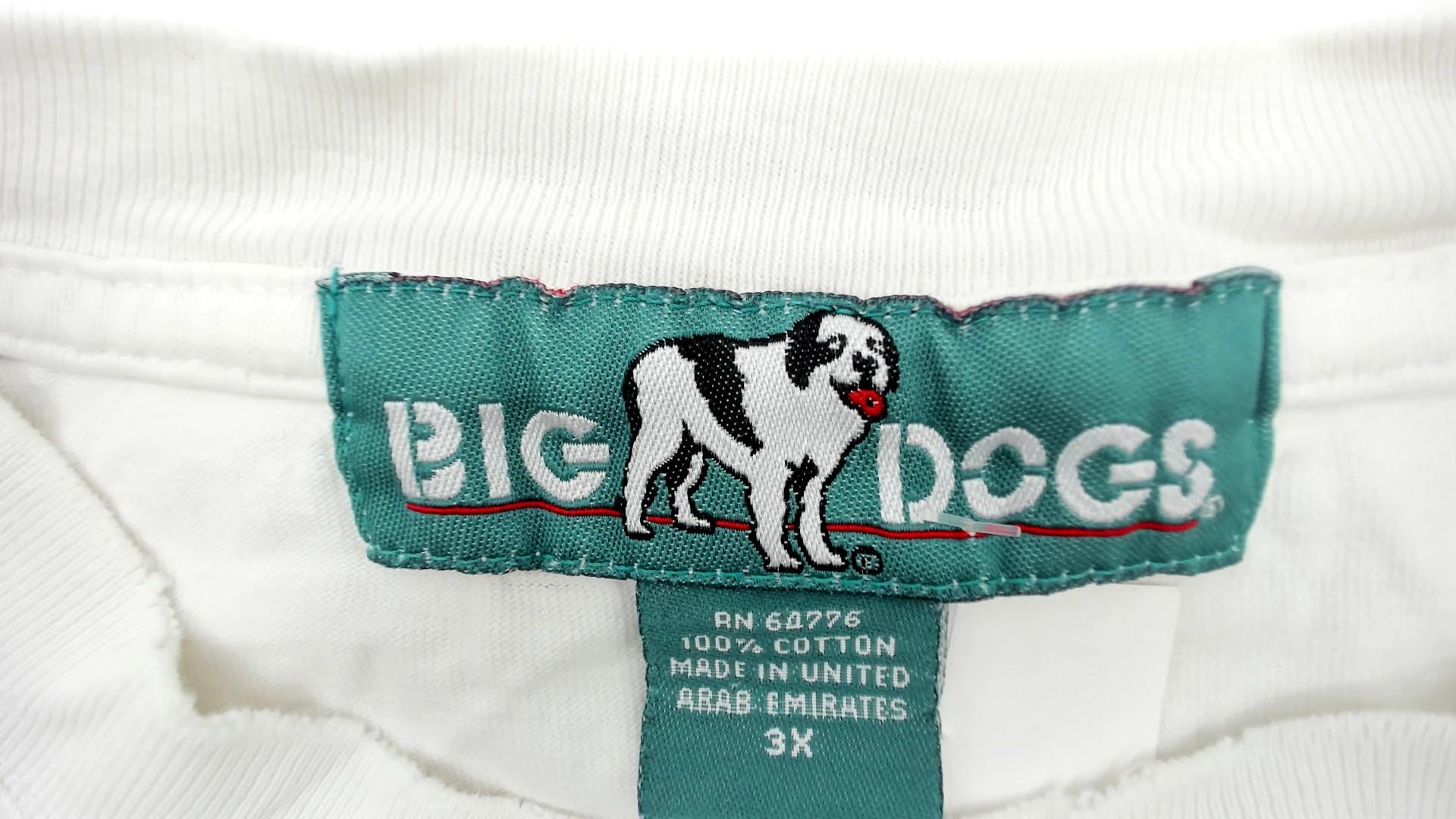White oversized tee with small dog graphic emblem. Short sleeves, crew neck, and relaxed plus size fit. Tagged Big Dogs in cotton with minimal puppy design on chest.