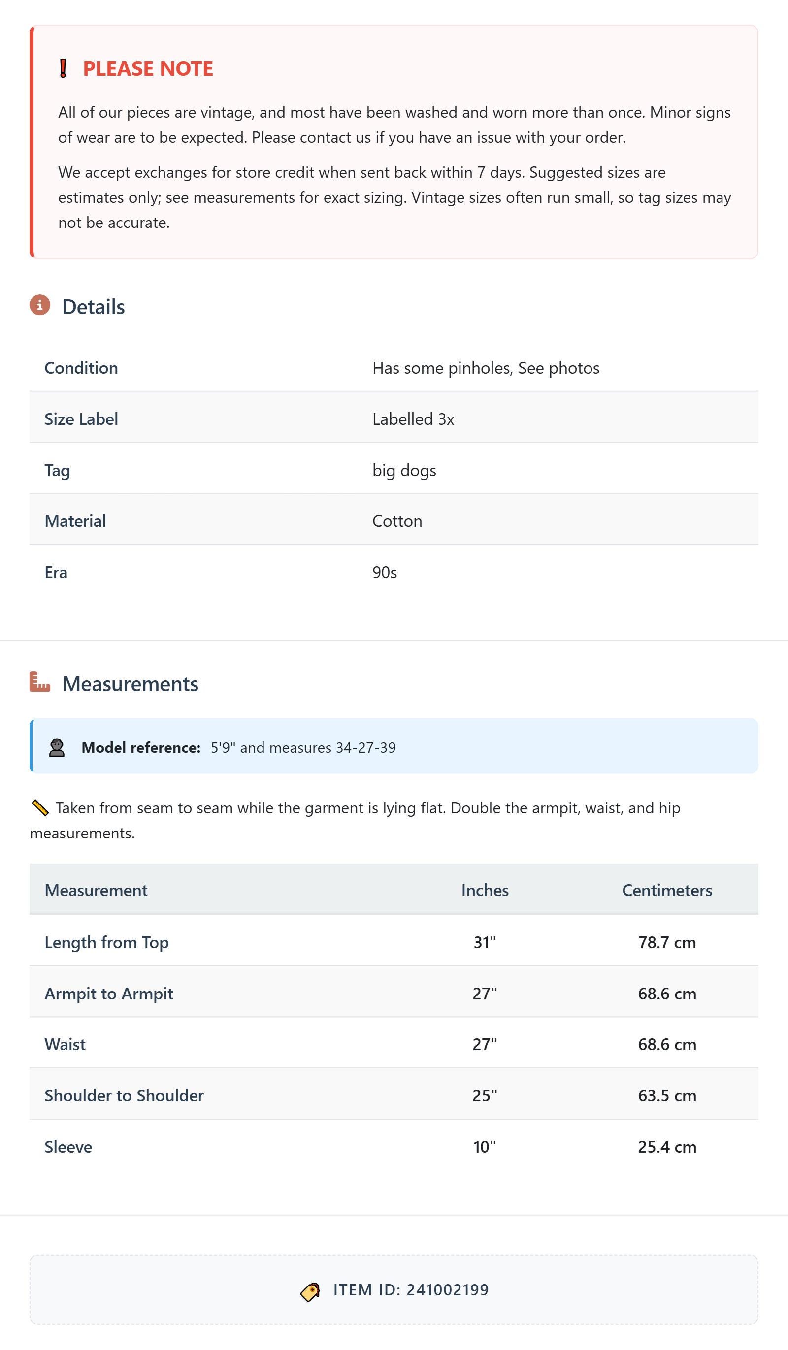 All of our pieces are vintage, and most have been washed and worn more than once. Minor signs of wear are to be expected. Please contact us if you have an issue with your order. We accept exchanges for store credit when sent back within 7 days.