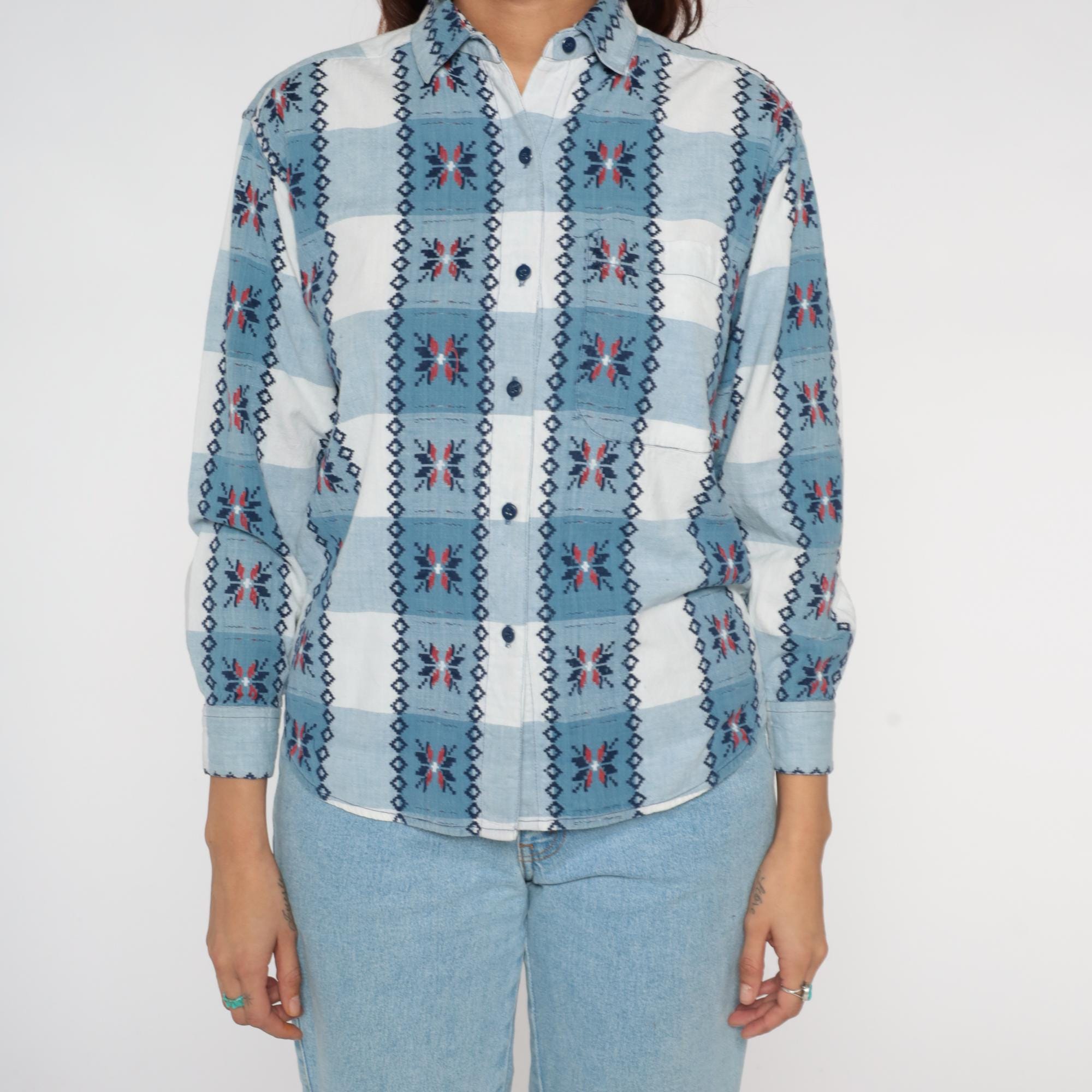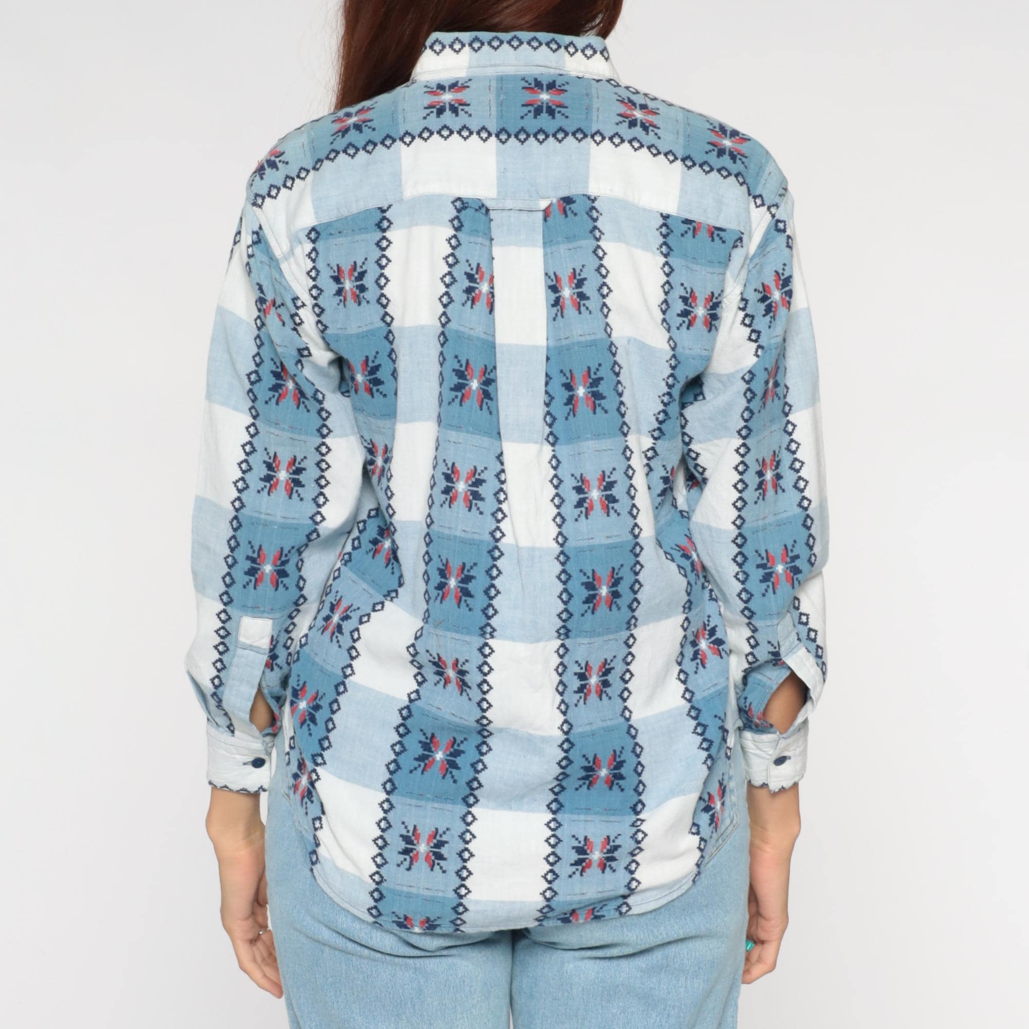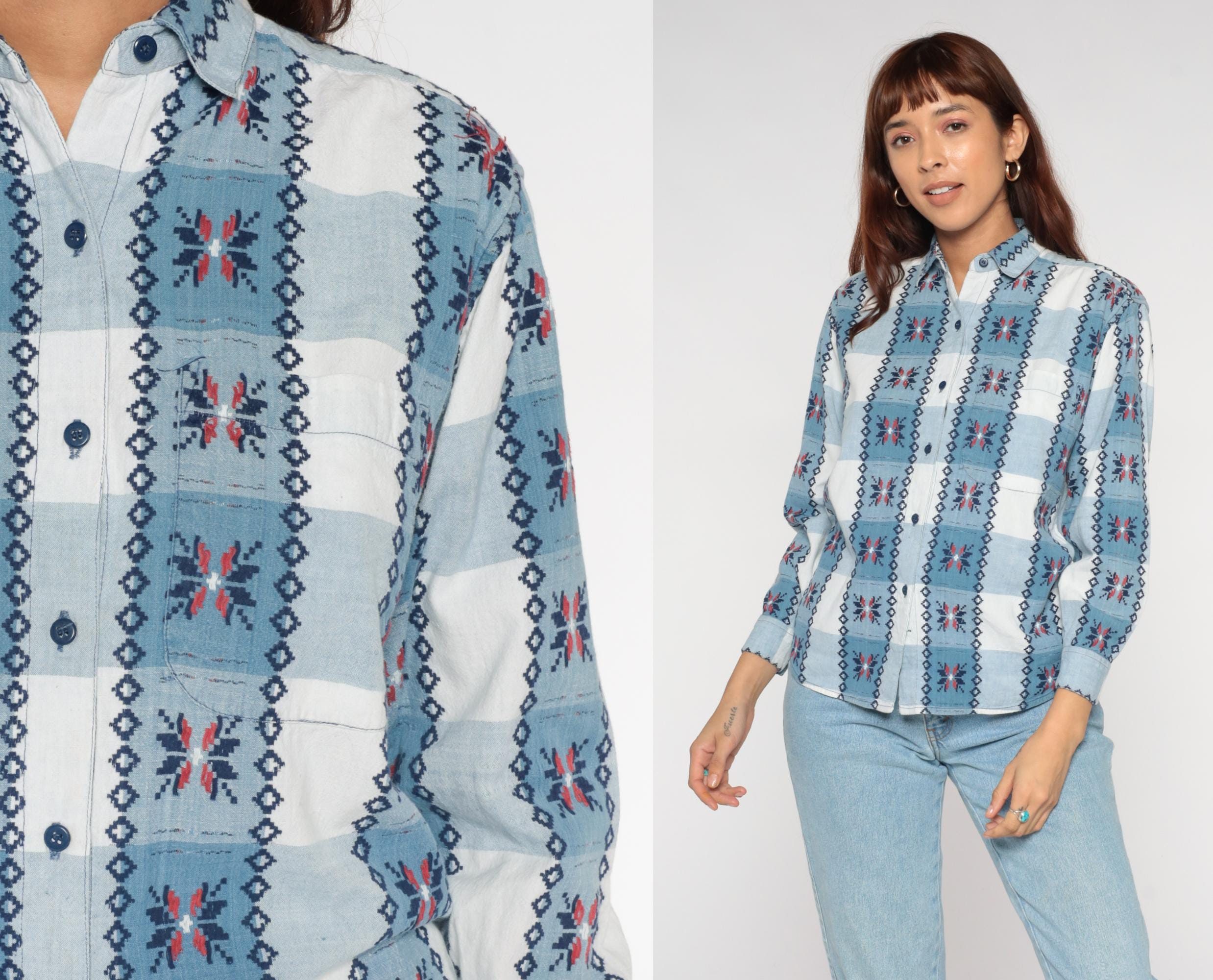 90s southwestern print button-up shirt from Keren Hart. Features blue and white horizontal stripes with geometric Aztec motifs and small red accents running vertically. Collared design with long sleeves and button front closure.