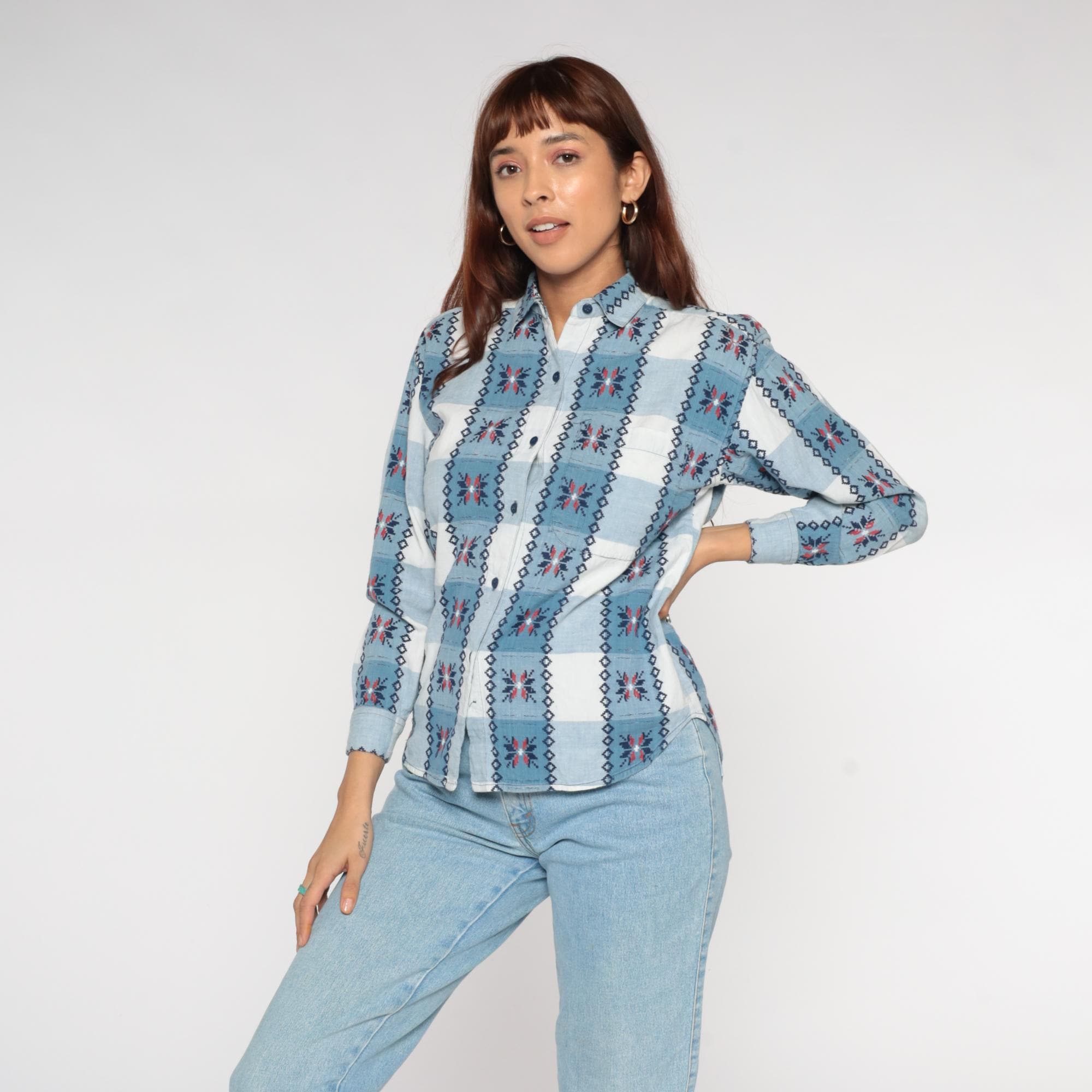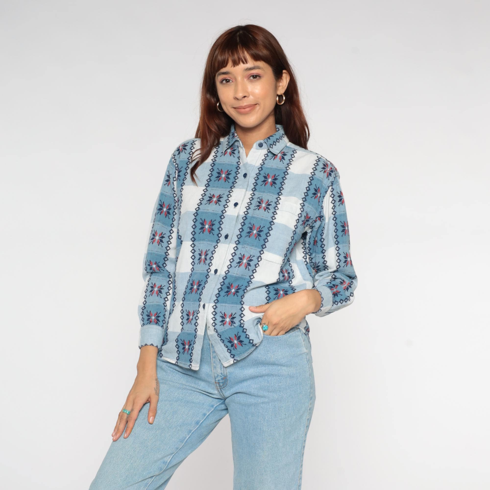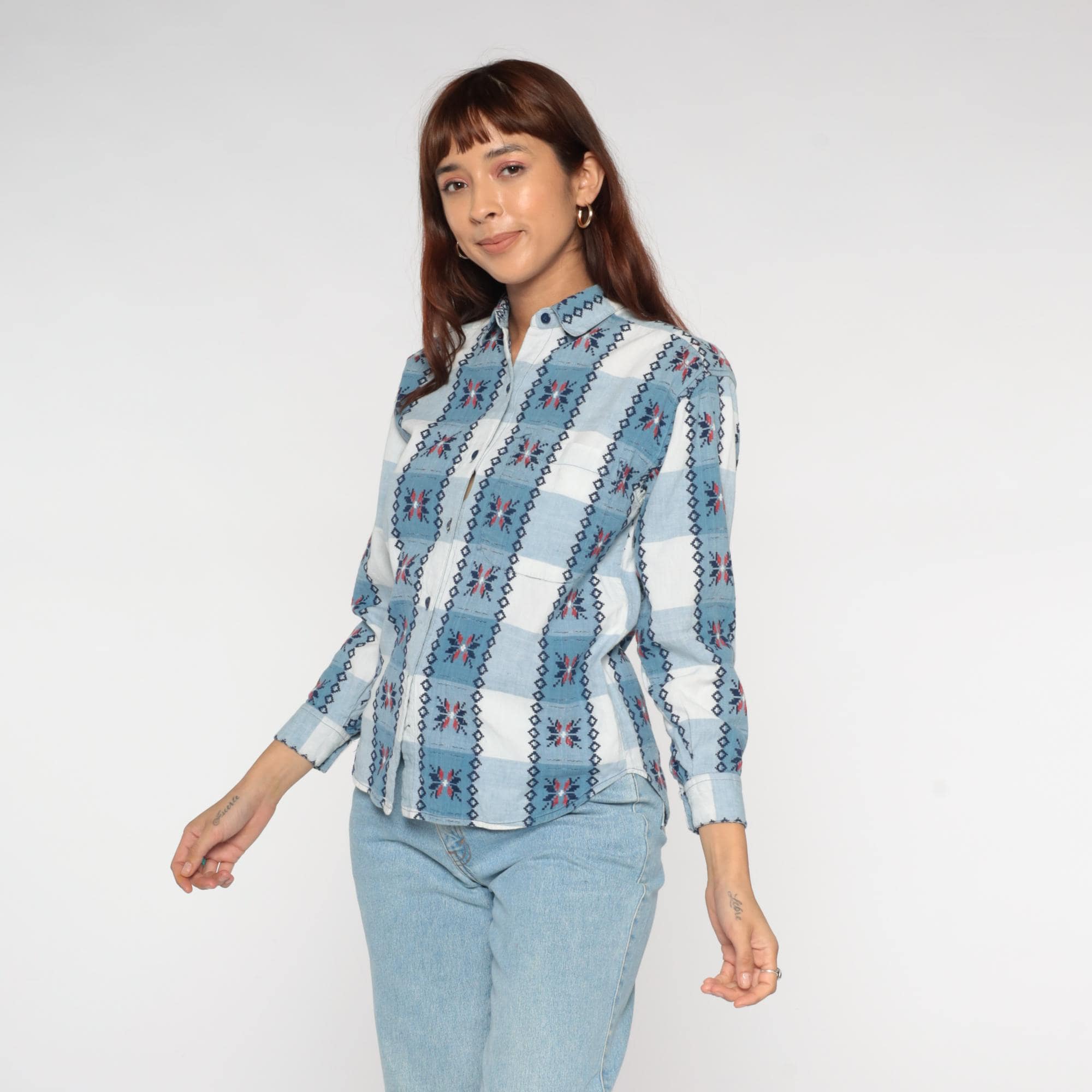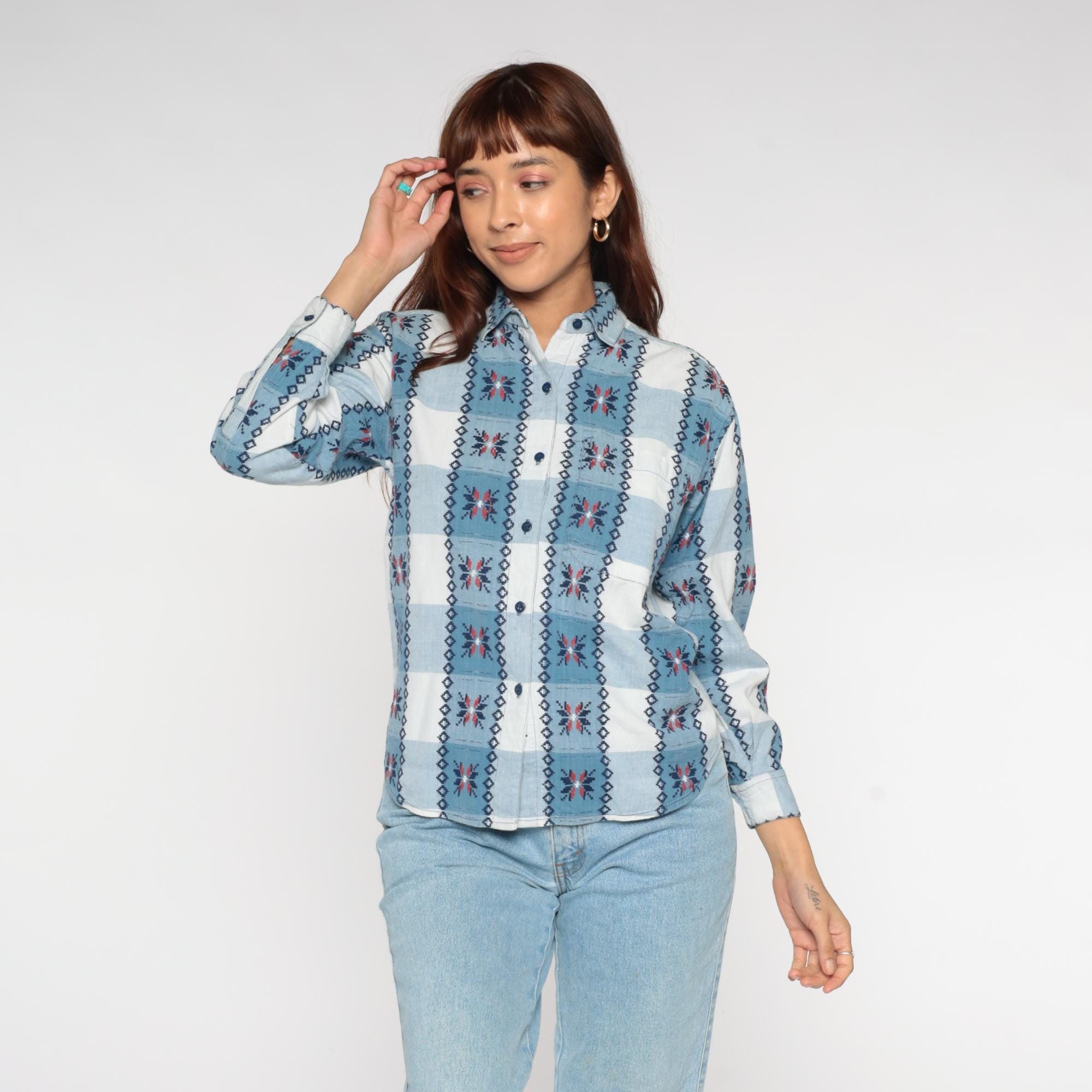 90s southwestern print button-up shirt from Keren Hart. Features blue and white horizontal stripes with geometric Aztec motifs and small red accents running vertically. Collared design with long sleeves and button front closure.