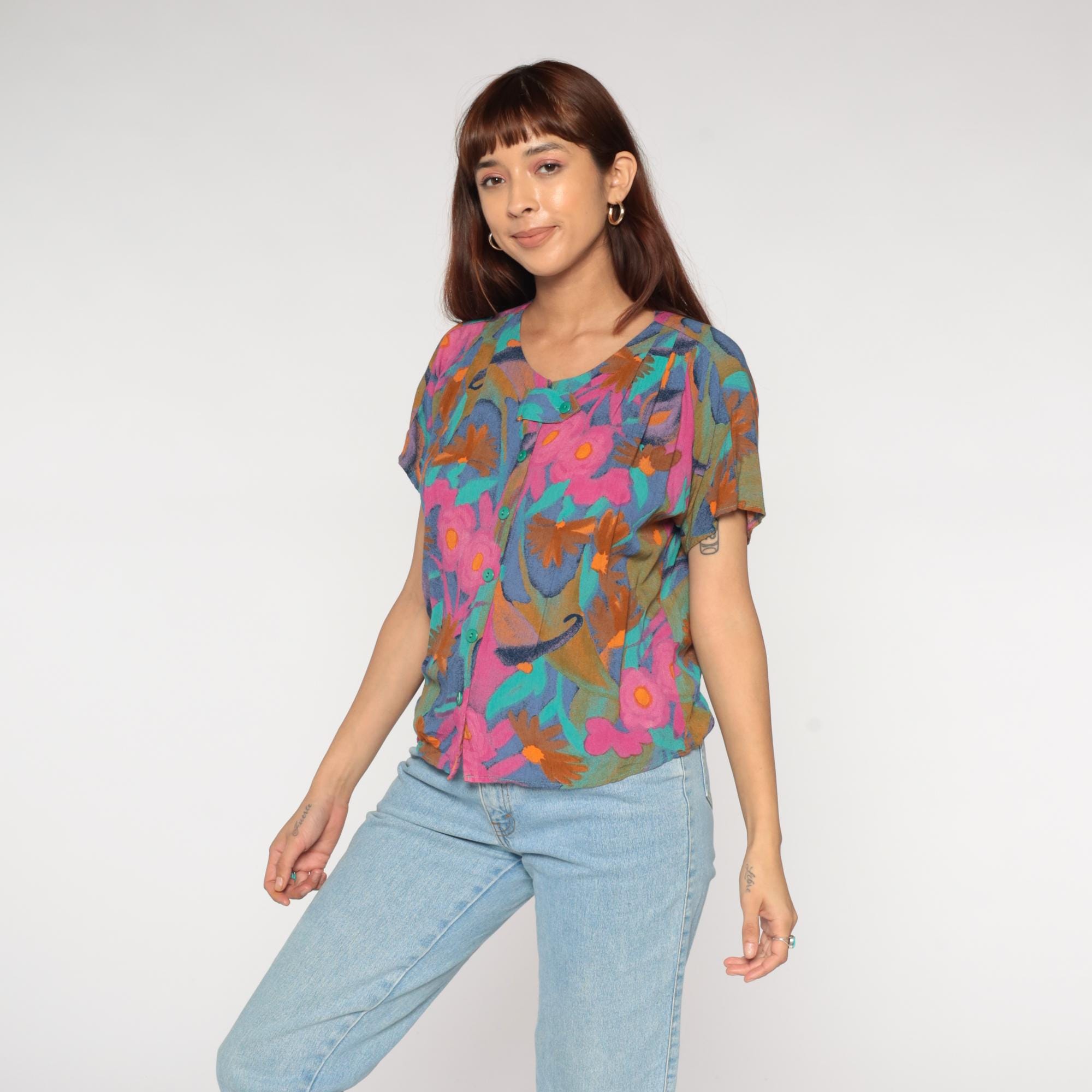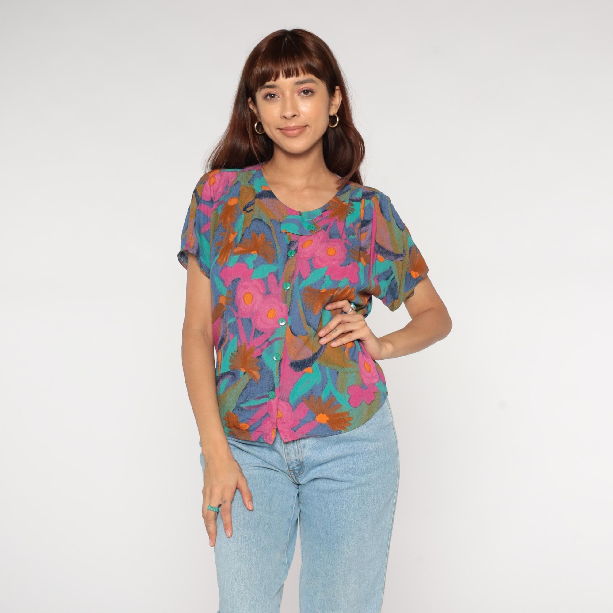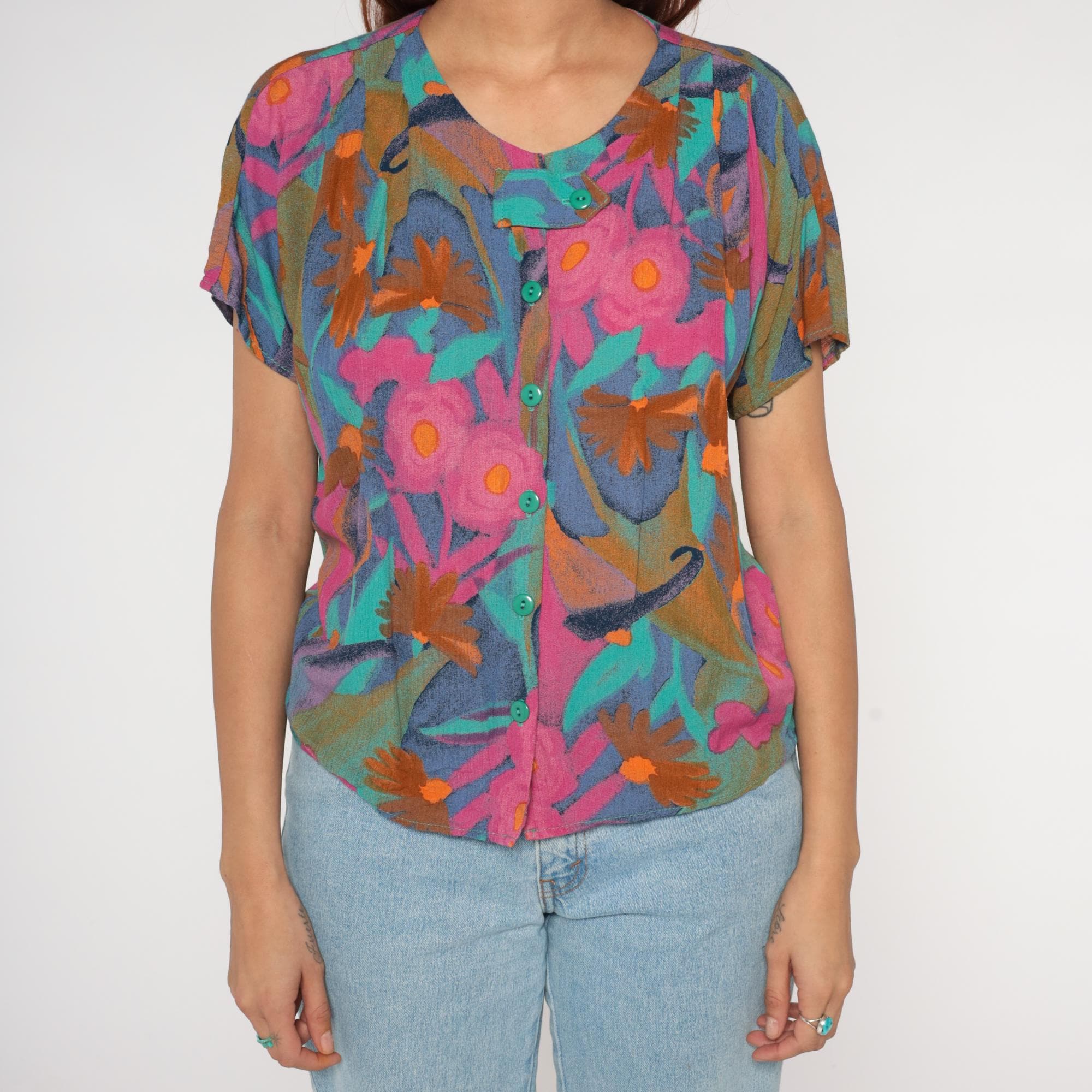 Y2K abstract floral print blouse from Diversity Petite. Button front top with crew neck and short sleeves. Features bold brushstroke-style flowers in pink, turquoise, orange, navy blue, and olive green.