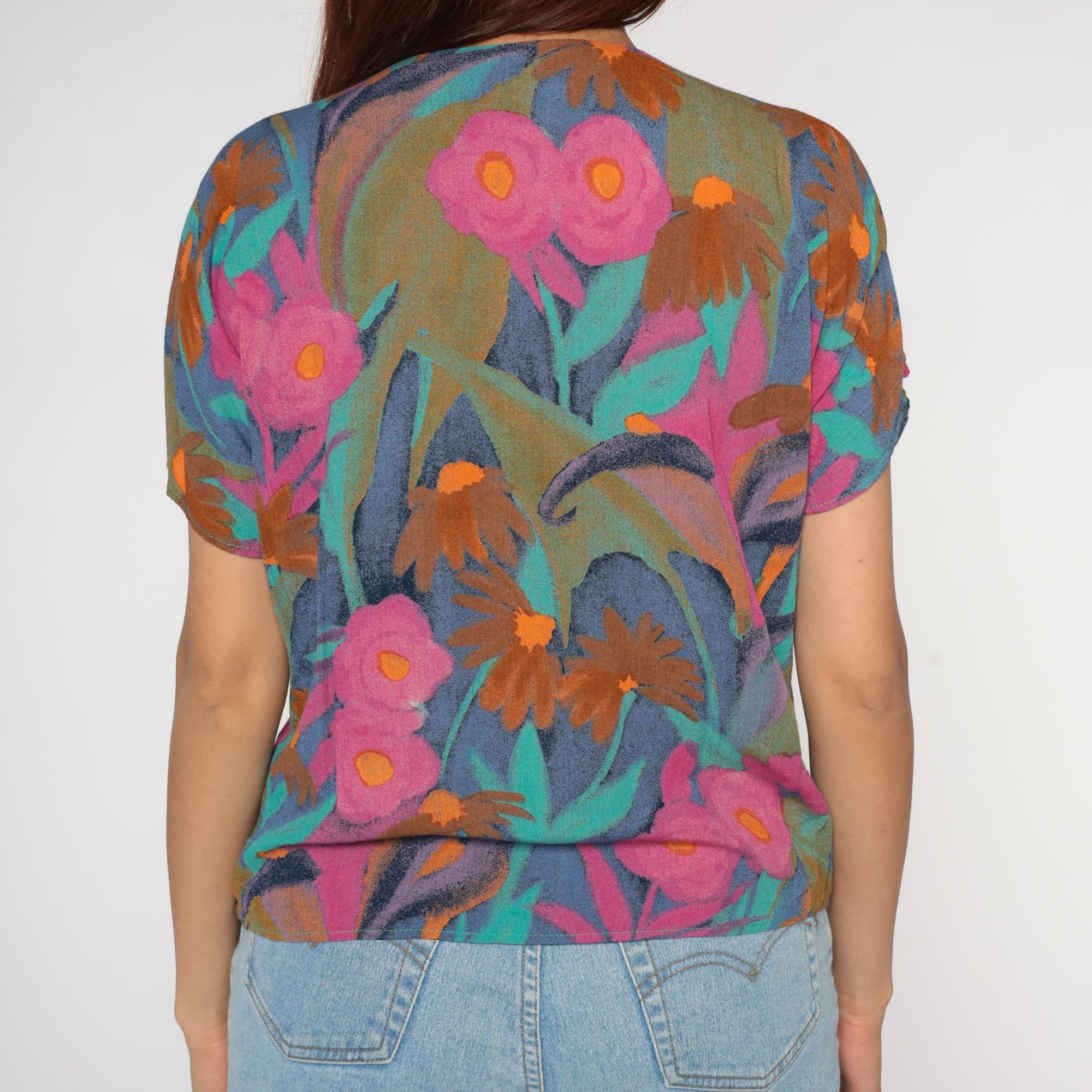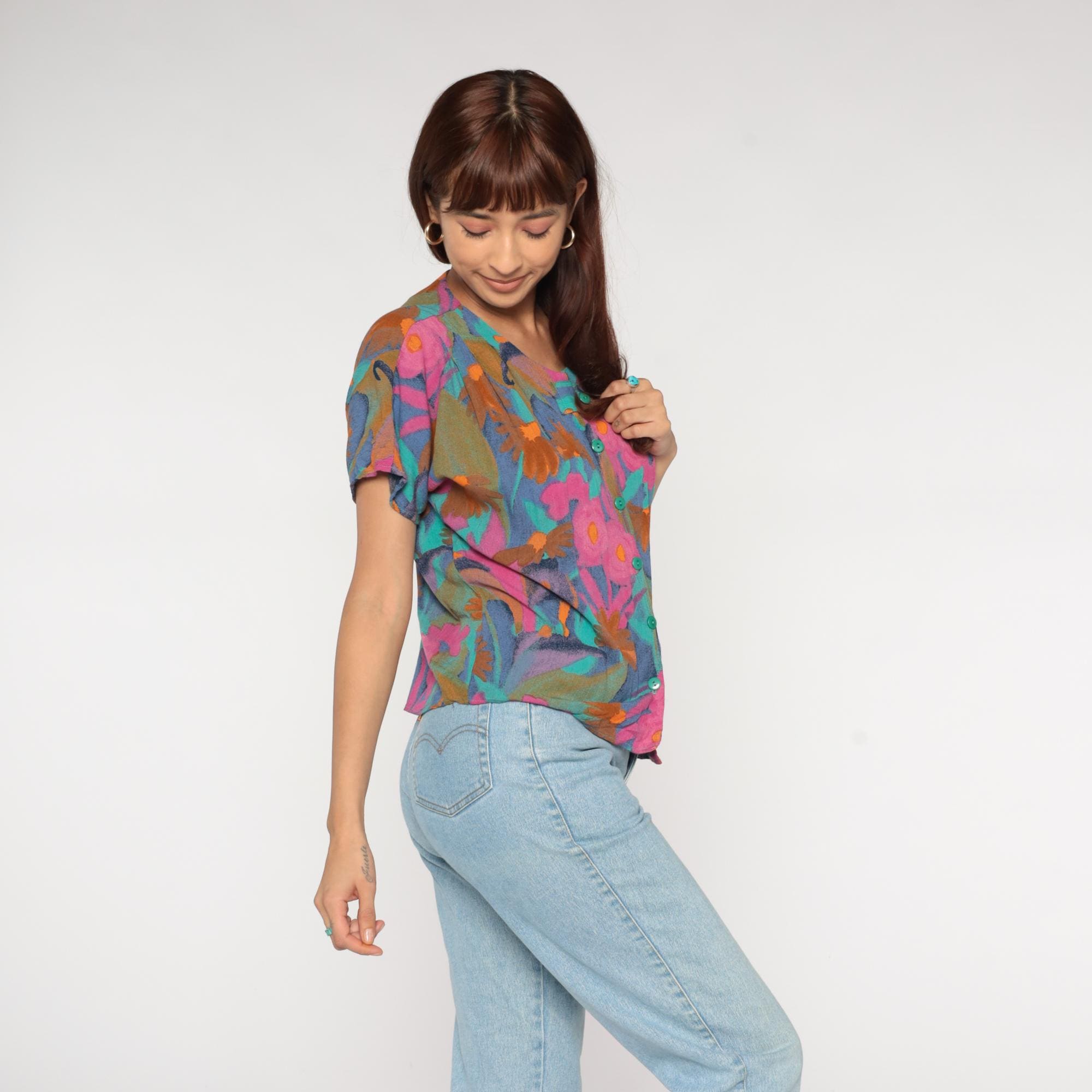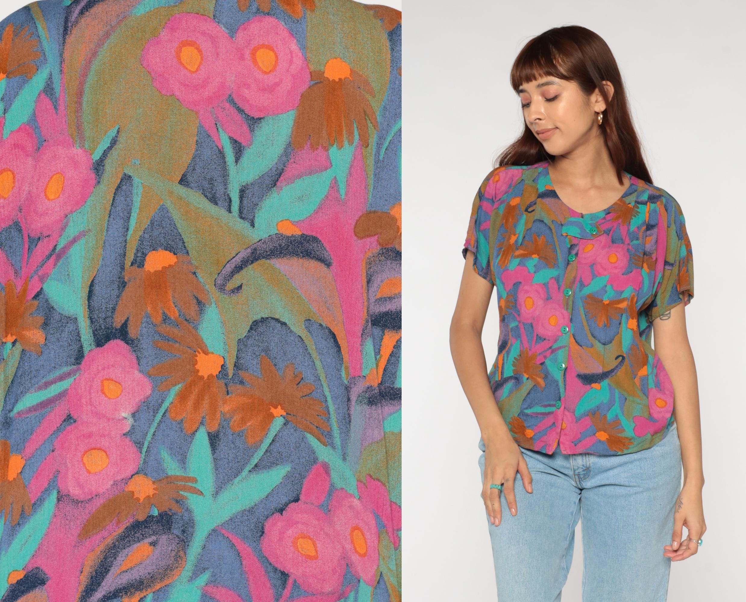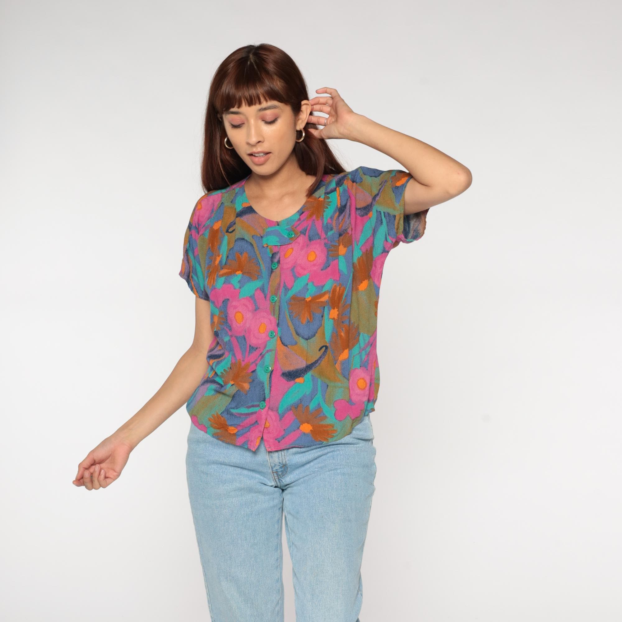 Y2K abstract floral print blouse from Diversity Petite. Button front top with crew neck and short sleeves. Features bold brushstroke-style flowers in pink, turquoise, orange, navy blue, and olive green.