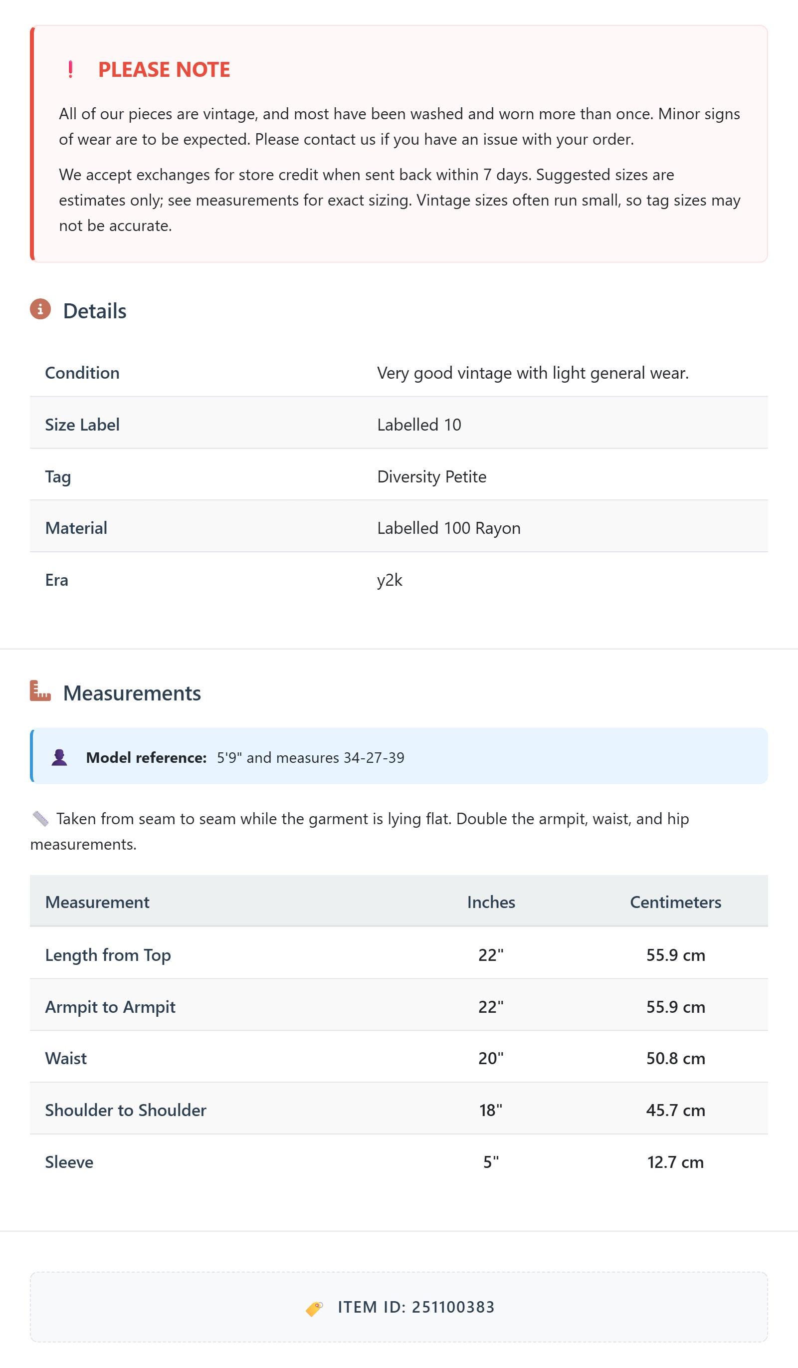 All of our pieces are vintage, and most have been washed and worn more than once. Minor signs of wear are to be expected. Please contact us if you have an issue with your order. We accept exchanges for store credit when sent back within 7 days.