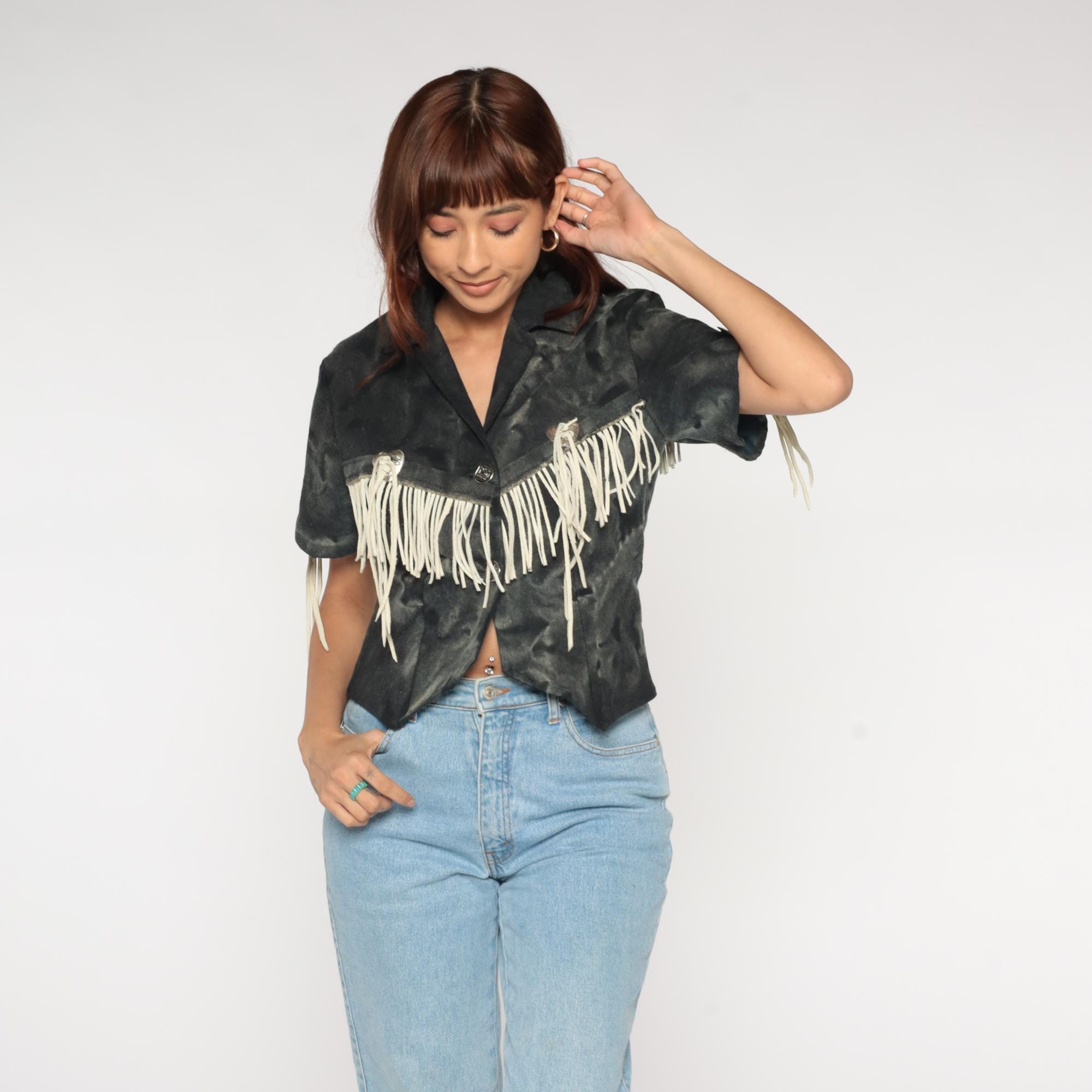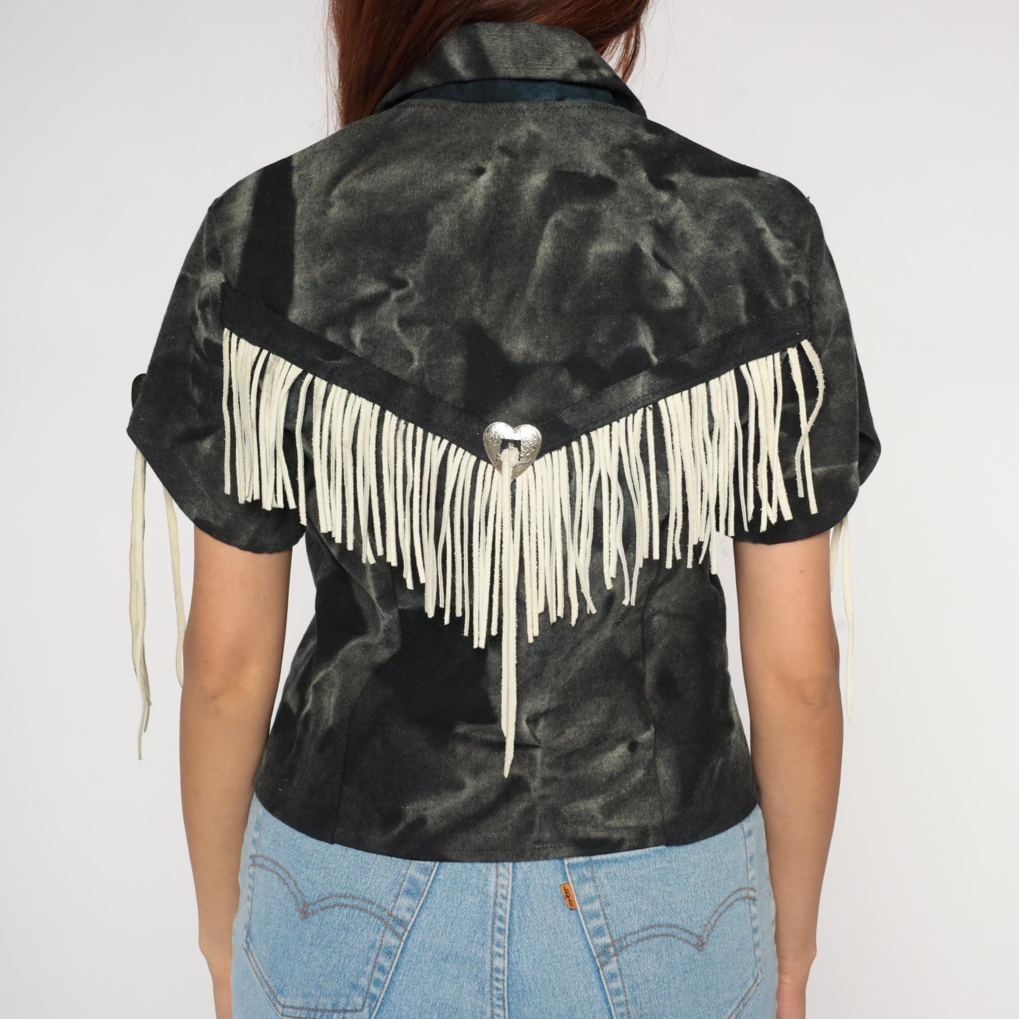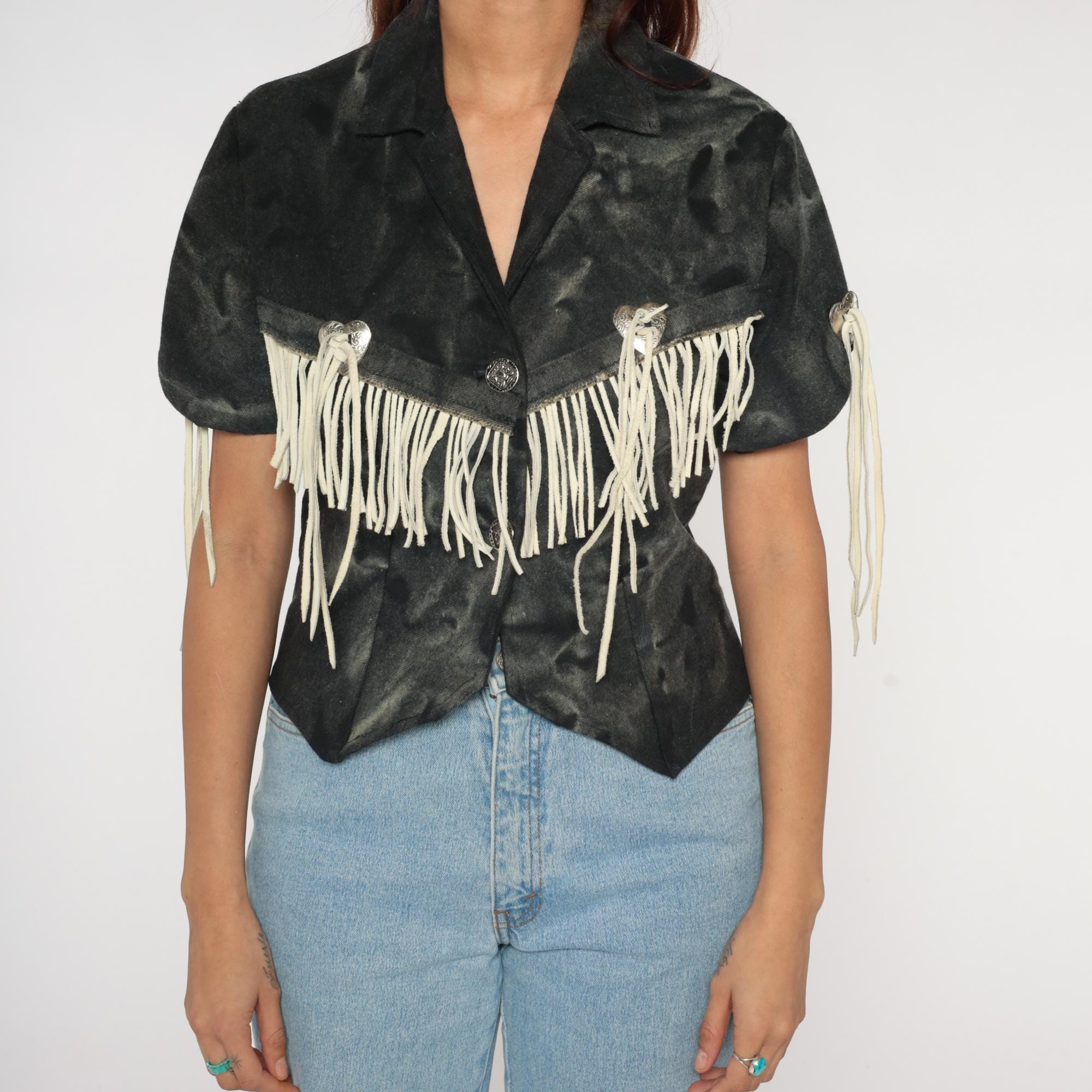 90s western fringe jacket in black. Cropped blazer style with notched collar and short sleeves. Features cream suede fringe trim across chest, shoulders, and back. Silver-tone metal heart-shaped concho buttons with decorative southwestern details.