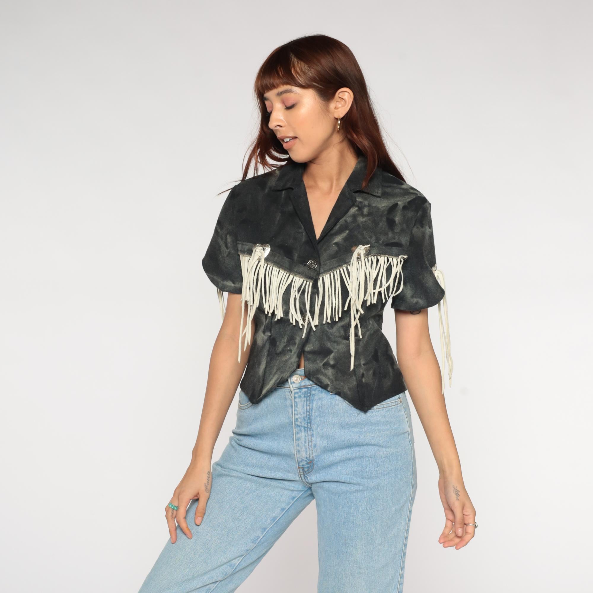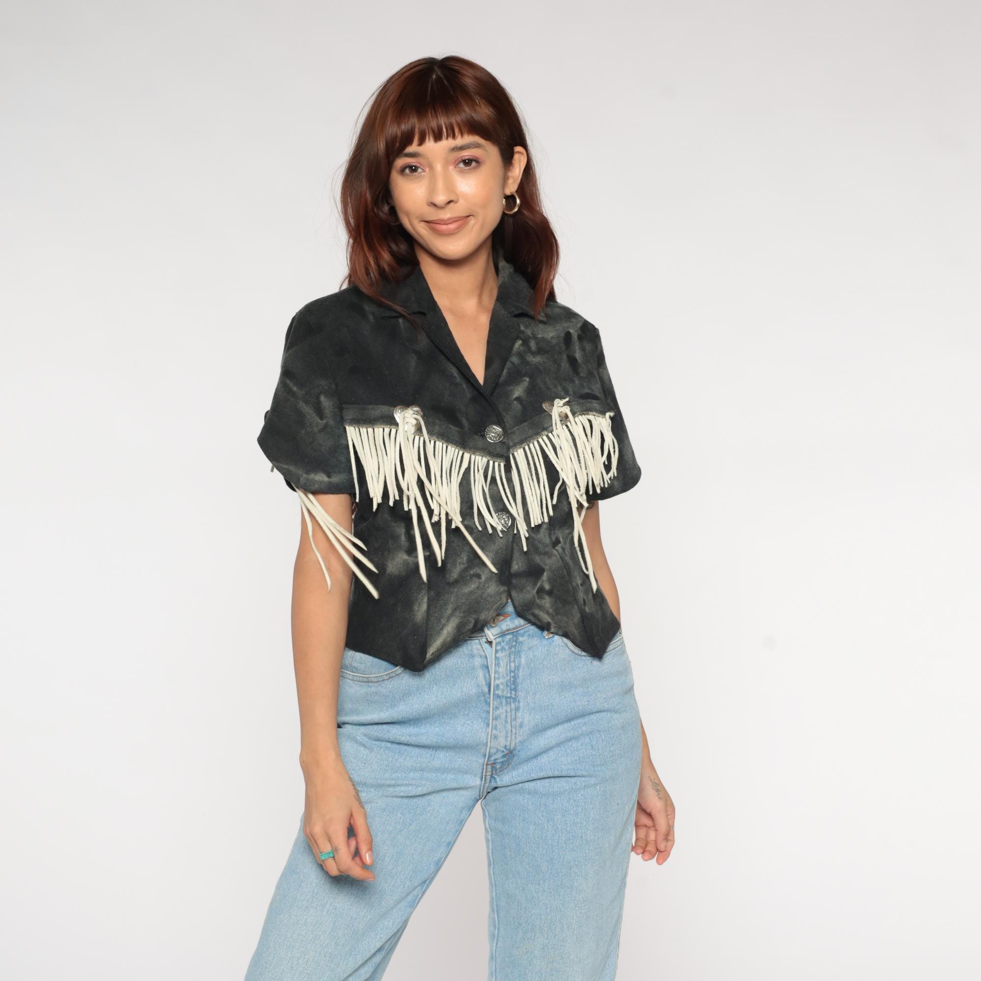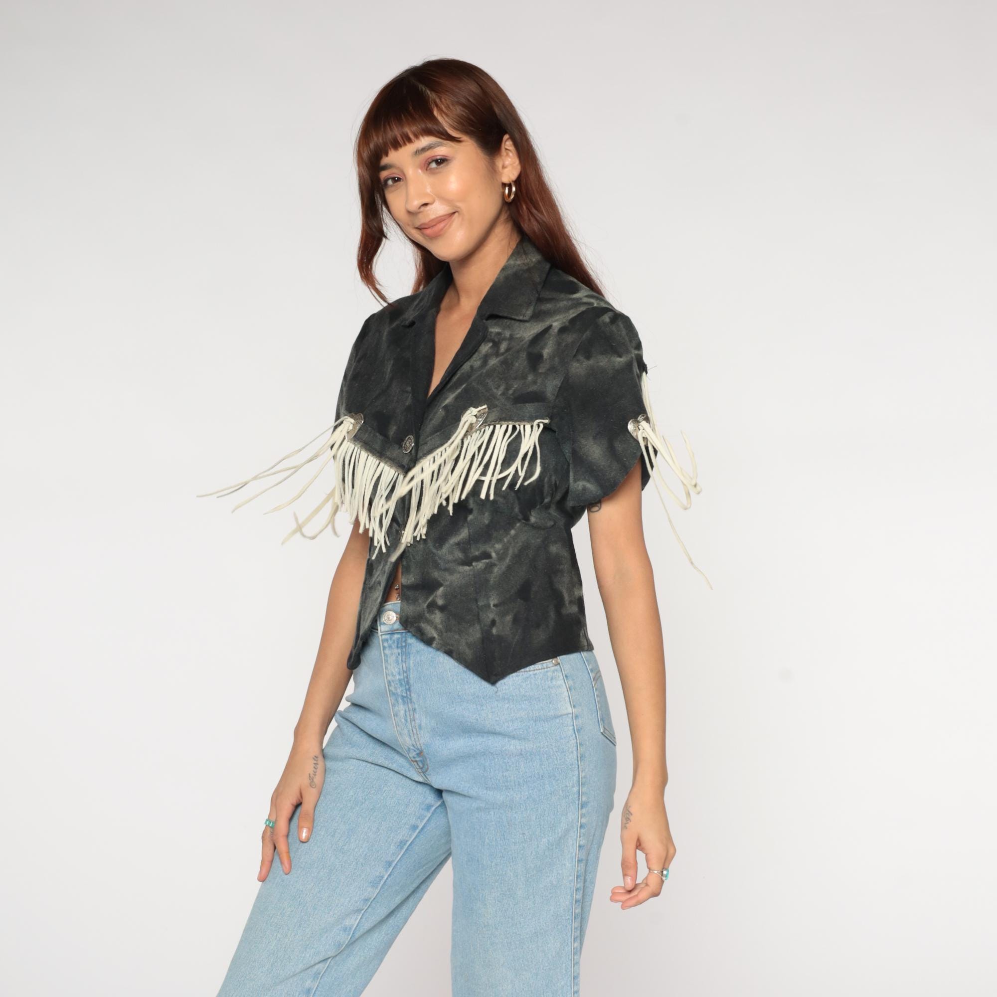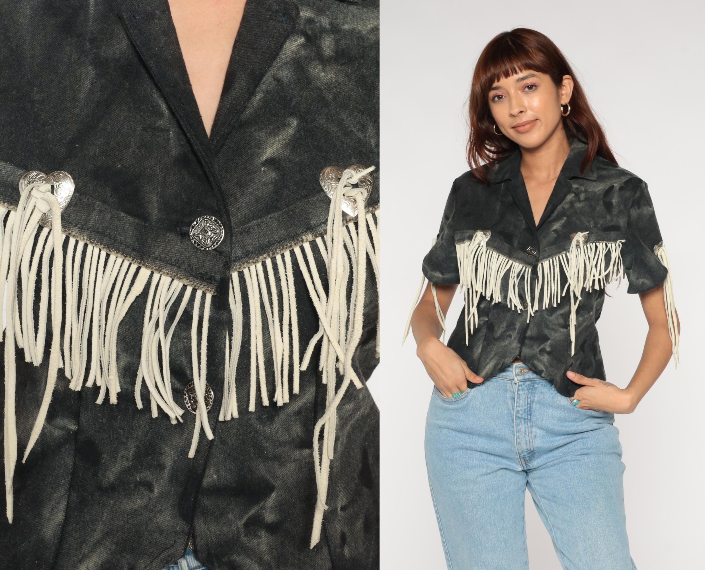 90s western fringe jacket in black. Cropped blazer style with notched collar and short sleeves. Features cream suede fringe trim across chest, shoulders, and back. Silver-tone metal heart-shaped concho buttons with decorative southwestern details.