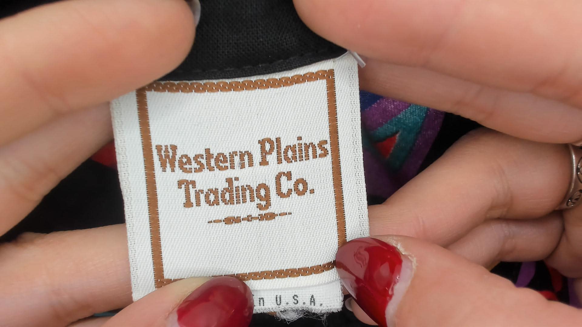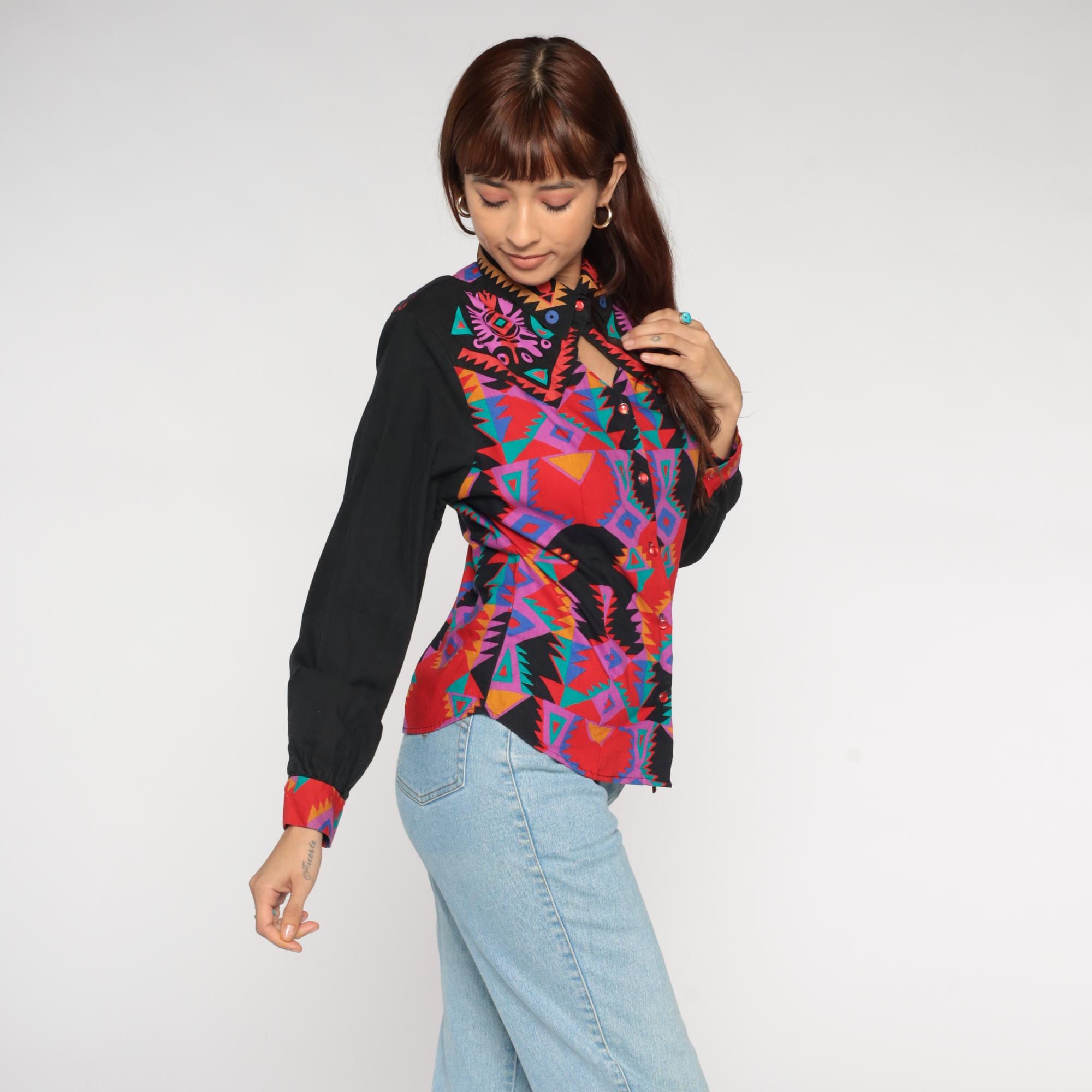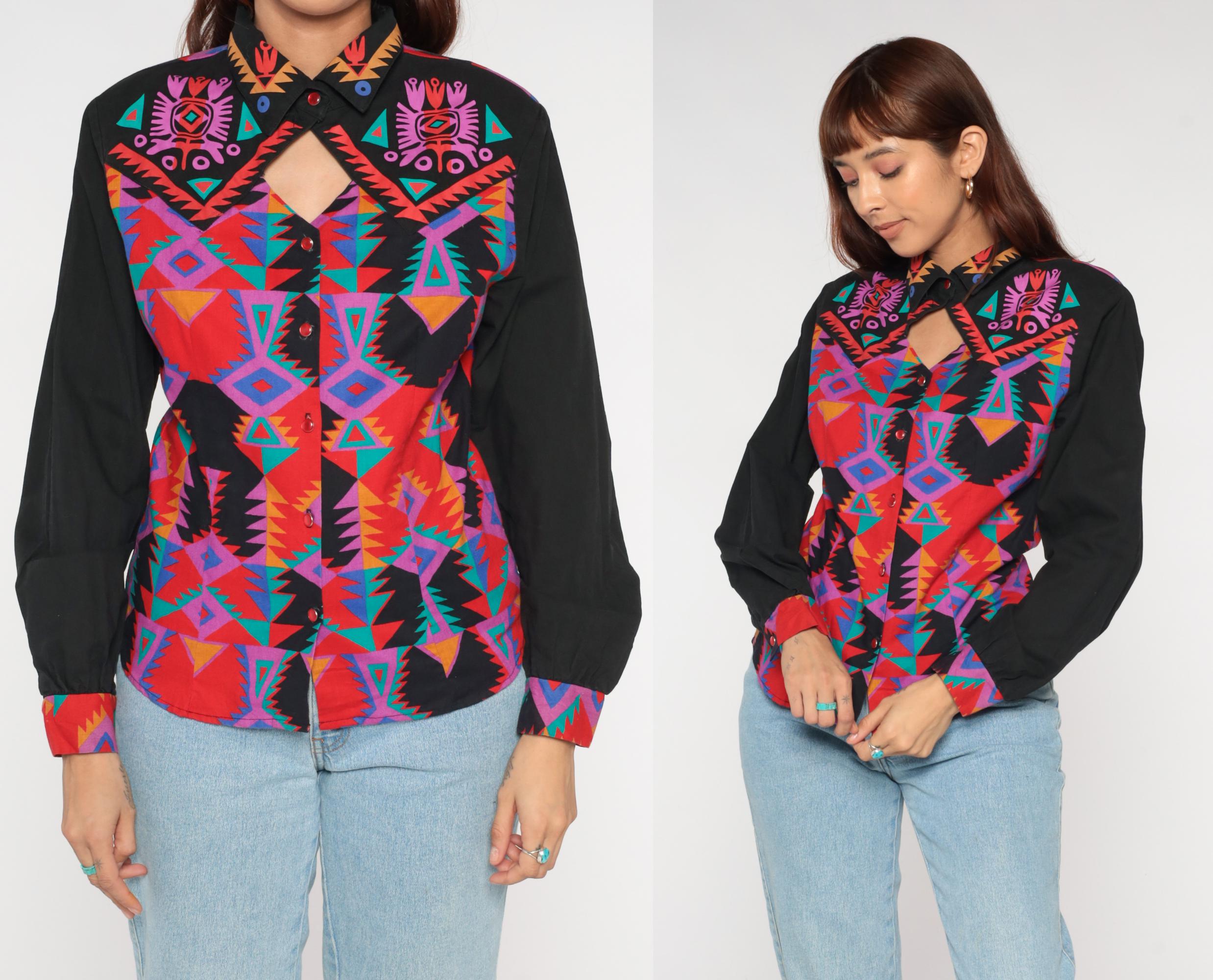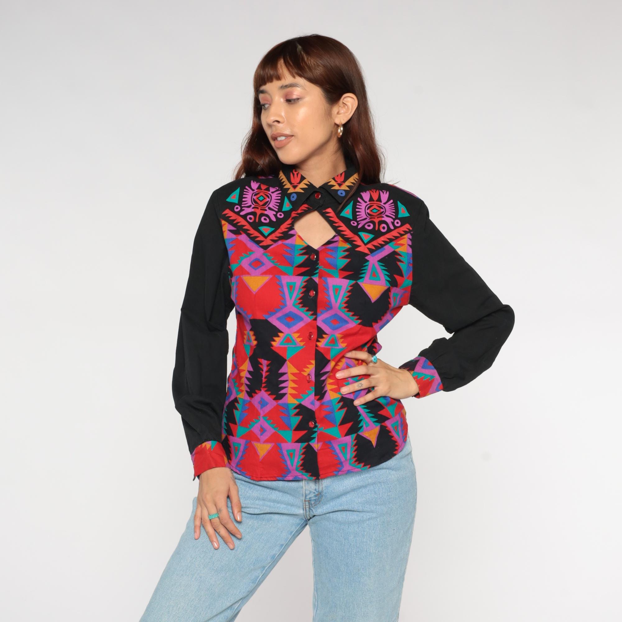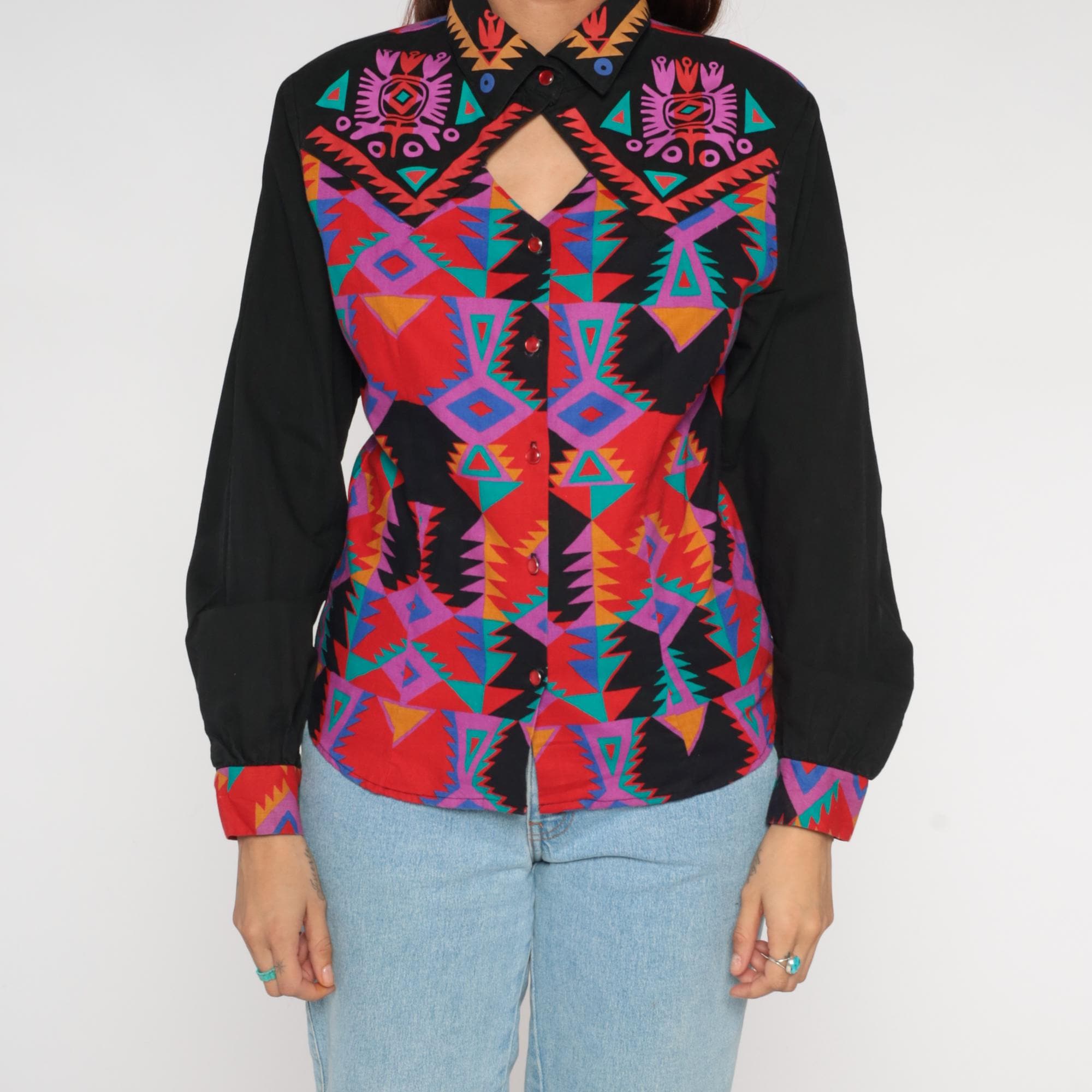 90s southwestern aztec print button-up shirt from Western Plains Trading Co. Features bold geometric tribal design in red, black, hot pink, turquoise, orange, and purple on body with solid black sleeves. Diamond cutout detail at neckline with button closure.