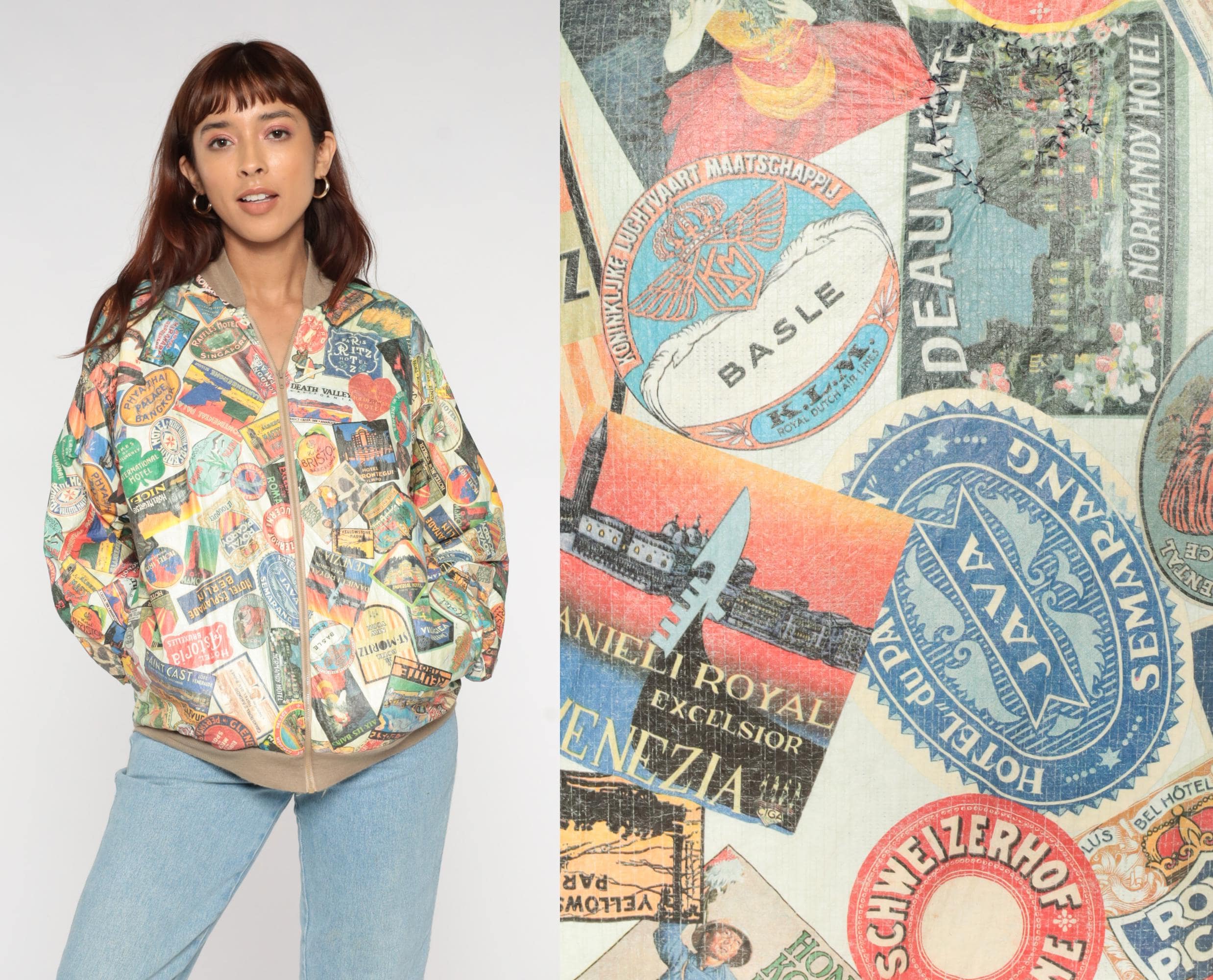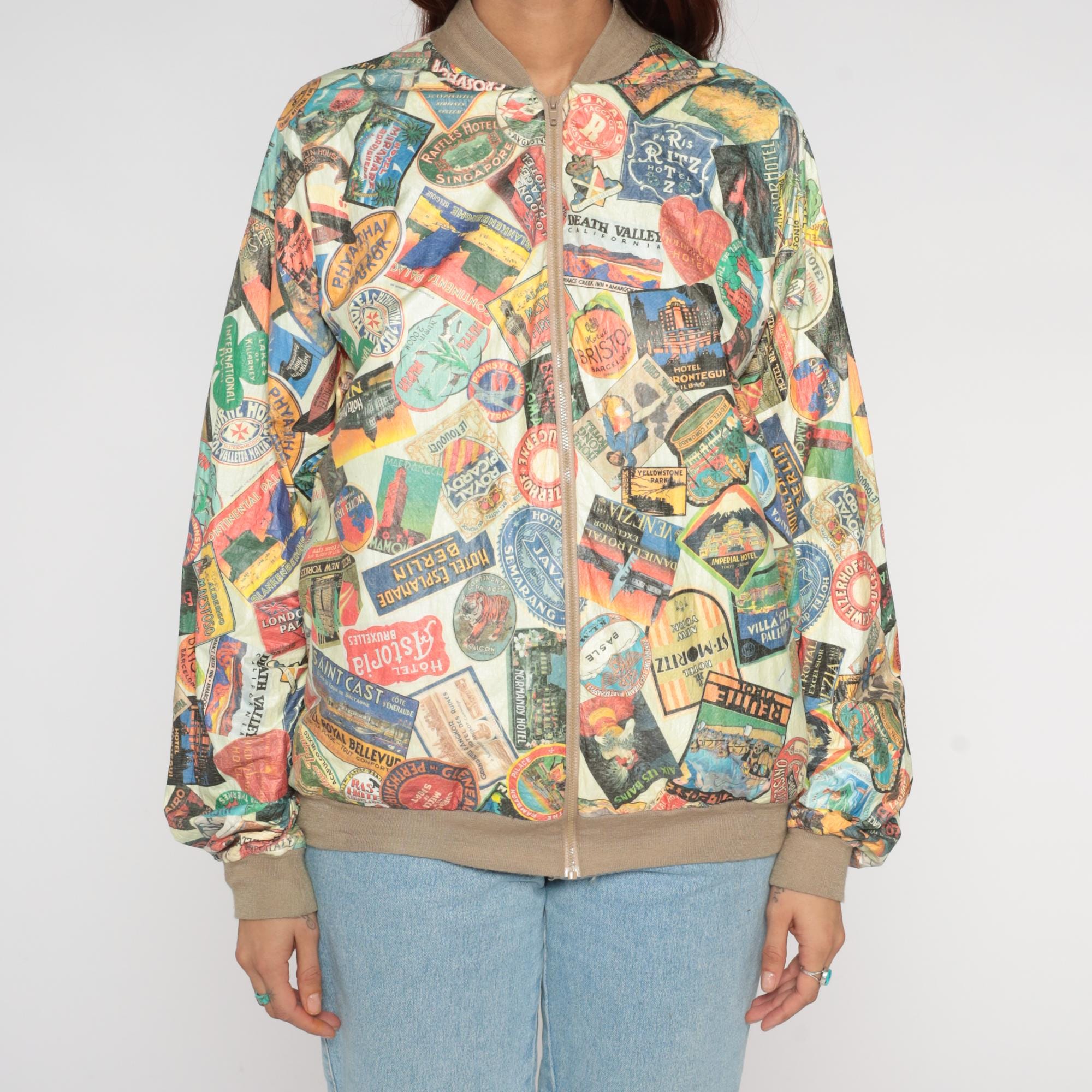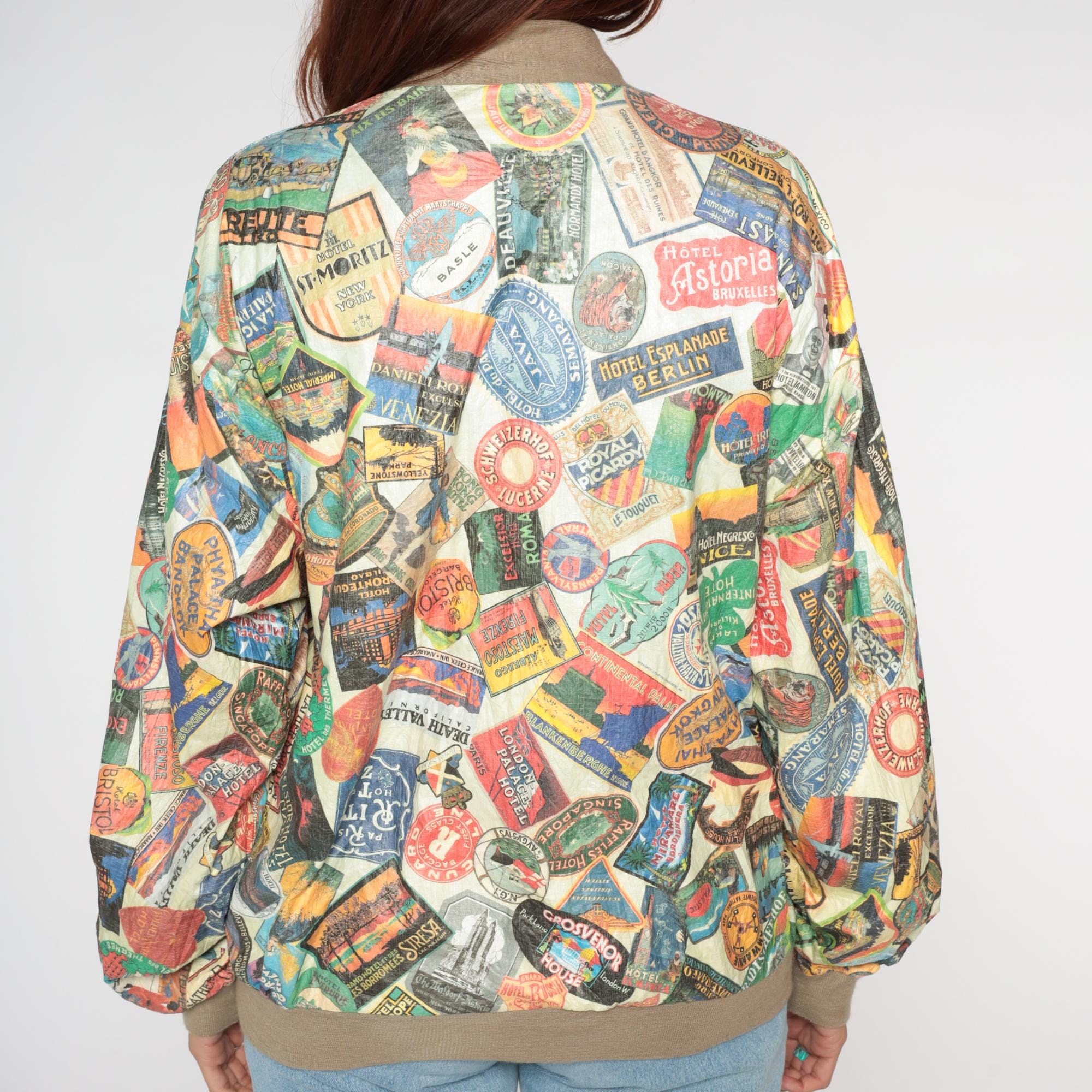 90s novelty bomber jacket featuring vintage European hotel and travel label print. All-over design with colorful luggage stickers, hotel logos, and tourist destination graphics including Basel, Venice, Berlin, and various European cities. Zip front closure with tan ribbed collar, cuffs, and hem.