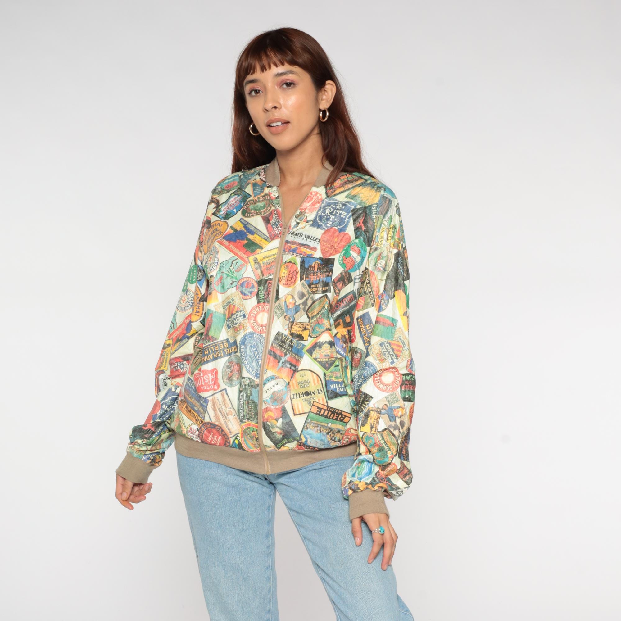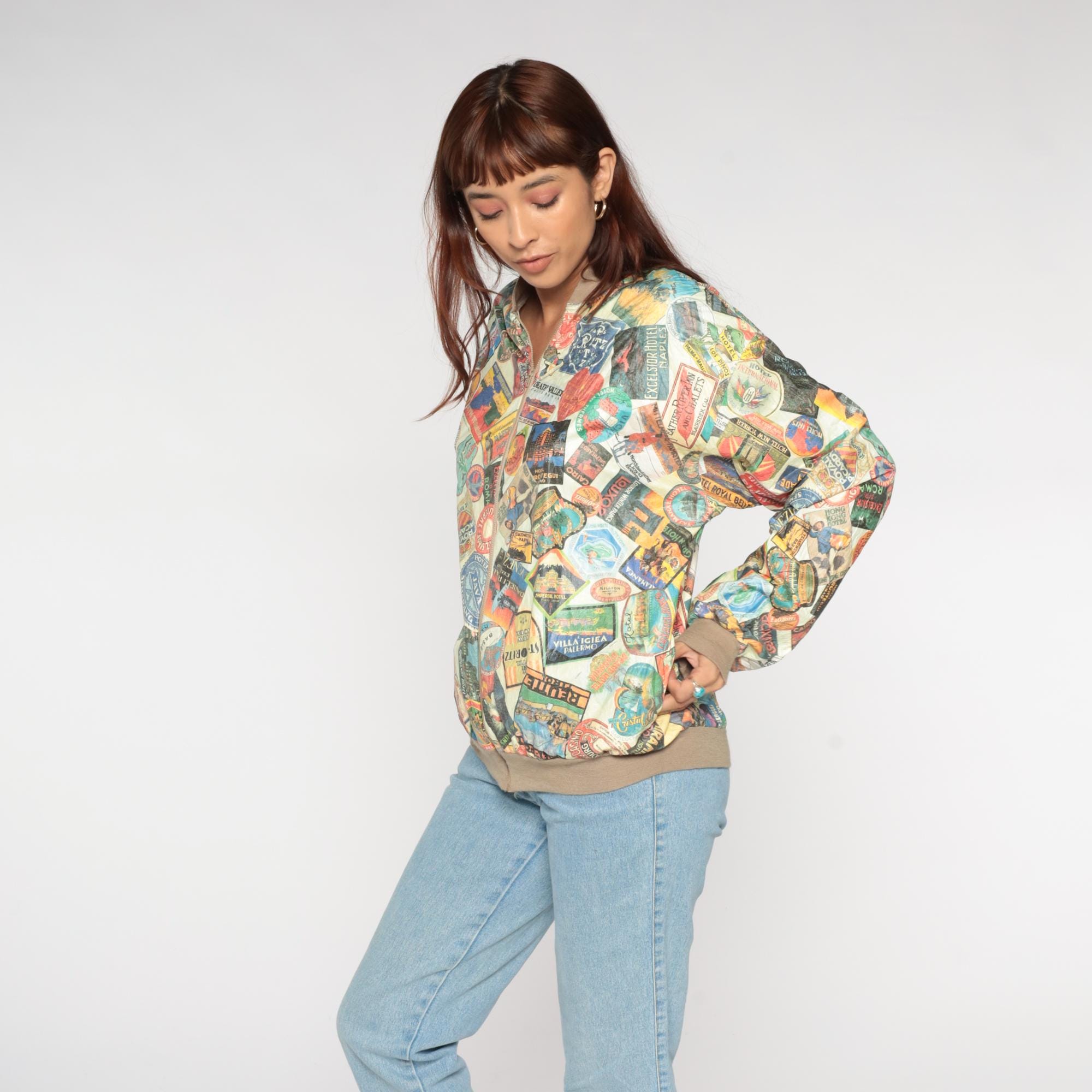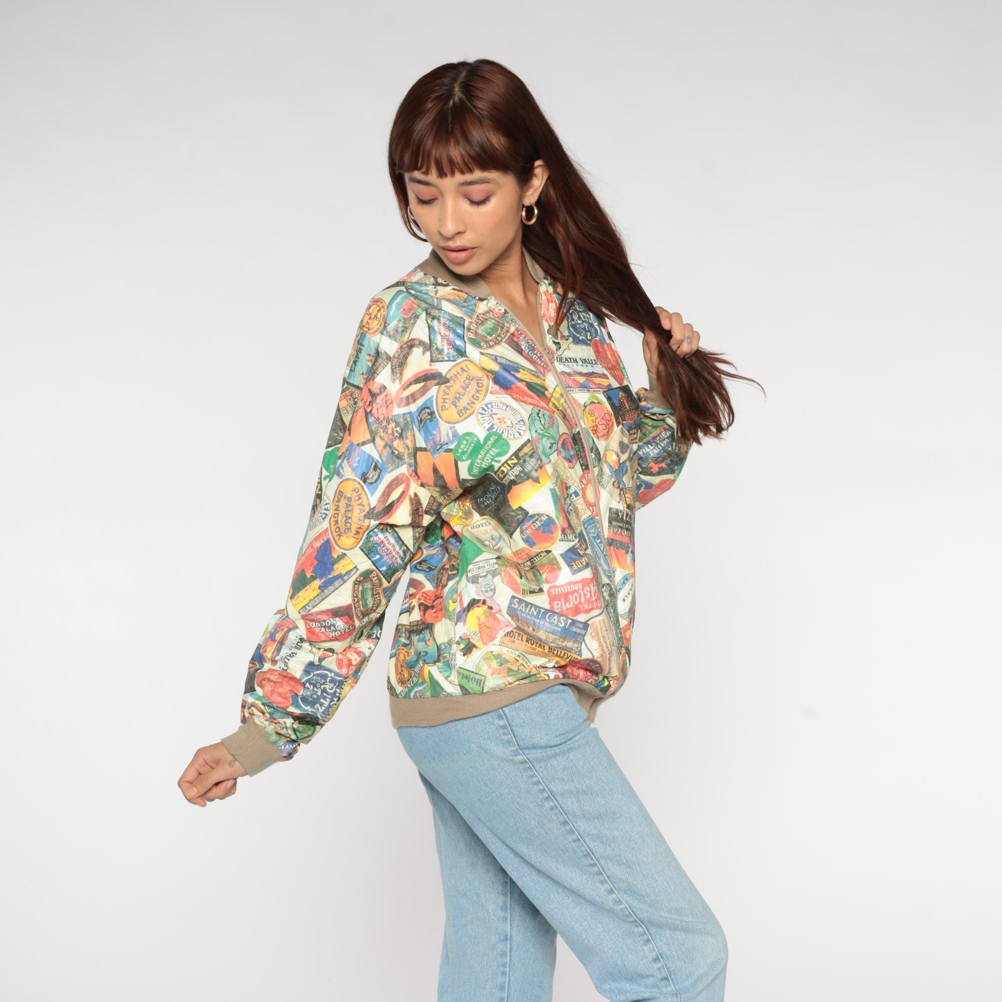 90s novelty bomber jacket featuring vintage European hotel and travel label print. All-over design with colorful luggage stickers, hotel logos, and tourist destination graphics including Basel, Venice, Berlin, and various European cities. Zip front closure with tan ribbed collar, cuffs, and hem.