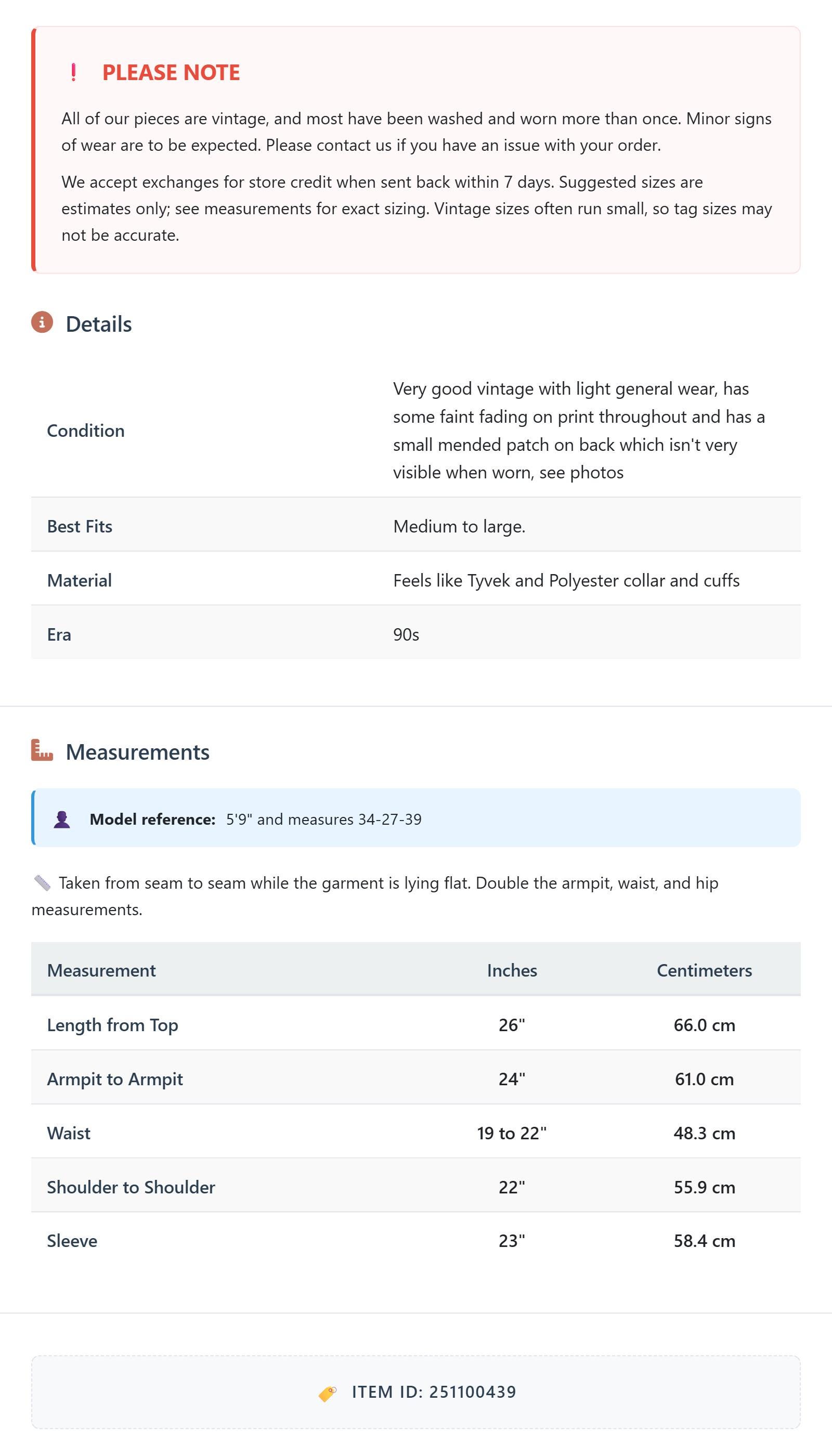 Suggested sizes are estimates only; see measurements for exact sizing. Vintage sizes often run small, so tag sizes may not be accurate.