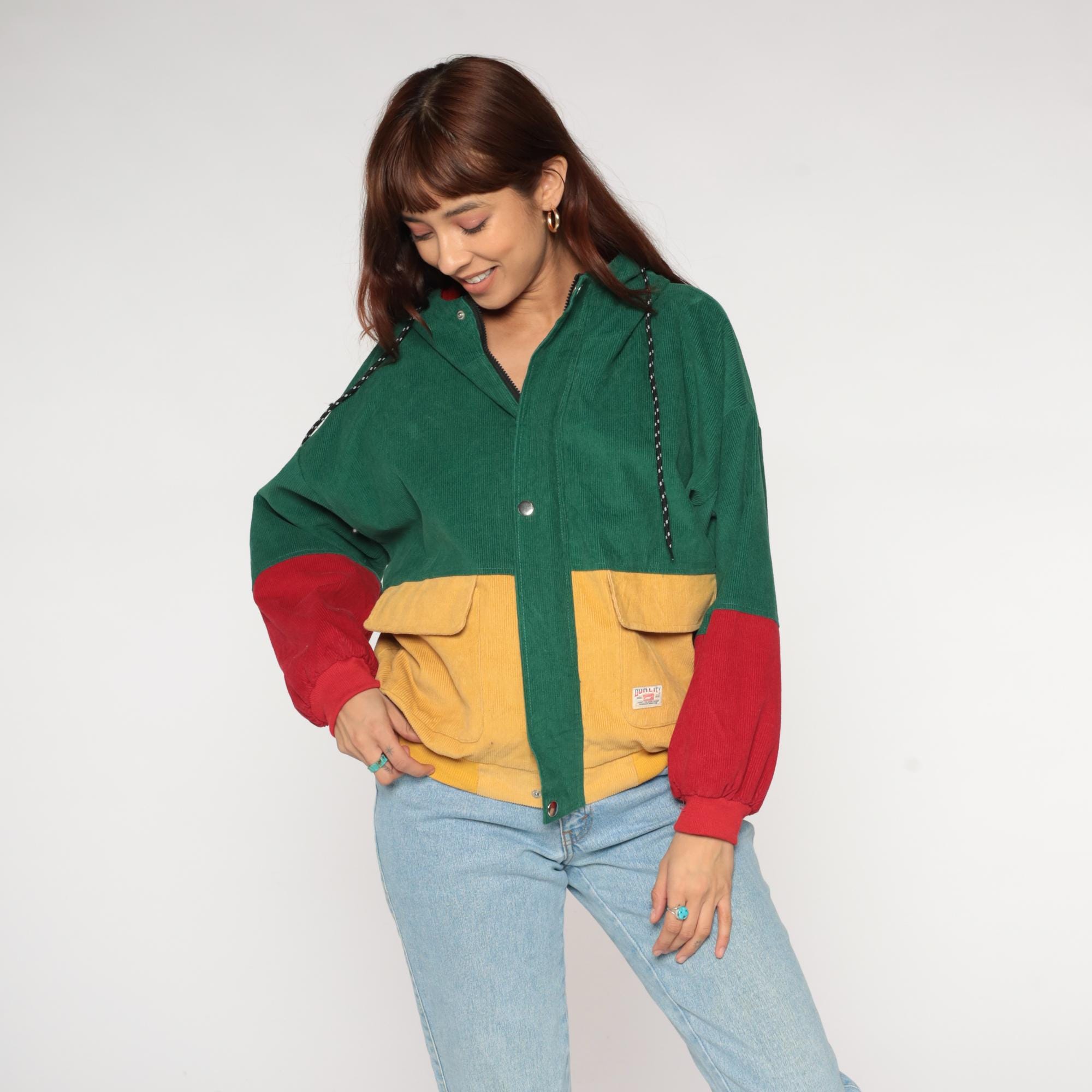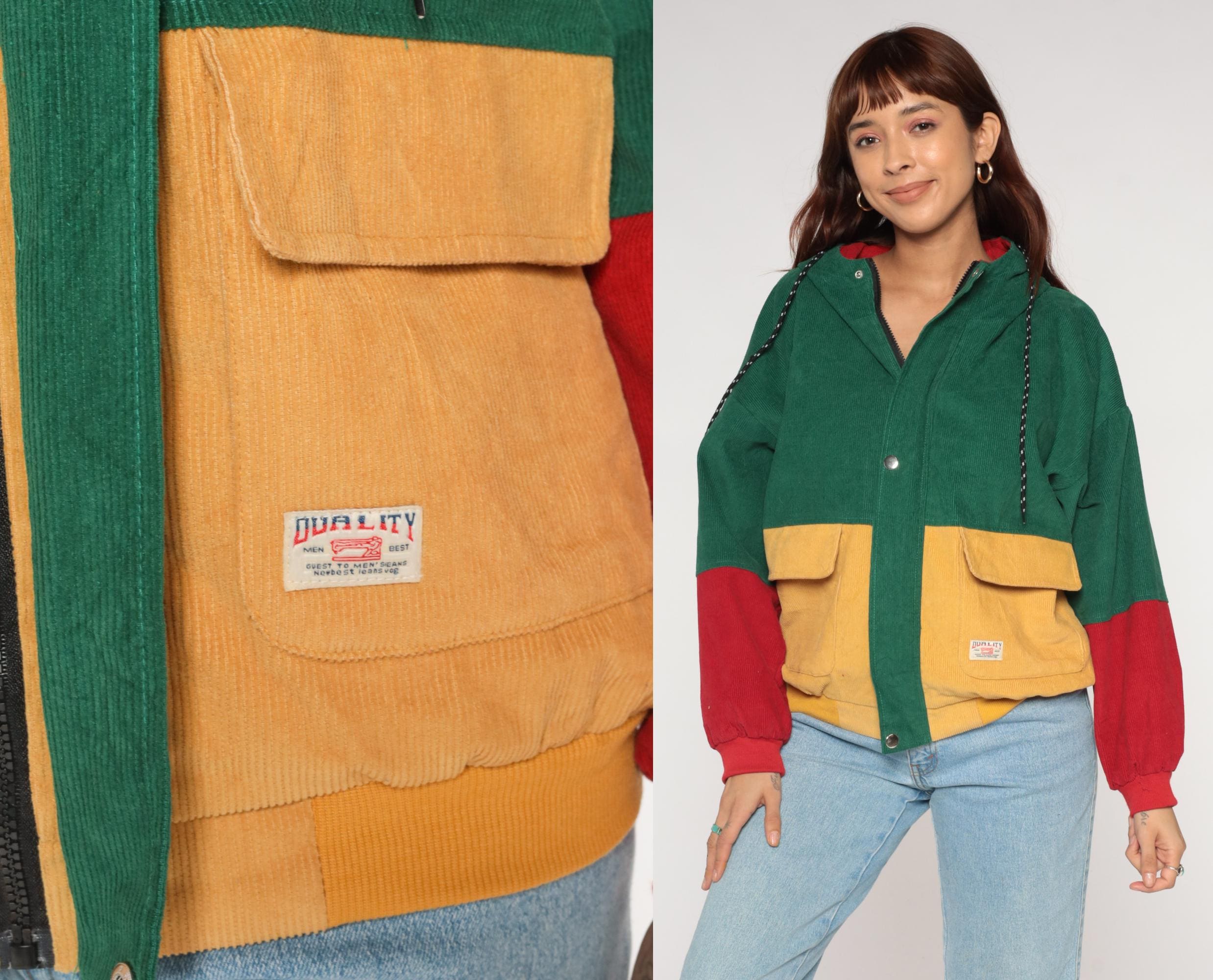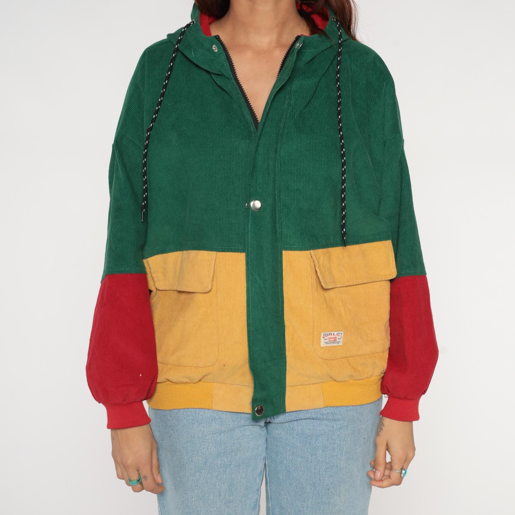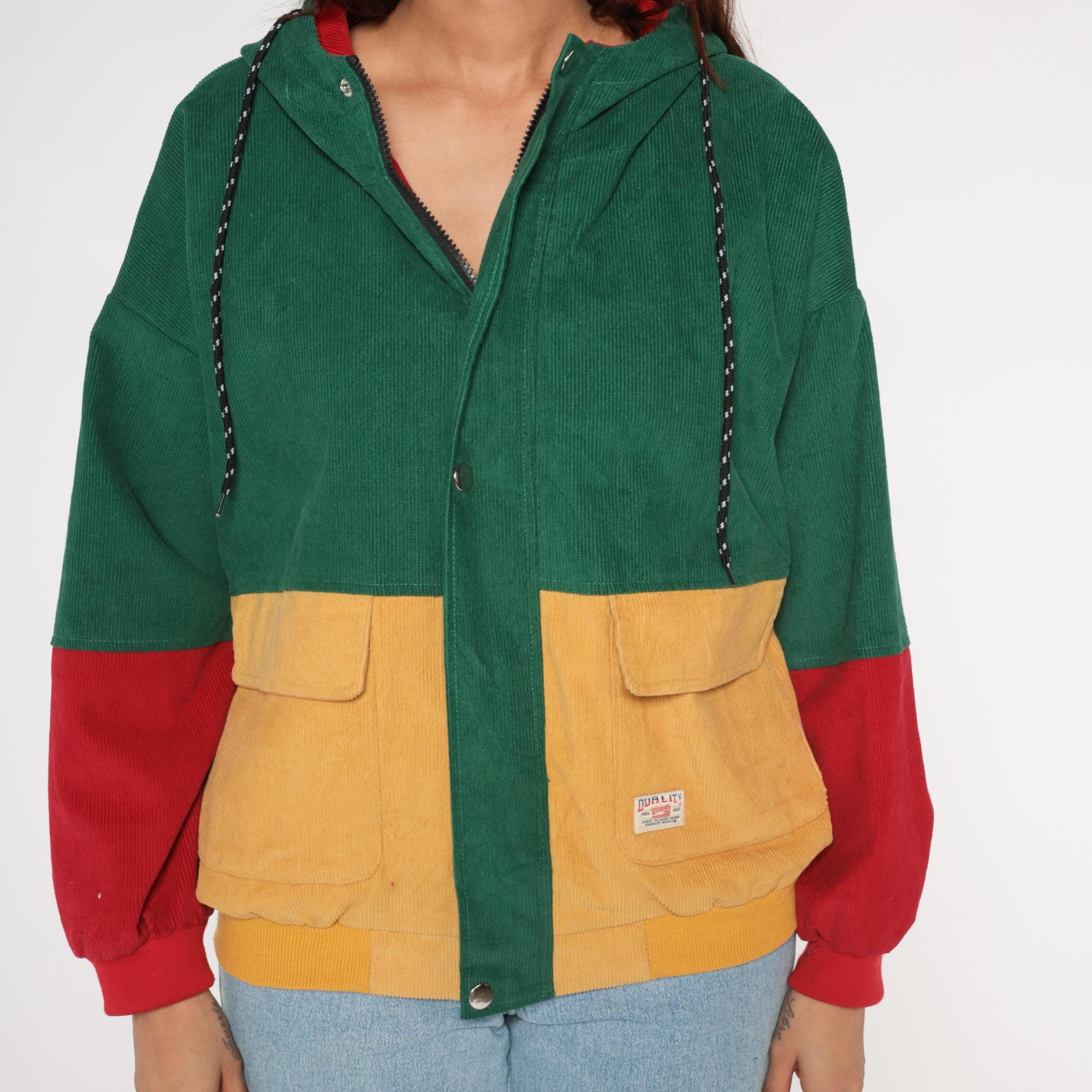 Y2K colorblock corduroy jacket from Duality. Features bold green, mustard yellow, and red color blocking design with hooded collar. Zip front closure with two large cargo-style patch pockets at chest in yellow corduroy. Drawstring hood with red lining.