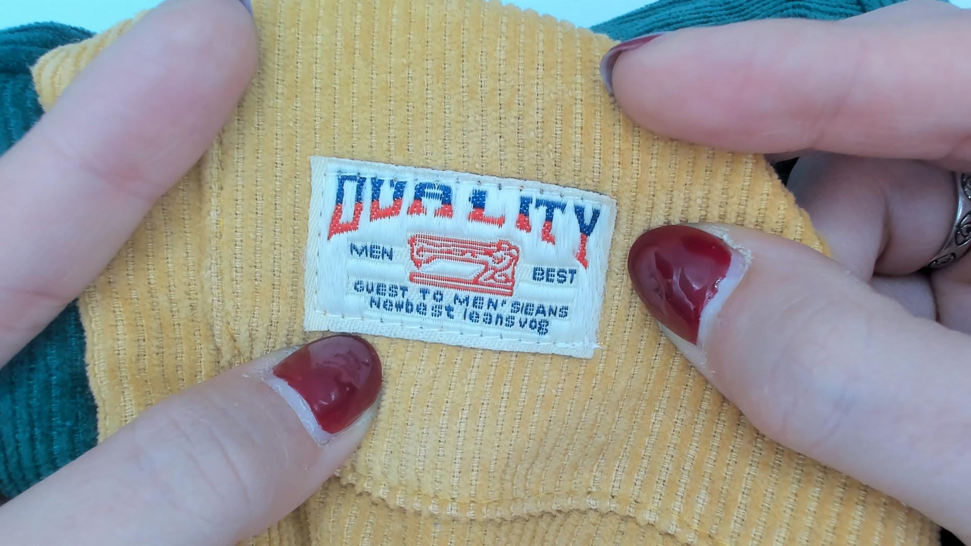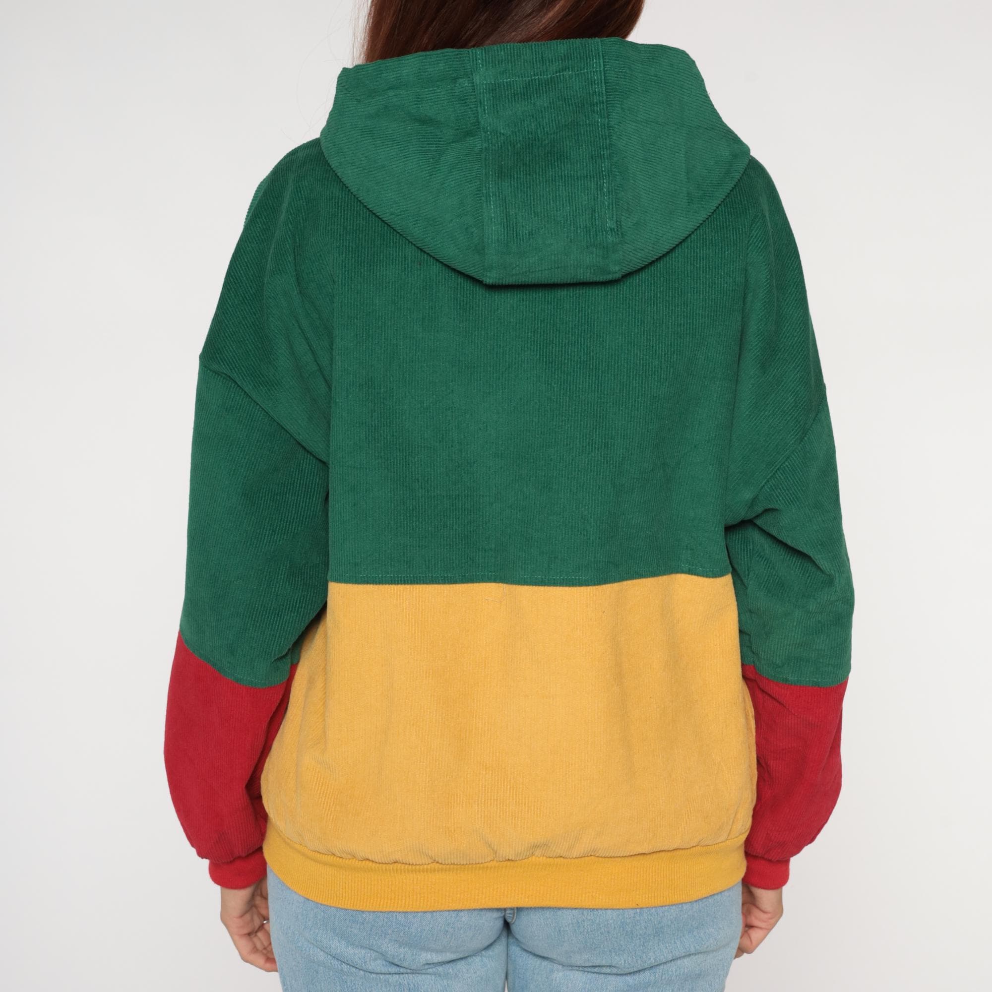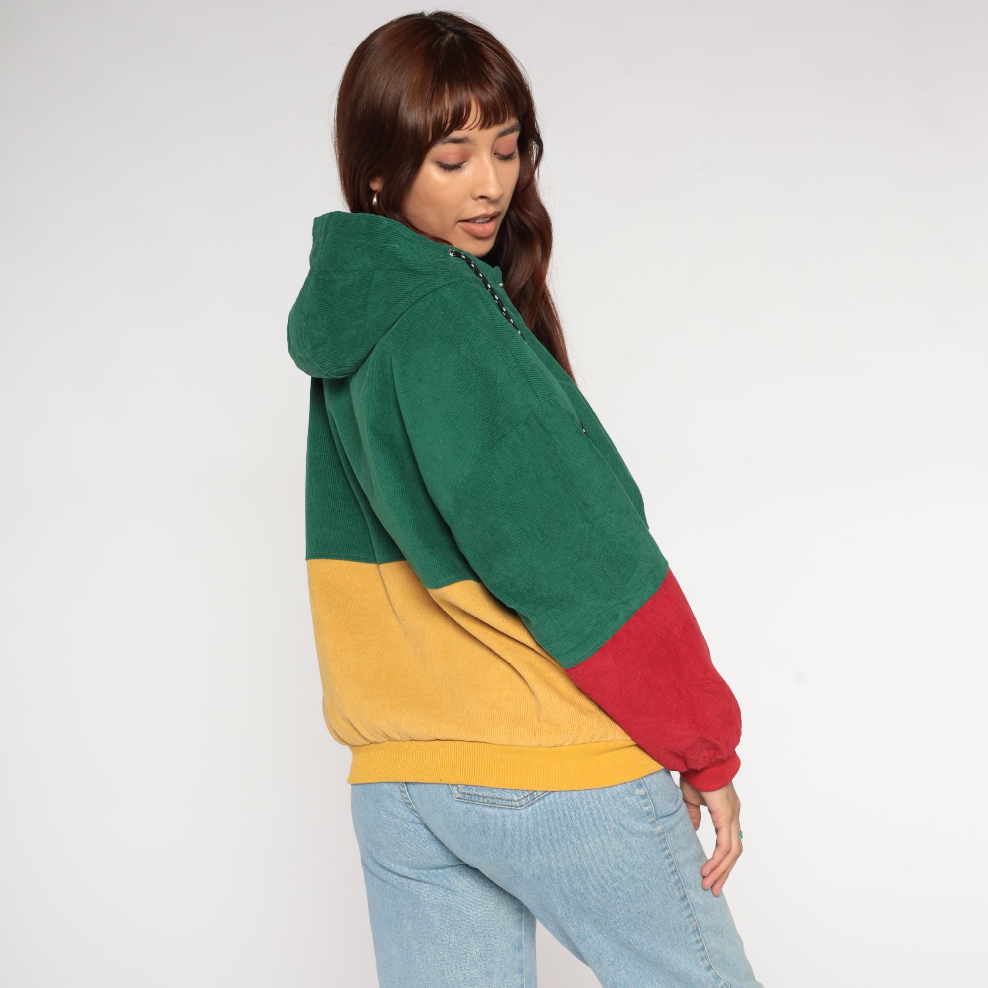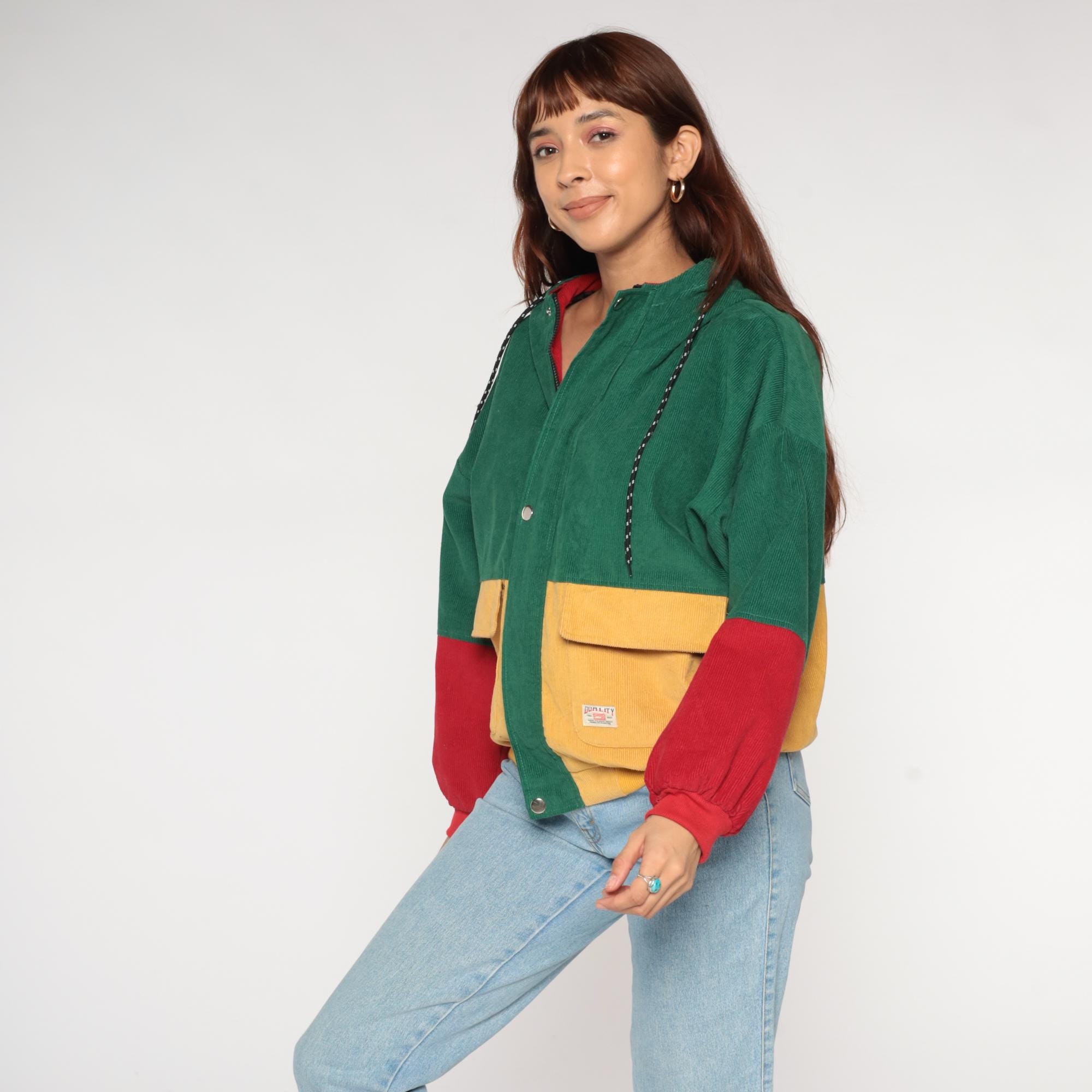 Y2K colorblock corduroy jacket from Duality. Features bold green, mustard yellow, and red color blocking design with hooded collar. Zip front closure with two large cargo-style patch pockets at chest in yellow corduroy. Drawstring hood with red lining.