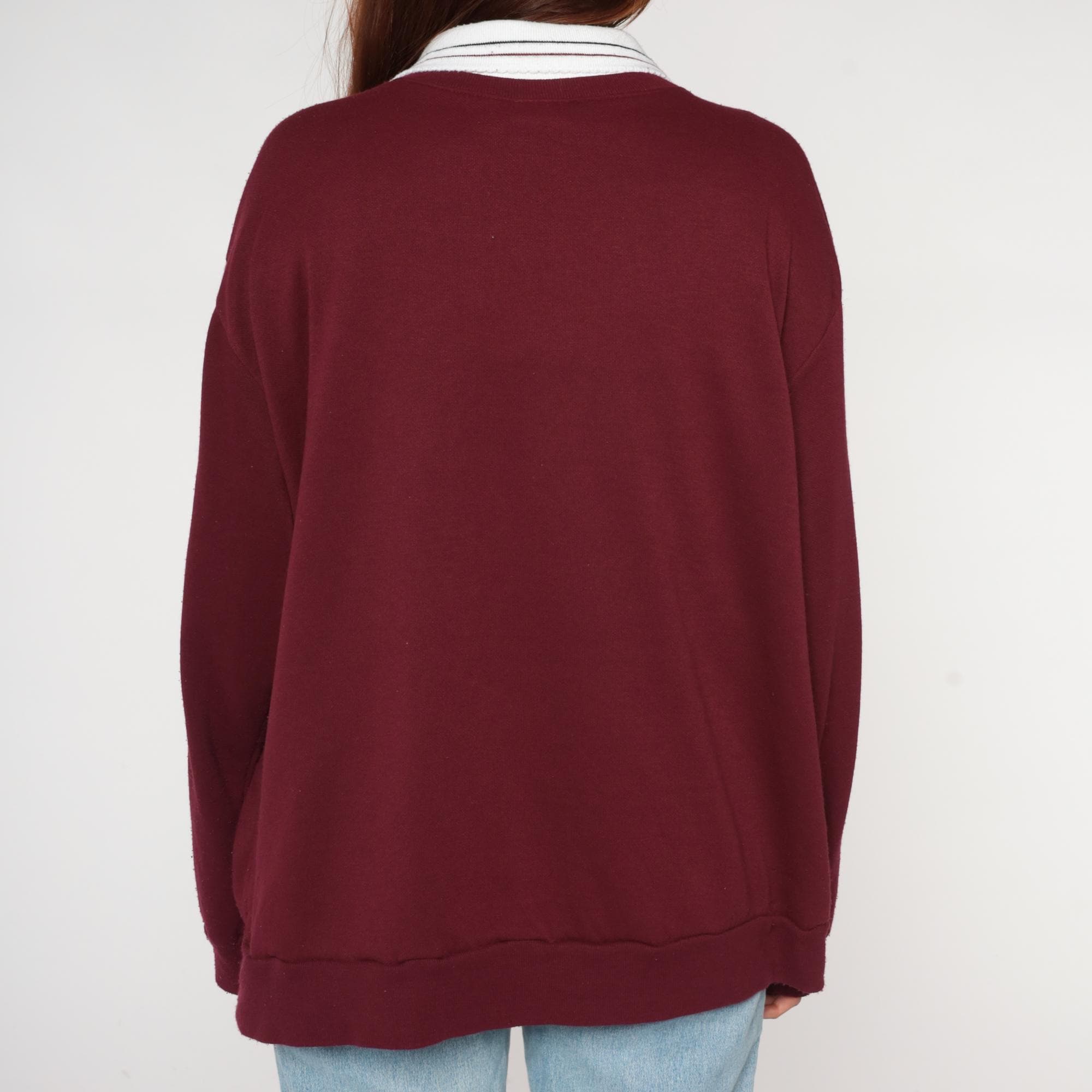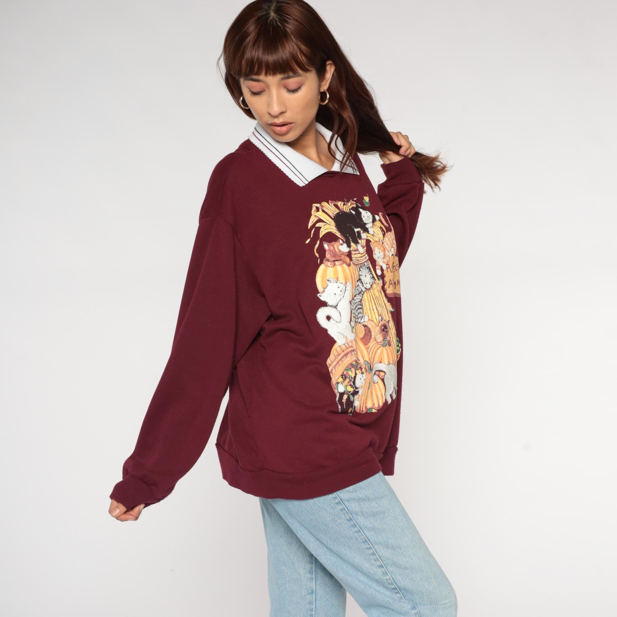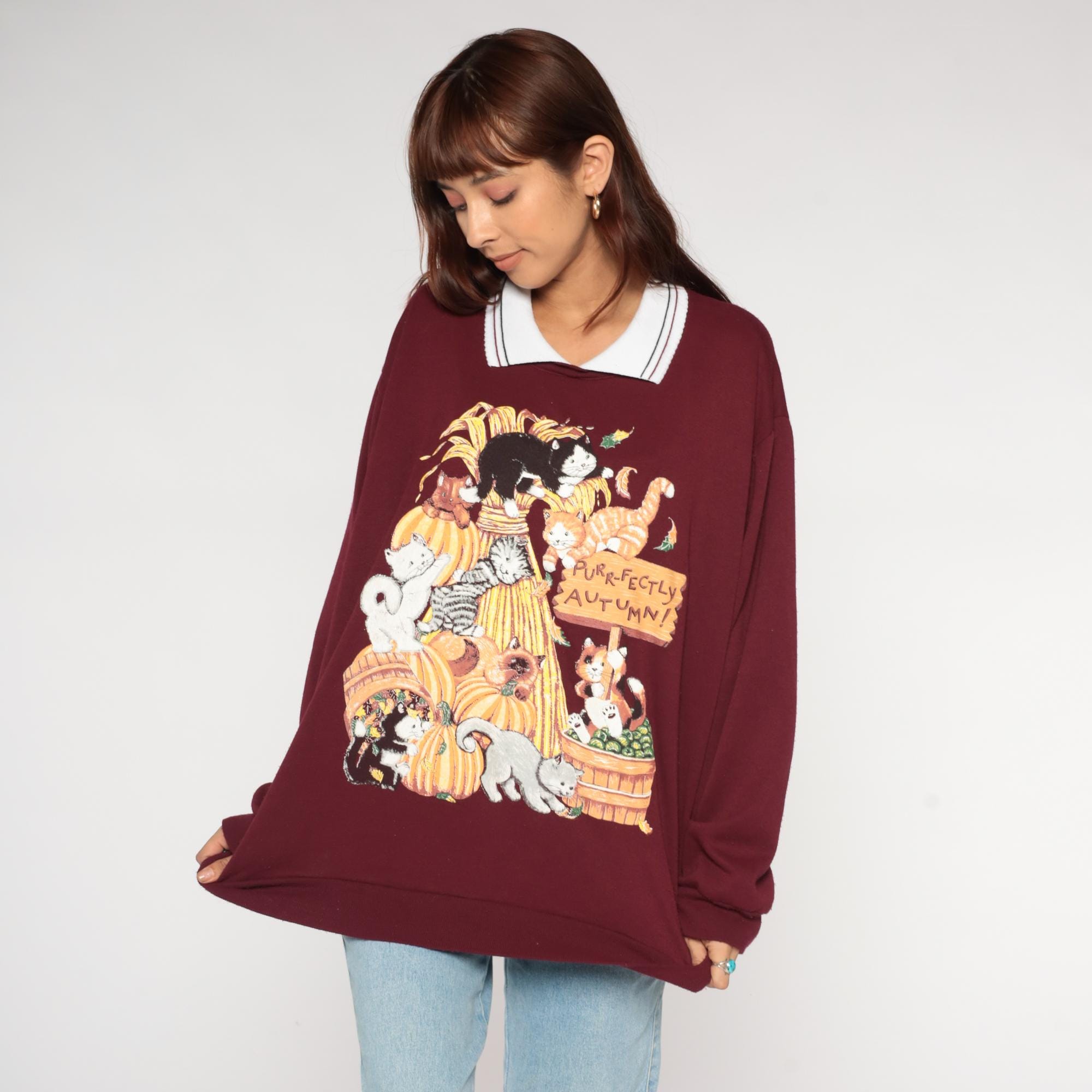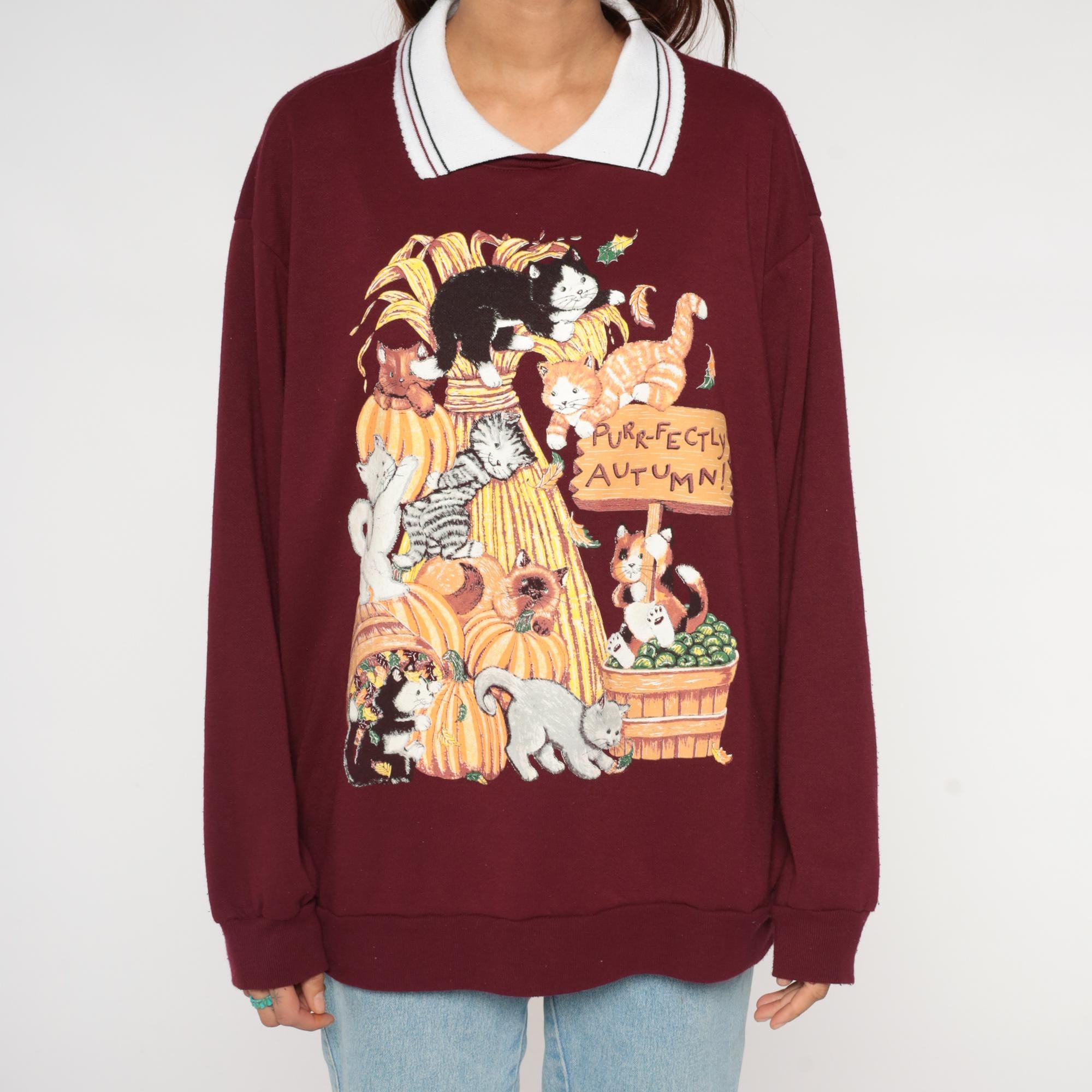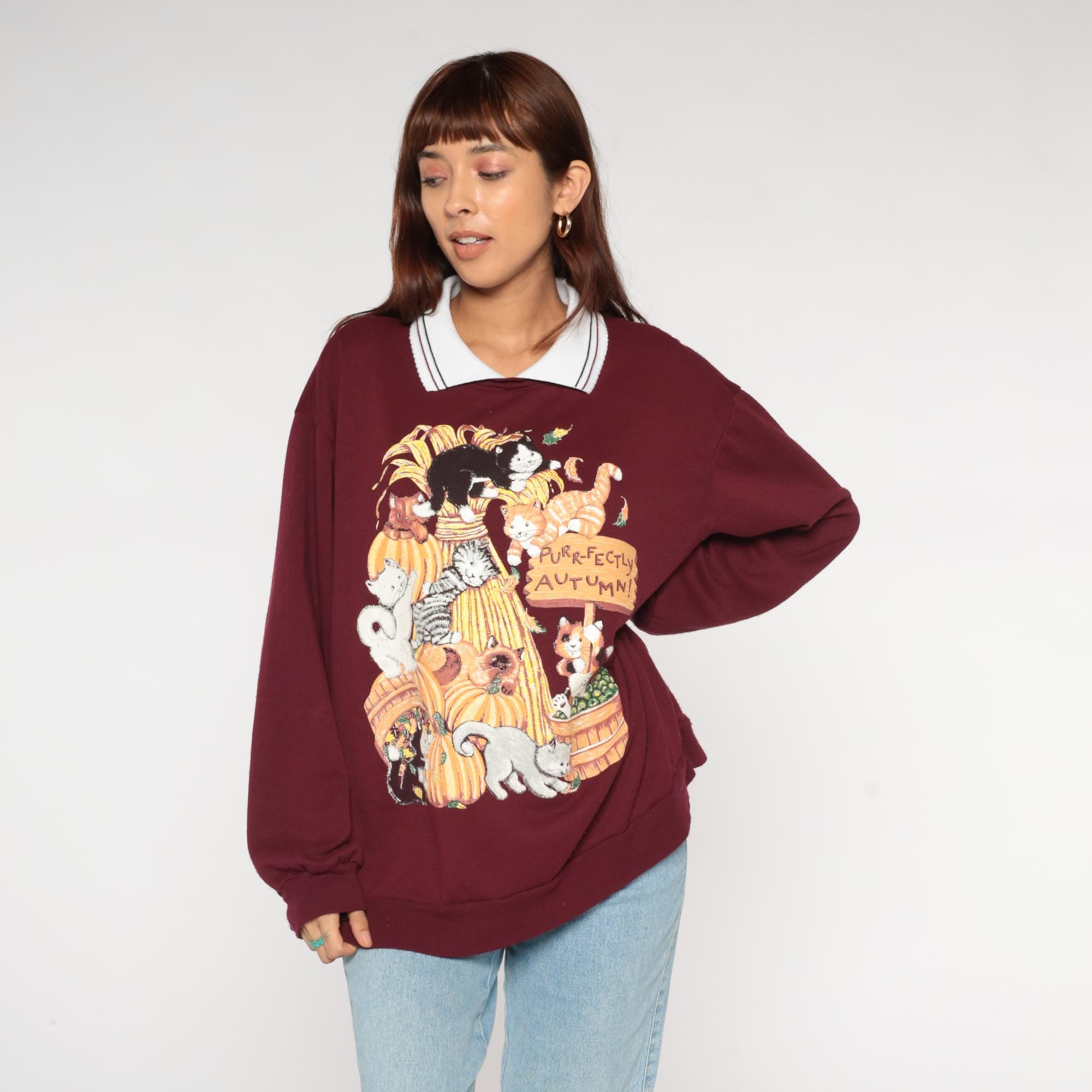 90s Basic Editions Plus sweatshirt in deep burgundy featuring a playful “Purr-fectly Autumn” cat and pumpkin graphic. This pullover includes a white collared neckline with stripe detail, long sleeves, and a relaxed fit.