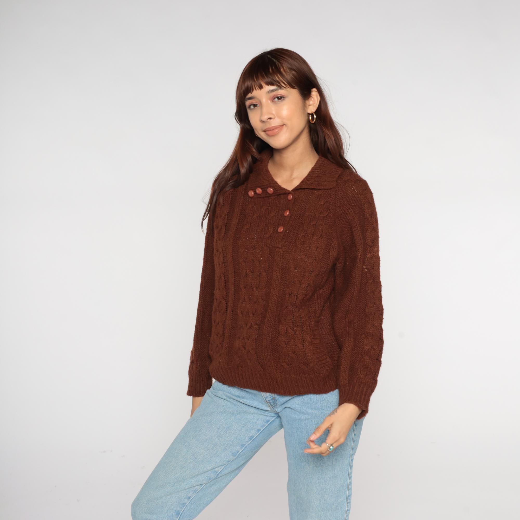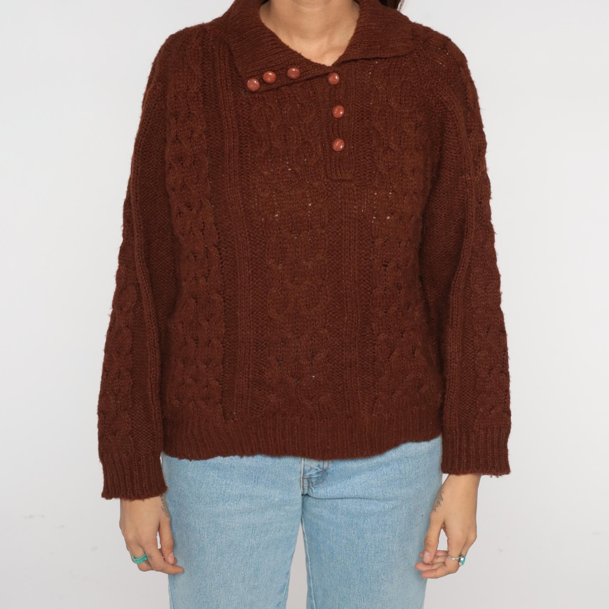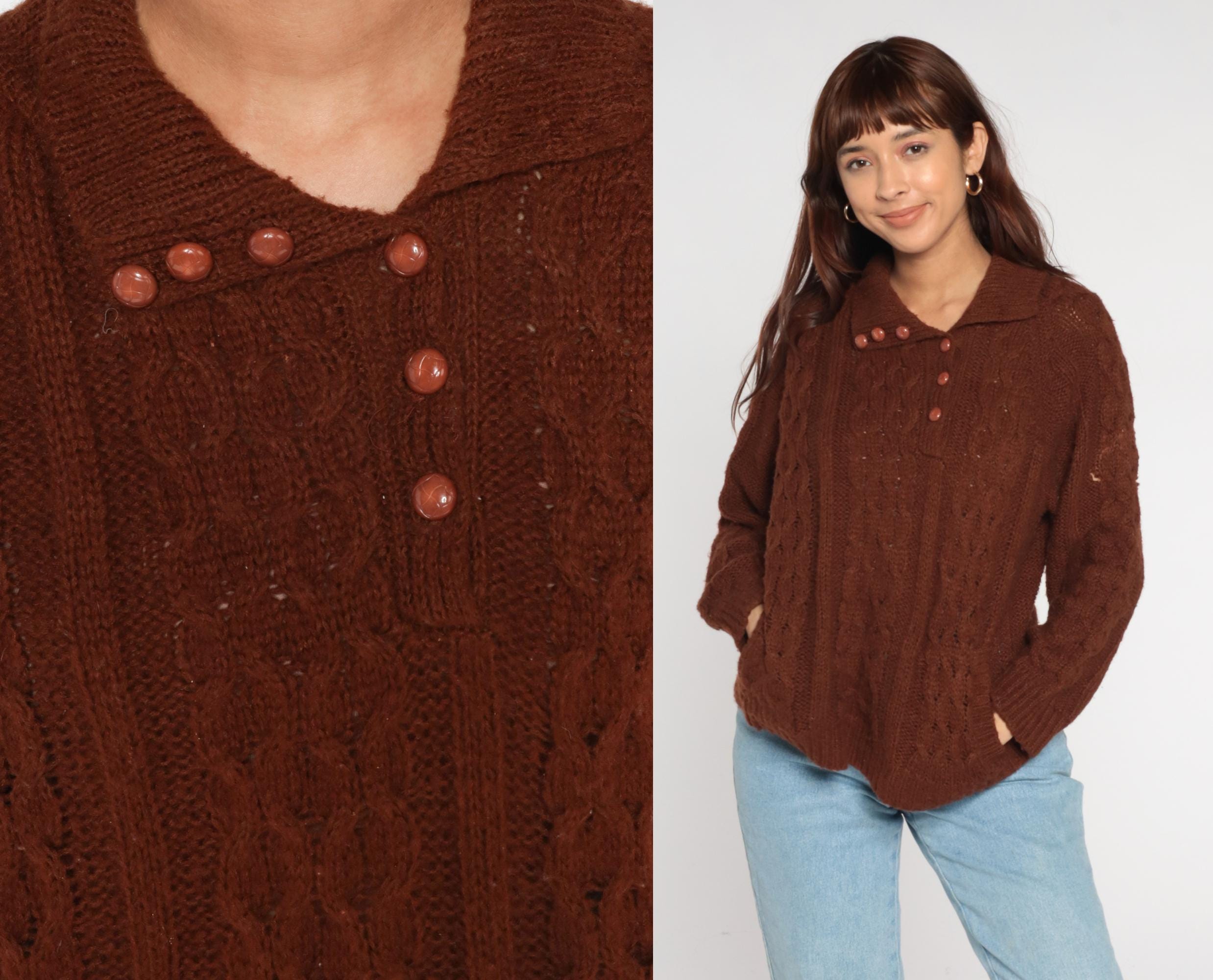 70s Rochelle California brown cable knit sweater featuring a collared neckline with six front buttons and a relaxed pullover fit. Constructed from an acrylic knit with a thick cable pattern and ribbed cuffs and hem.