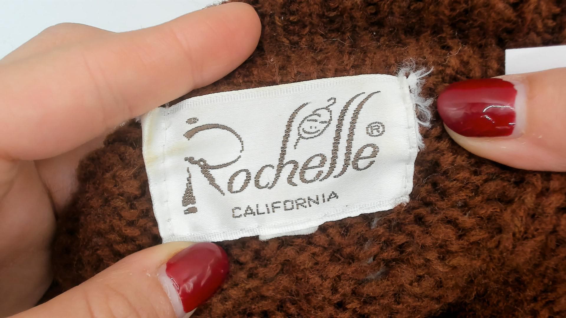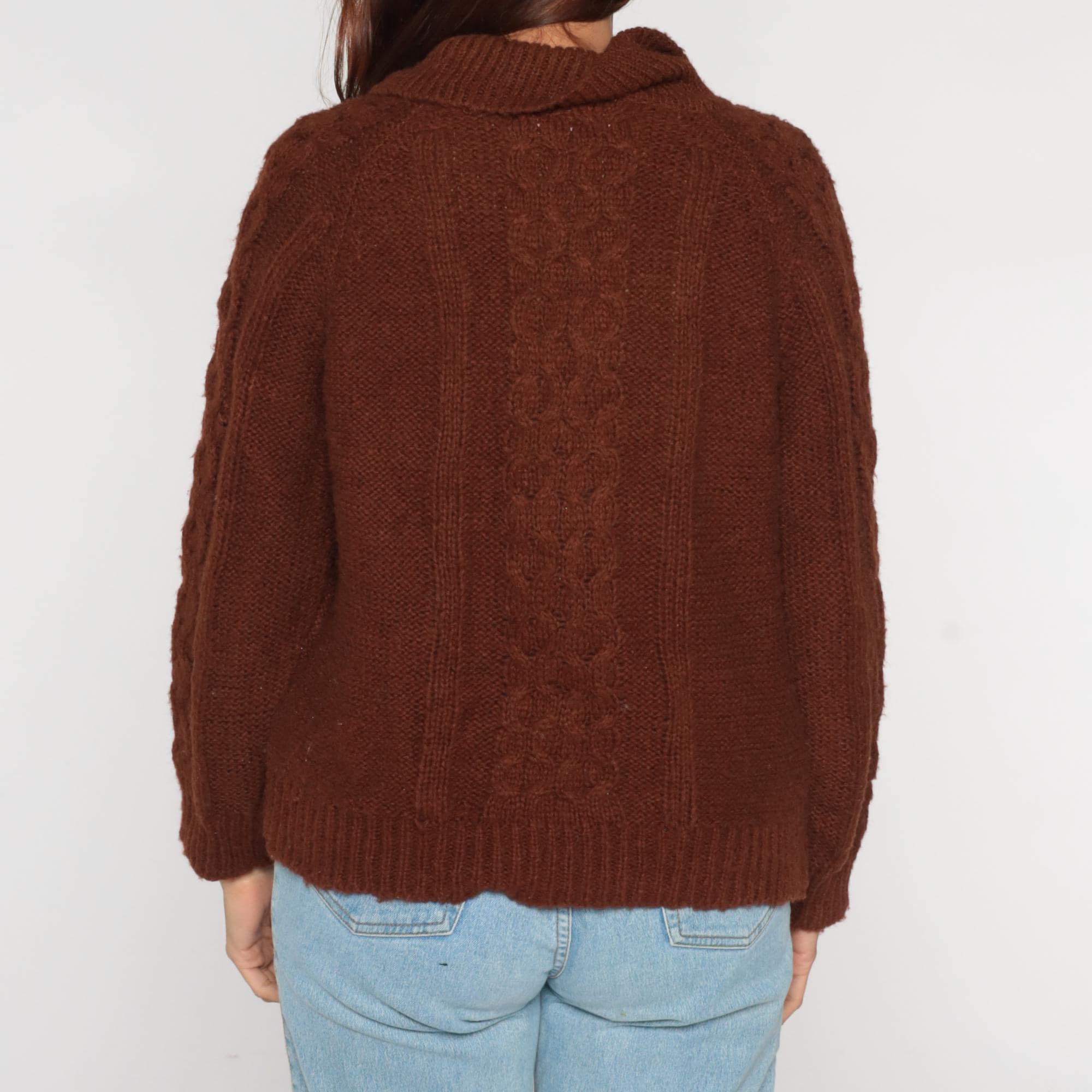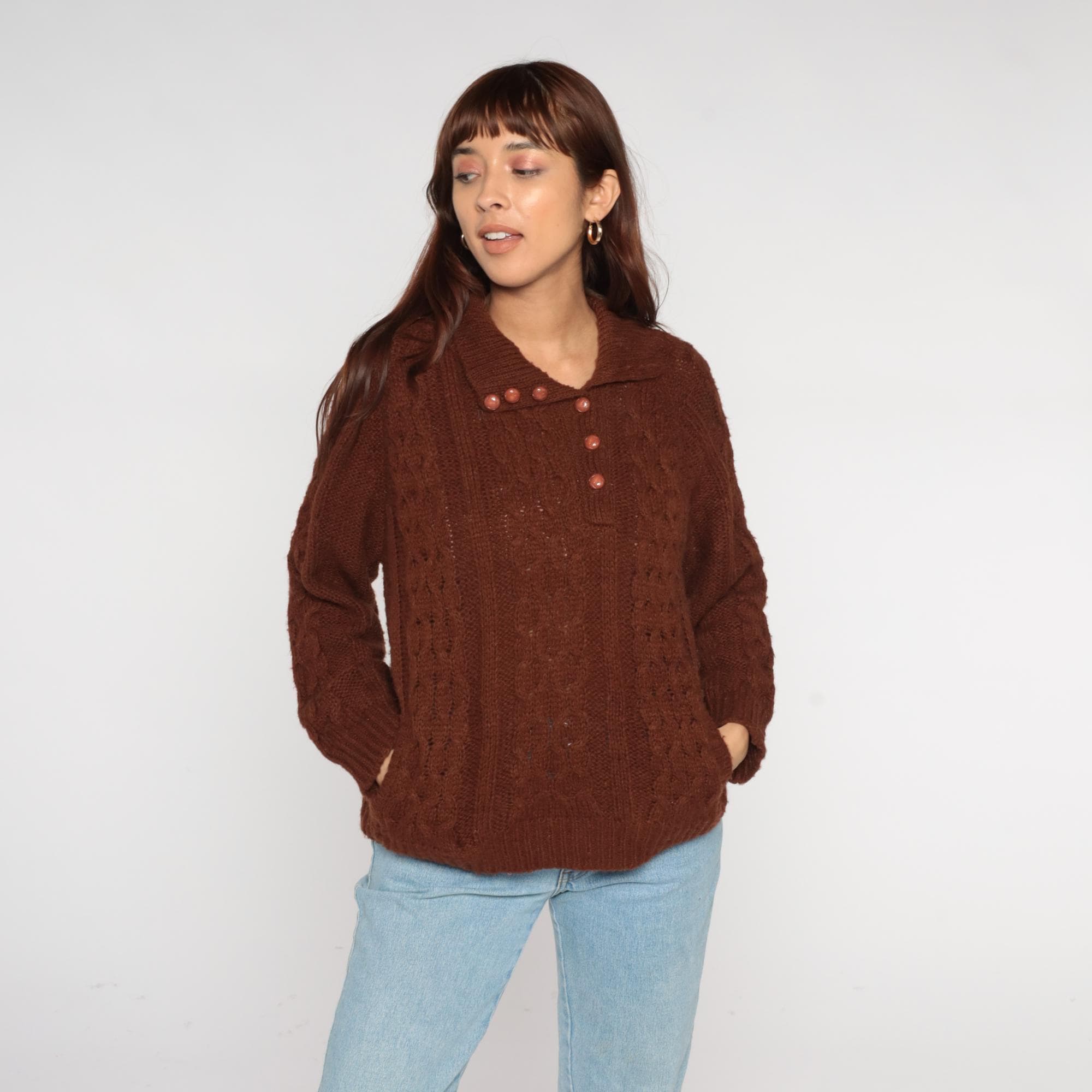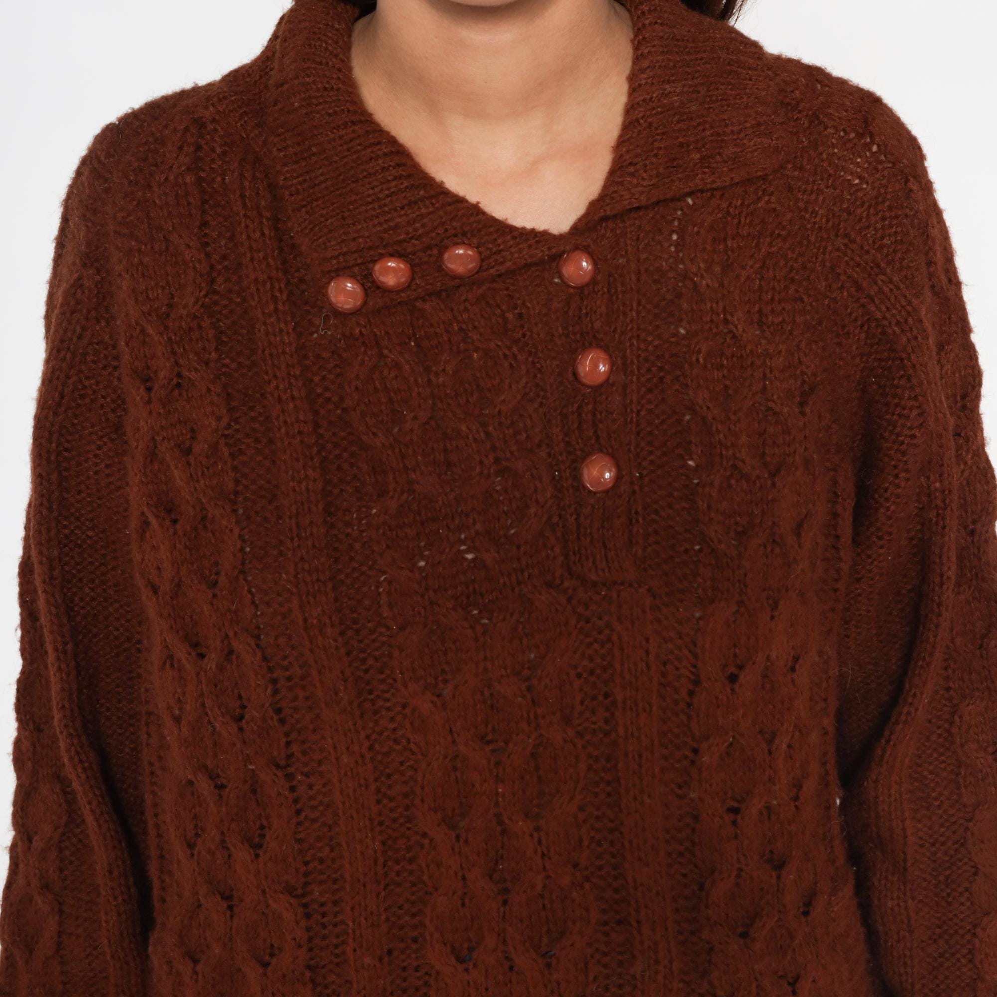70s Rochelle California brown cable knit sweater featuring a collared neckline with six front buttons and a relaxed pullover fit. Constructed from an acrylic knit with a thick cable pattern and ribbed cuffs and hem.