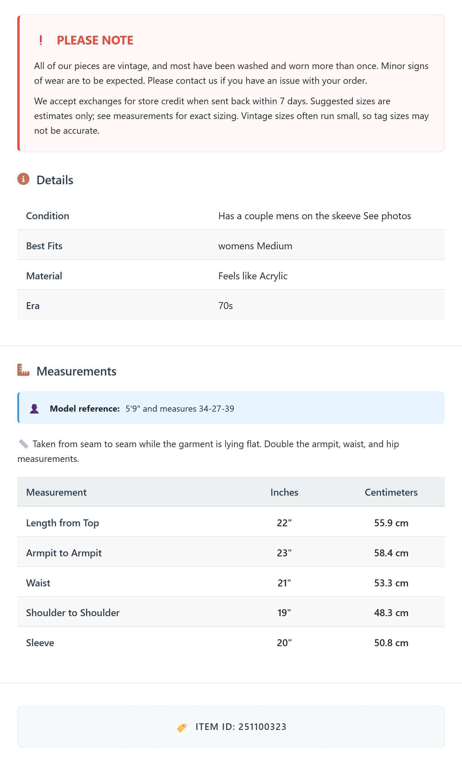 All of our pieces are vintage, and most have been washed and worn more than once. Minor signs of wear are to be expected. Please contact us if you have an issue with your order. We accept exchanges for store credit when sent back within 7 days.