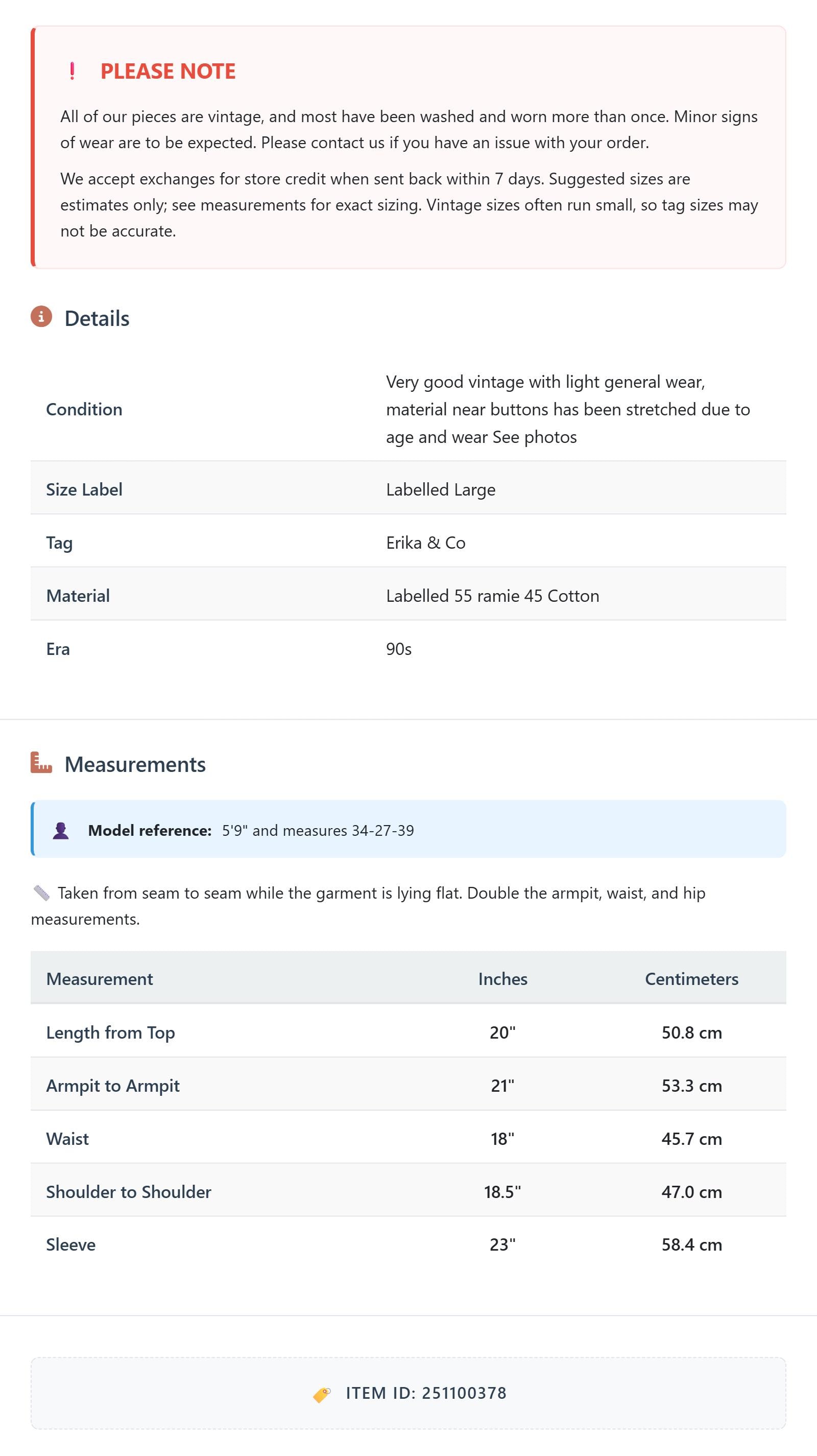All of our pieces are vintage, and most have been washed and worn more than once. Minor signs of wear are to be expected. Please contact us if you have an issue with your order. We accept exchanges for store credit when sent back within 7 days.