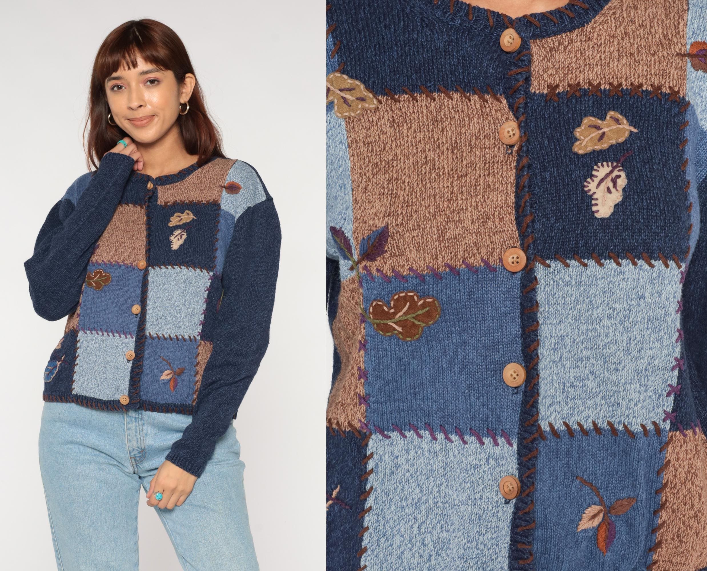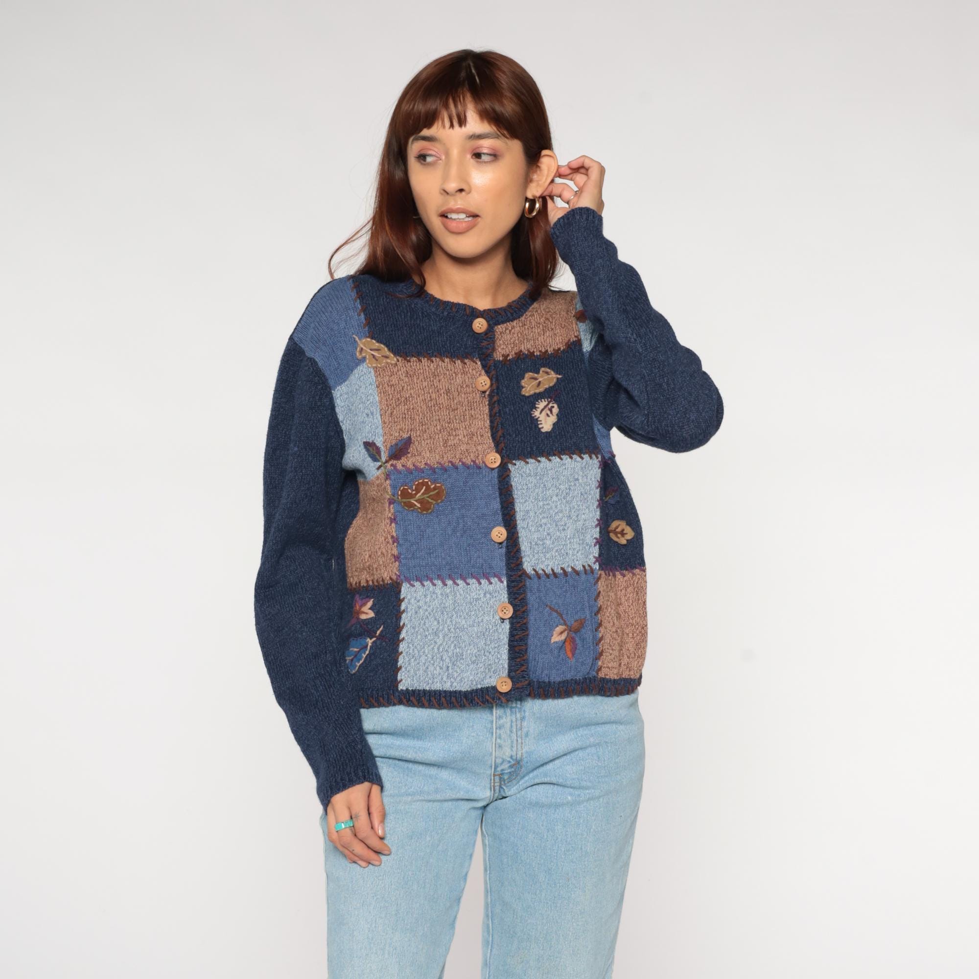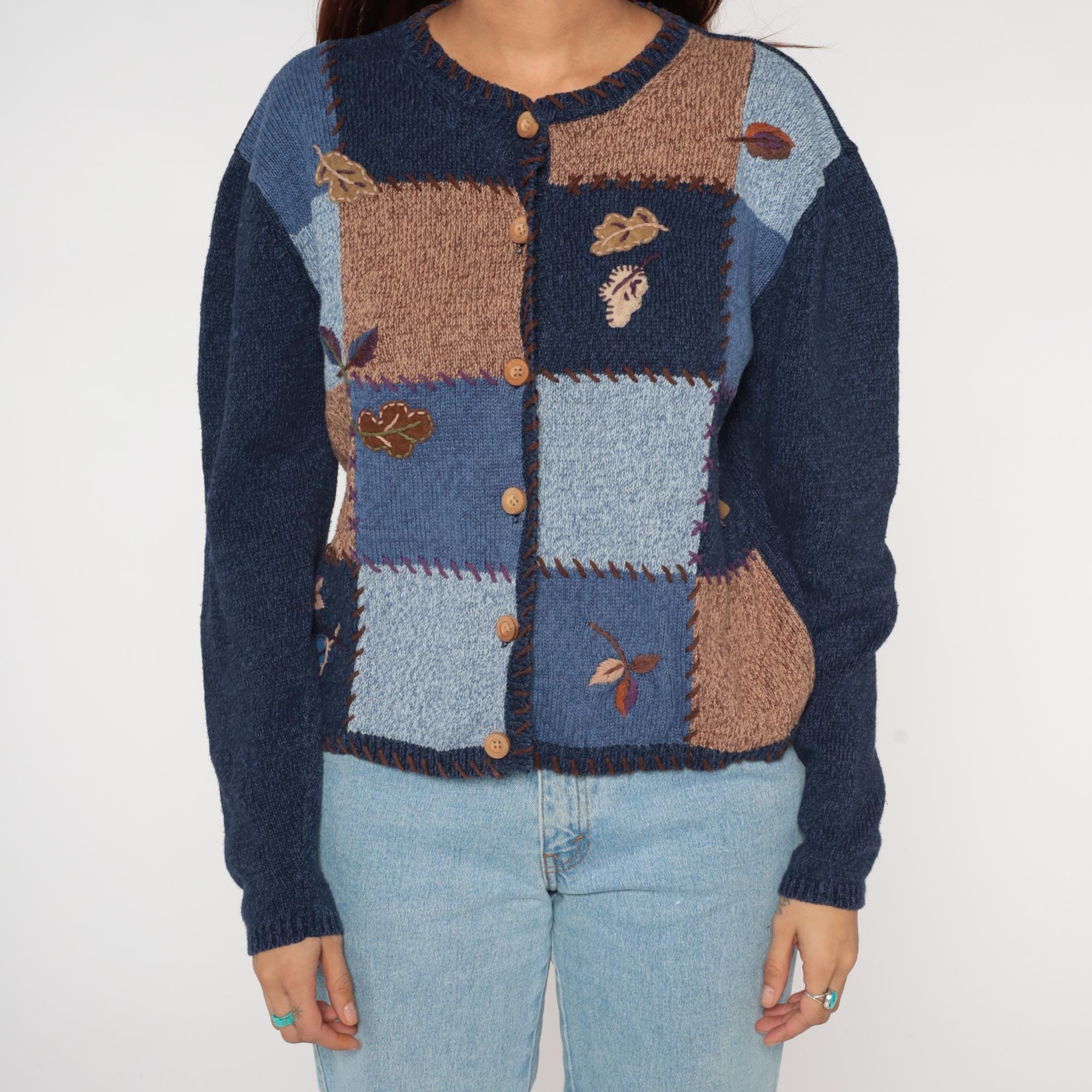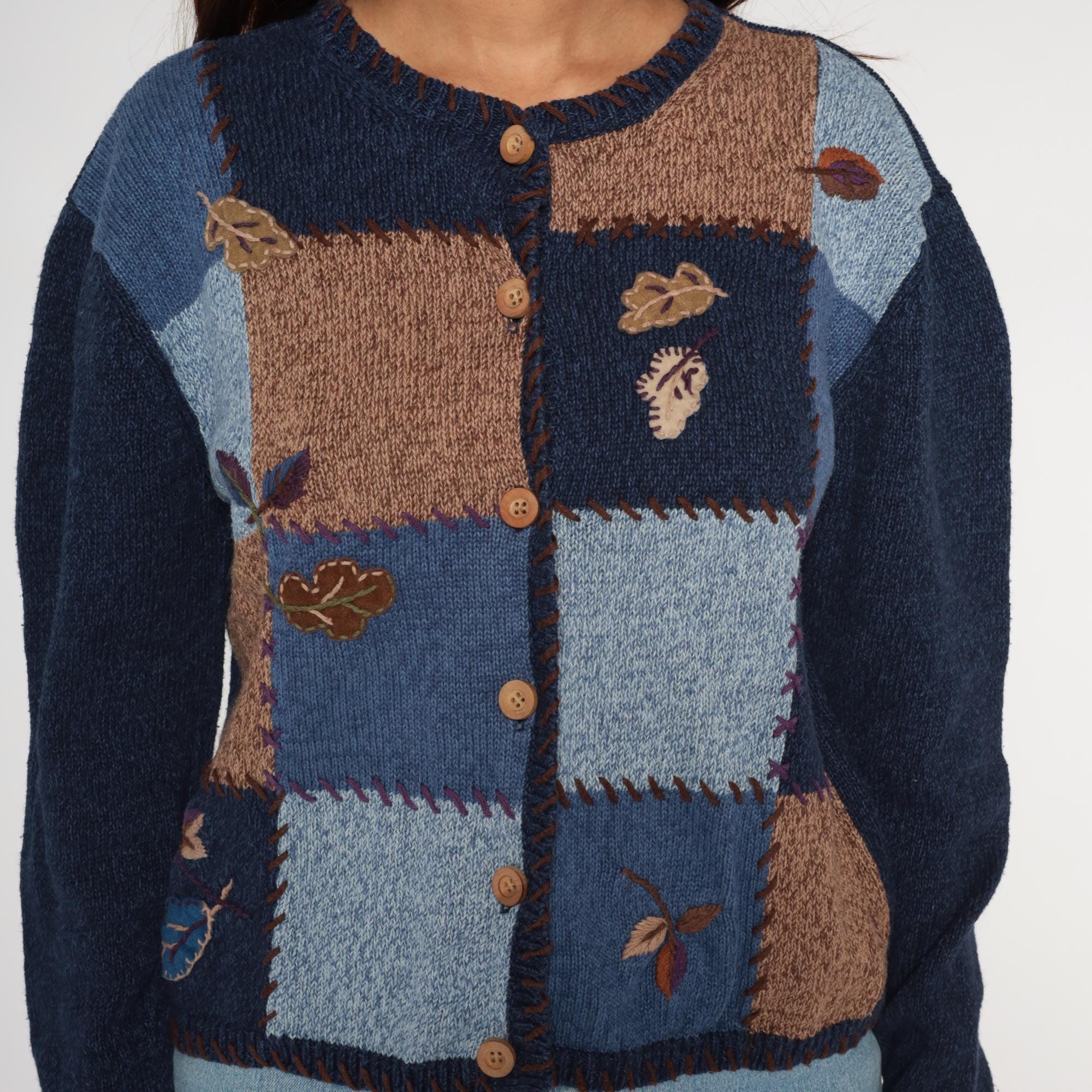 90s Erika & Co cardigan with a blue and brown patchwork knit design featuring embroidered leaf details. Includes a round neckline, wooden buttons down the front, and ribbed cuffs and hem.