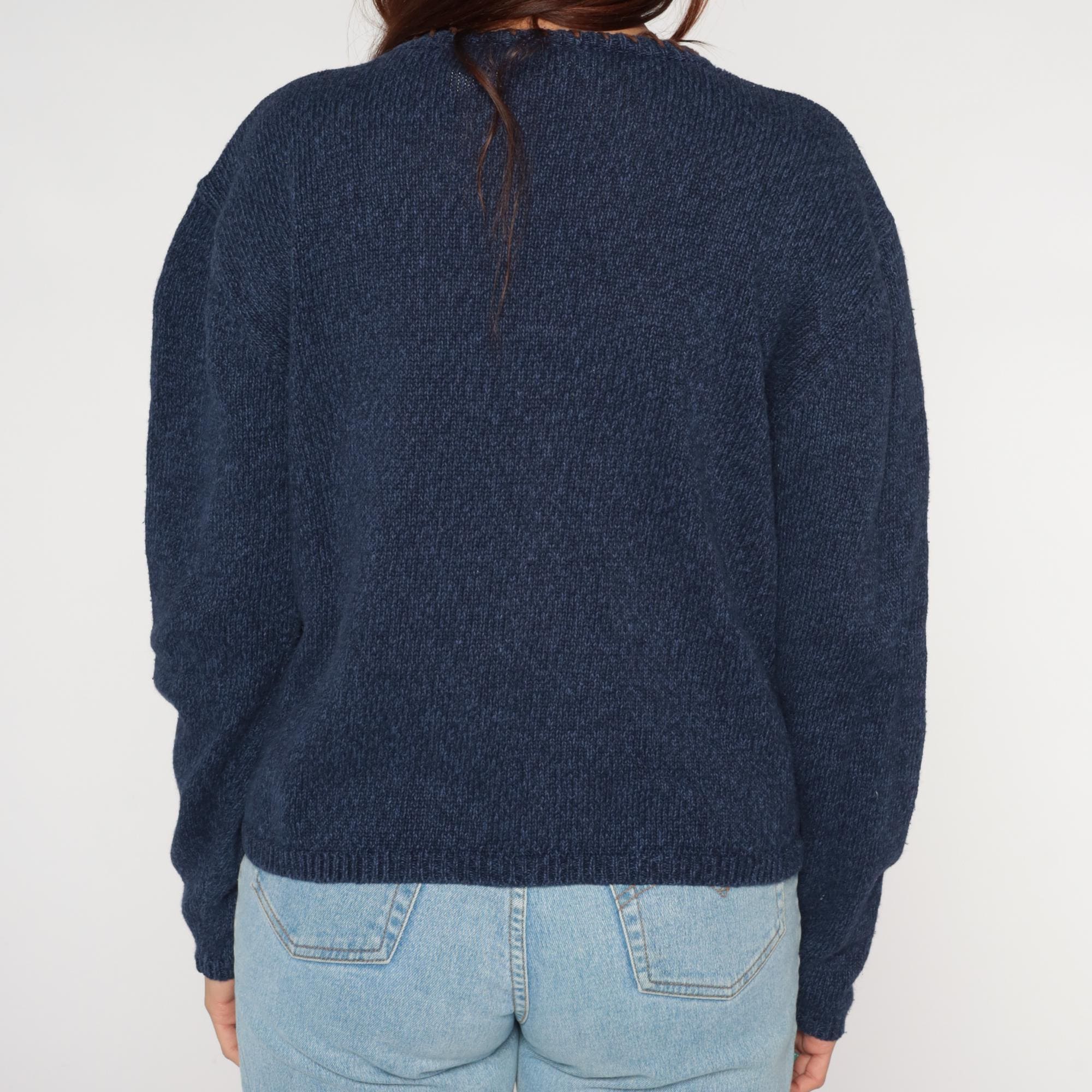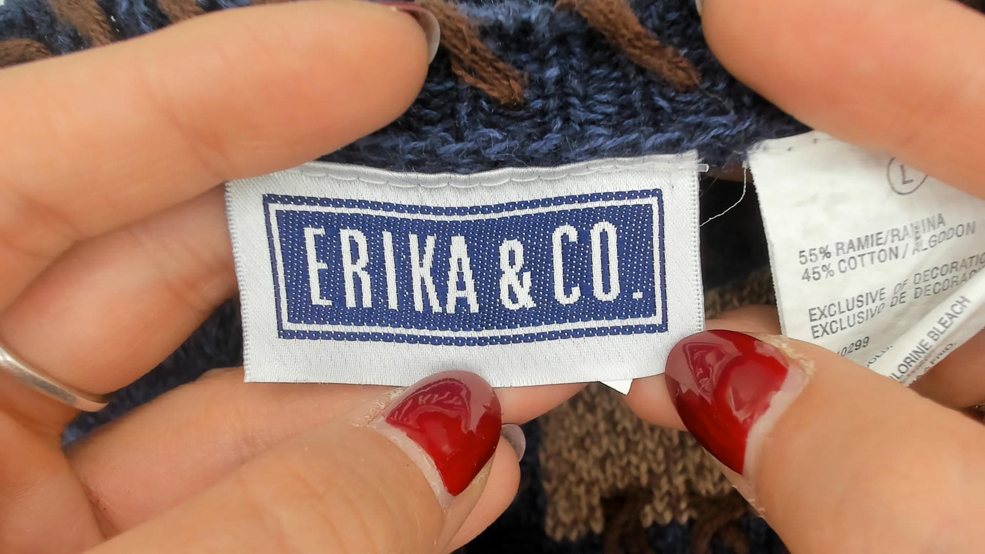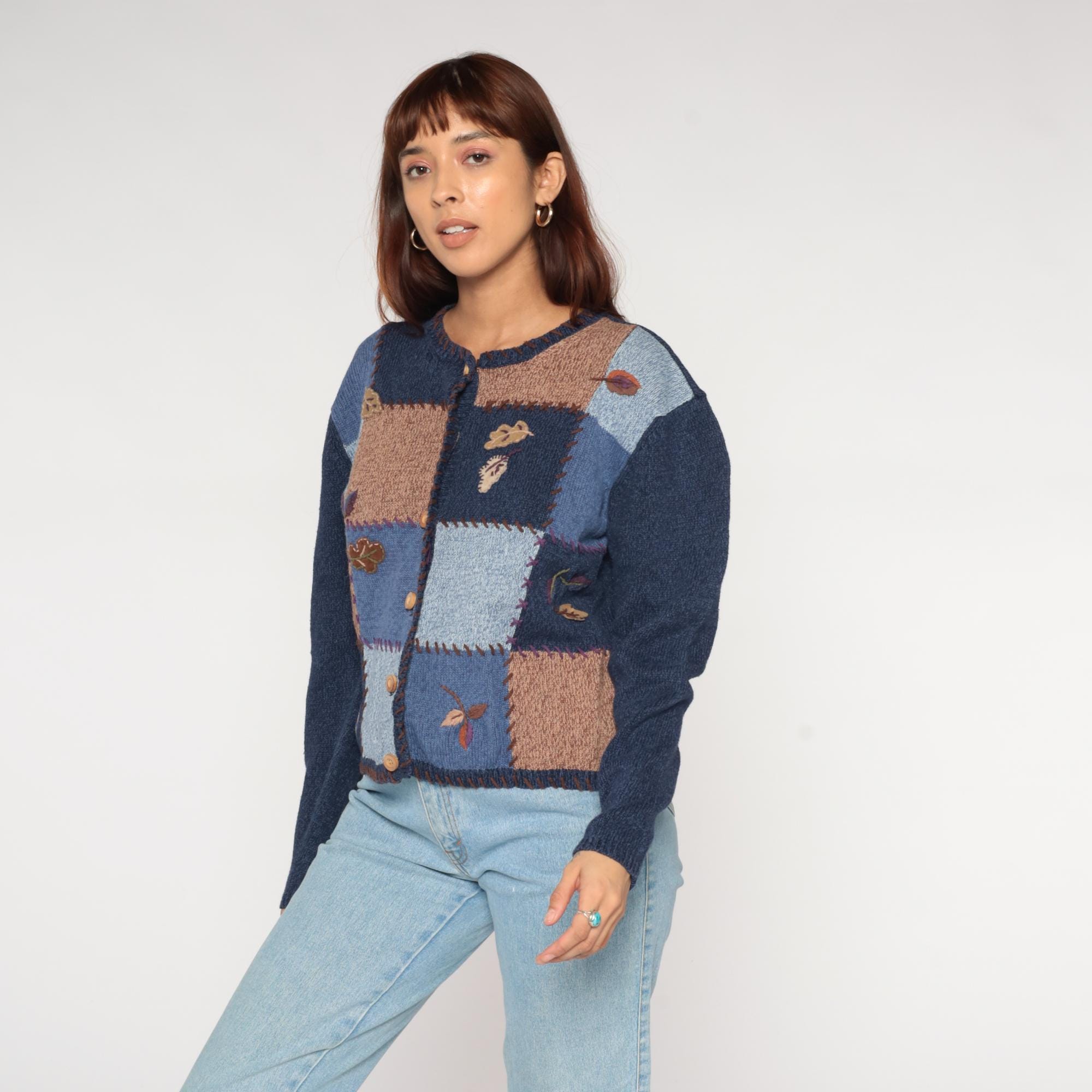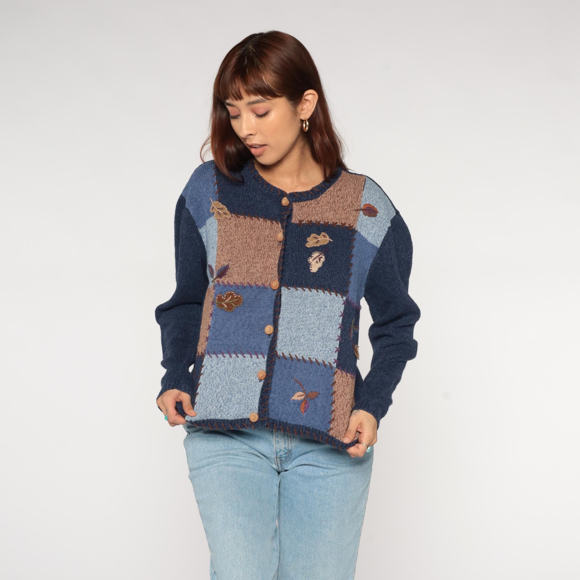 90s Erika & Co cardigan with a blue and brown patchwork knit design featuring embroidered leaf details. Includes a round neckline, wooden buttons down the front, and ribbed cuffs and hem.