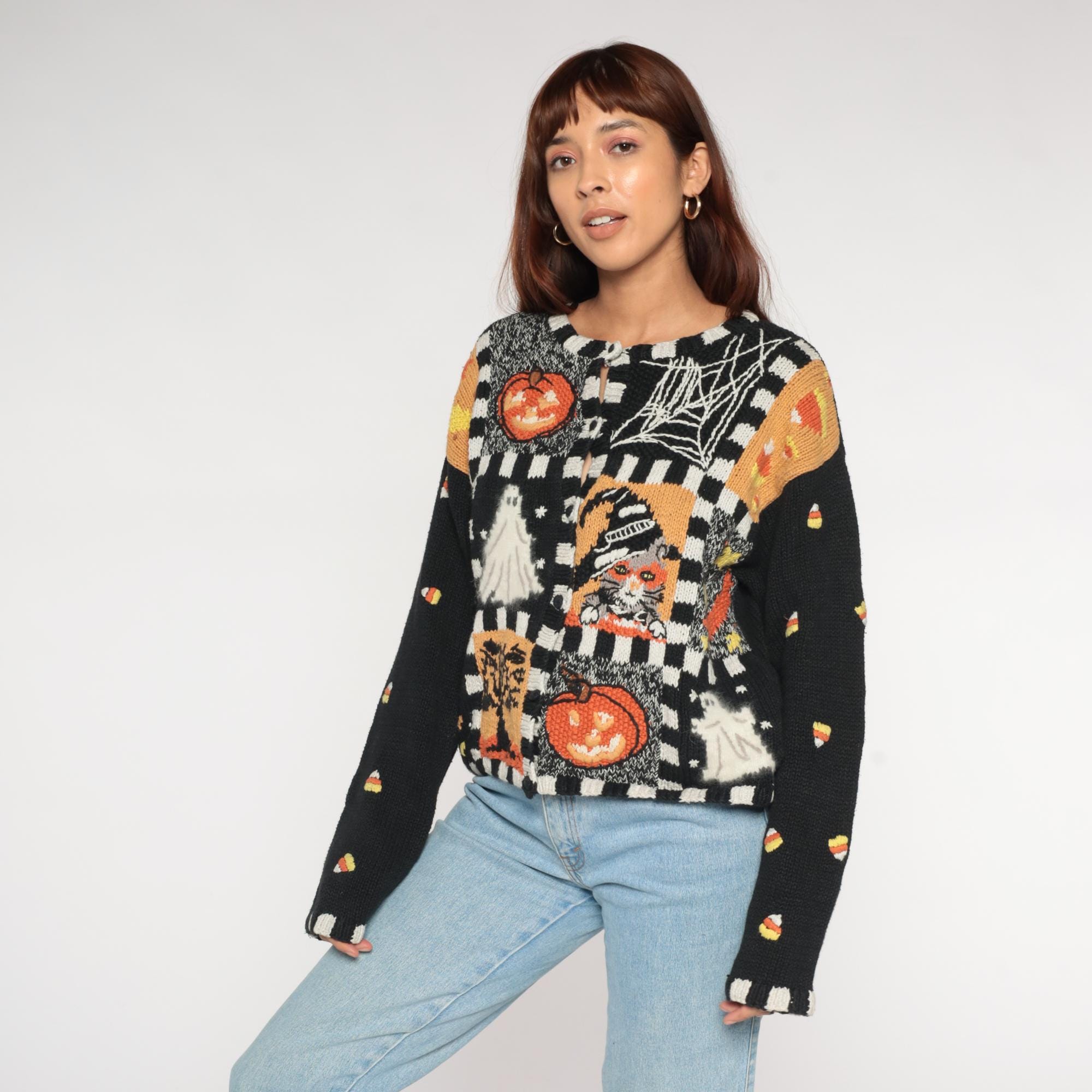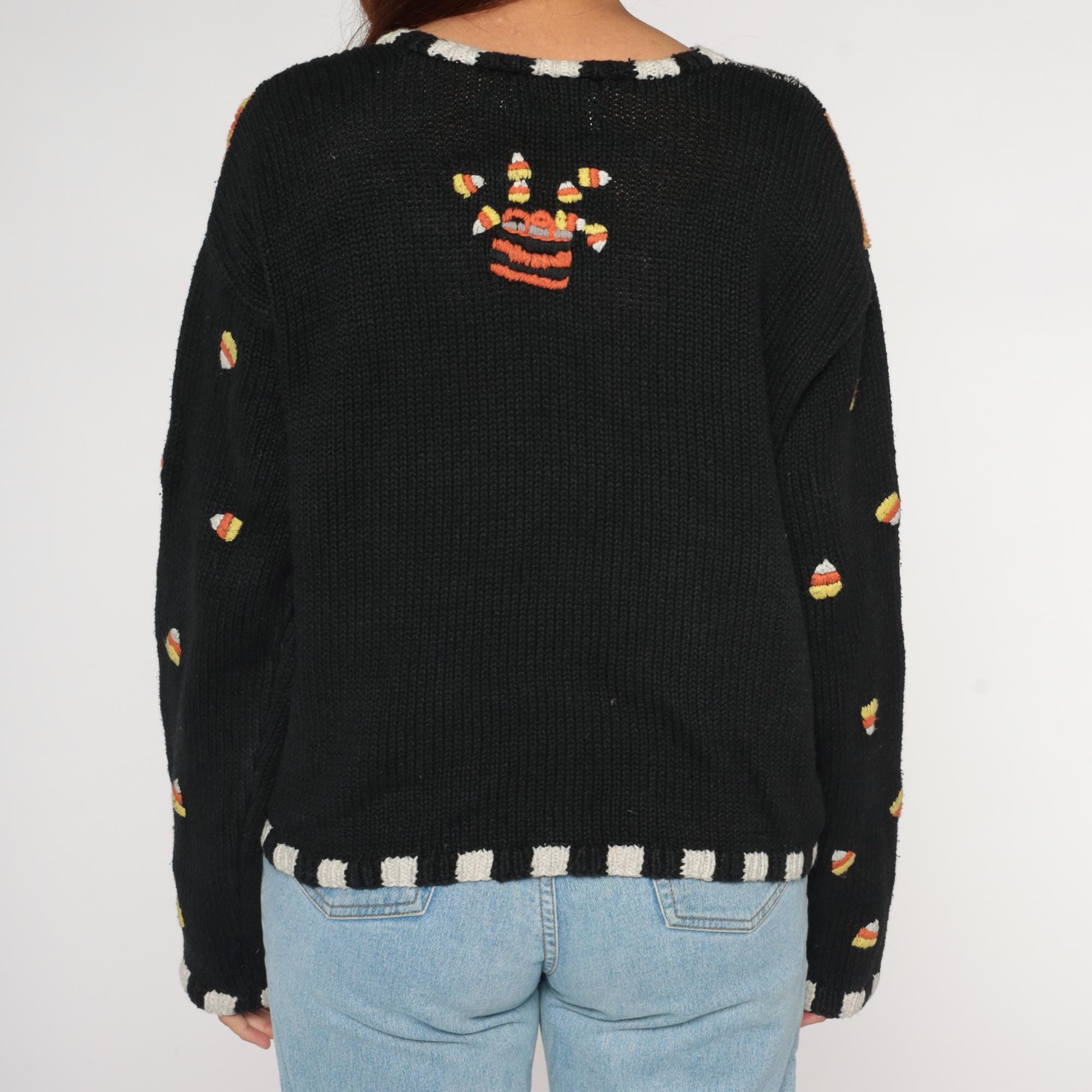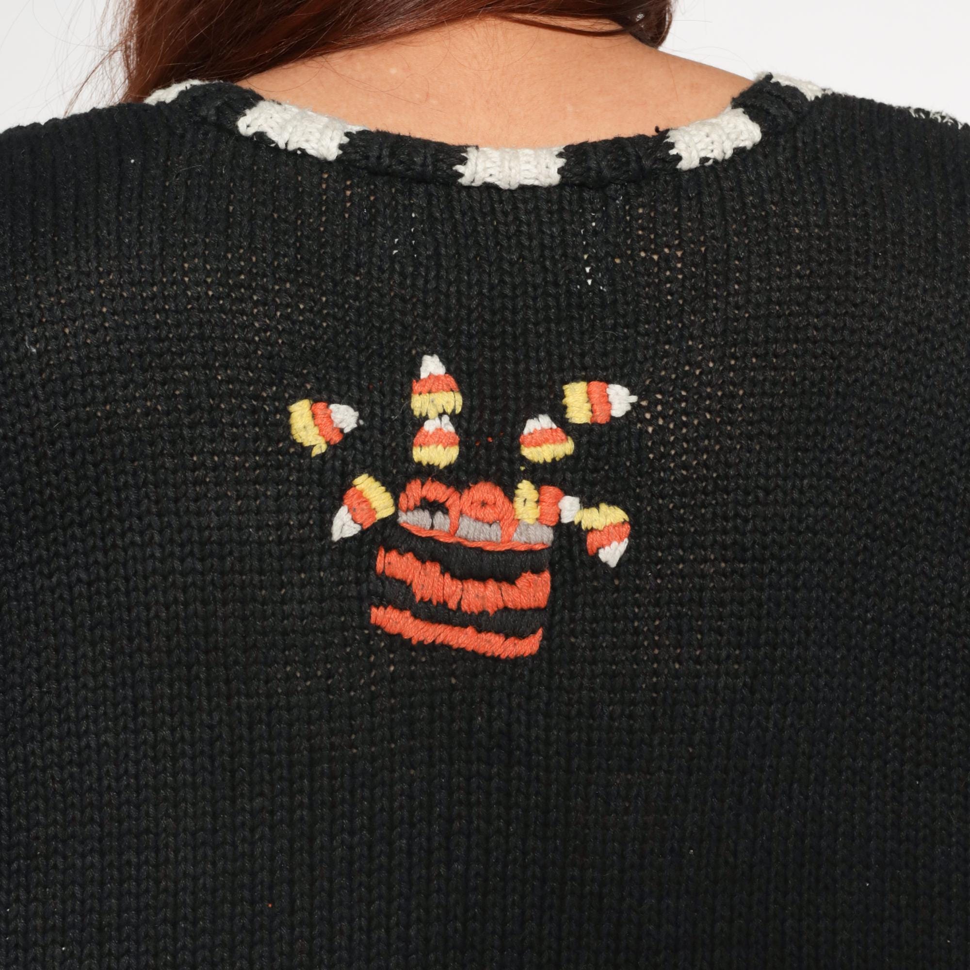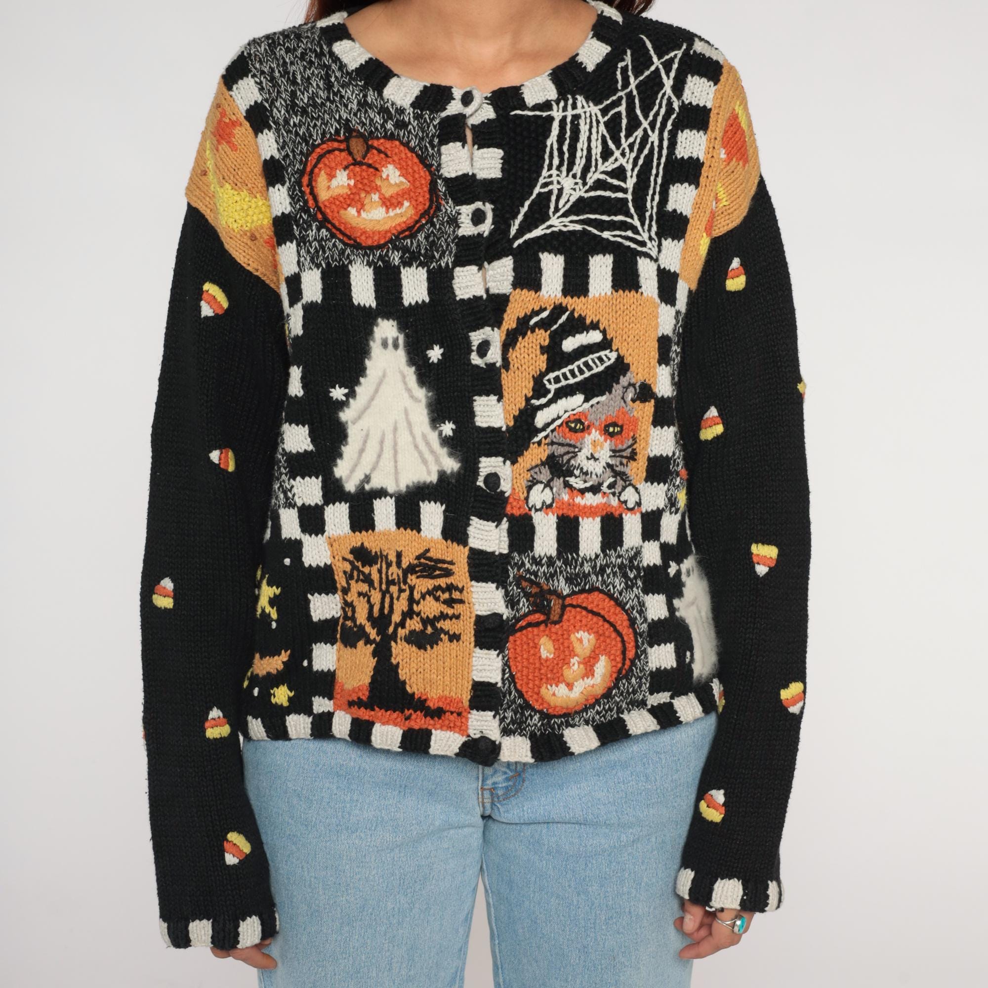 90s black Halloween sweater from Episcis featuring knitted Halloween motifs in orange and white. Front displays patchwork design with jack-o-lanterns, ghosts, spider webs, and candy corn scattered throughout. Black and white checkered trim details at neckline, cuffs, and hem.
