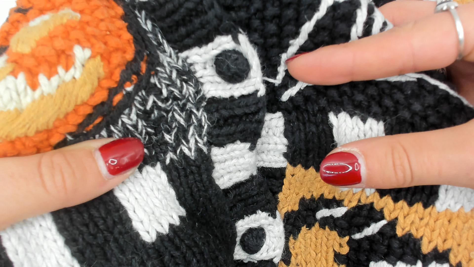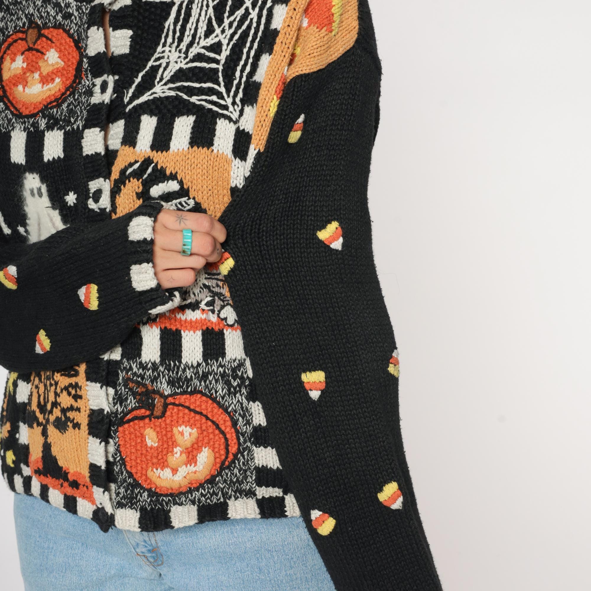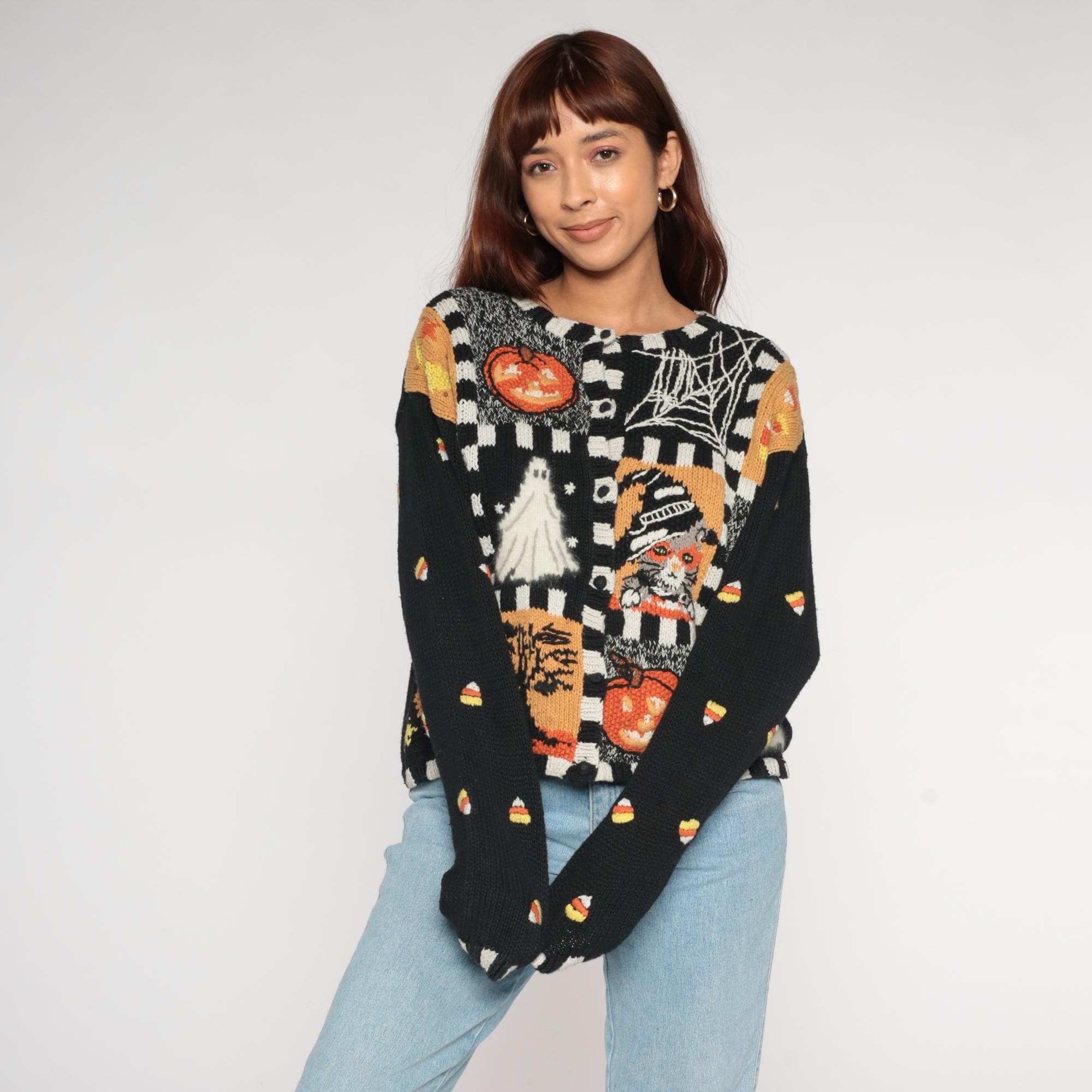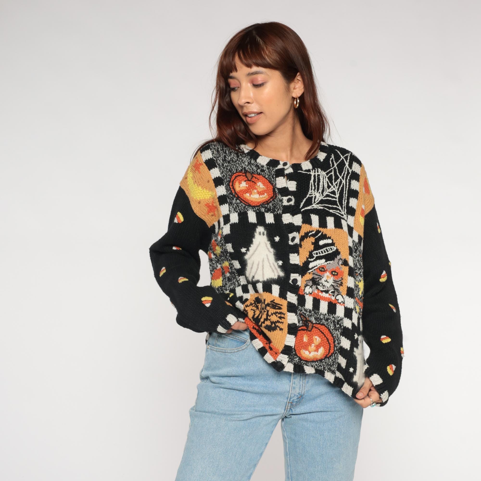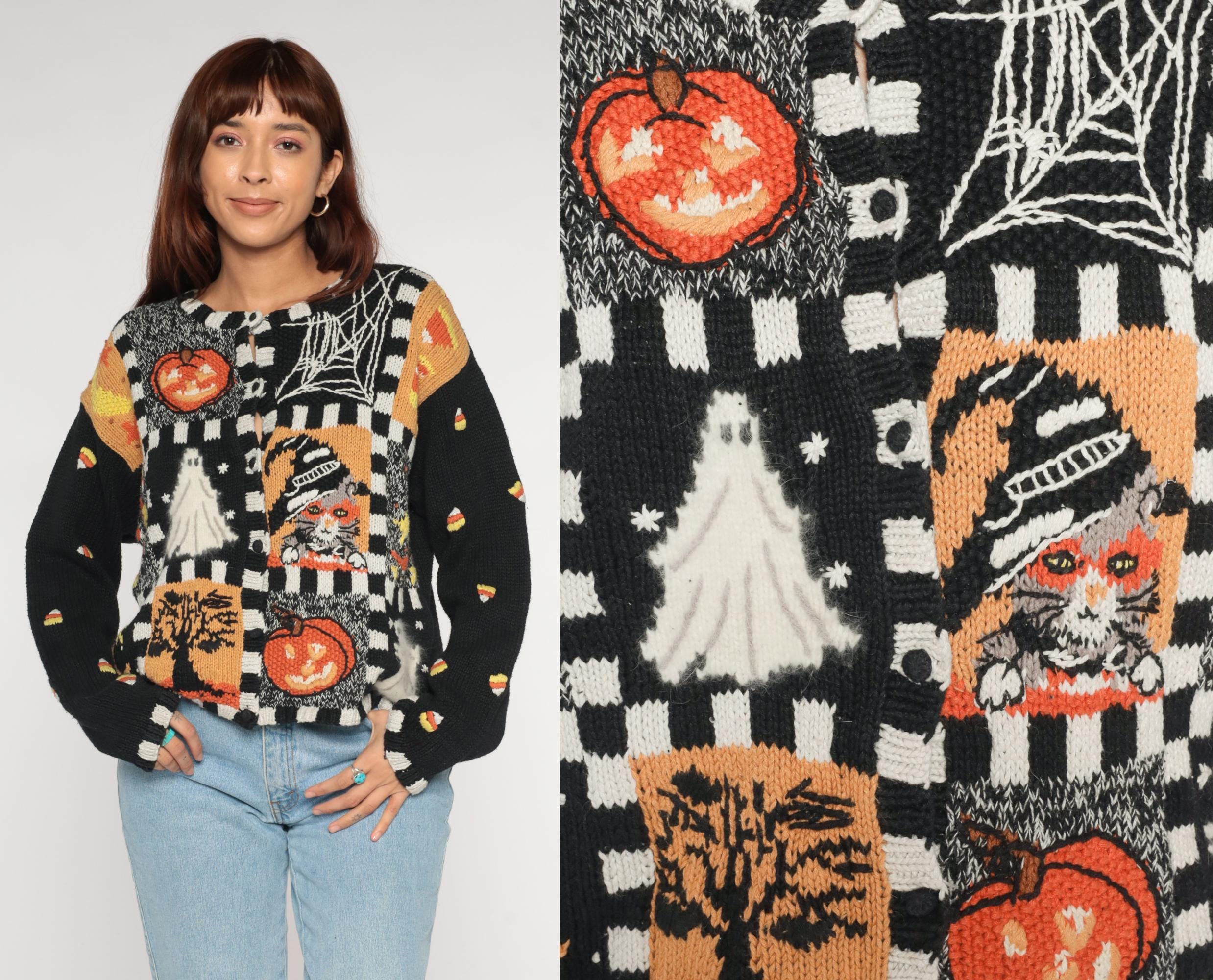 90s black Halloween sweater from Episcis featuring knitted Halloween motifs in orange and white. Front displays patchwork design with jack-o-lanterns, ghosts, spider webs, and candy corn scattered throughout. Black and white checkered trim details at neckline, cuffs, and hem.