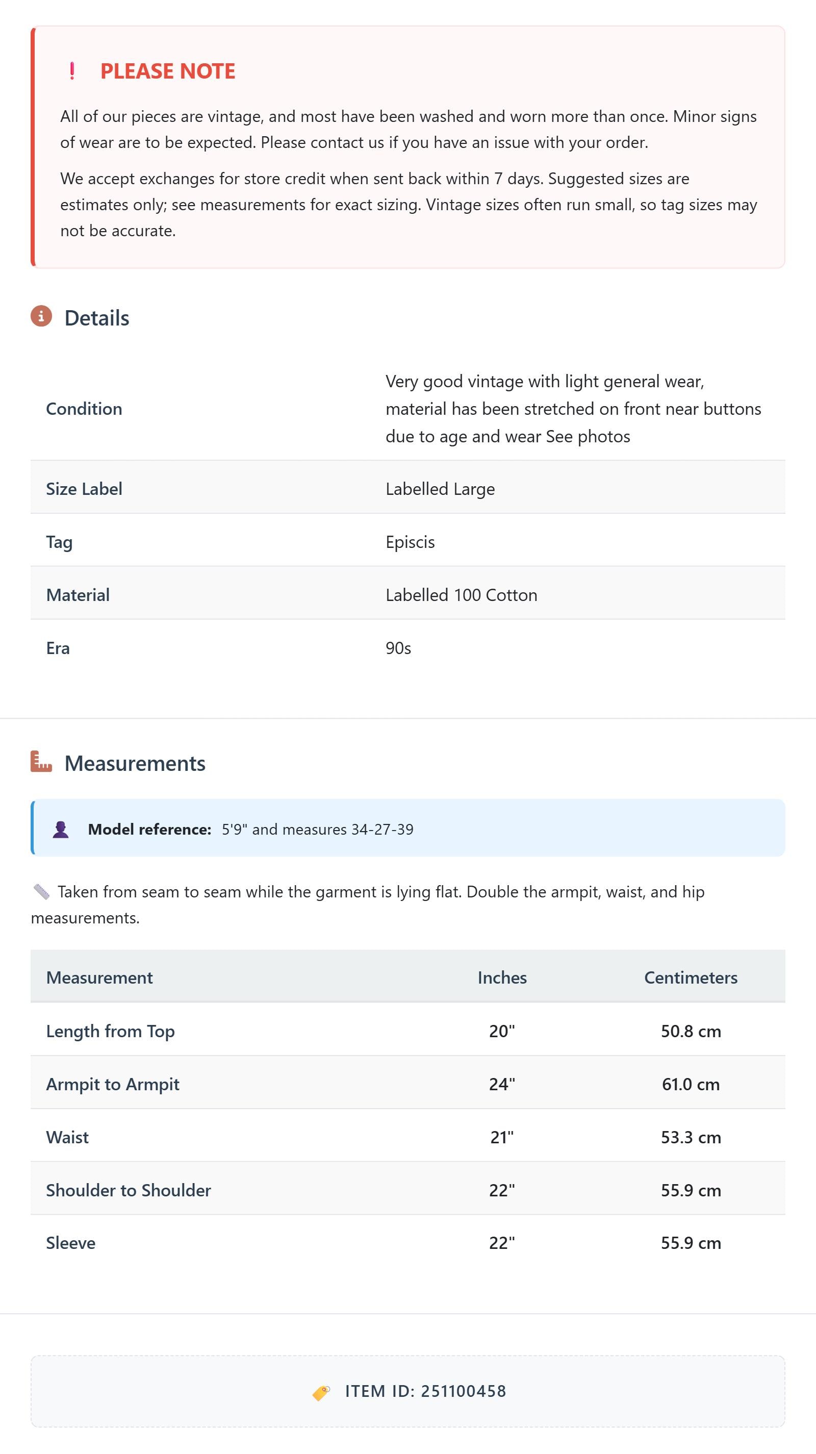 All of our pieces are vintage, and most have been washed and worn more than once. Minor signs of wear are to be expected. Please contact us if you have an issue with your order. We accept exchanges for store credit when sent back within 7 days.