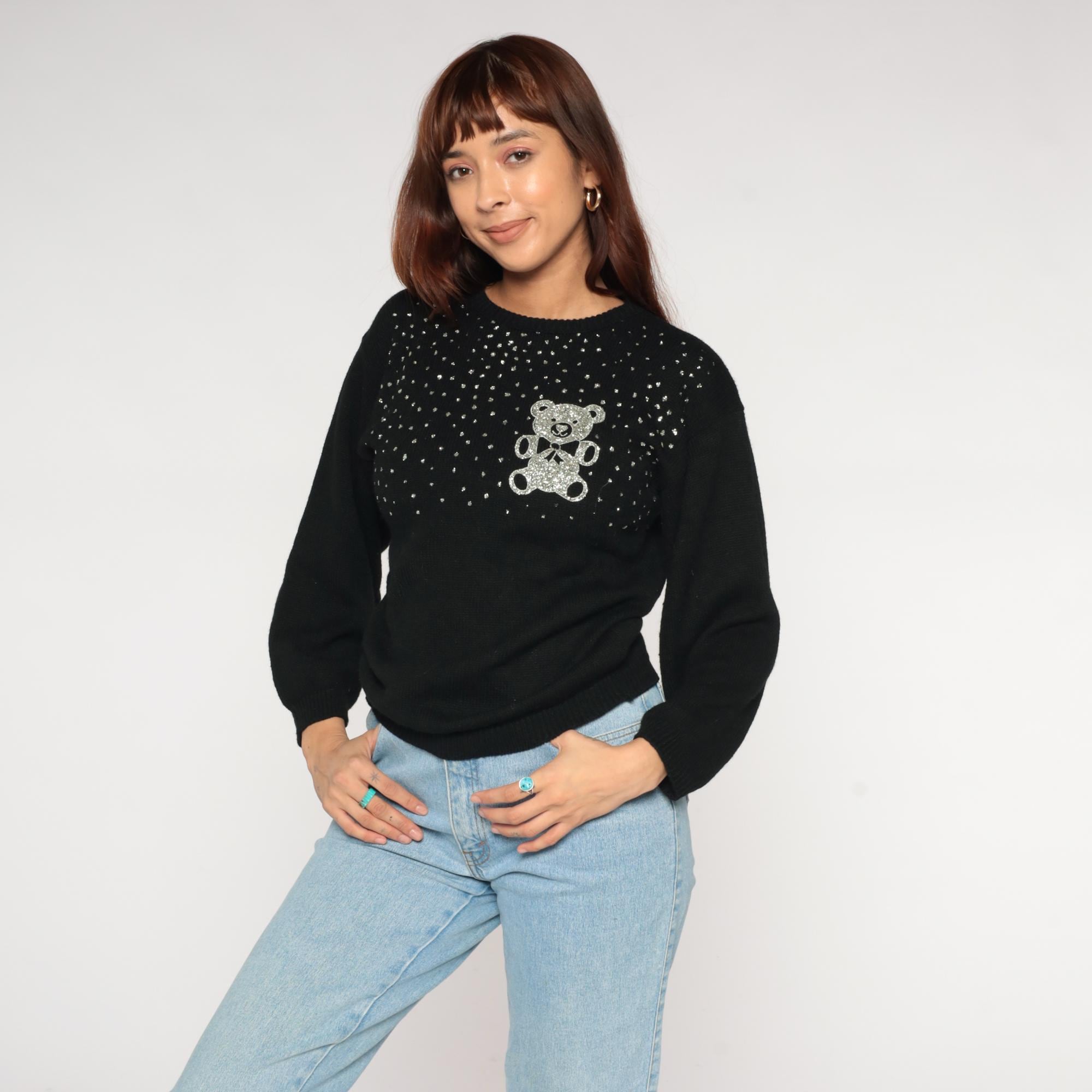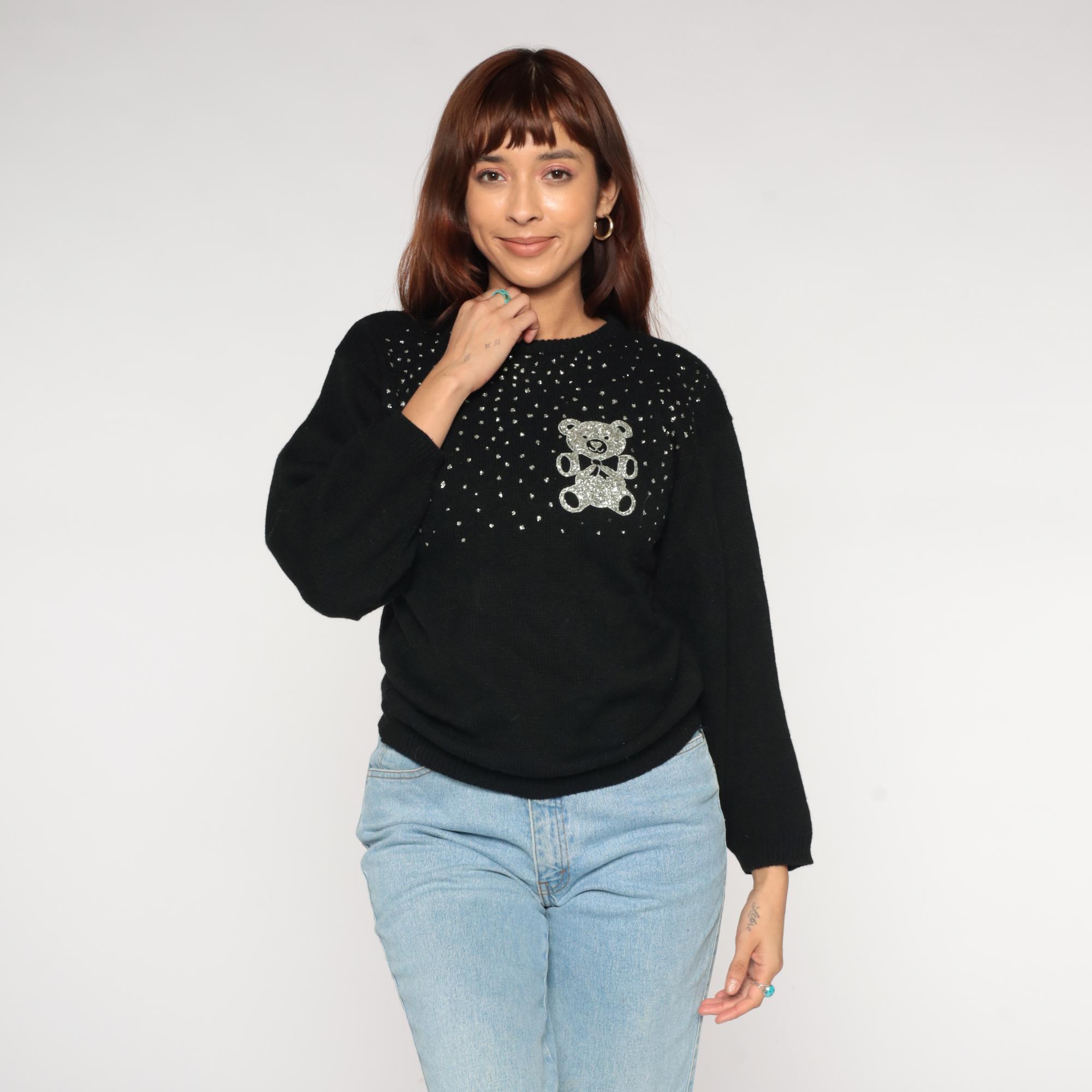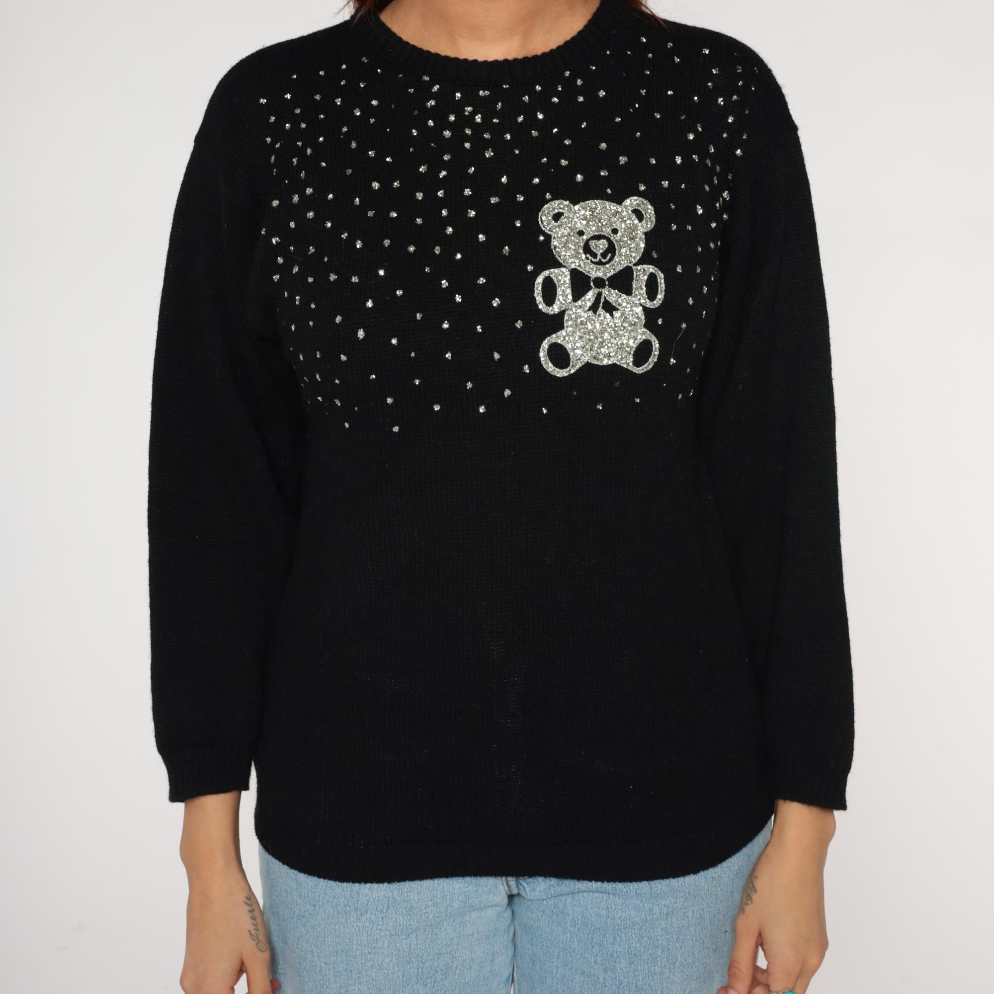 90s black sweater from Western Sportswear featuring large silver sequin teddy bear applique on front. Silver star sequins scattered throughout creating a sparkly night sky effect.