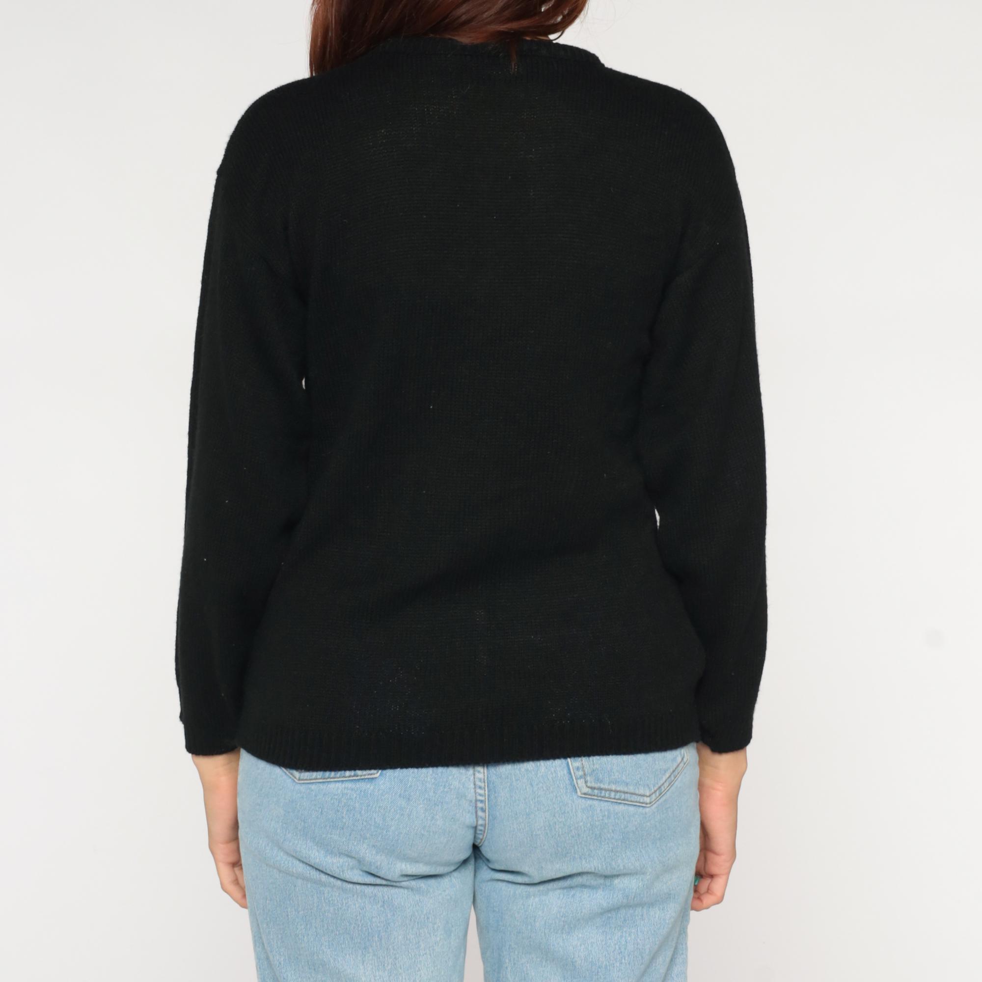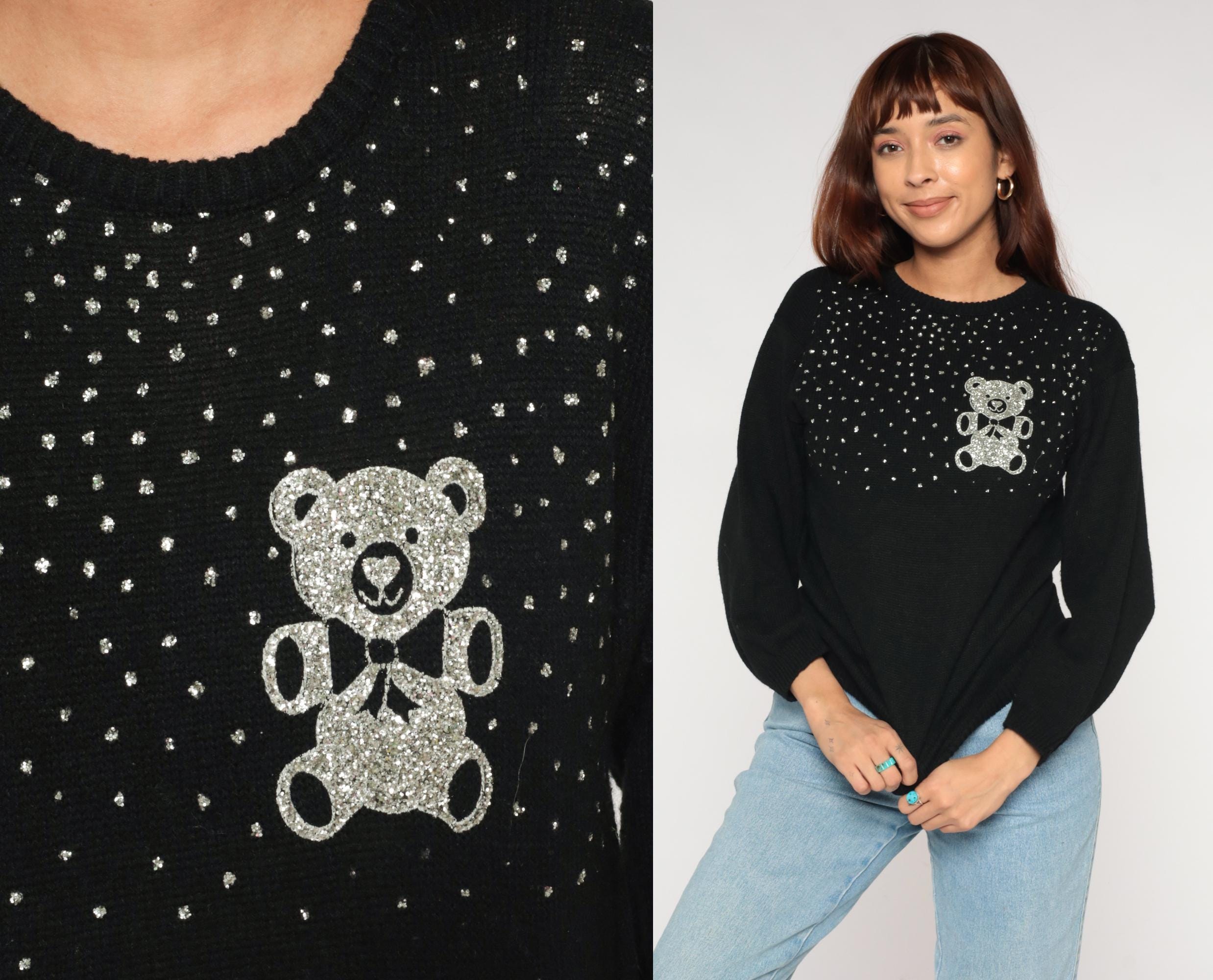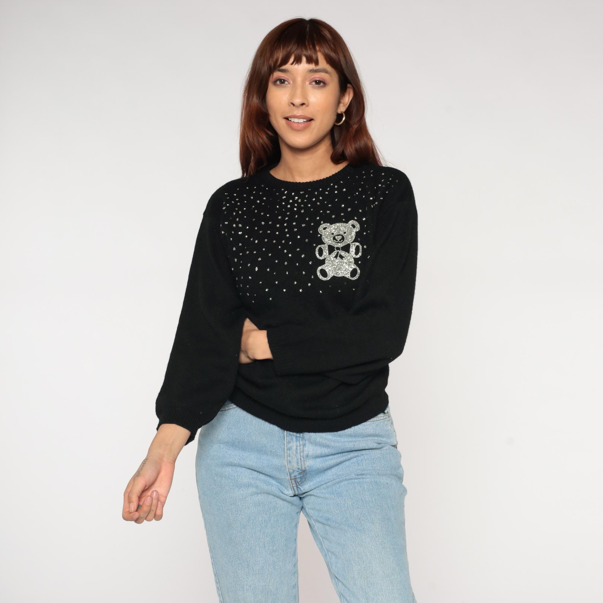 90s black sweater from Western Sportswear featuring large silver sequin teddy bear applique on front. Silver star sequins scattered throughout creating a sparkly night sky effect.