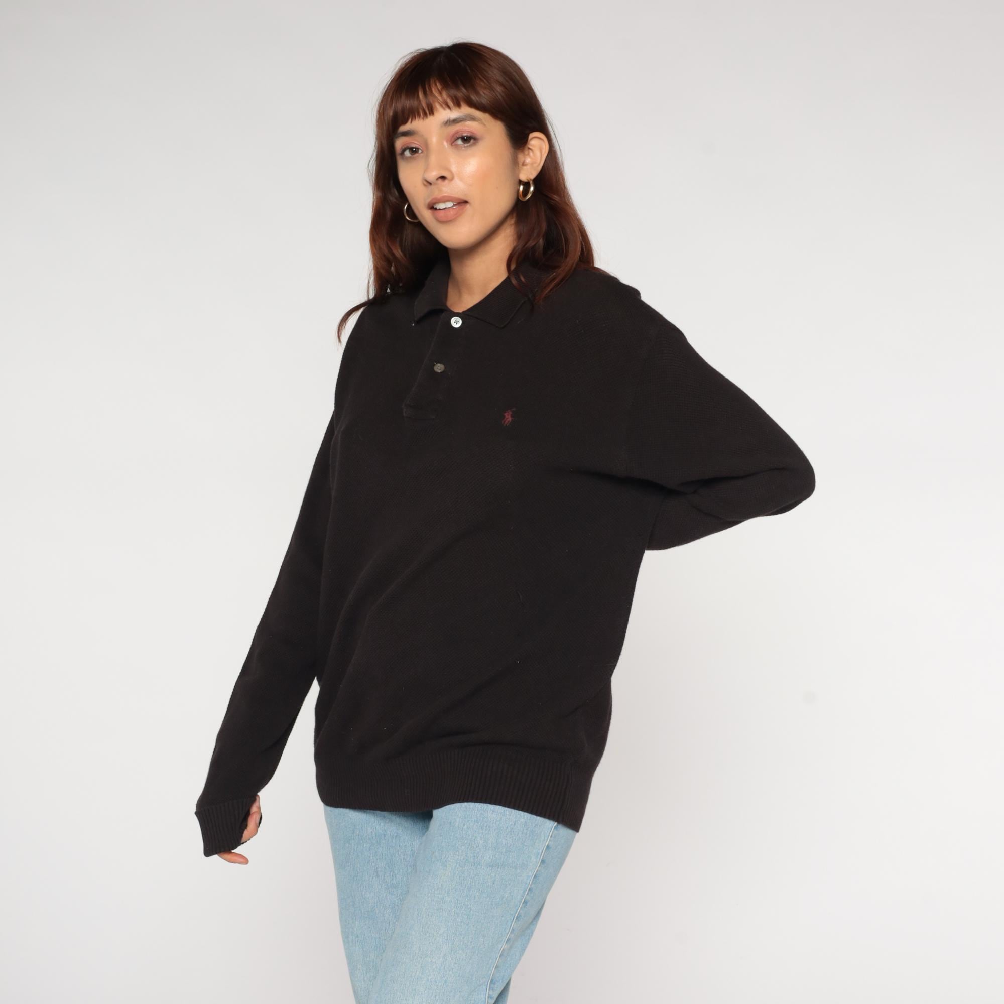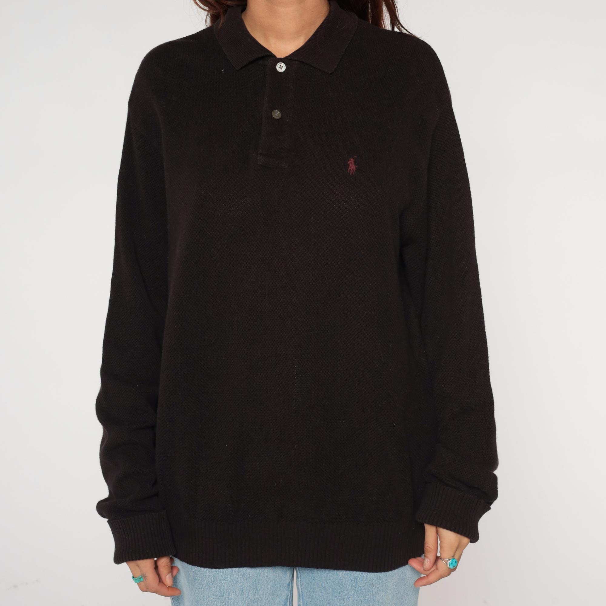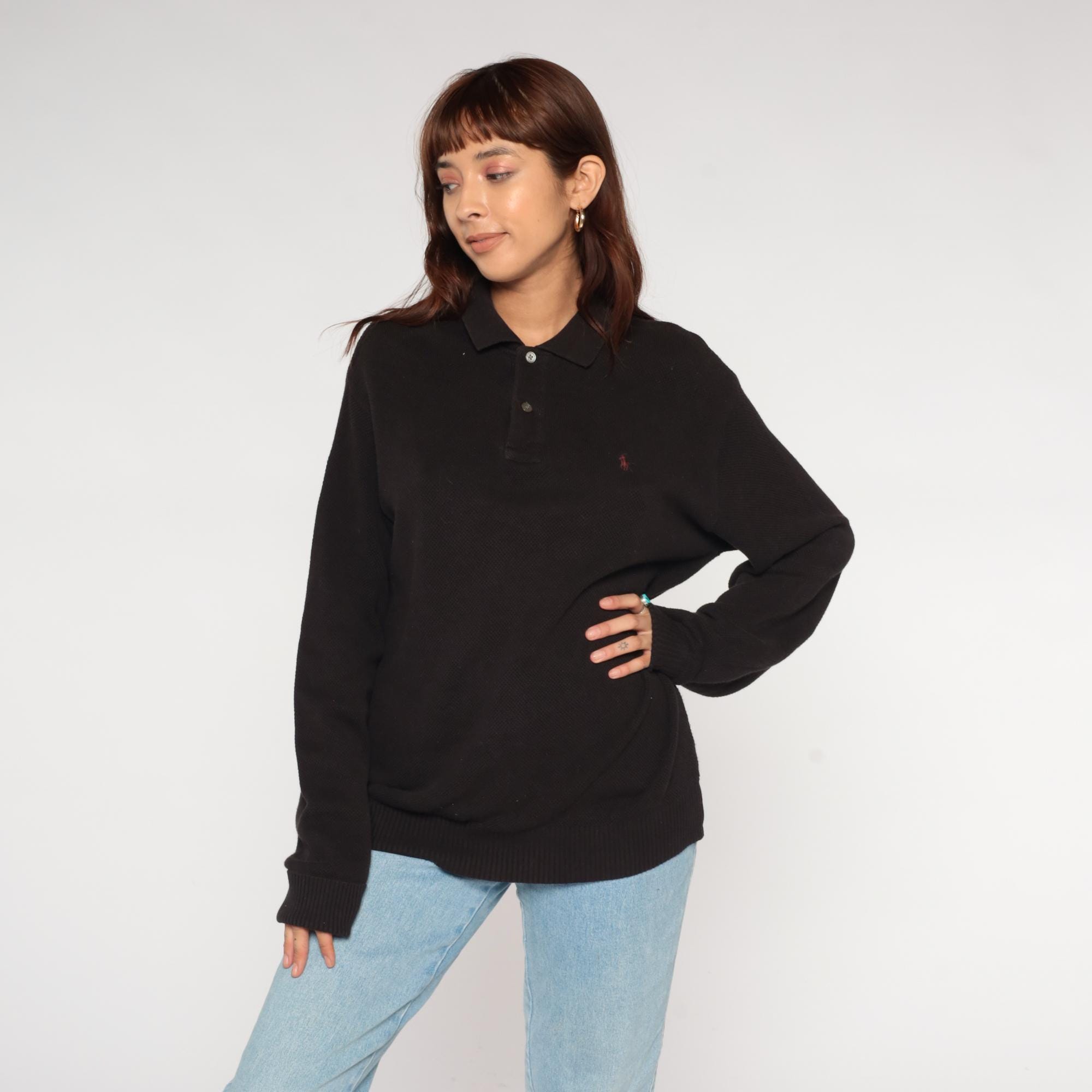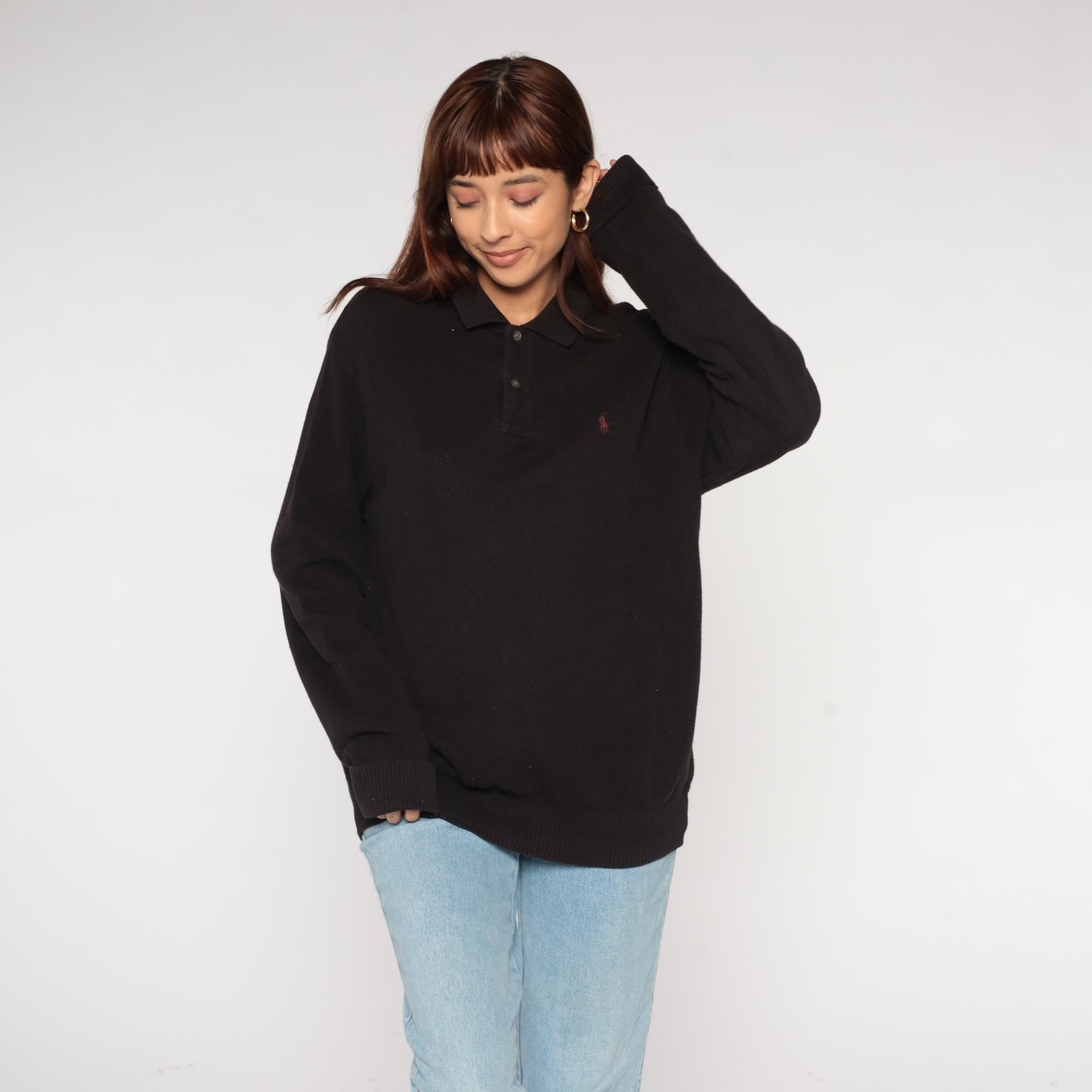 90s black sweater from Polo by Ralph Lauren featuring classic crew neckline with small red polo player logo. Long sleeves with ribbed cuffs and hemline. Relaxed oversized fit ideal for layering.