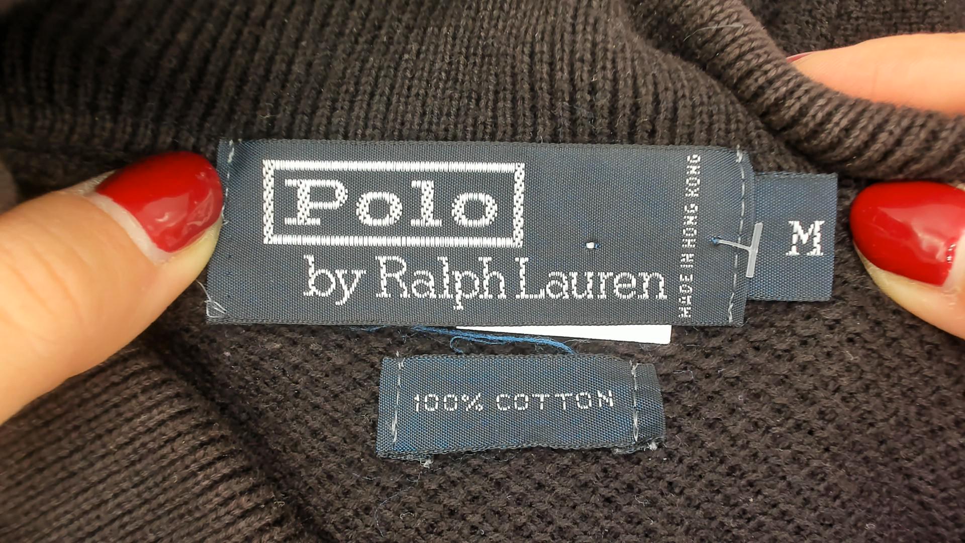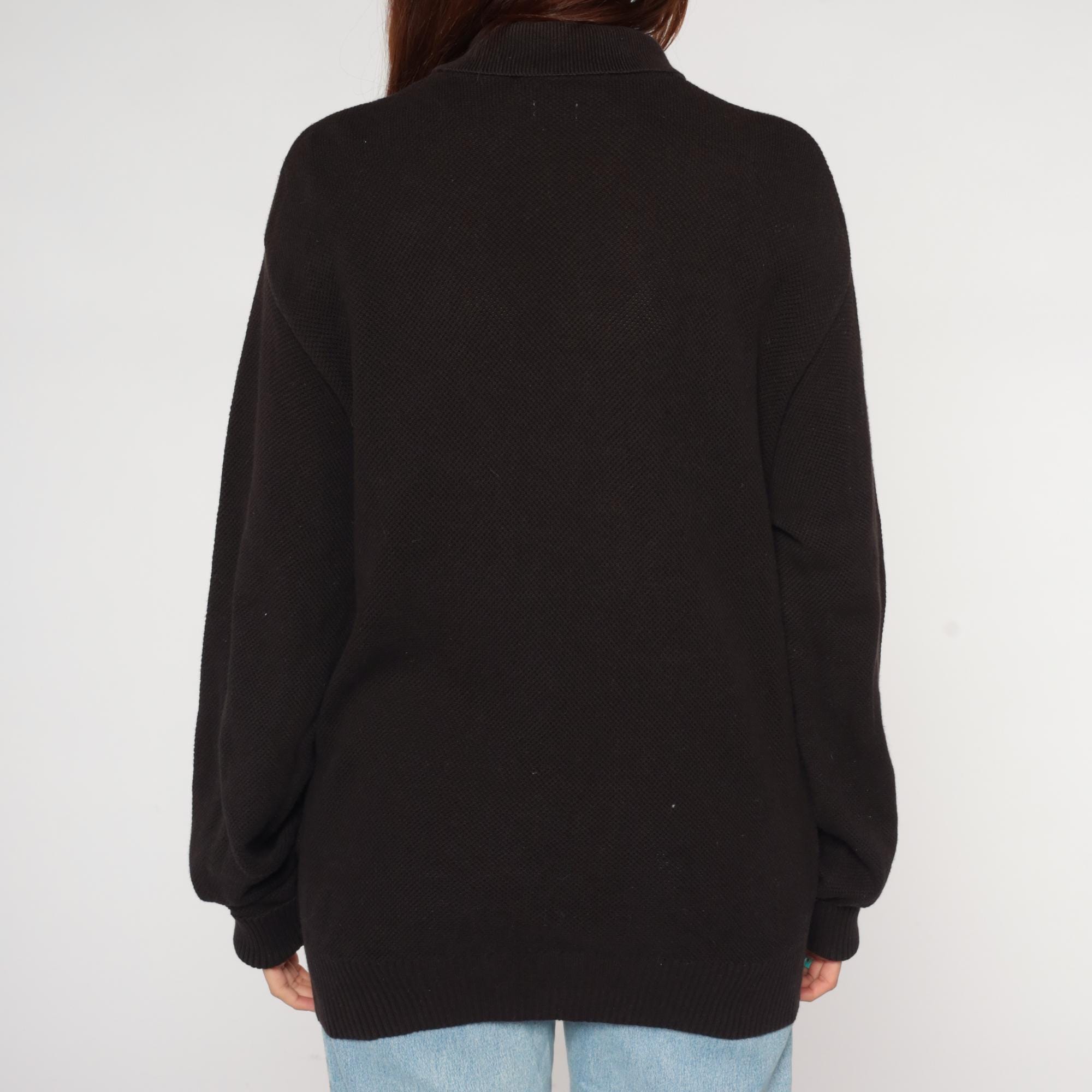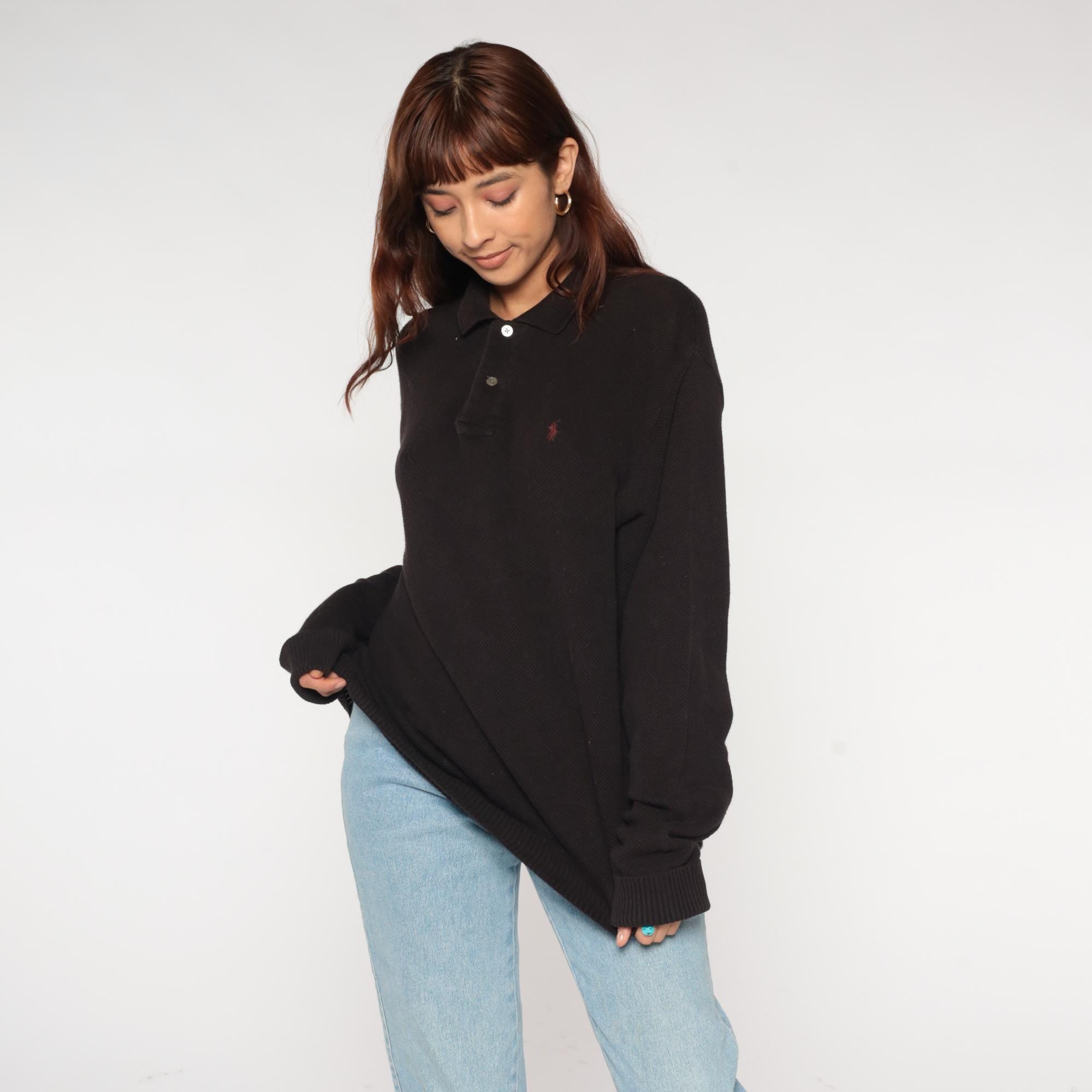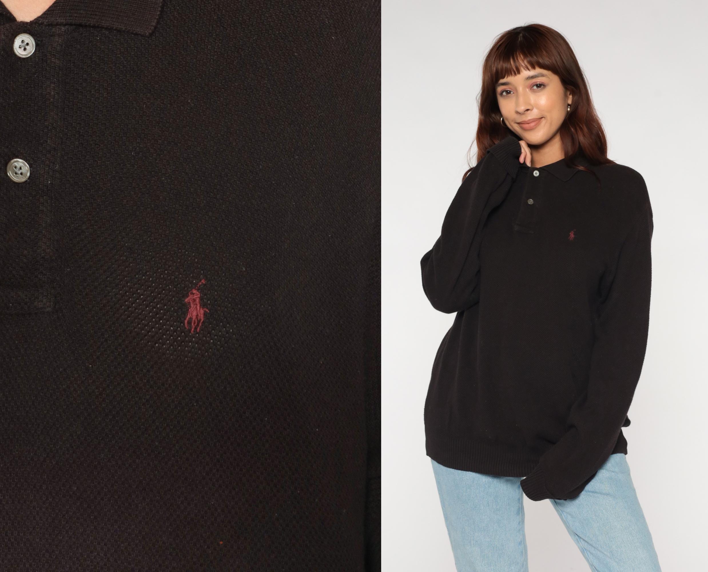 90s black sweater from Polo by Ralph Lauren featuring classic crew neckline with small red polo player logo. Long sleeves with ribbed cuffs and hemline. Relaxed oversized fit ideal for layering.