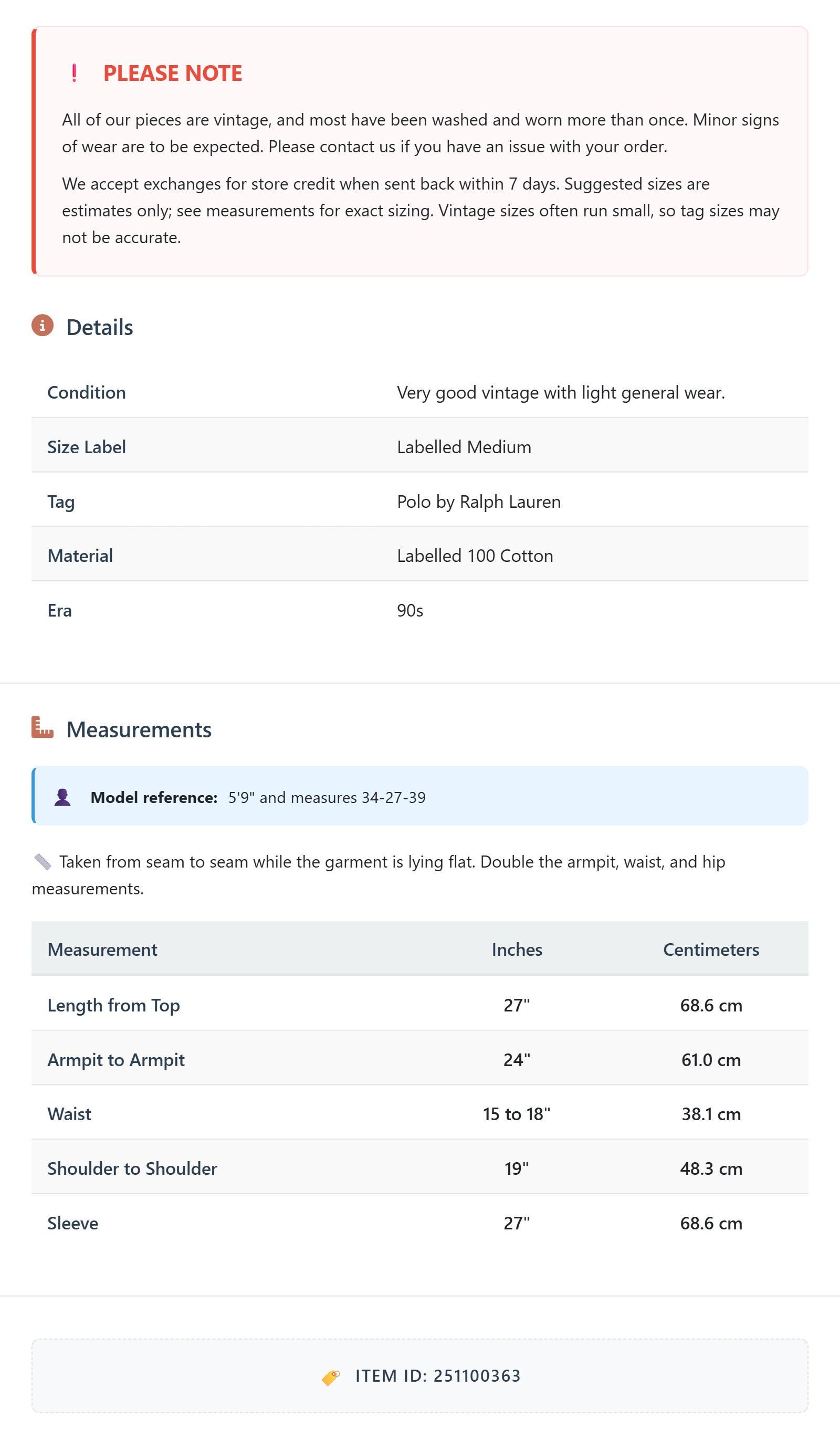 All of our pieces are vintage, and most have been washed and worn more than once. Minor signs of wear are to be expected. Please contact us if you have an issue with your order. We accept exchanges for store credit when sent back within 7 days.