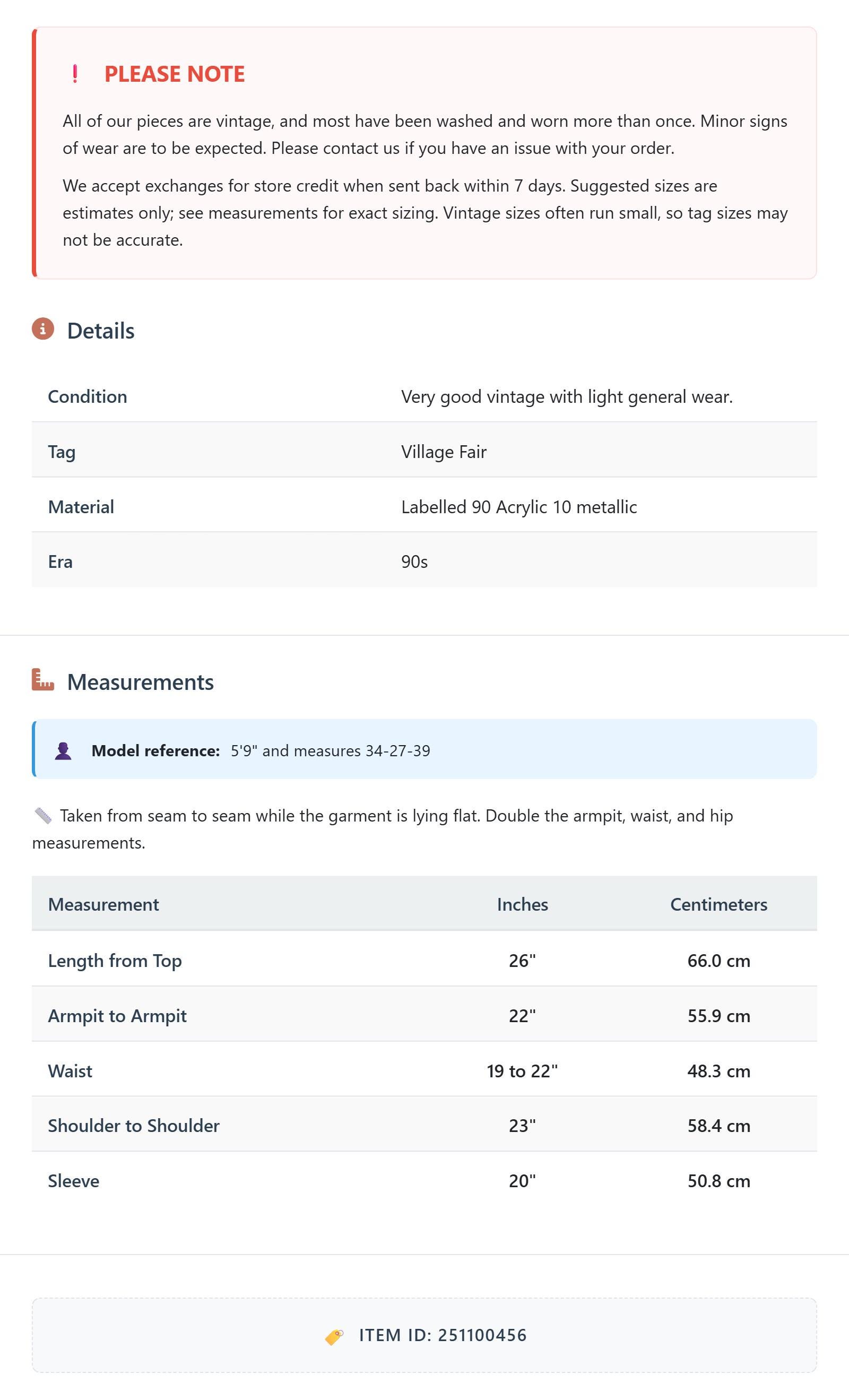 Suggested sizes are estimates only; see measurements for exact sizing. Vintage sizes often run small, so tag sizes may not be accurate.