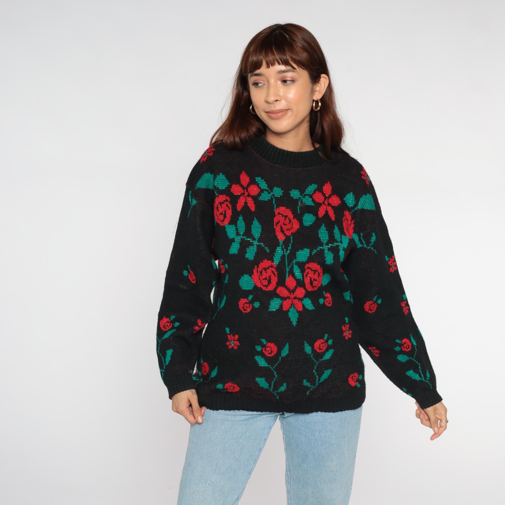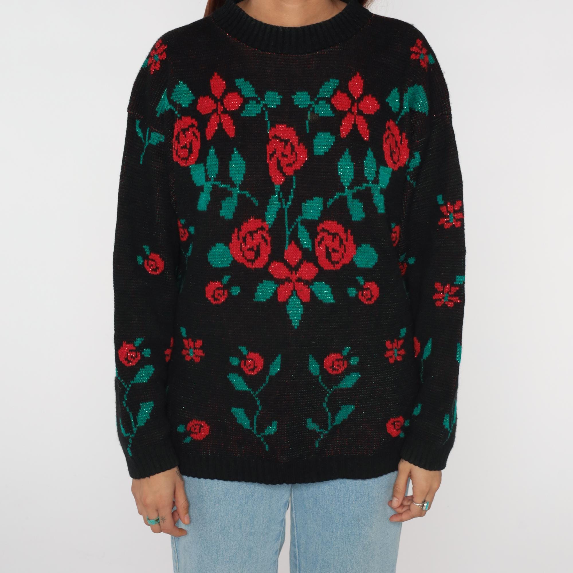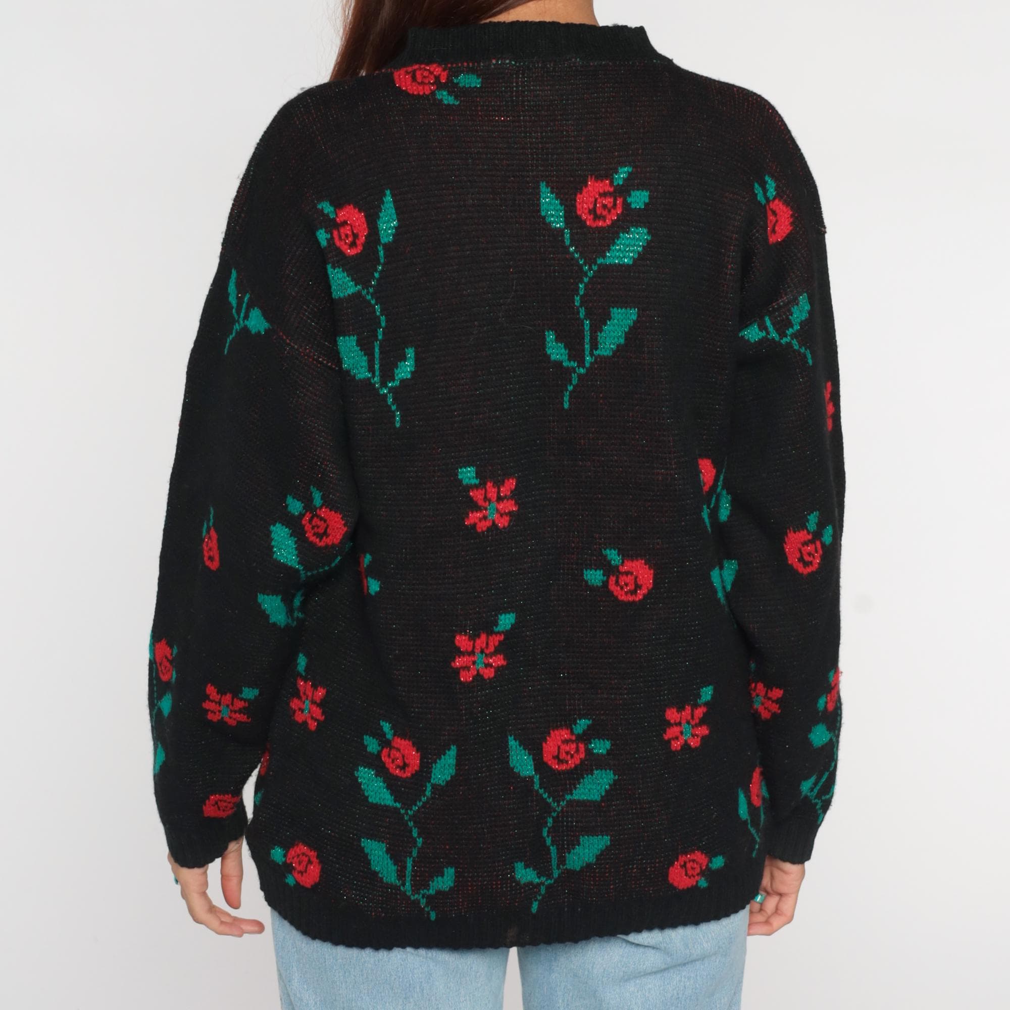 90s black sweater from Village Fair featuring intricate knitted red rose and green leaf pattern throughout. Central medallion design with roses and geometric florals radiating outward. Scattered smaller rose motifs across body and sleeves.