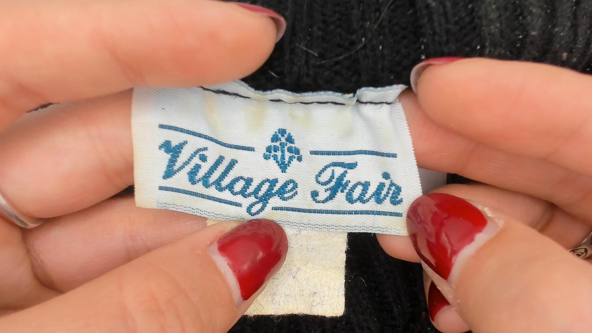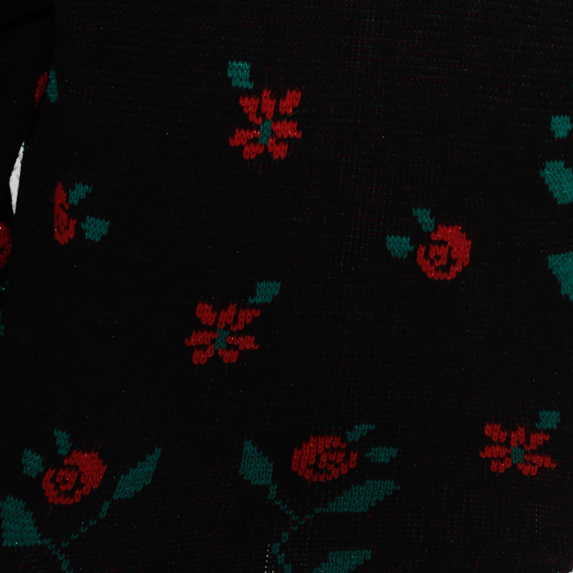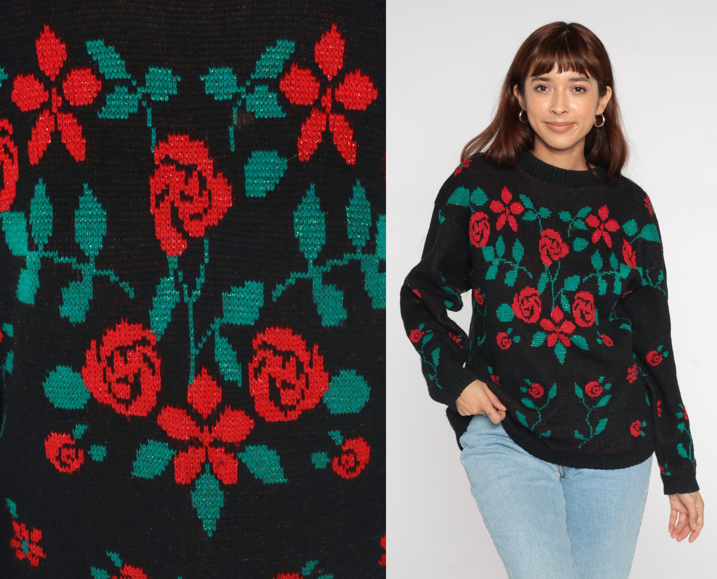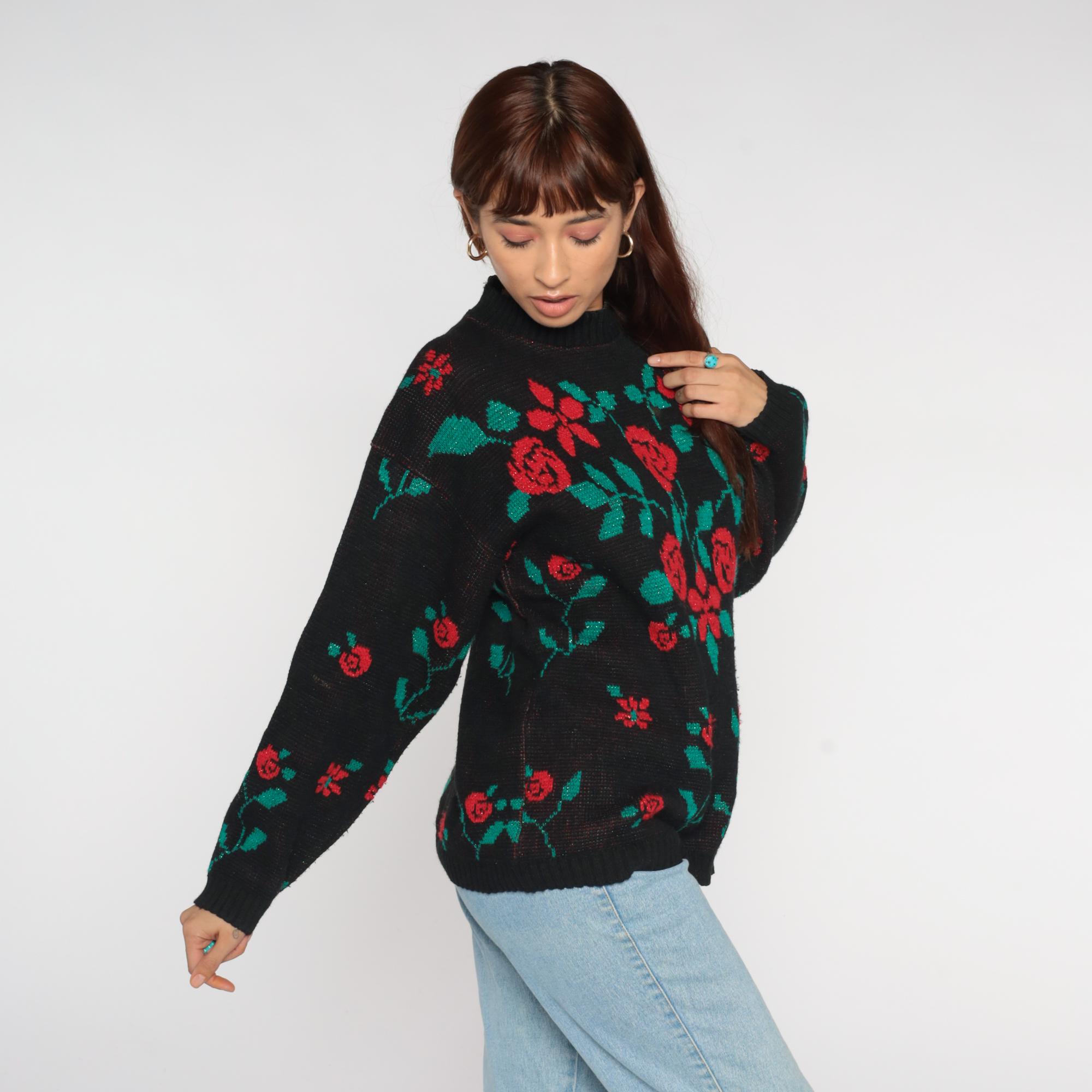 90s black sweater from Village Fair featuring intricate knitted red rose and green leaf pattern throughout. Central medallion design with roses and geometric florals radiating outward. Scattered smaller rose motifs across body and sleeves.