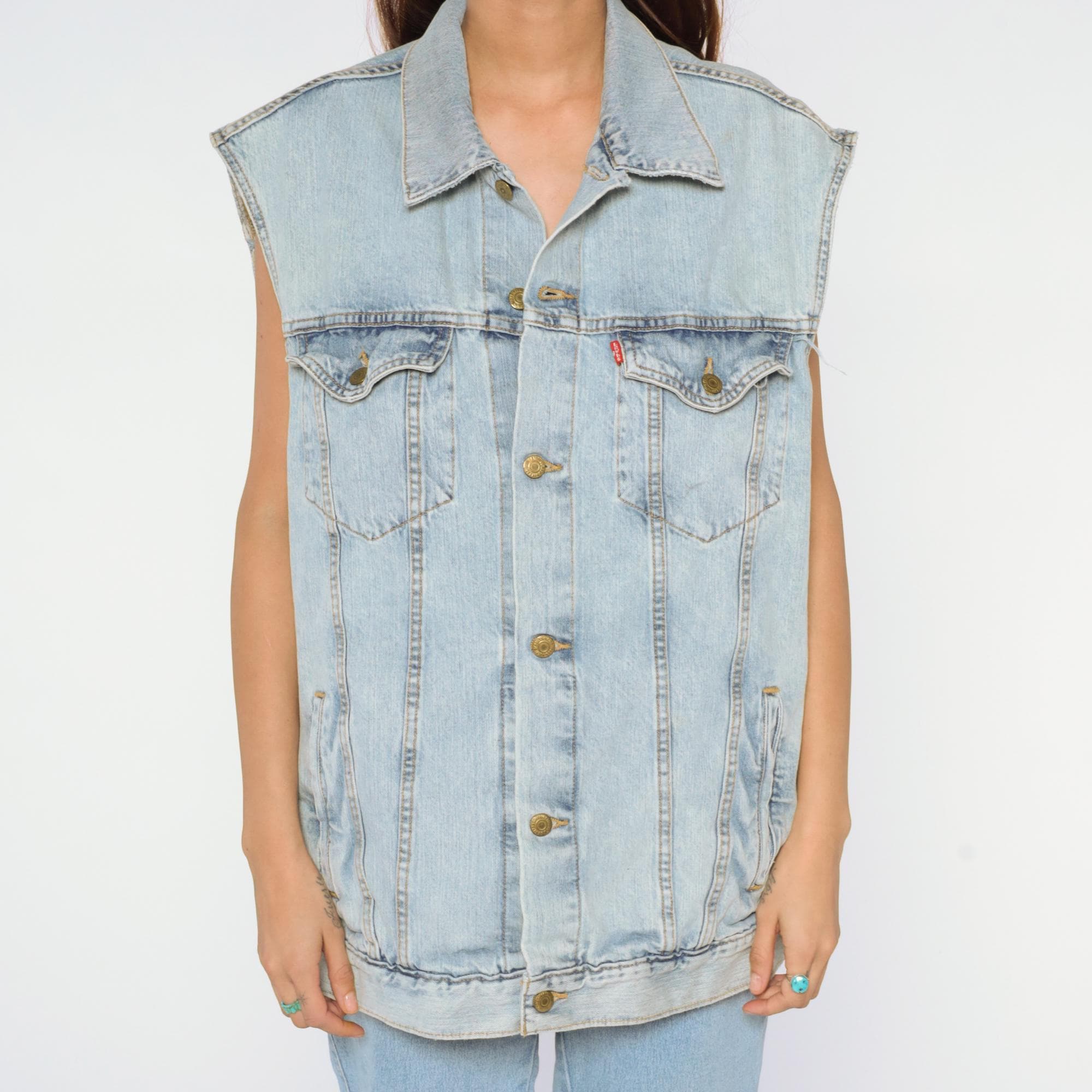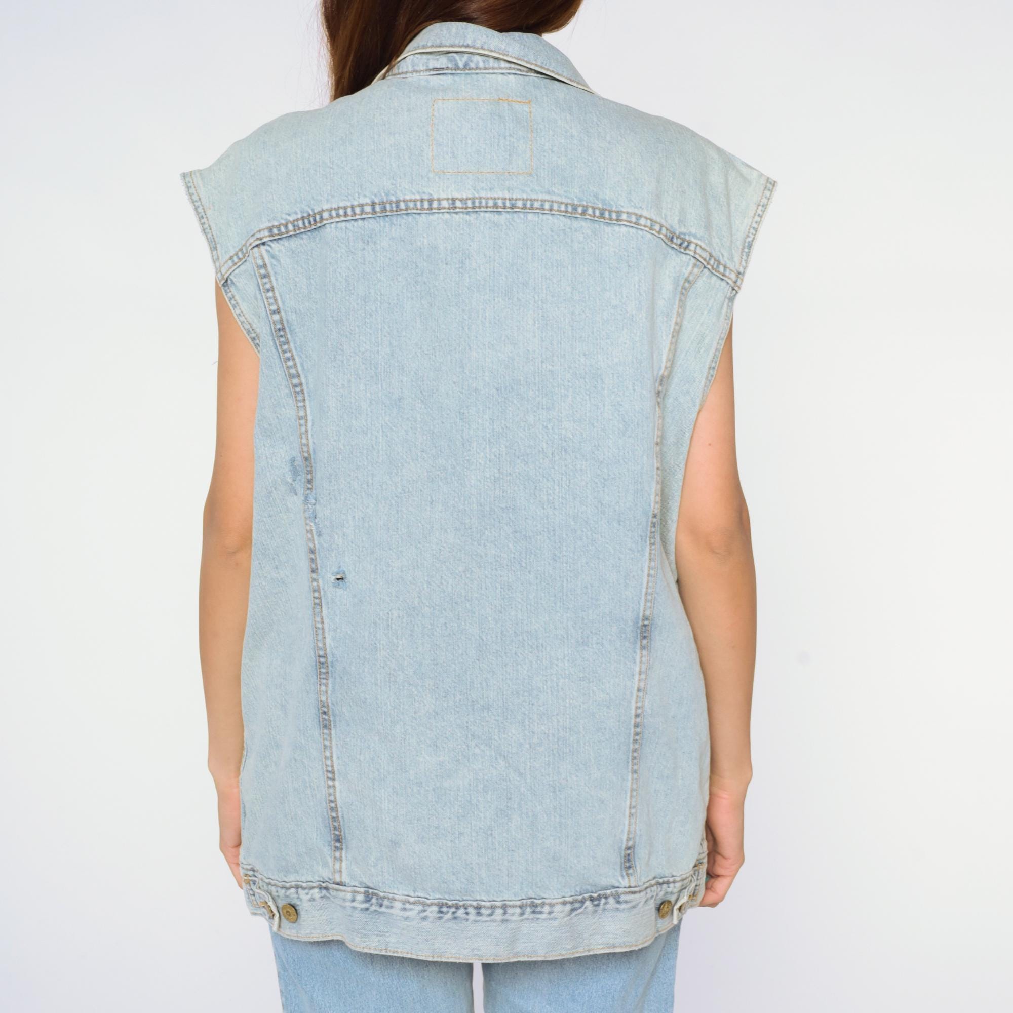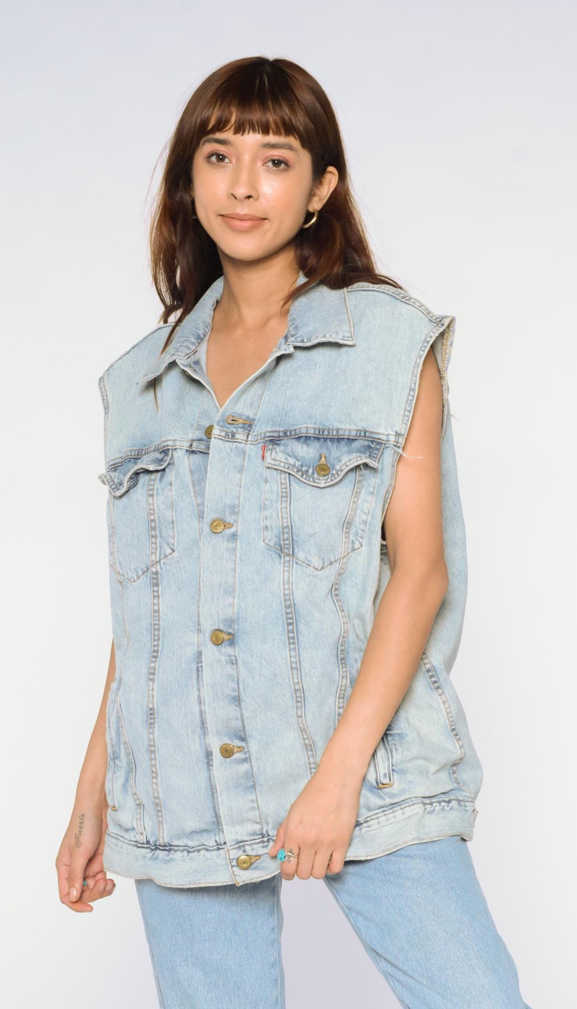 Y2K light blue denim vest from Levi Strauss & Co featuring classic sleeveless design with button front closure. Two chest pockets with button flaps and side entry pockets.