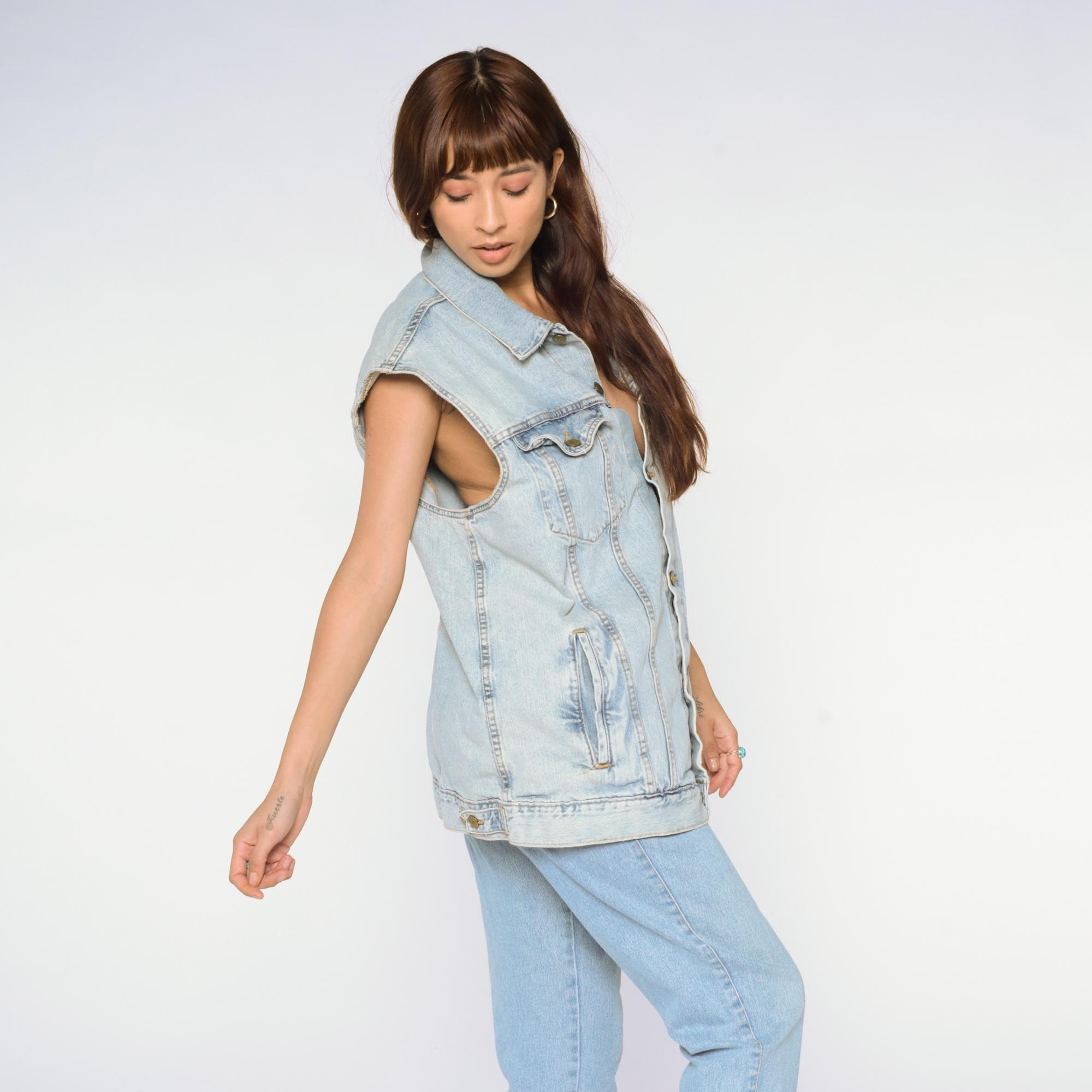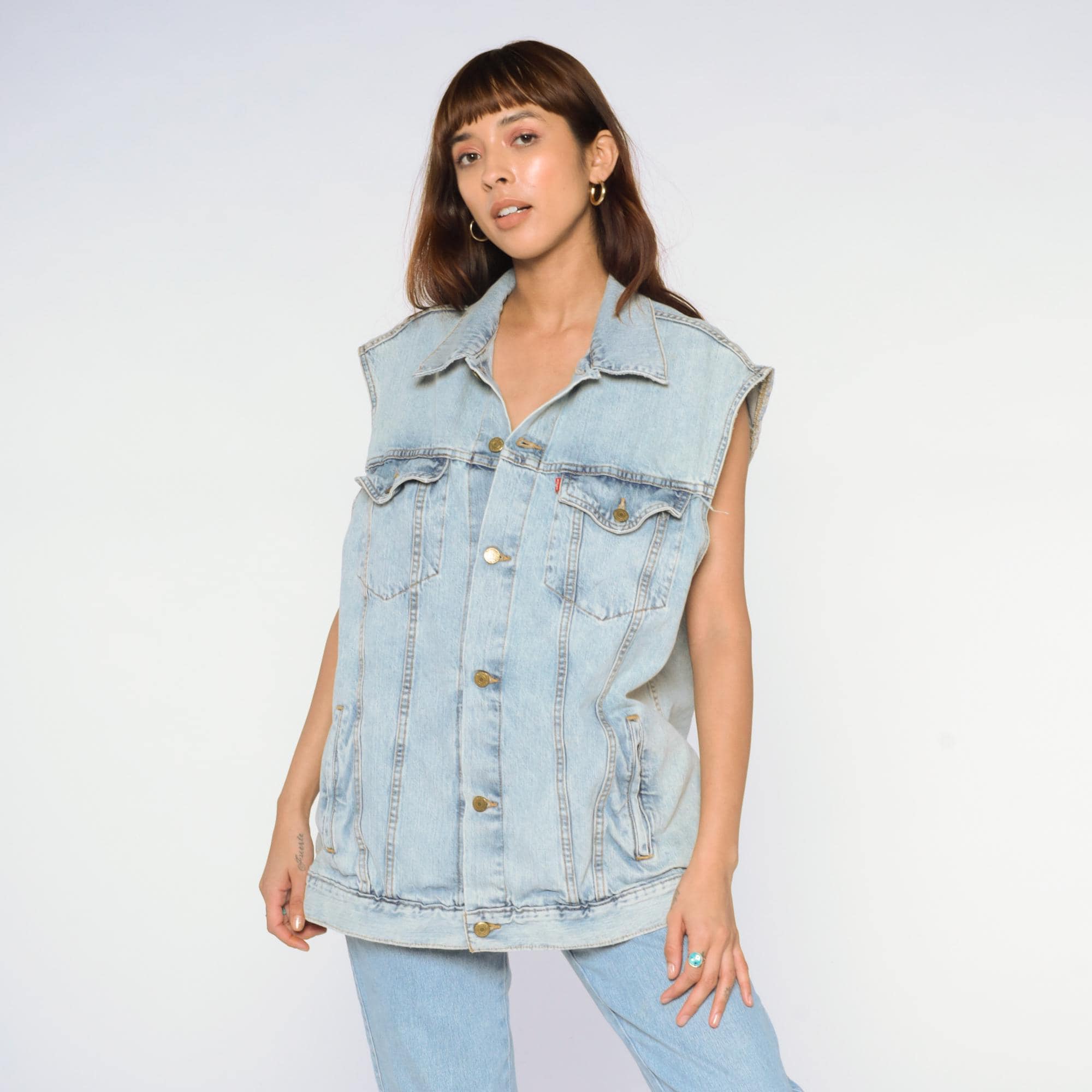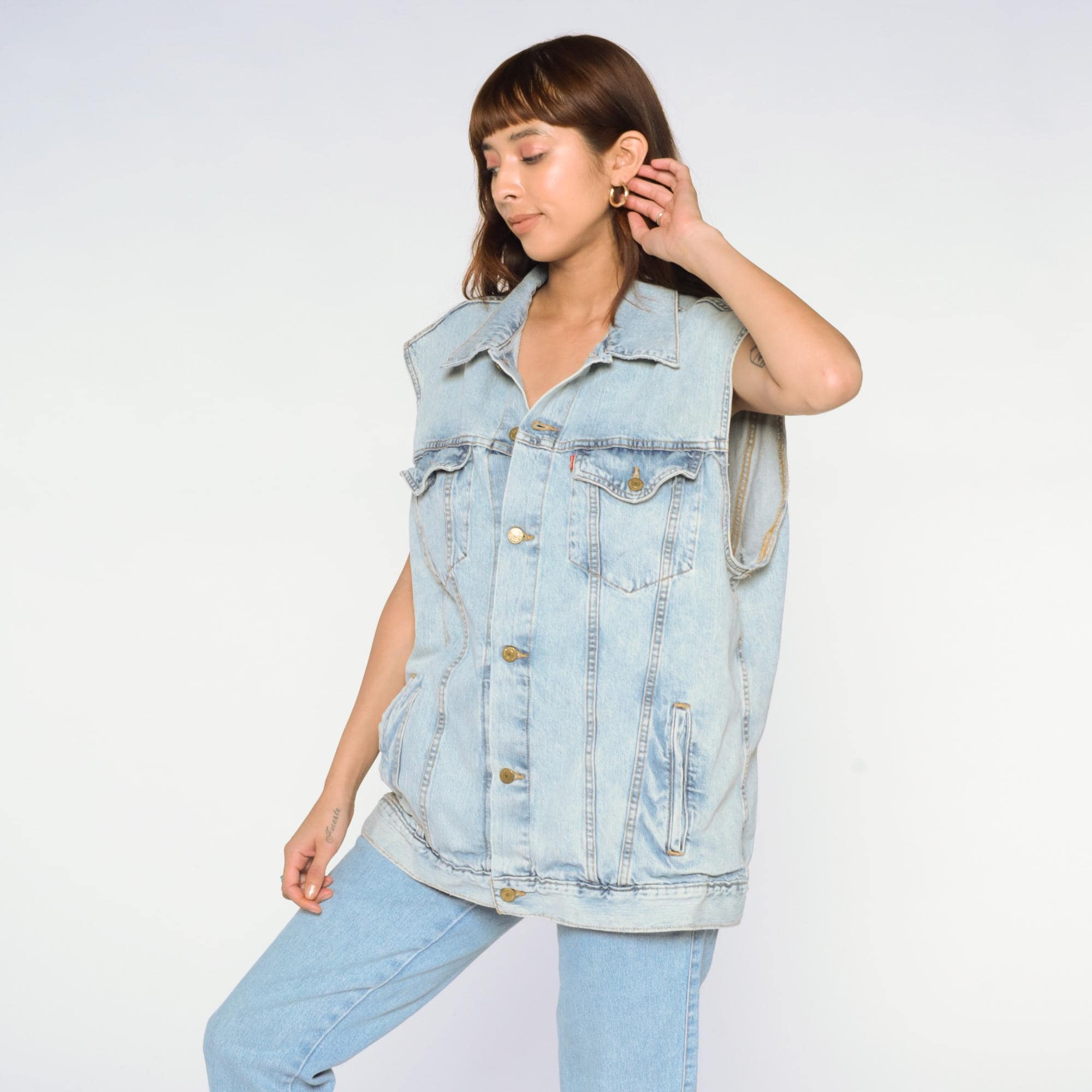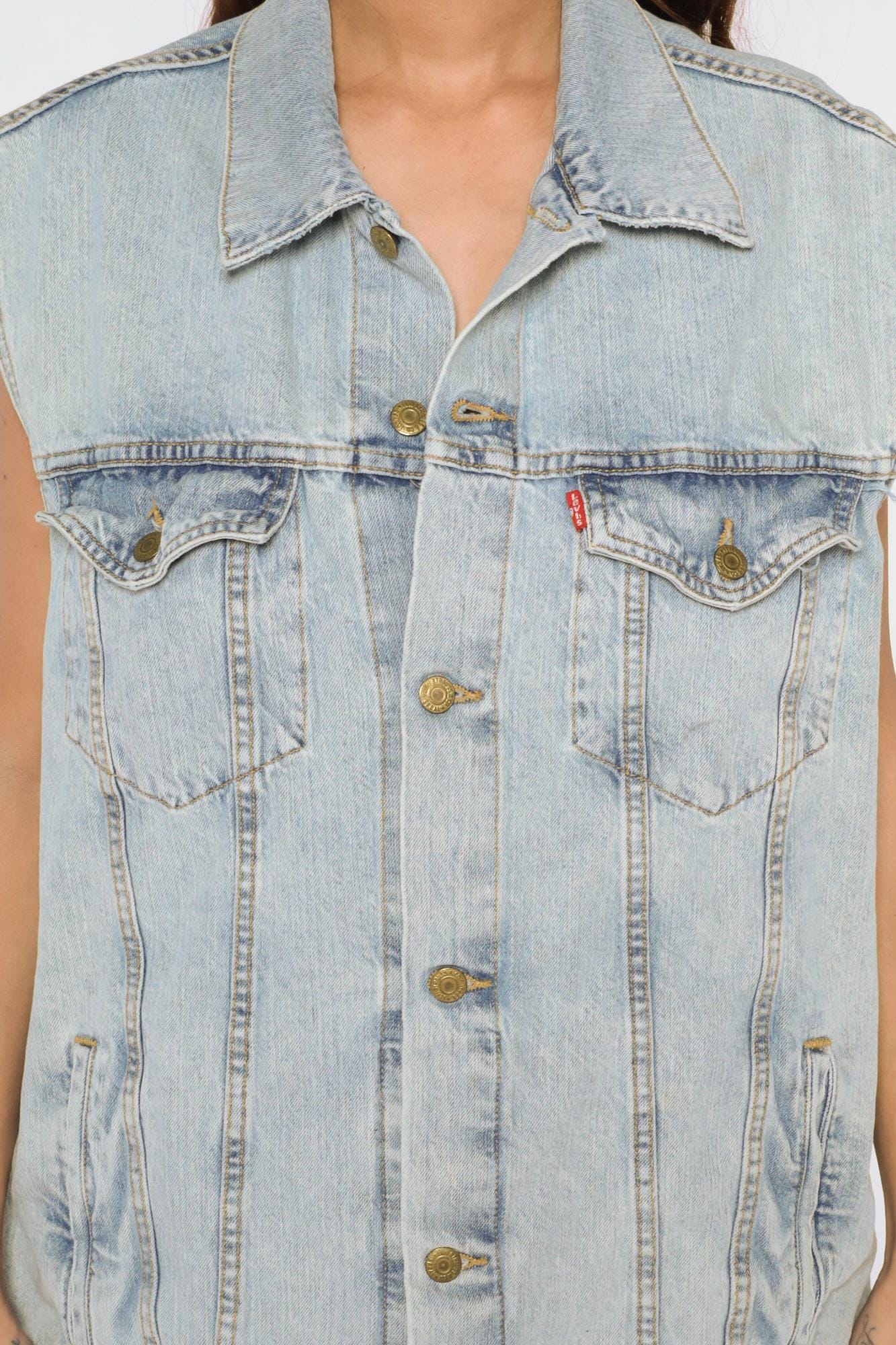 Y2K light blue denim vest from Levi Strauss & Co featuring classic sleeveless design with button front closure. Two chest pockets with button flaps and side entry pockets.
