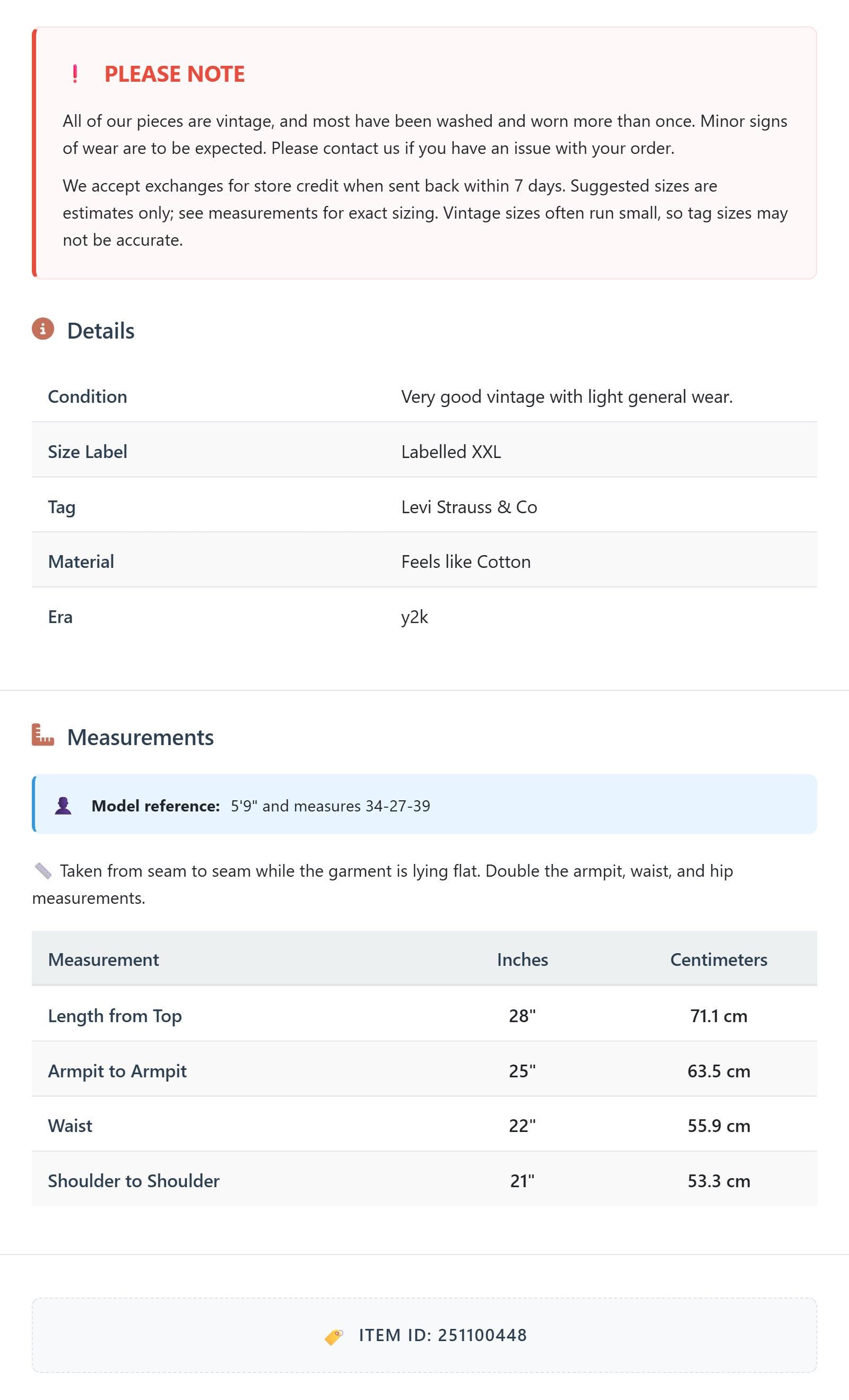 All of our pieces are vintage, and most have been washed and worn more than once. Minor signs of wear are to be expected. Please contact us if you have an issue with your order. We accept exchanges for store credit when sent back within 7 days.