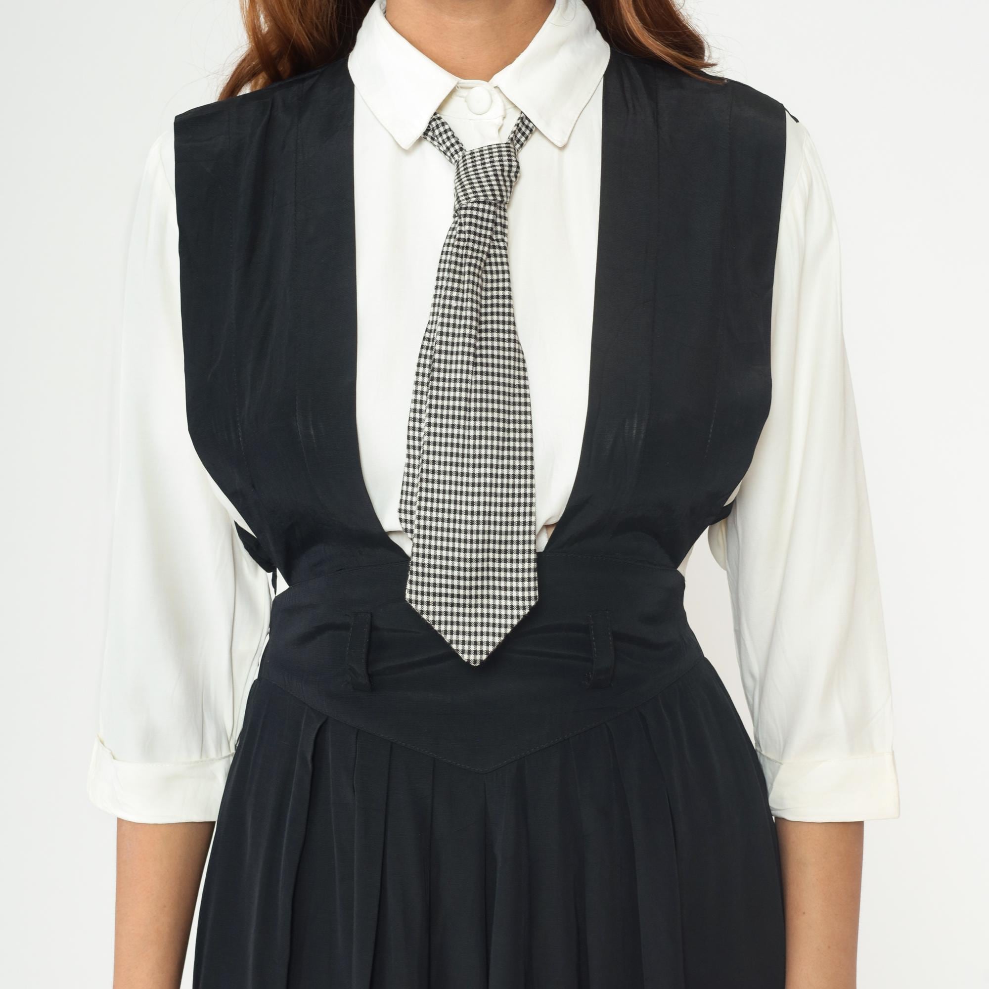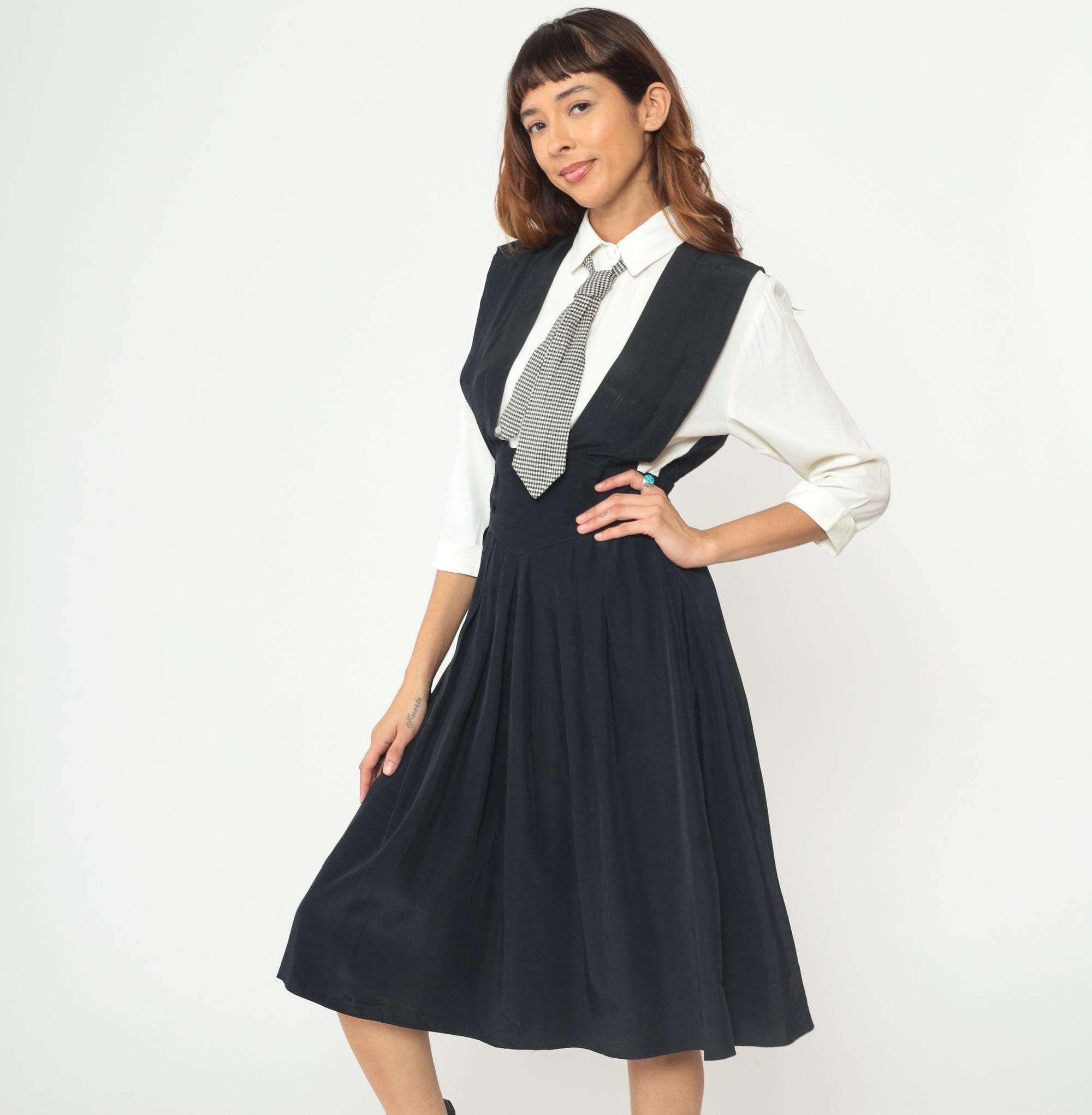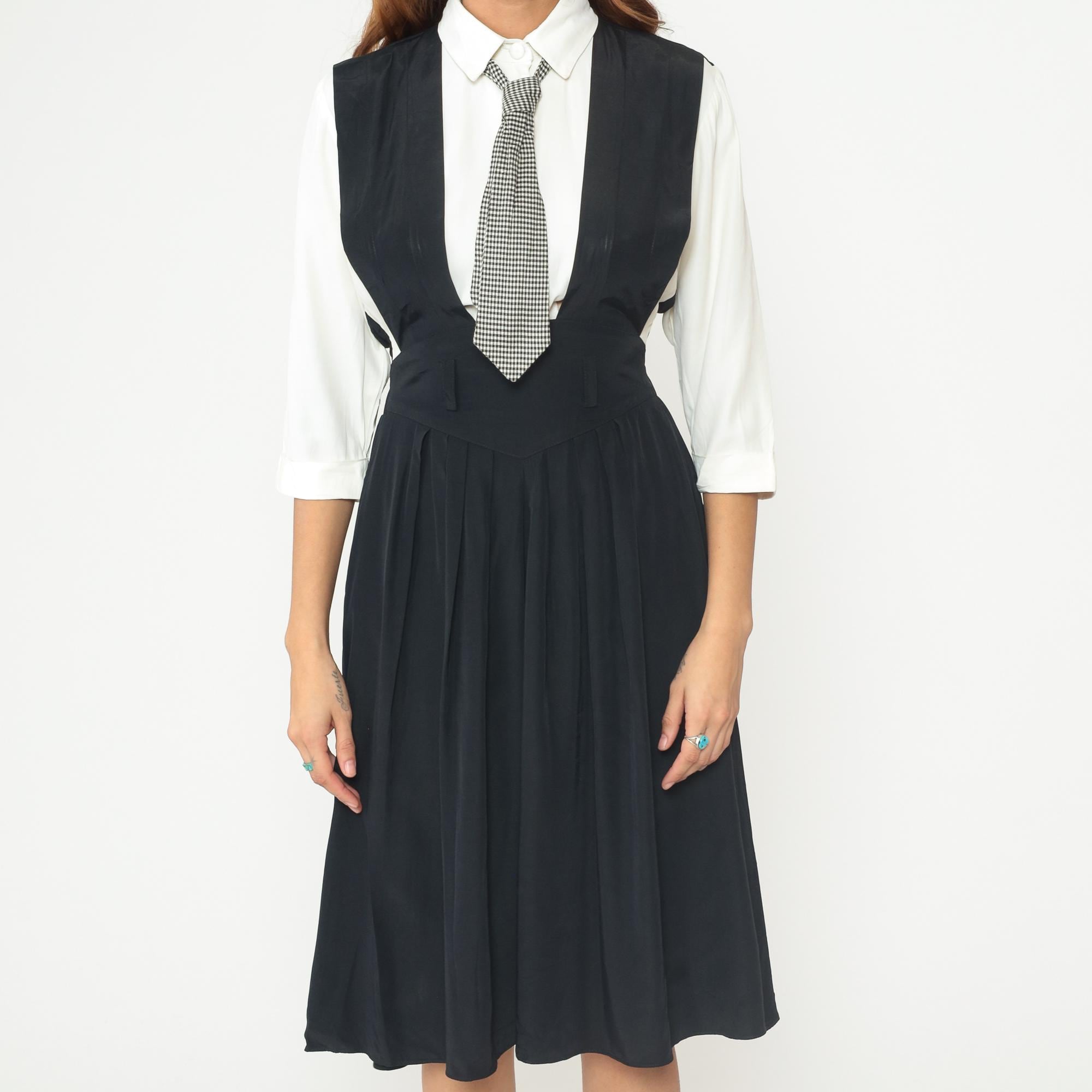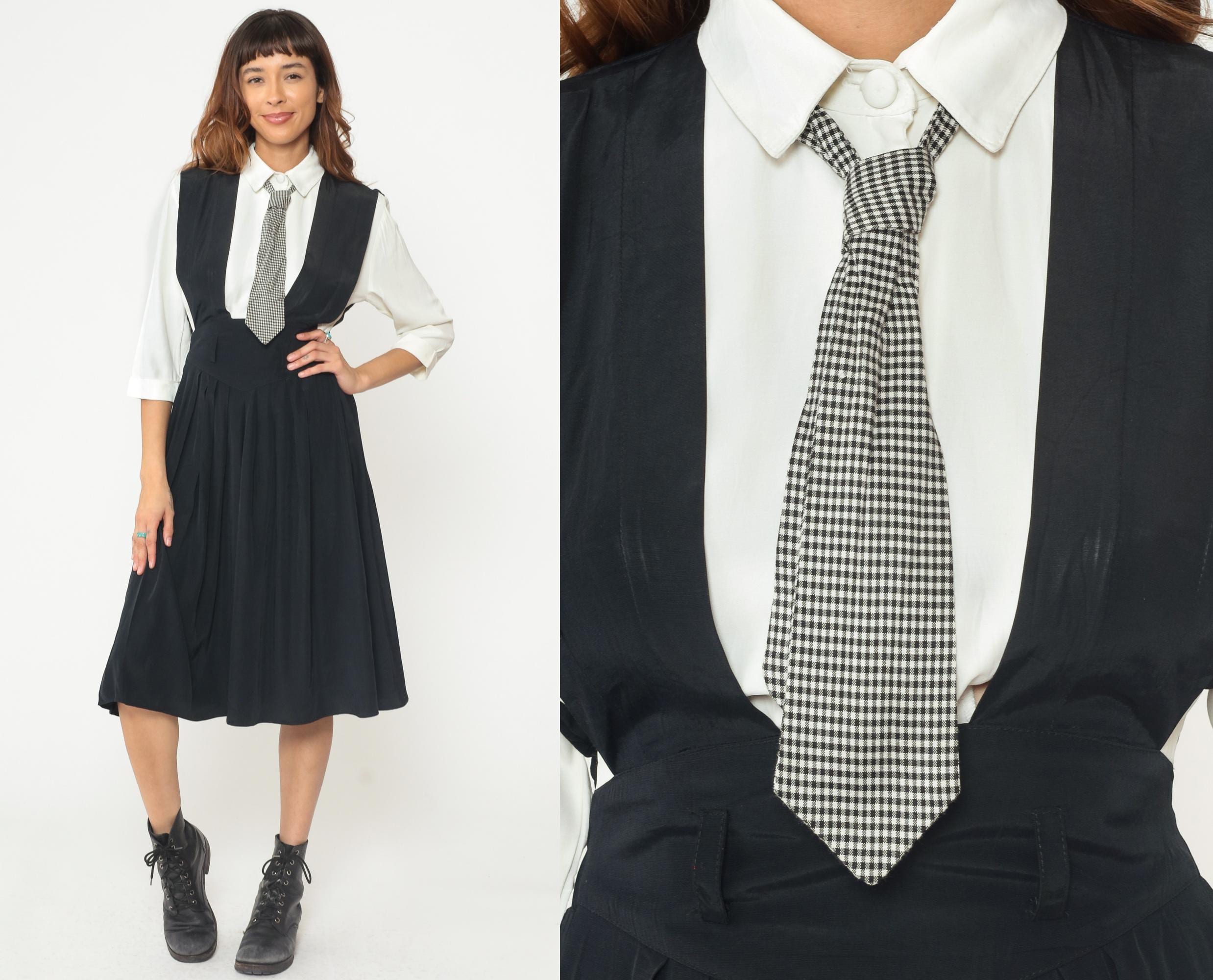 1990s dress from Piccolino Petites designed to look like a school uniform with a black sleeveless jumper that has an attached white collared shirt with long sleeves underneath and an attached black and white gingham tie. The jumper has a fitted bodice with an elastic waistband and flows into an A-line midi skirt. The white shirt portion is built into the dress with a classic pointed collar and long sleeves, and the gingham tie buttons on.