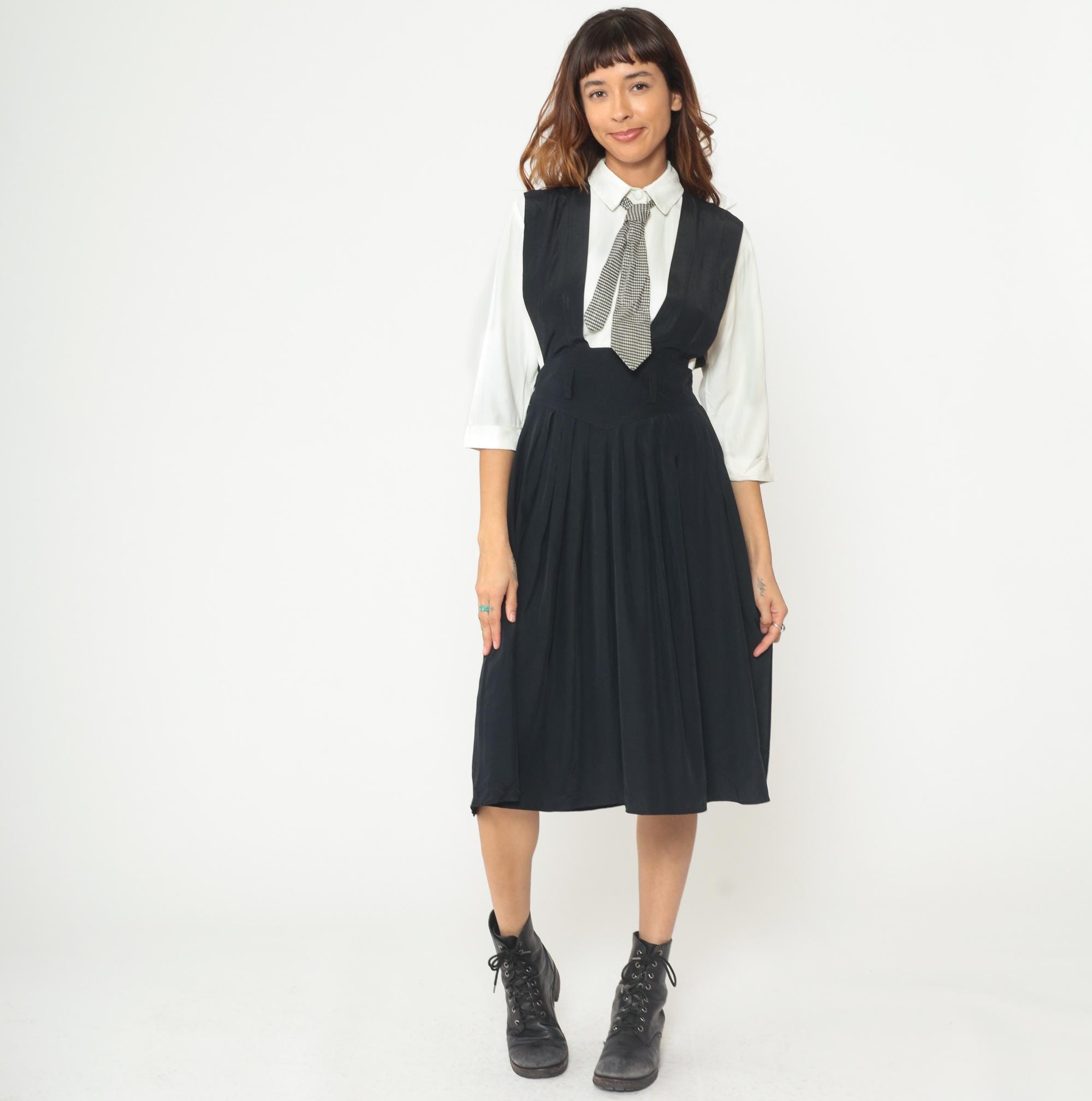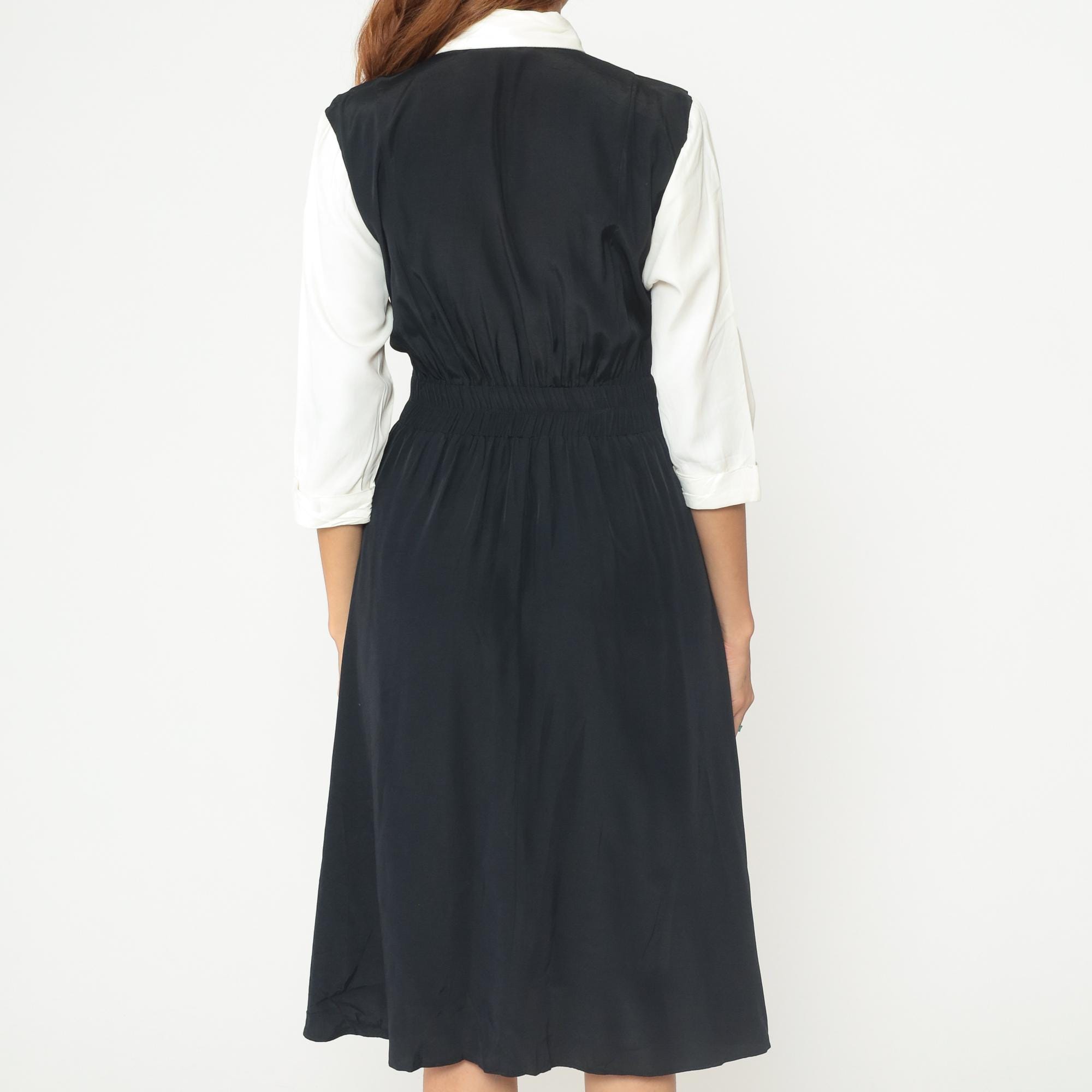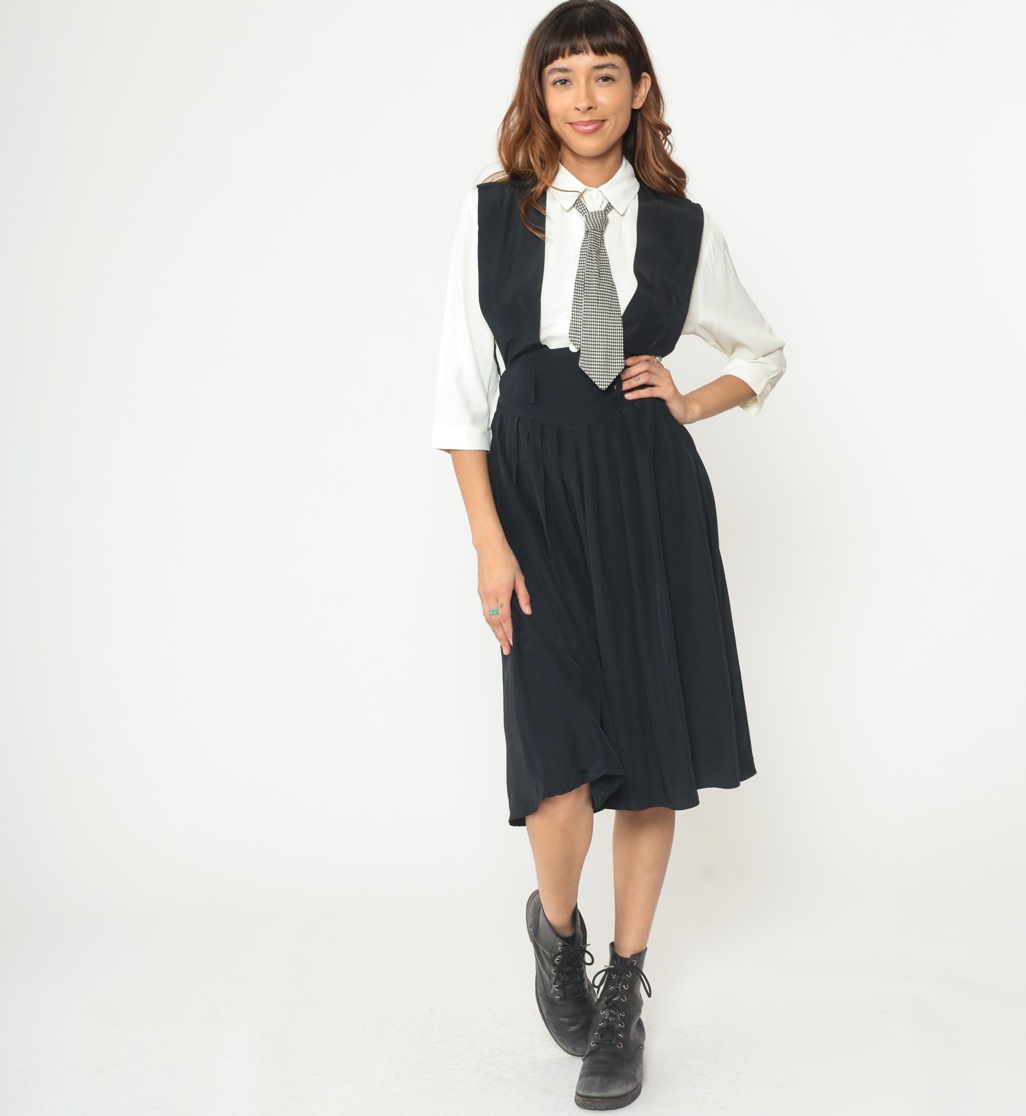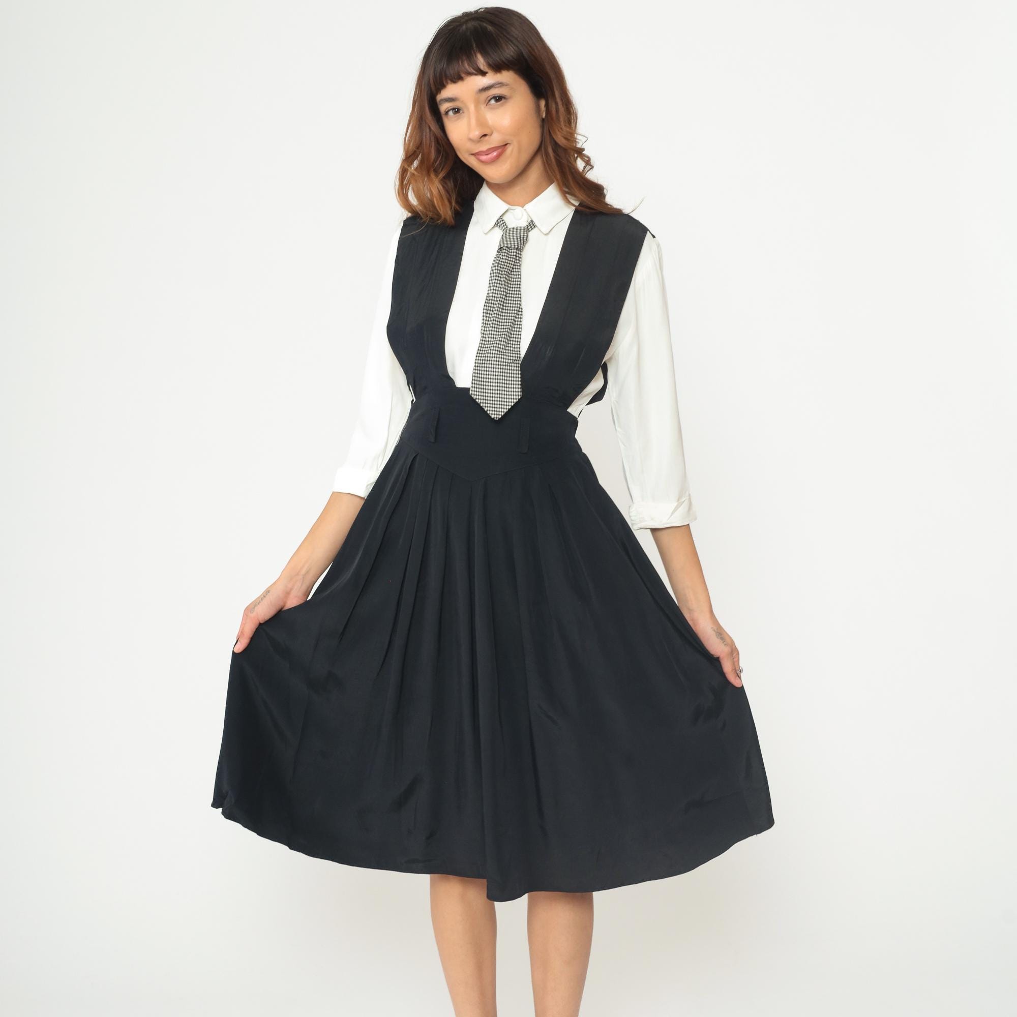 1990s dress from Piccolino Petites designed to look like a school uniform with a black sleeveless jumper that has an attached white collared shirt with long sleeves underneath and an attached black and white gingham tie. The jumper has a fitted bodice with an elastic waistband and flows into an A-line midi skirt. The white shirt portion is built into the dress with a classic pointed collar and long sleeves, and the gingham tie buttons on.